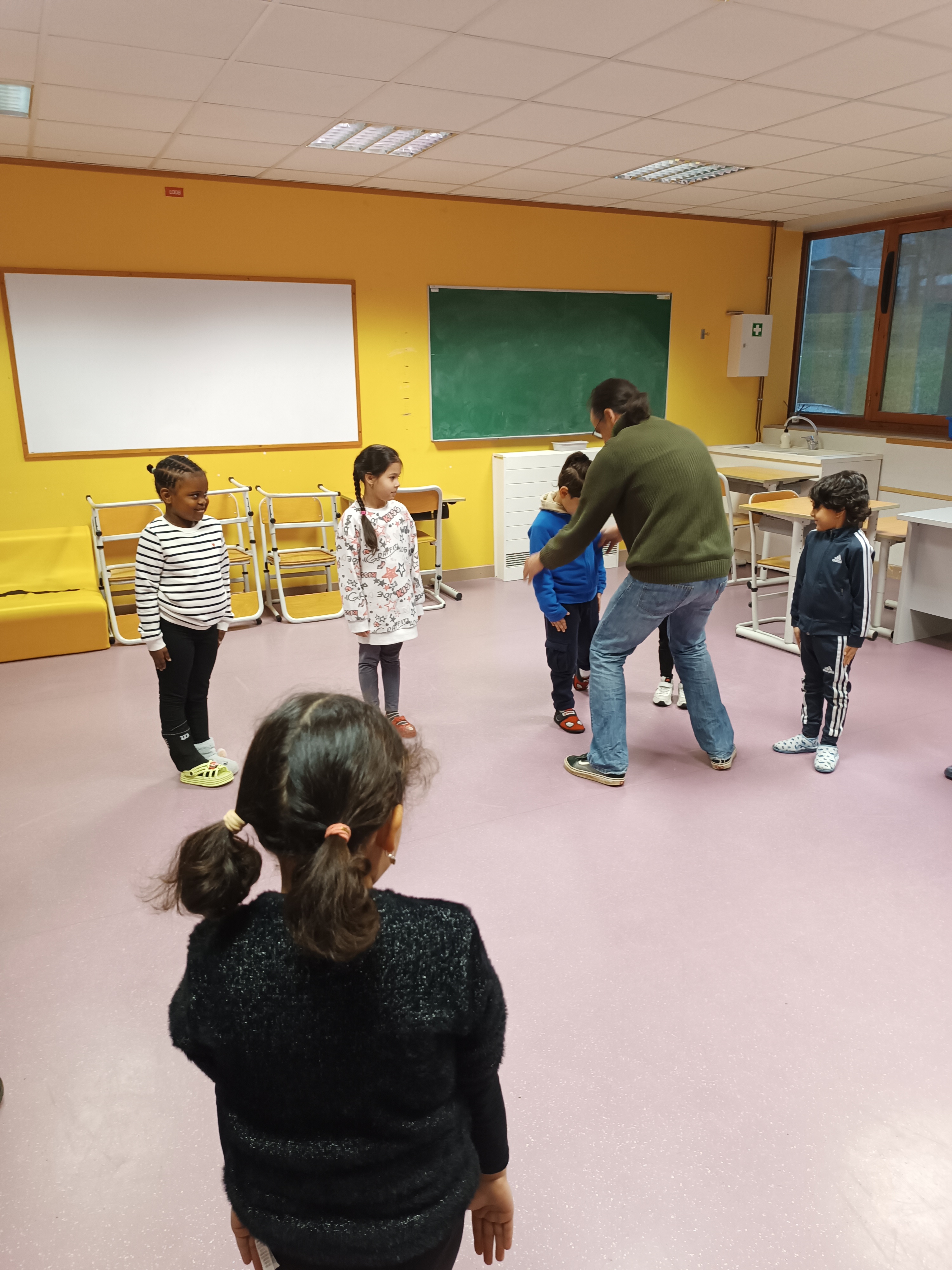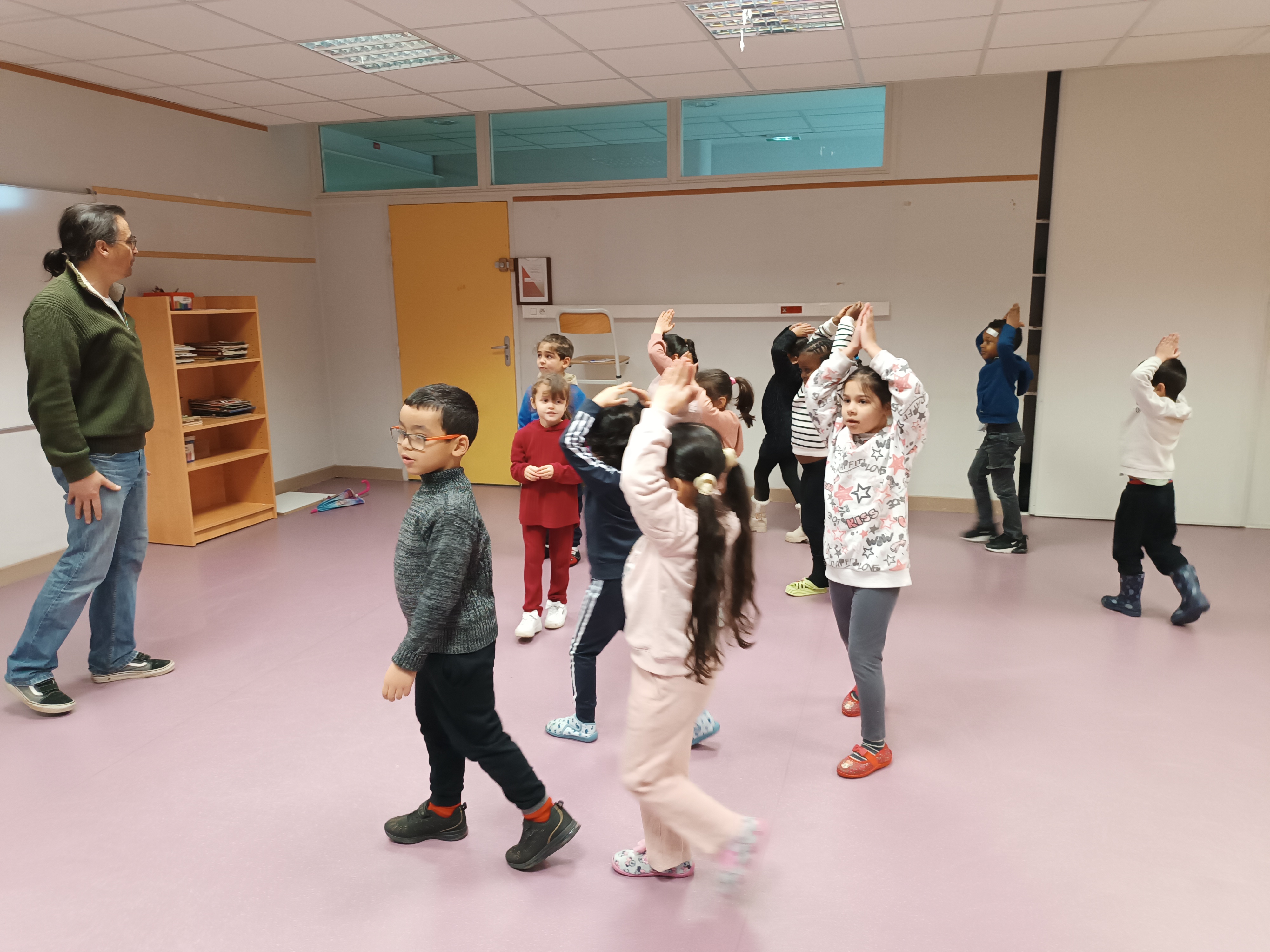 Lors de cette première séance, les enfants ont été repartis en 2 groupes (nous avons mélangé les 2 classes) : ils ont appris à se déplacer en occupant l'espace, comme sur une scène, et à s'immobiliser à un signal.