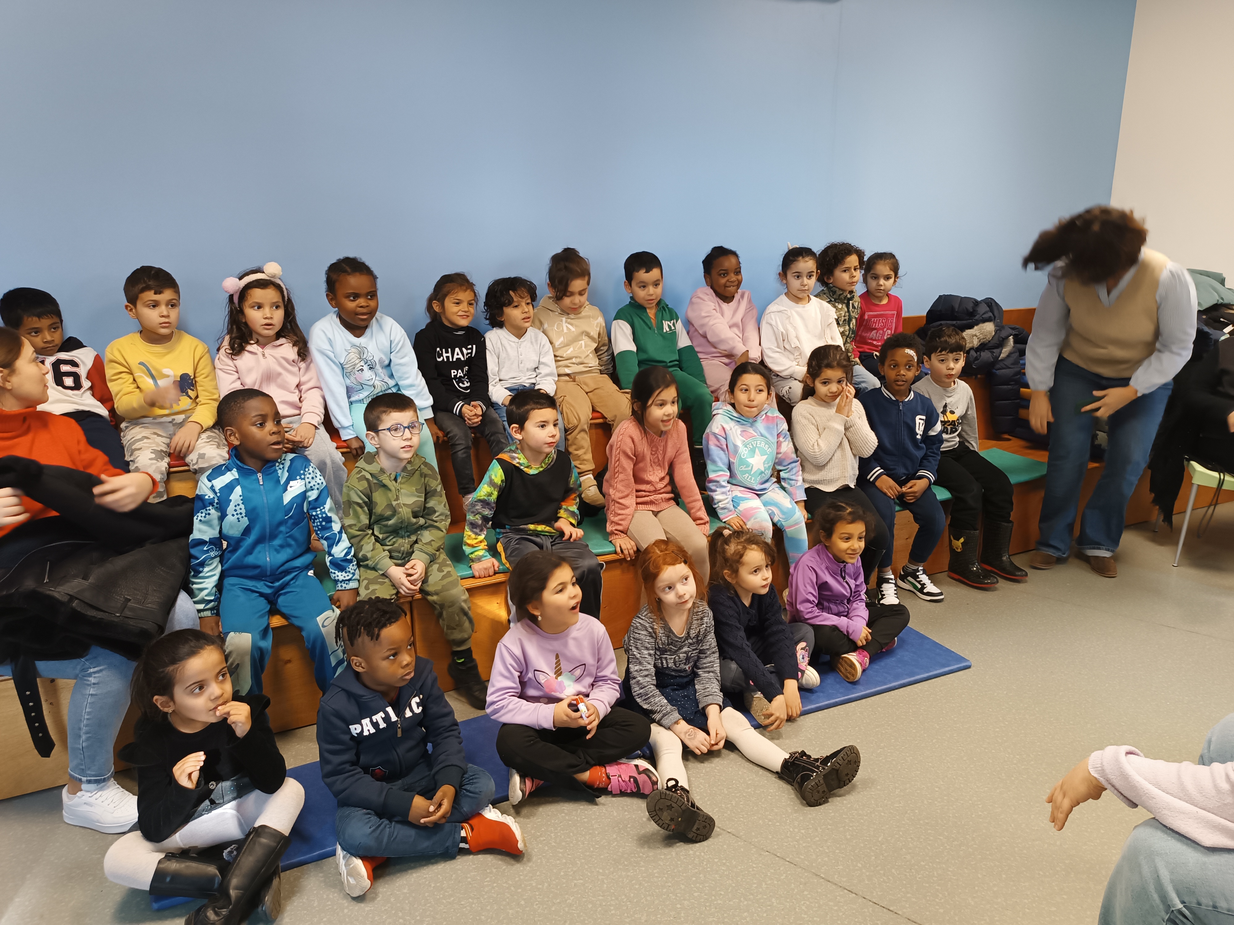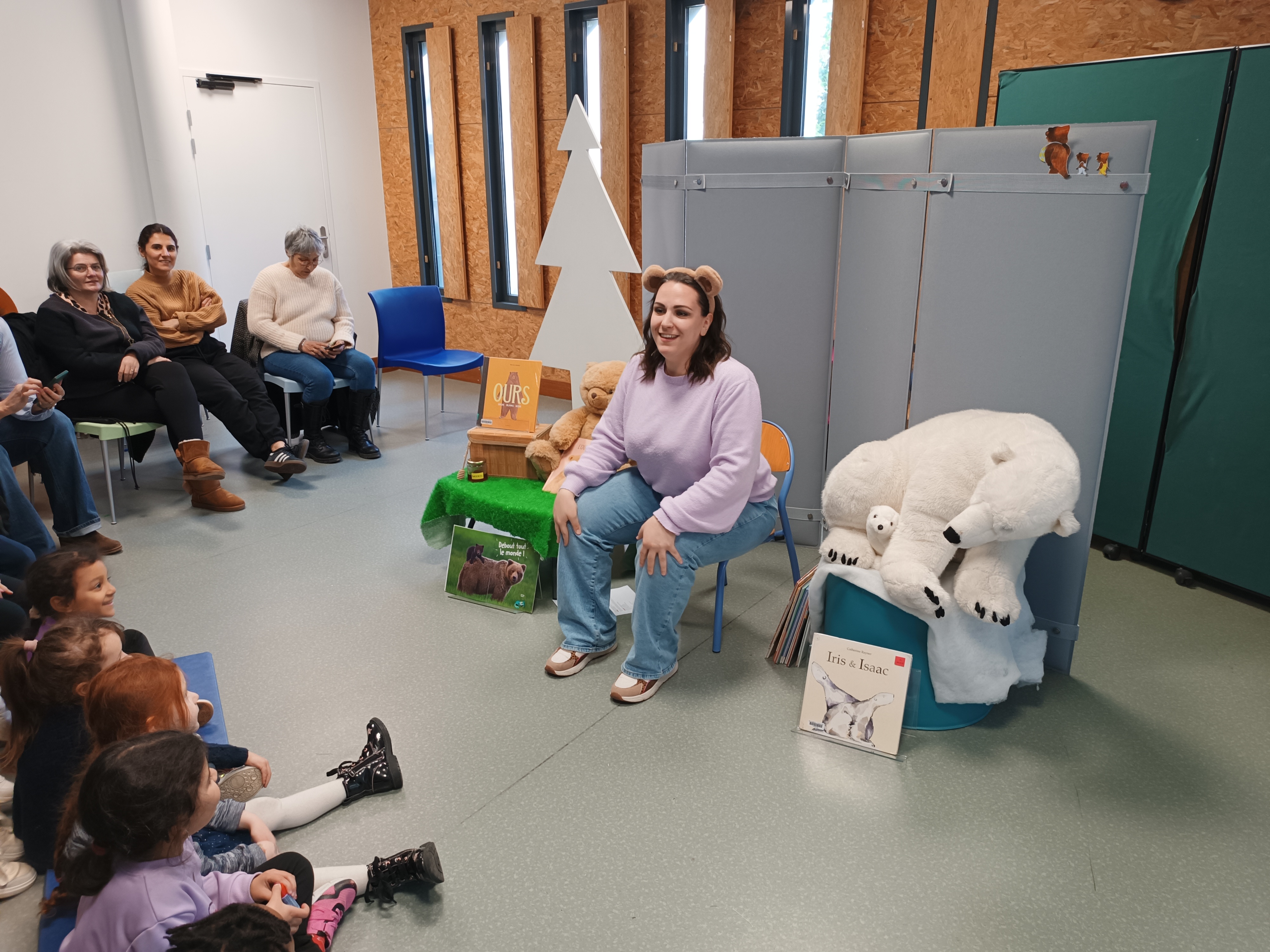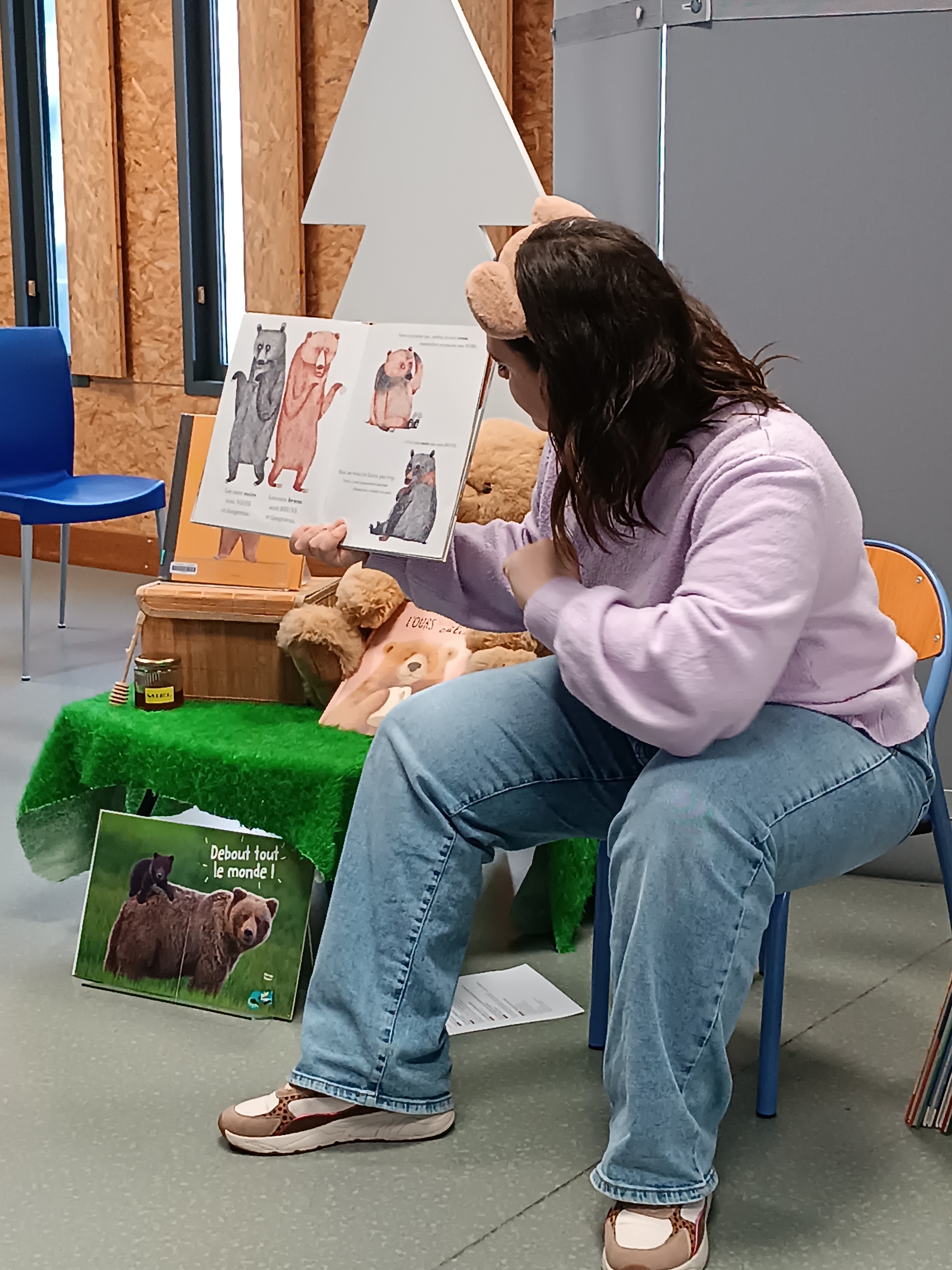Sortie à la bibliothèque pour une lecture d'histoires sur le thème des ours. Nous avons été reçus par Camille qui, pour l'occasion, avait mis ses oreilles d'ours 😅.