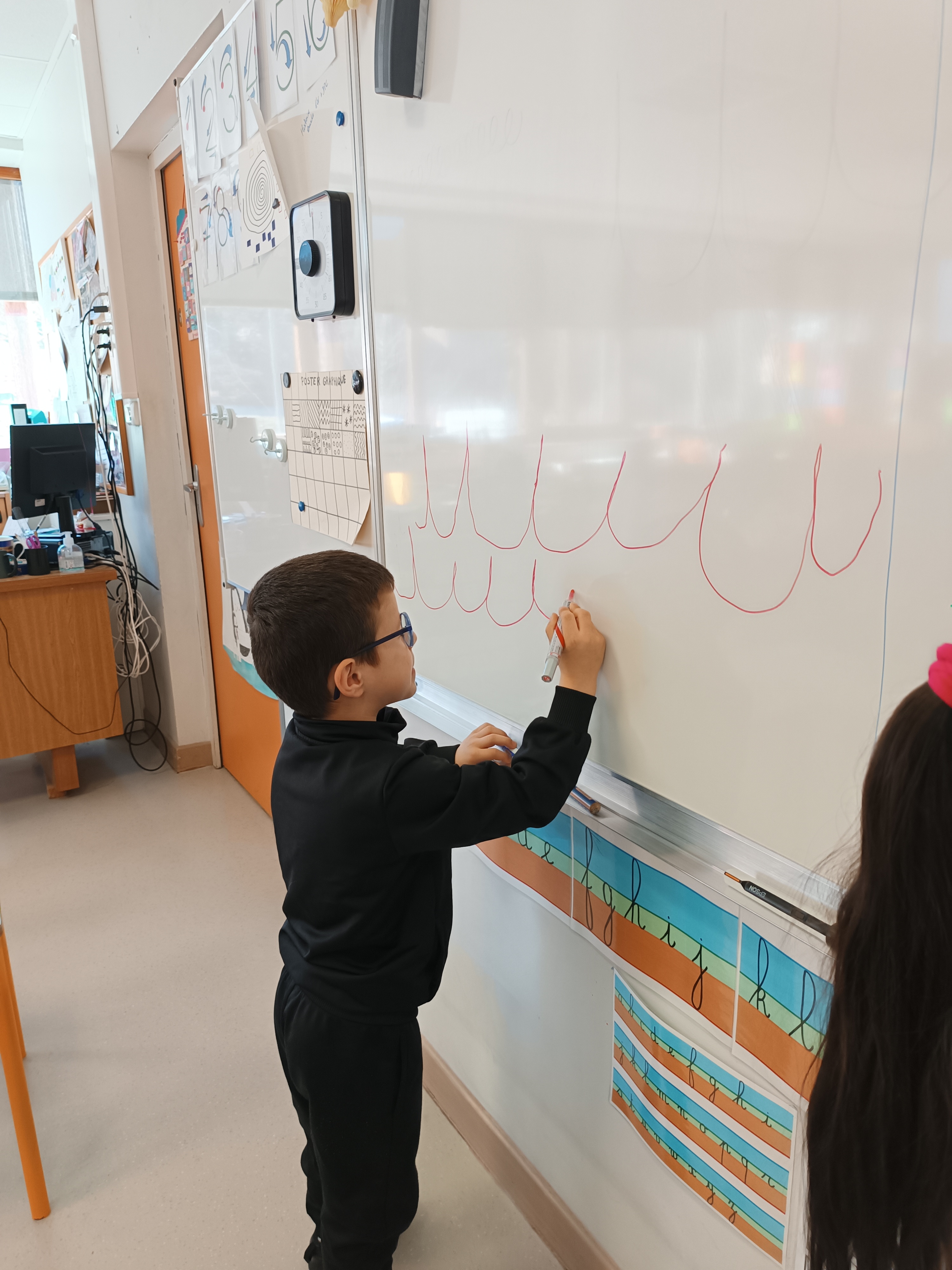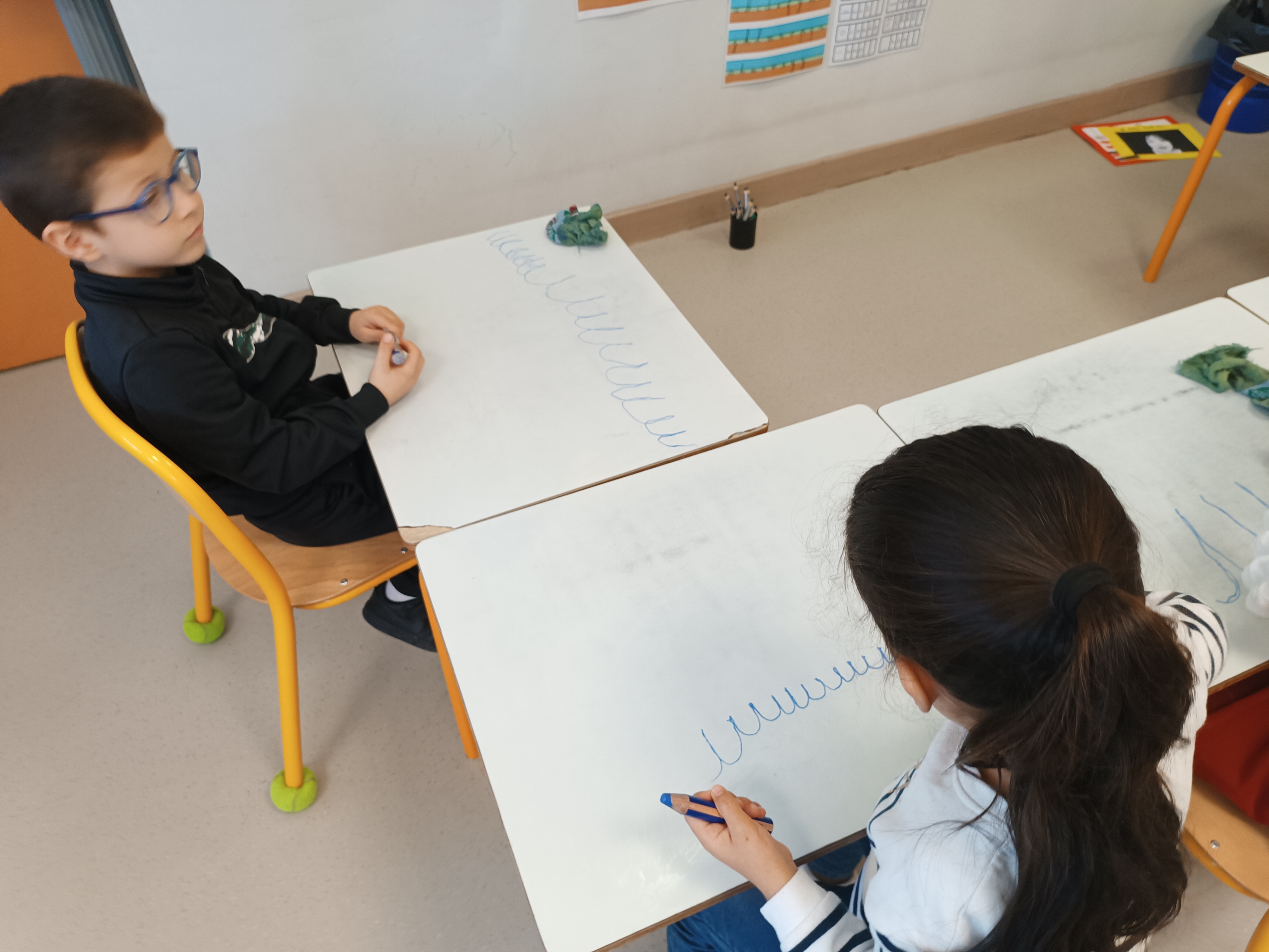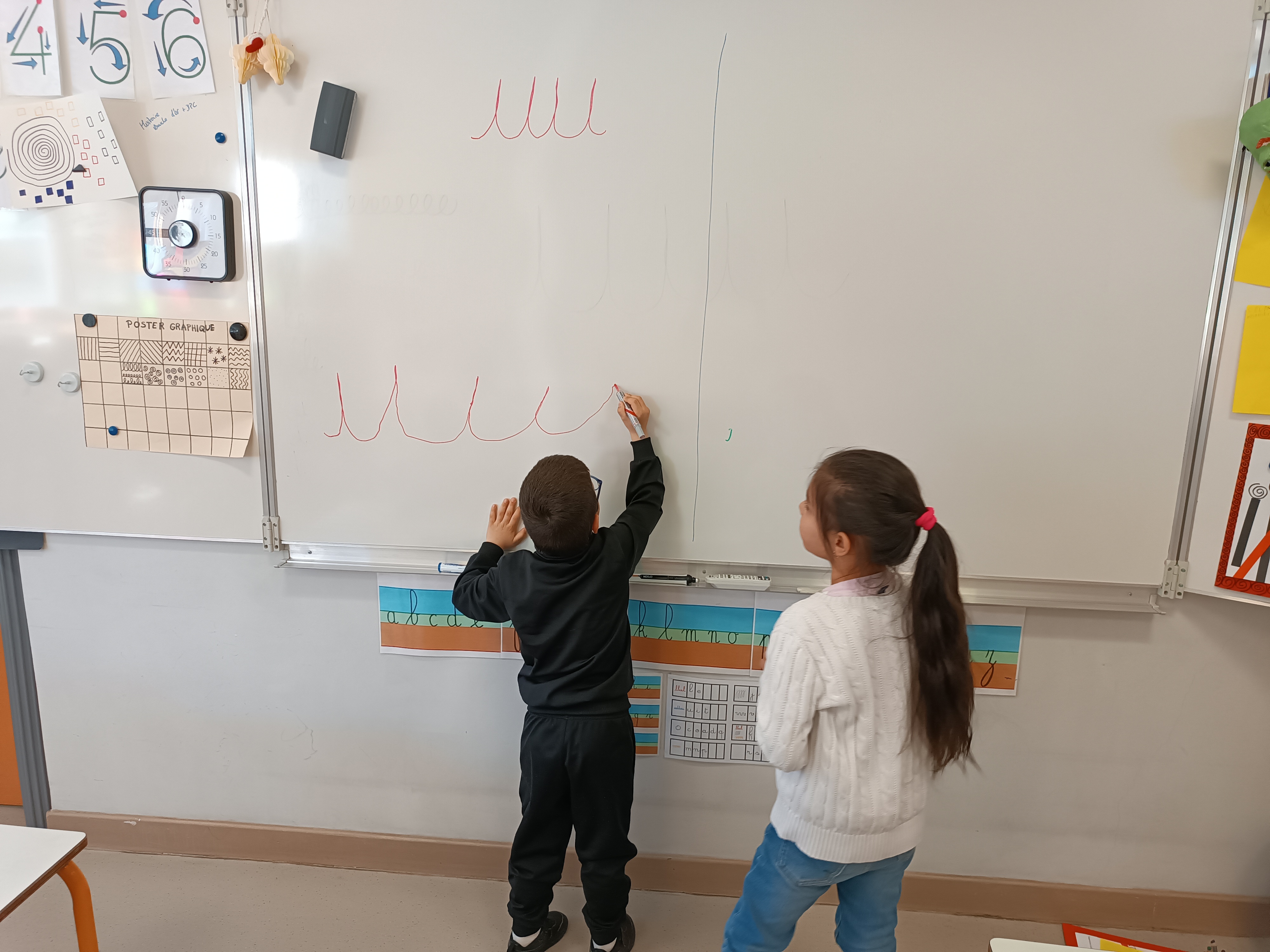 Pas de temps à perdre : c'est reparti pour l'apprentissage de l'écriture en attaché. Pour cela, nous voyons un nouveau graphisme : le creux. Il nous permettra d'écrire le i, le u et le t en attaché. Mais avant cela, on s'entraîne au tableau, sur la table, sur une feuille.
