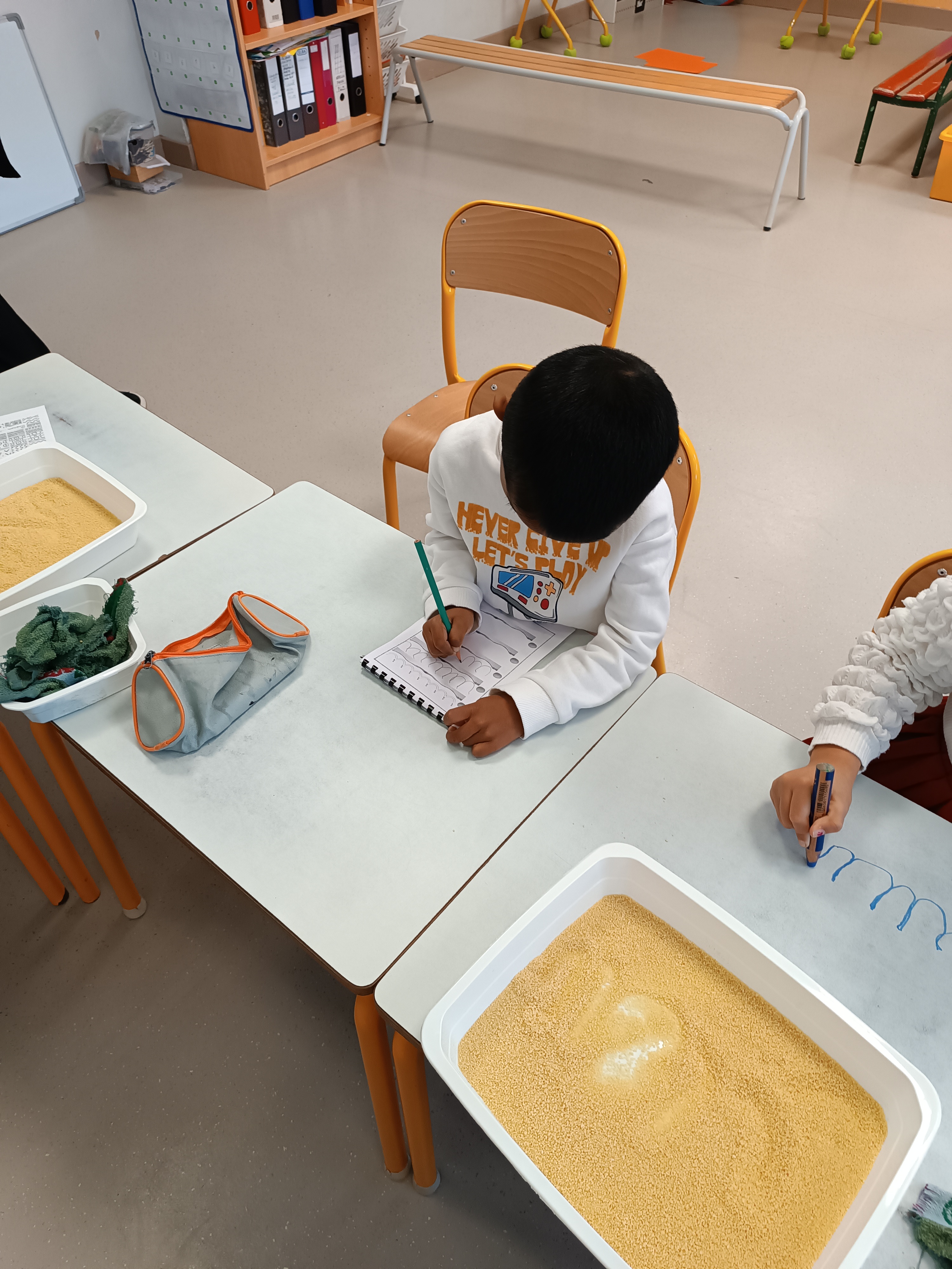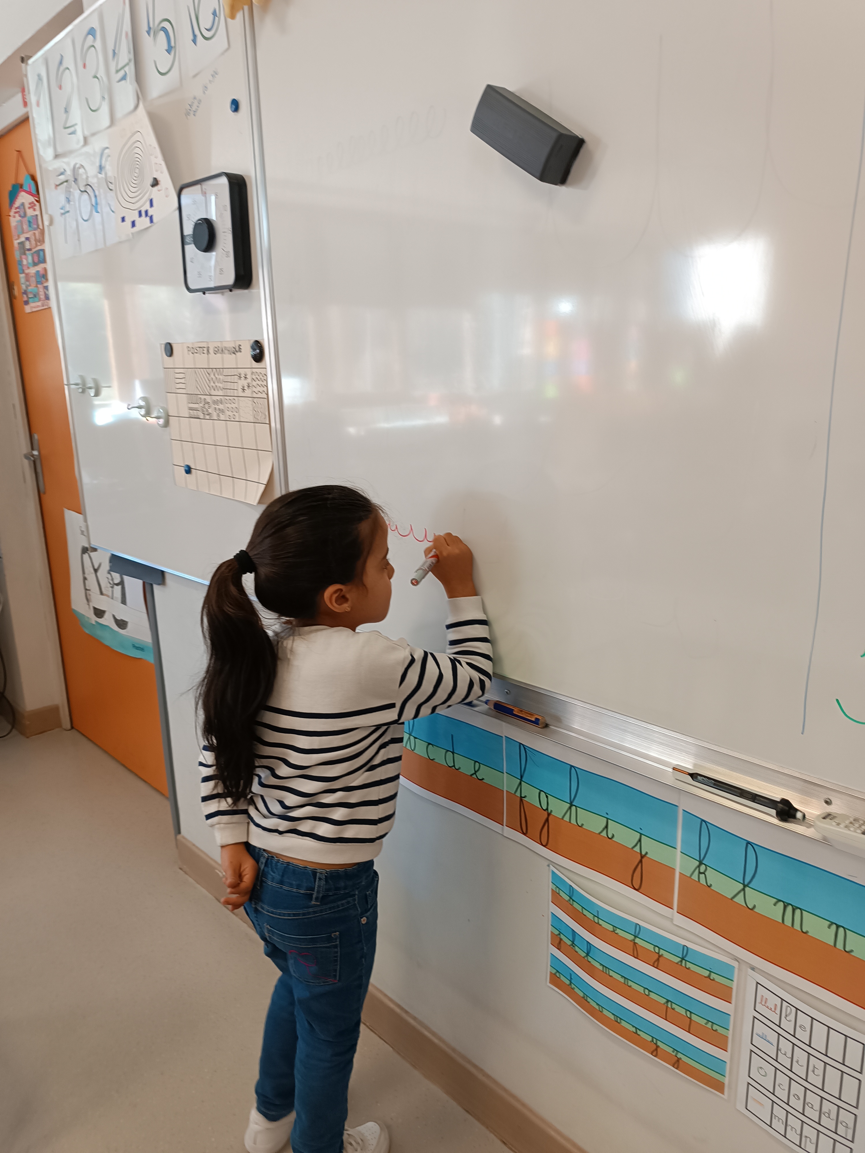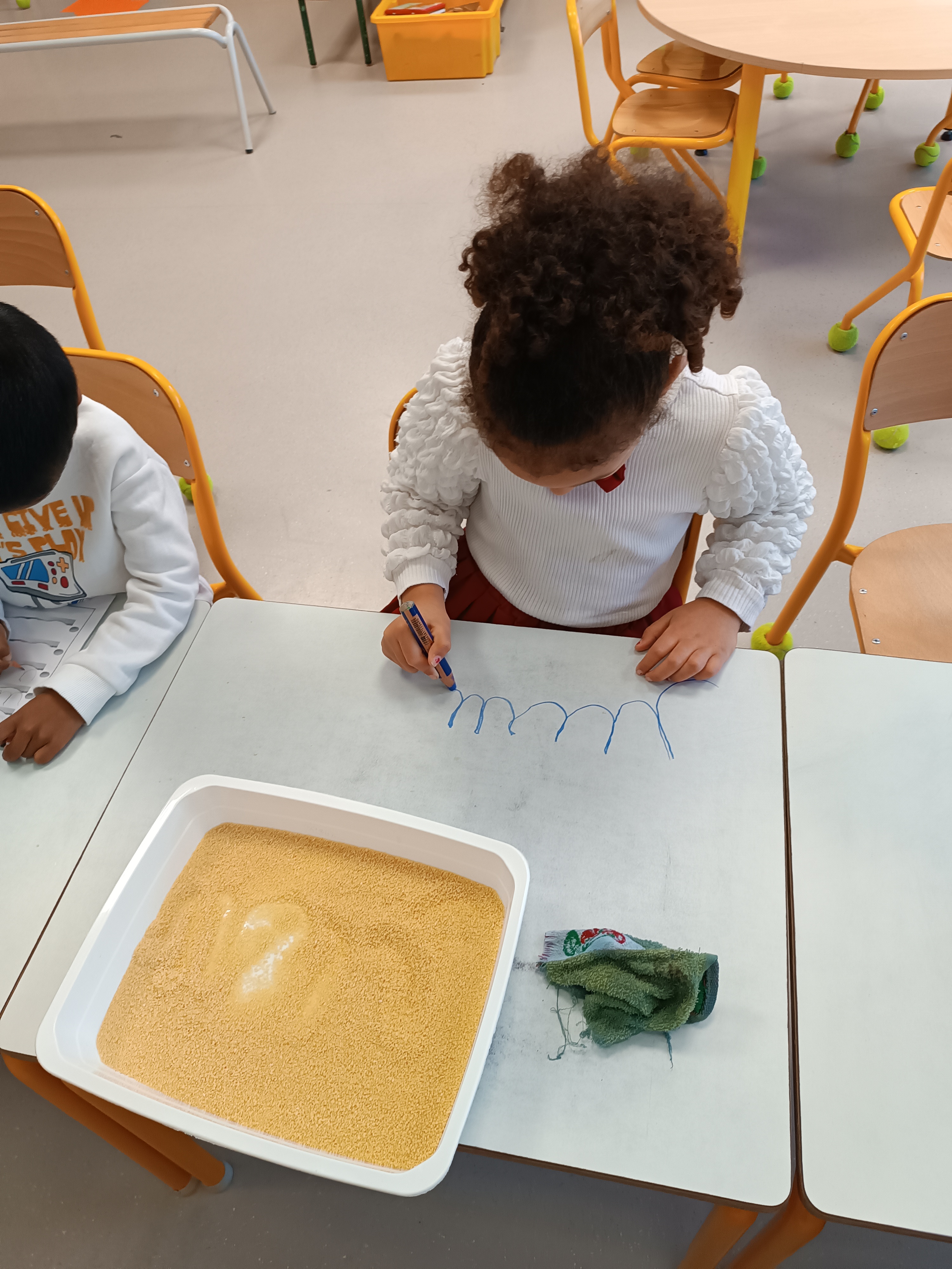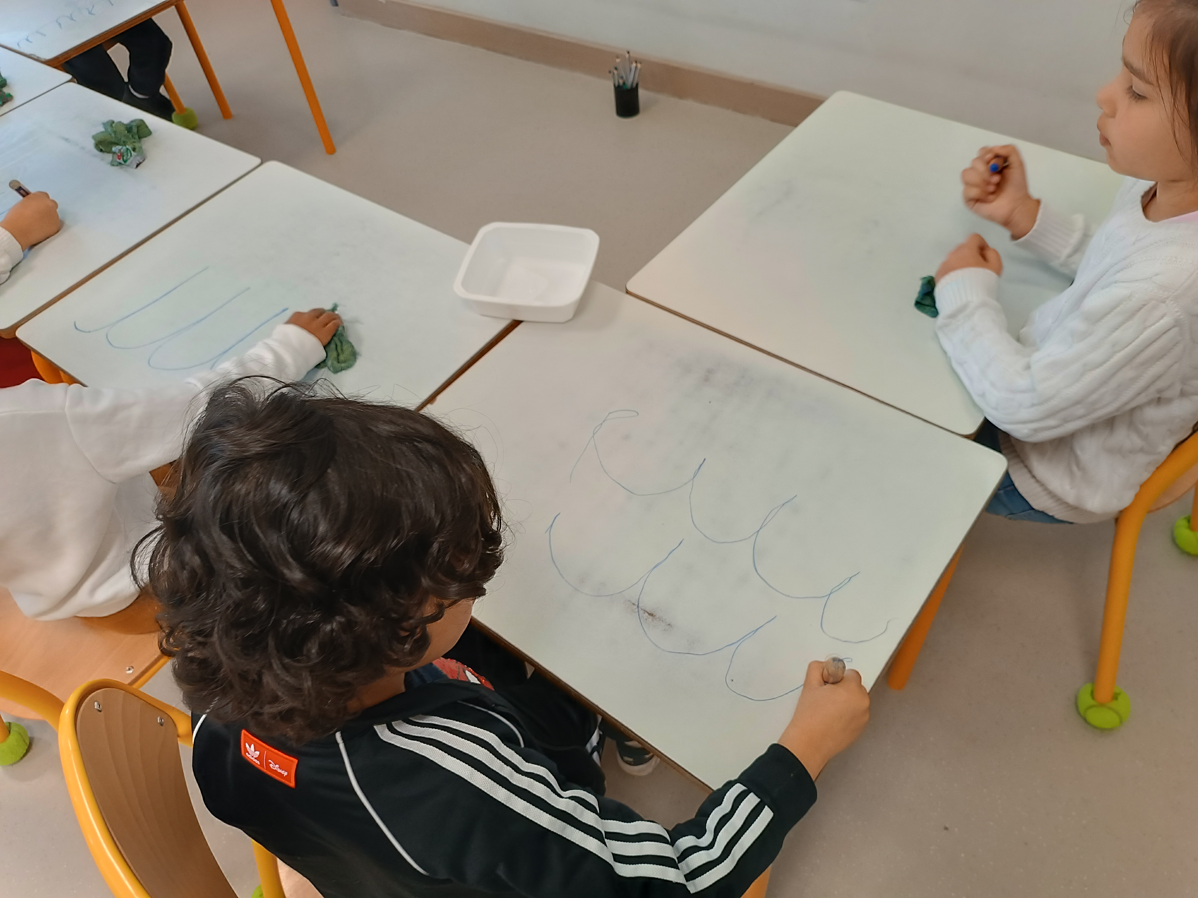 Pas de temps à perdre : c'est reparti pour l'apprentissage de l'écriture en attaché. Pour cela, nous voyons un nouveau graphisme : le creux. Il nous permettra d'écrire le i, le u et le t en attaché. Mais avant cela, on s'entraîne au tableau, sur la table, sur une feuille.