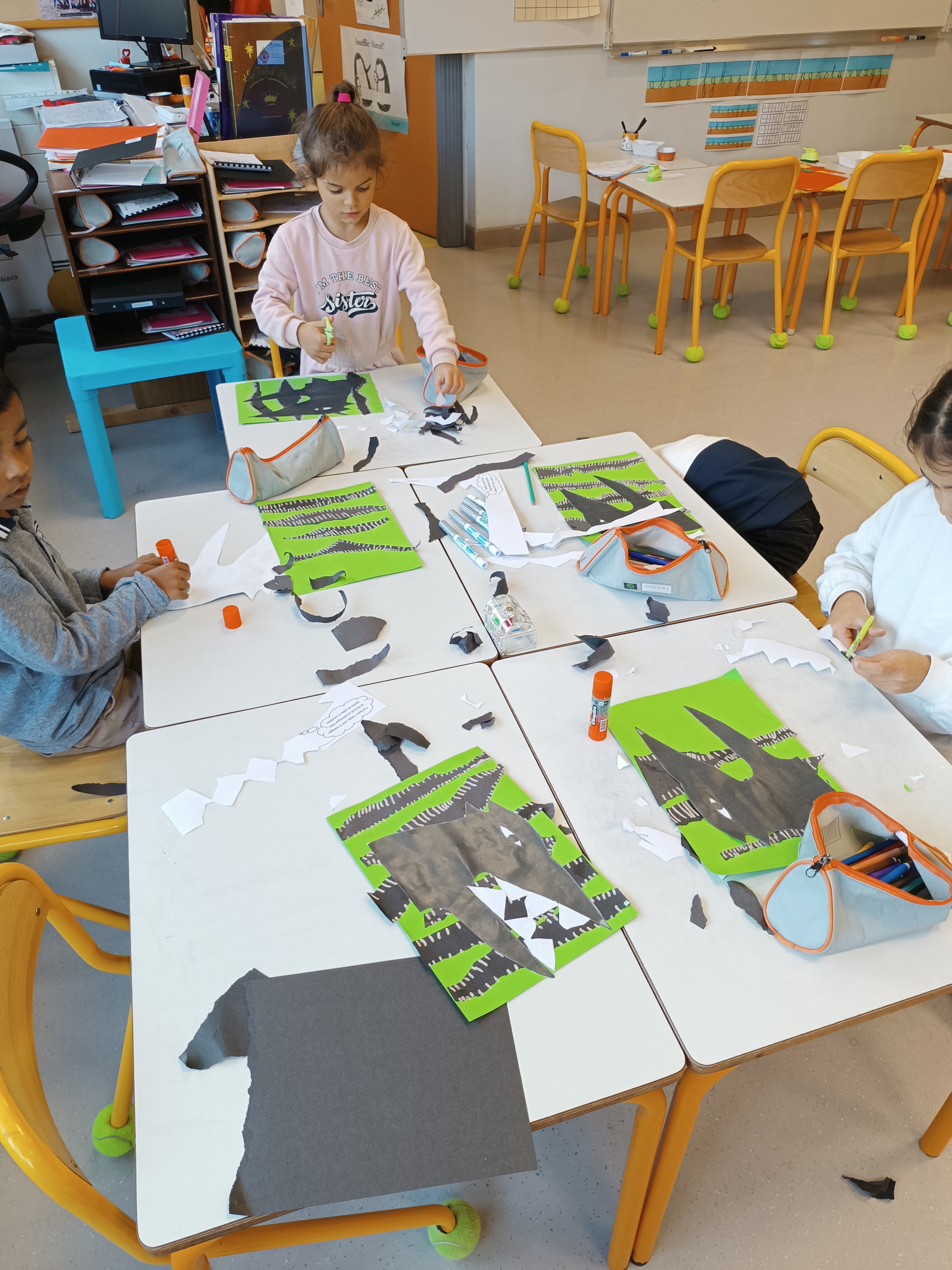 - déchirer des bandes de papier noir et les coller sur la feuille verte