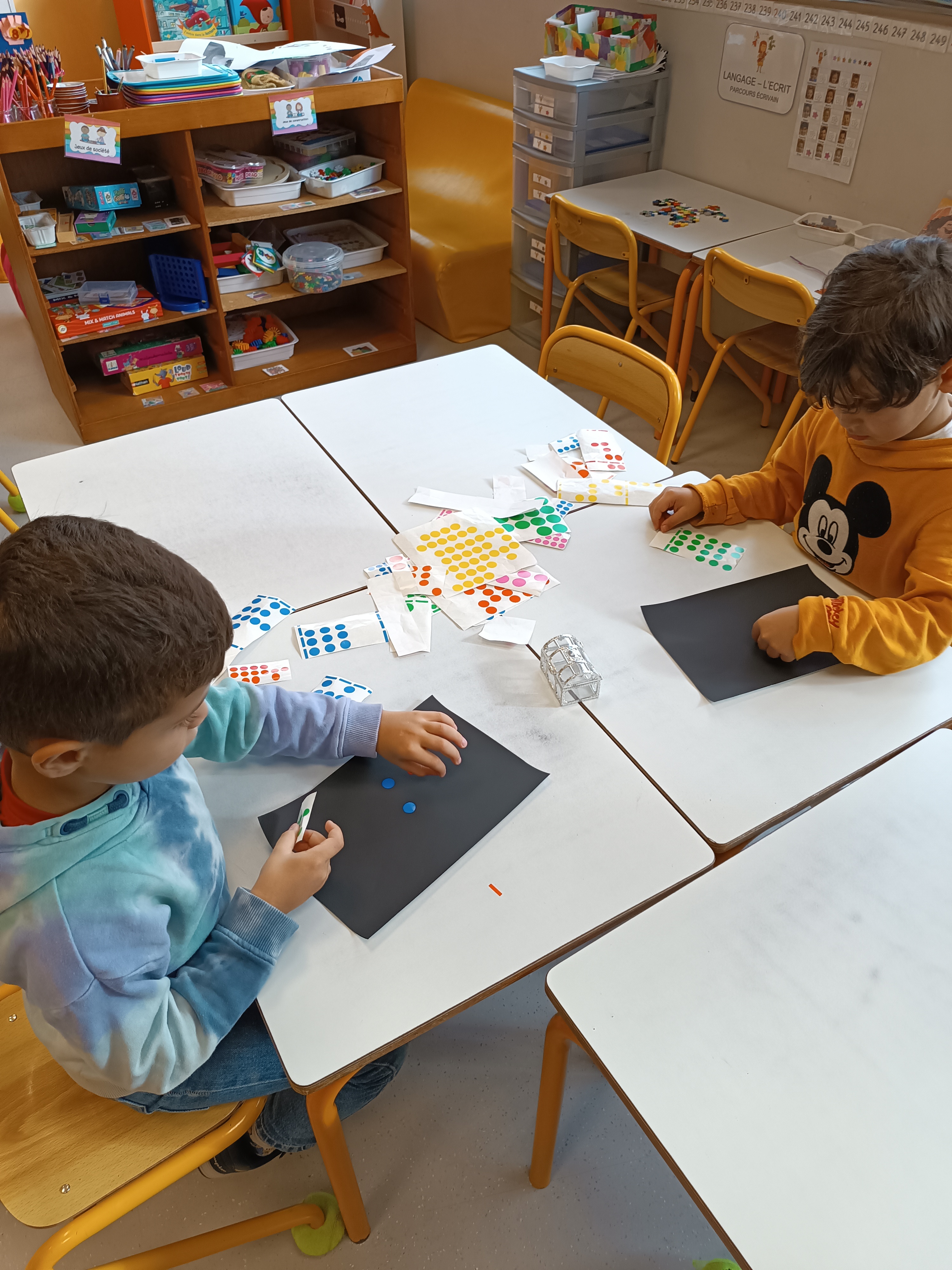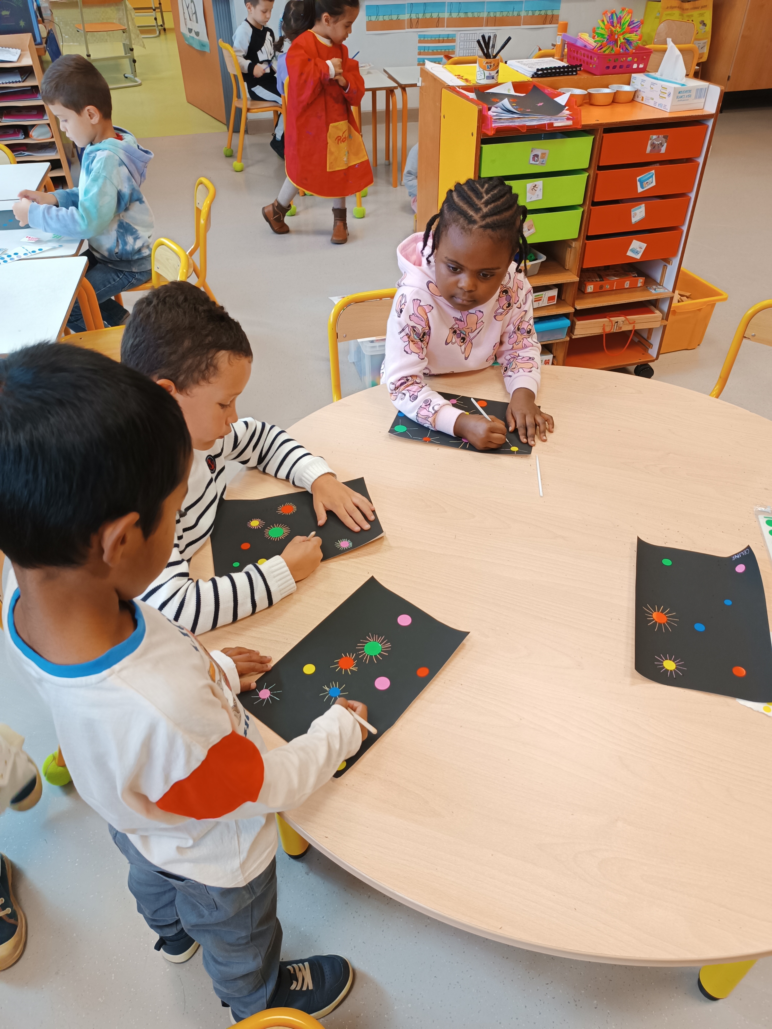 Graphisme : coller des gommettes rondes sur la carte à gratter puis tracer des traits rayonnants autour de chaque gommettes à l'aide du bâtonnet.