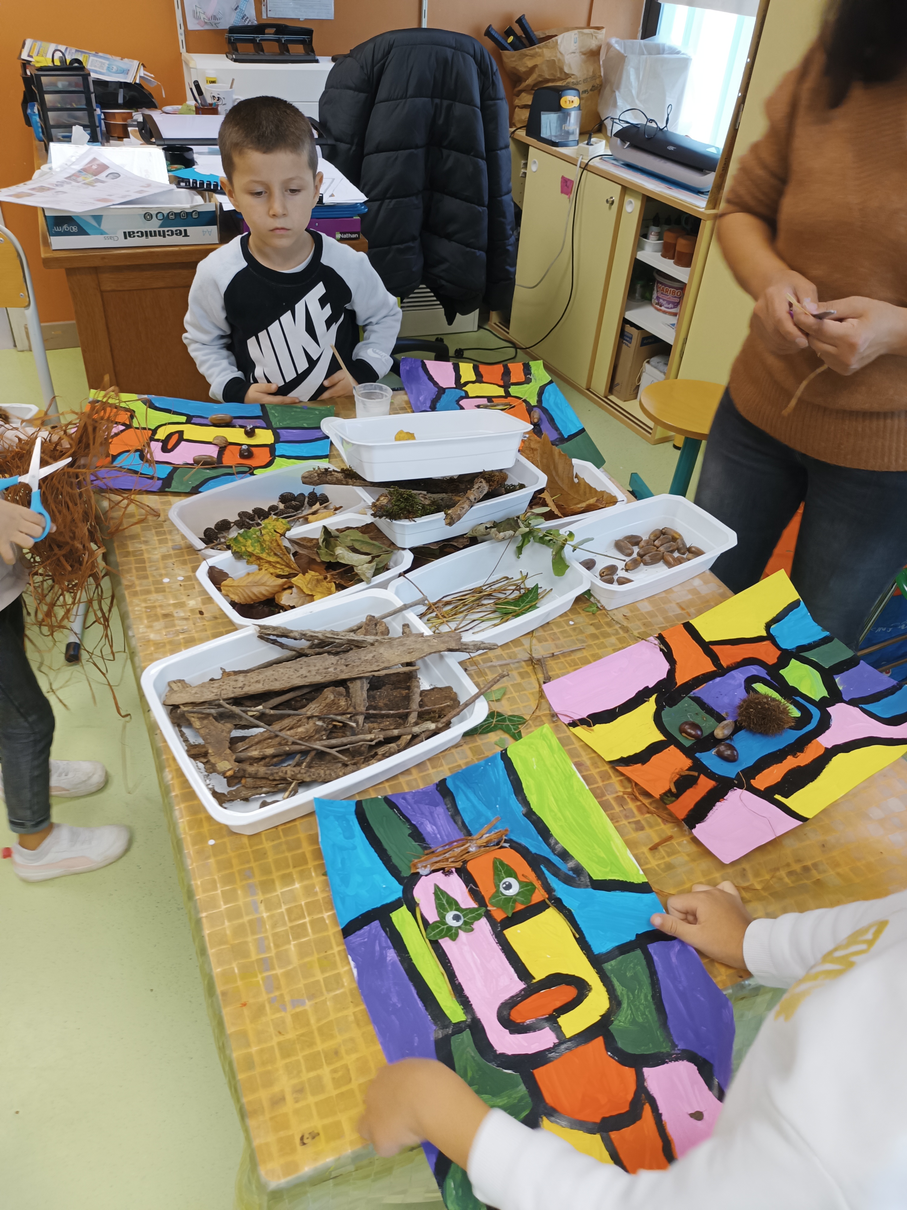 - placer les yeux, le nez, les oreilles et les cheveux en se servant de nos trouvailles de la forêt.