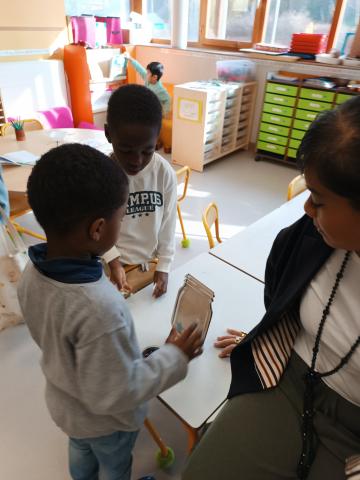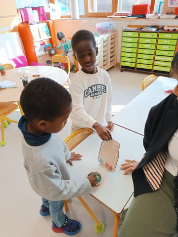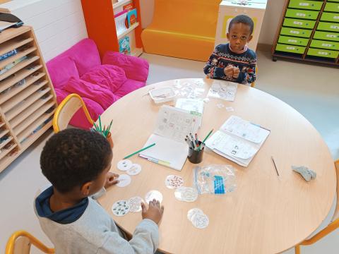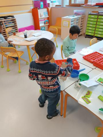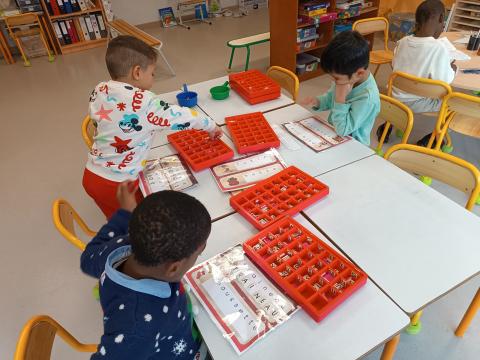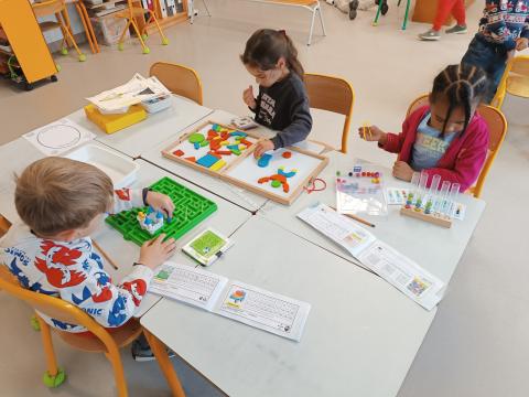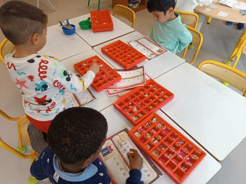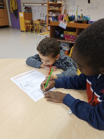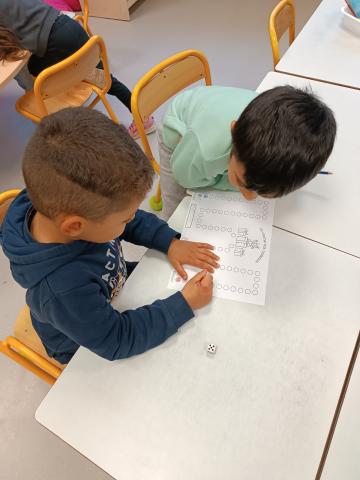 La course aux jouets : un jeu de numération qui se joue par 2. Chaque élève a une couleur. A tout de rôle, les élèves lancent le dé et colorie le nombre de points indiqué par le dé. Celui qui arrive en premier aux cadeaux gagne la course. Cette activité a bien plu aux enfants 😊