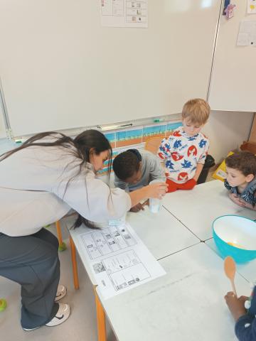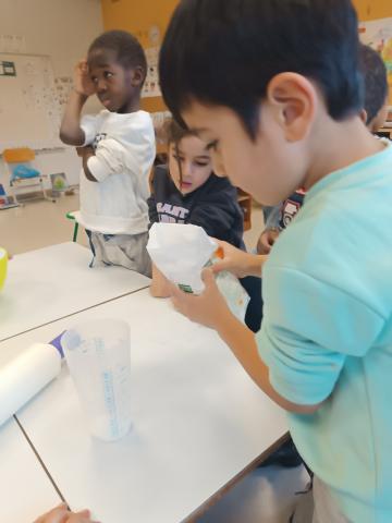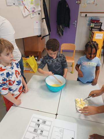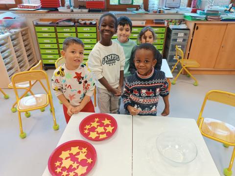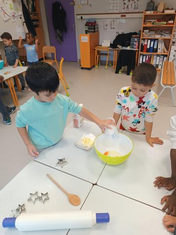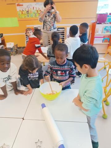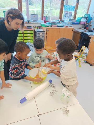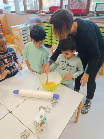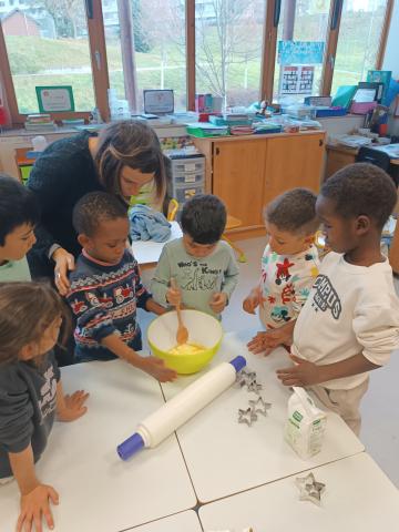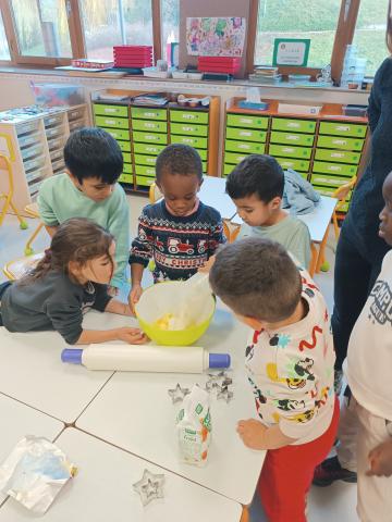 Opération sablés de Noël. Lundi après-midi, nous étions en petit effectif puisque beaucoup de malades. Avec maîtresse Isa, nous avons donc improvisé une séance pâtisserie avec confection de sablés. Les enfants sont repartis avec leur petit sachet en fin de semaine.