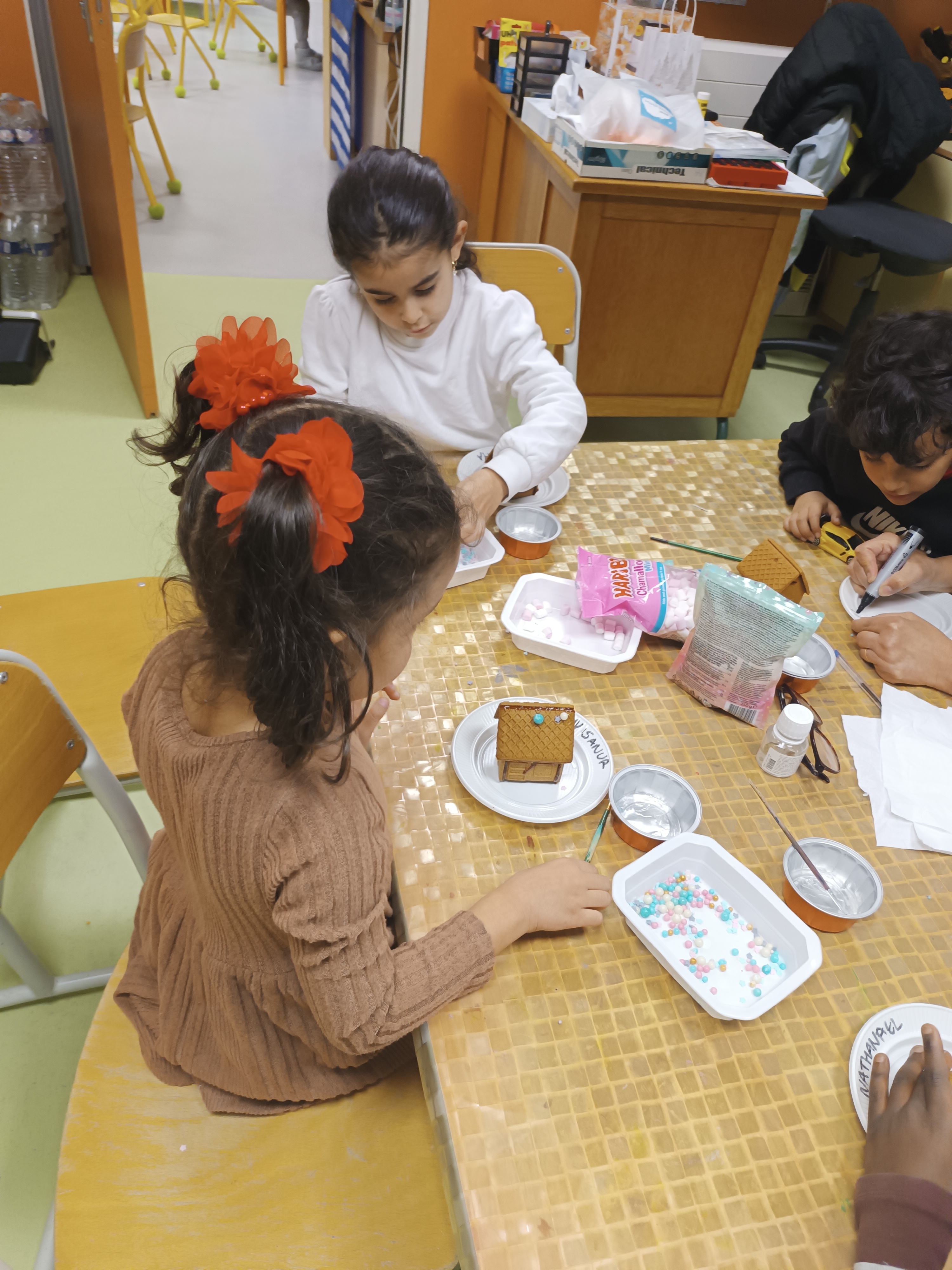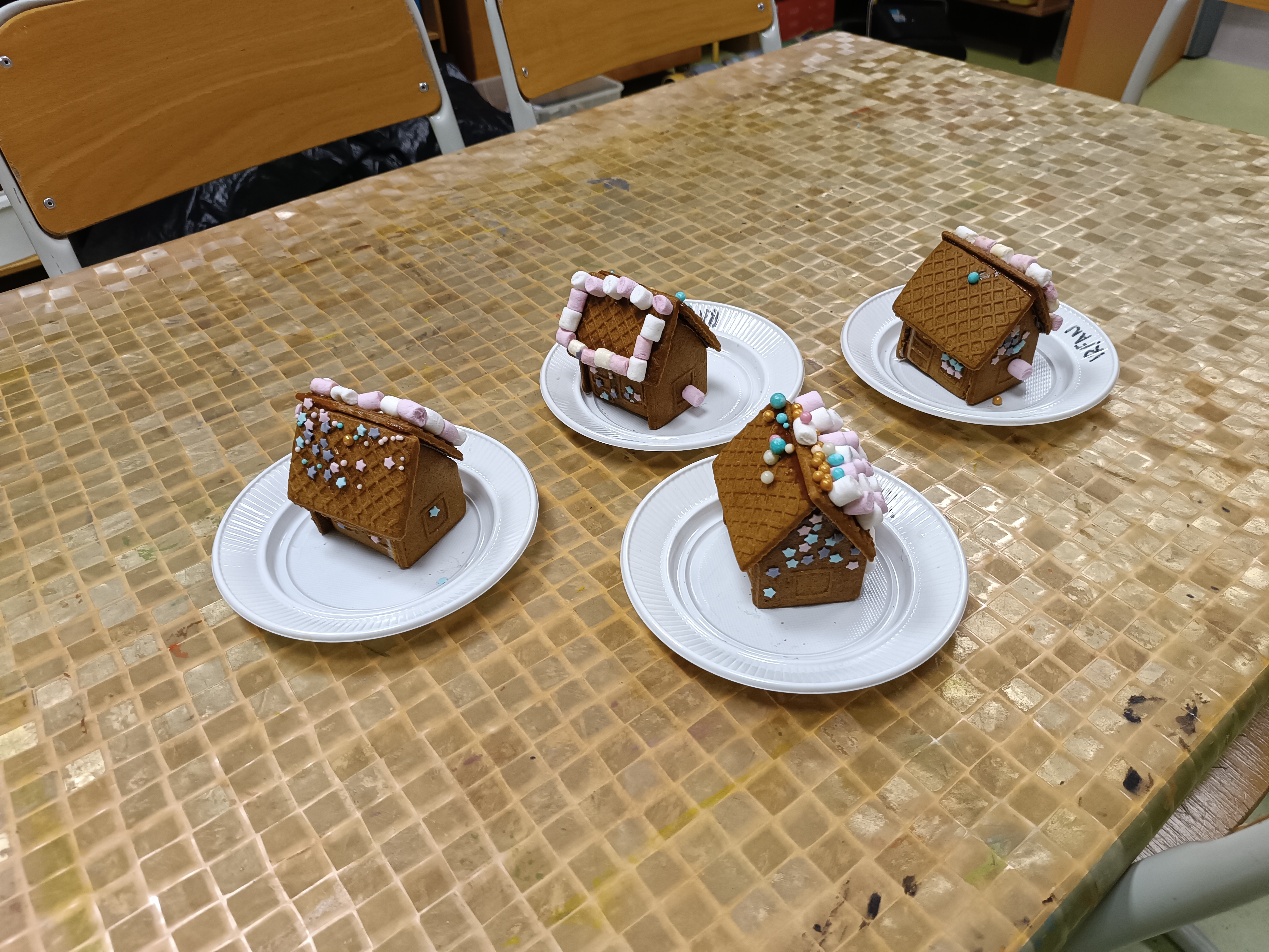 La fabrication de la maison s'est avérée plus difficile que prévu. J'ai donc assemblé toutes les maisons avec du caramel et donc sans les enfants car trop dangereux de manipuler le caramel.