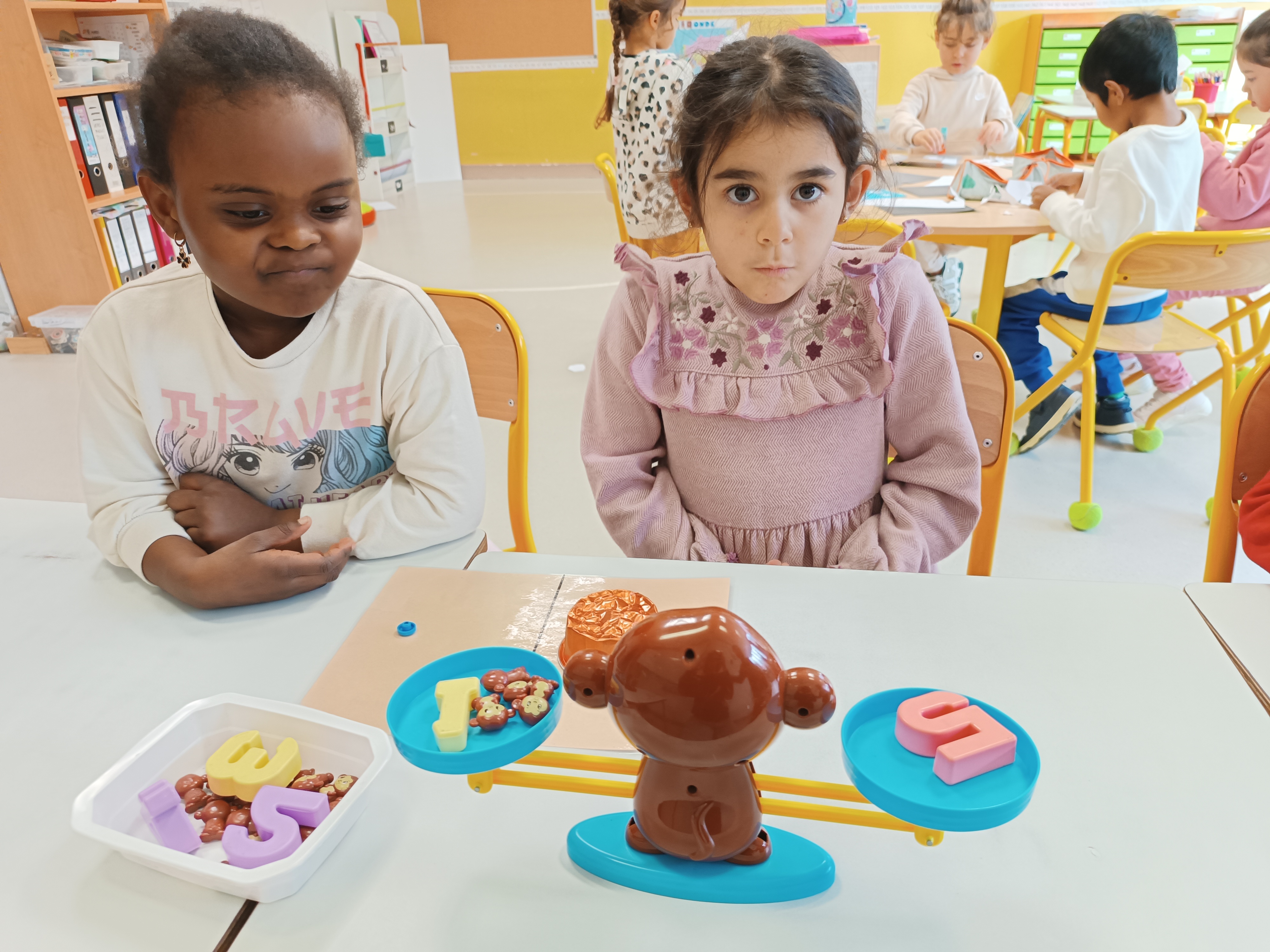 On commence facilement avec des gommettes qui matérialisent les lapins puis ajoute une difficulté en enlevant les gommettes. Les enfants peuvent utiliser leurs doigts, la balance singe et les barres numériques.