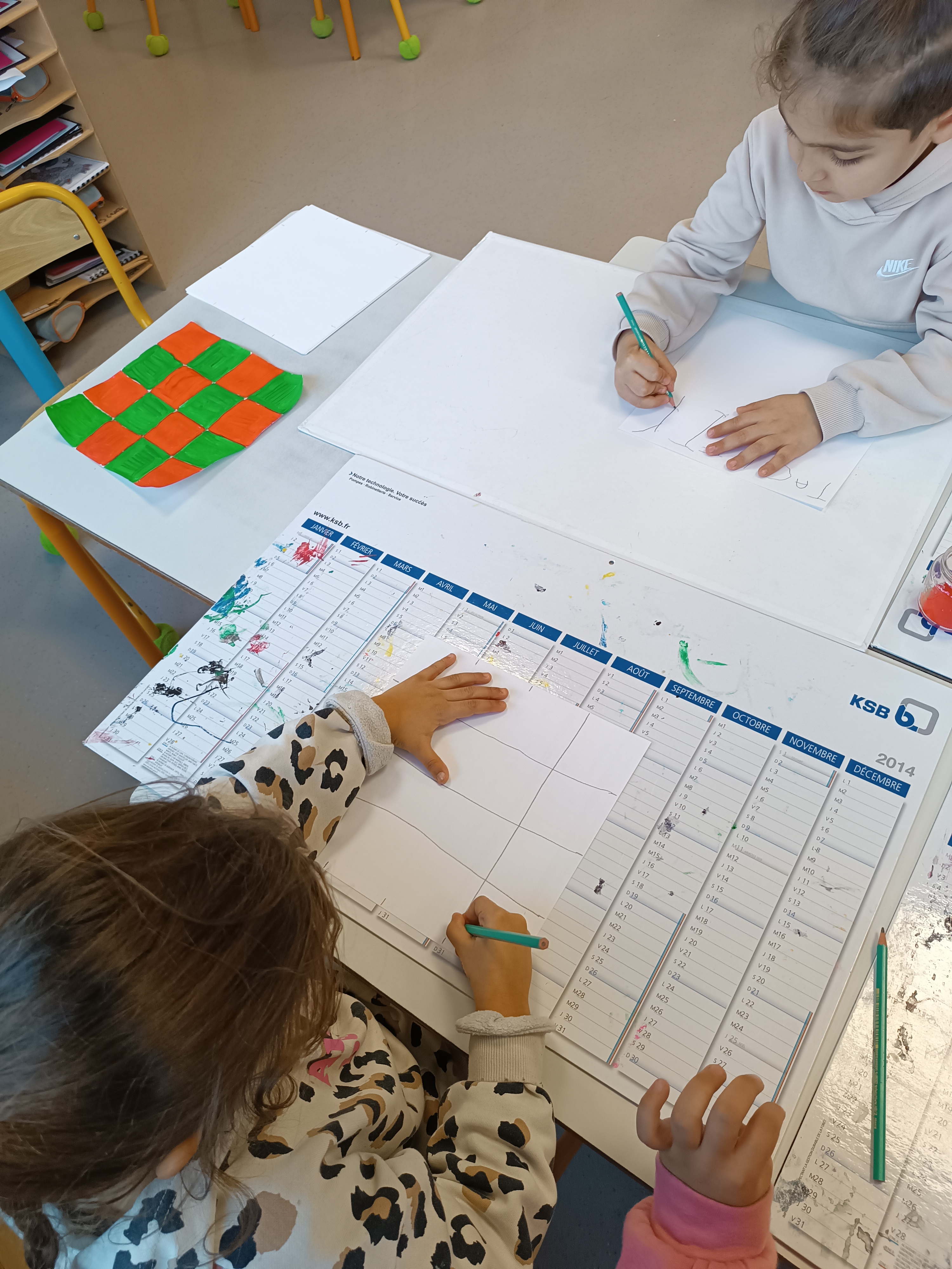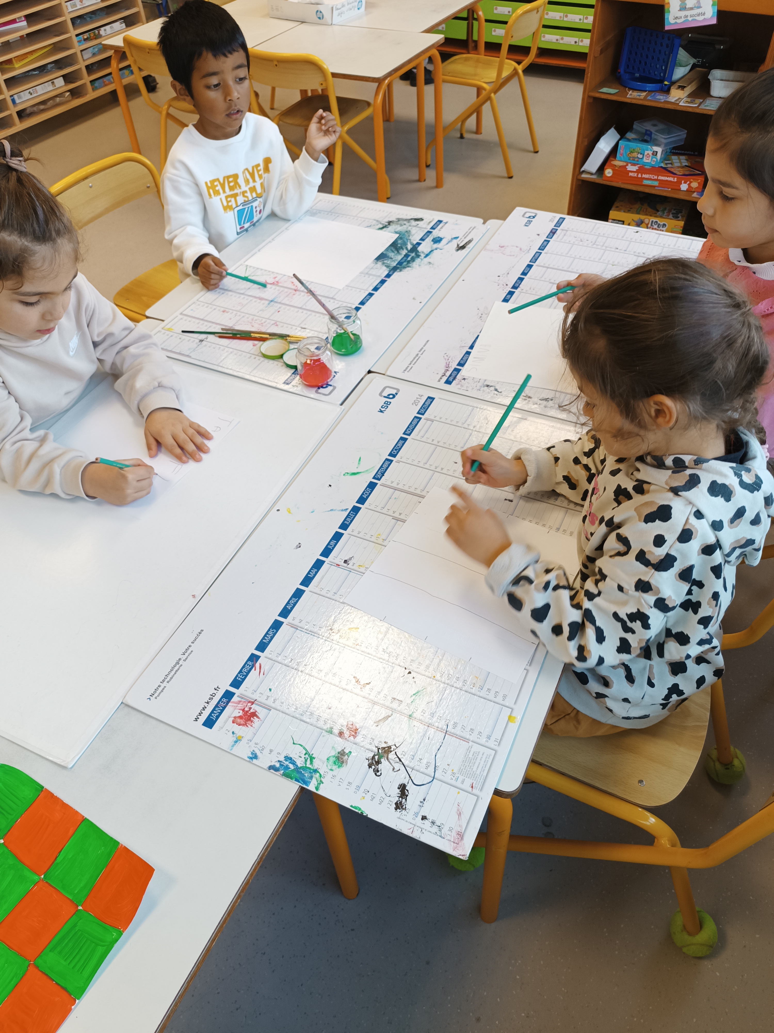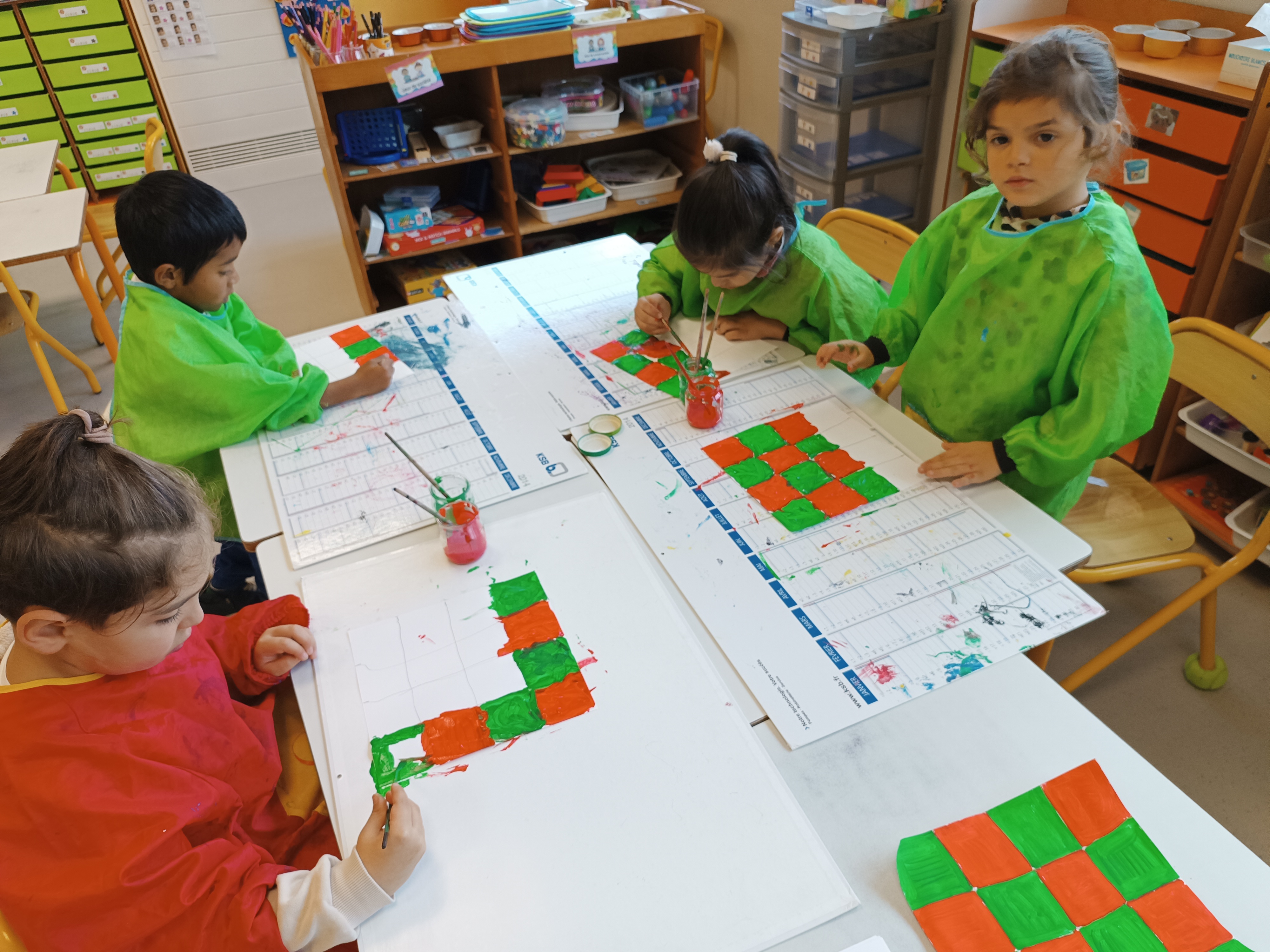 Graphisme : tracer un quadrillage puis le peindre en respectant la consigne : jamais 2 fois la même couleur à côté.