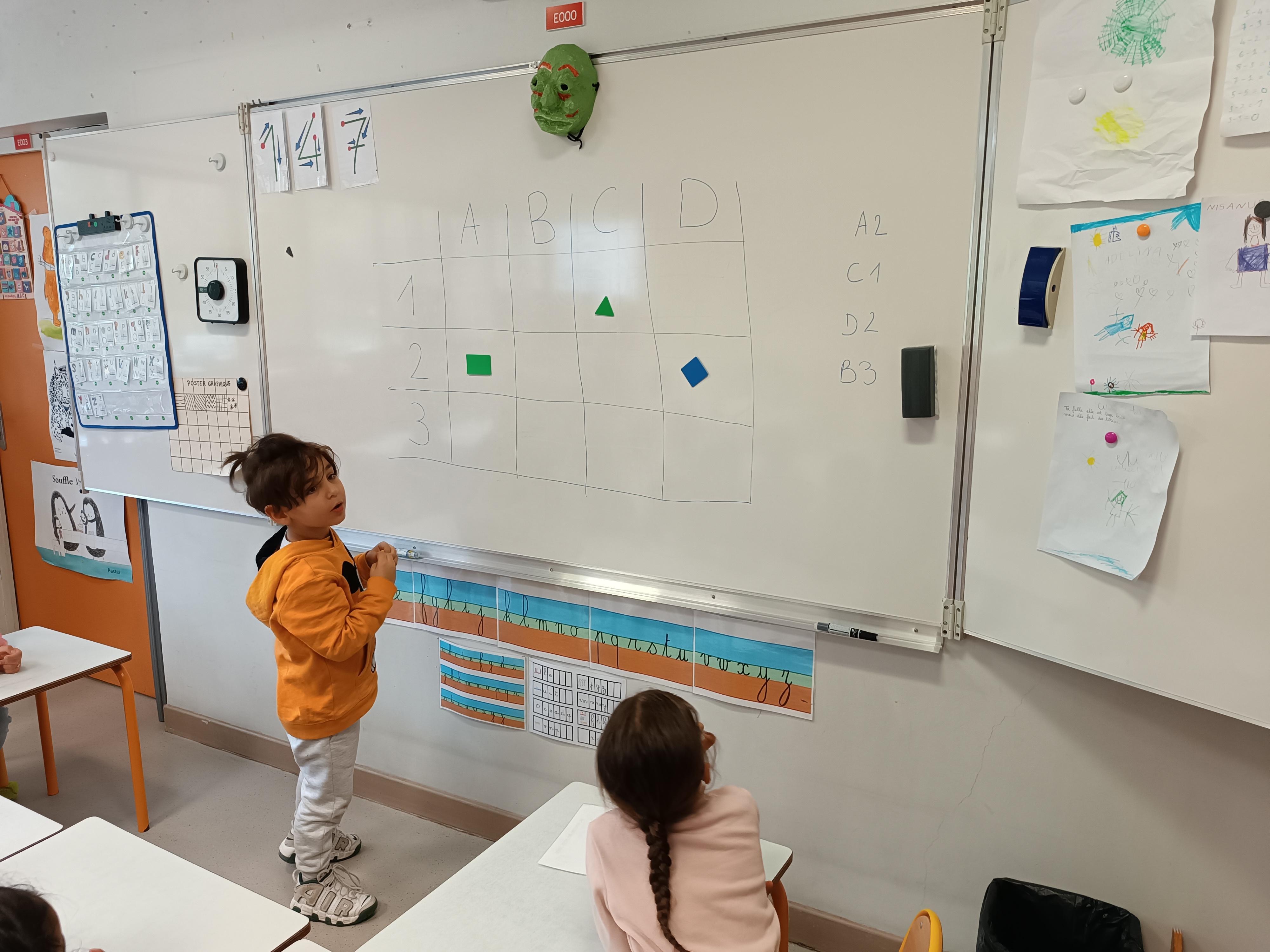 Reprise du travail mené en période 1 sur le tableau à double entrée : placer une image dans une case demandée nommée par une lettre et un chiffre (ex B3).