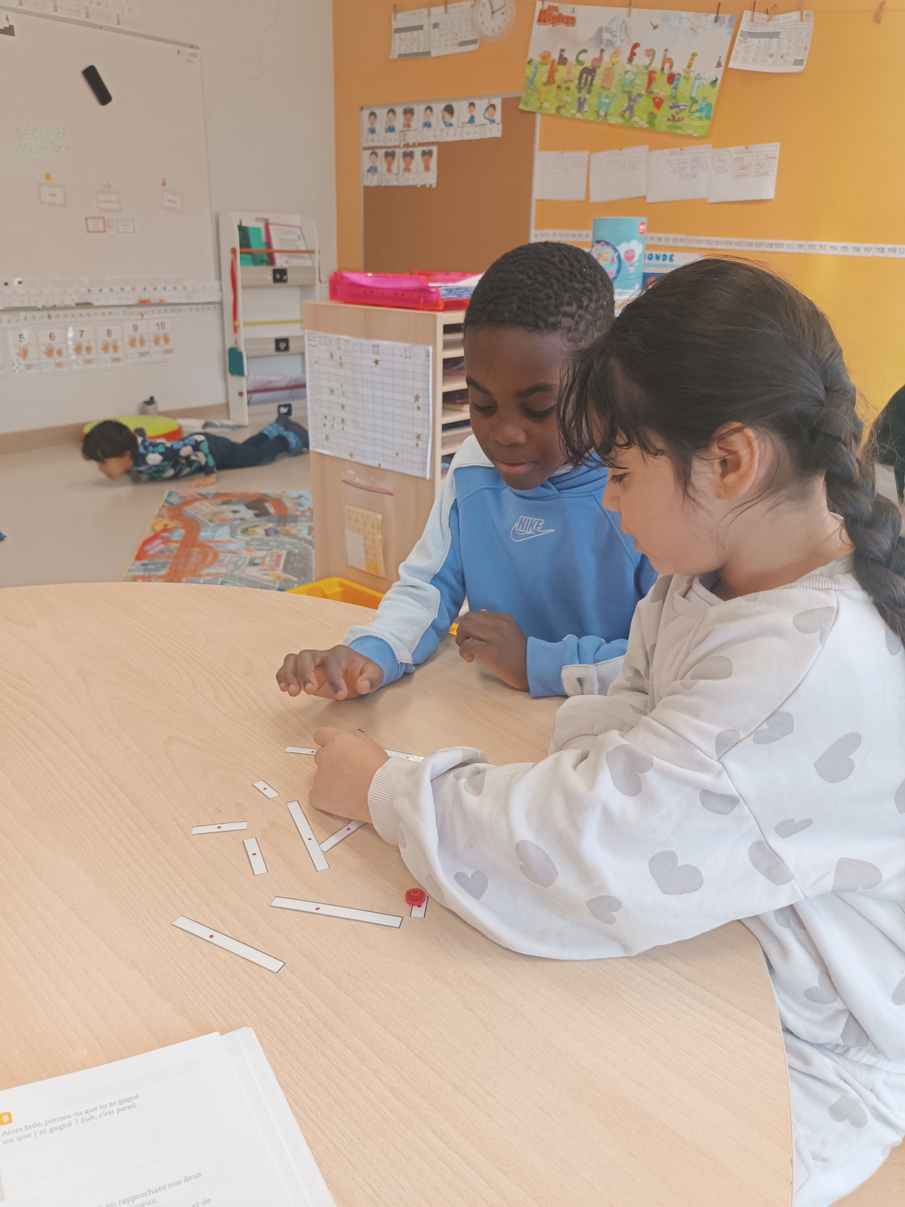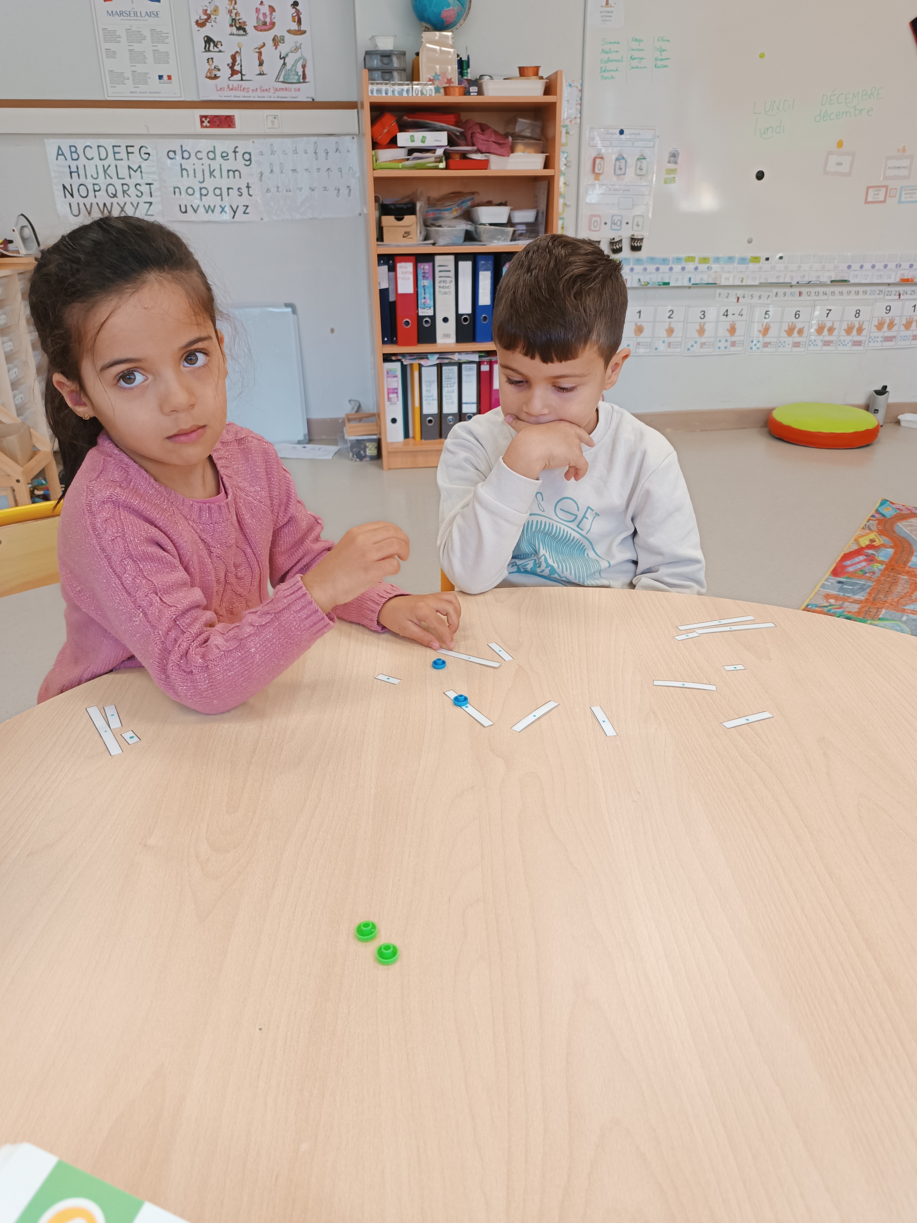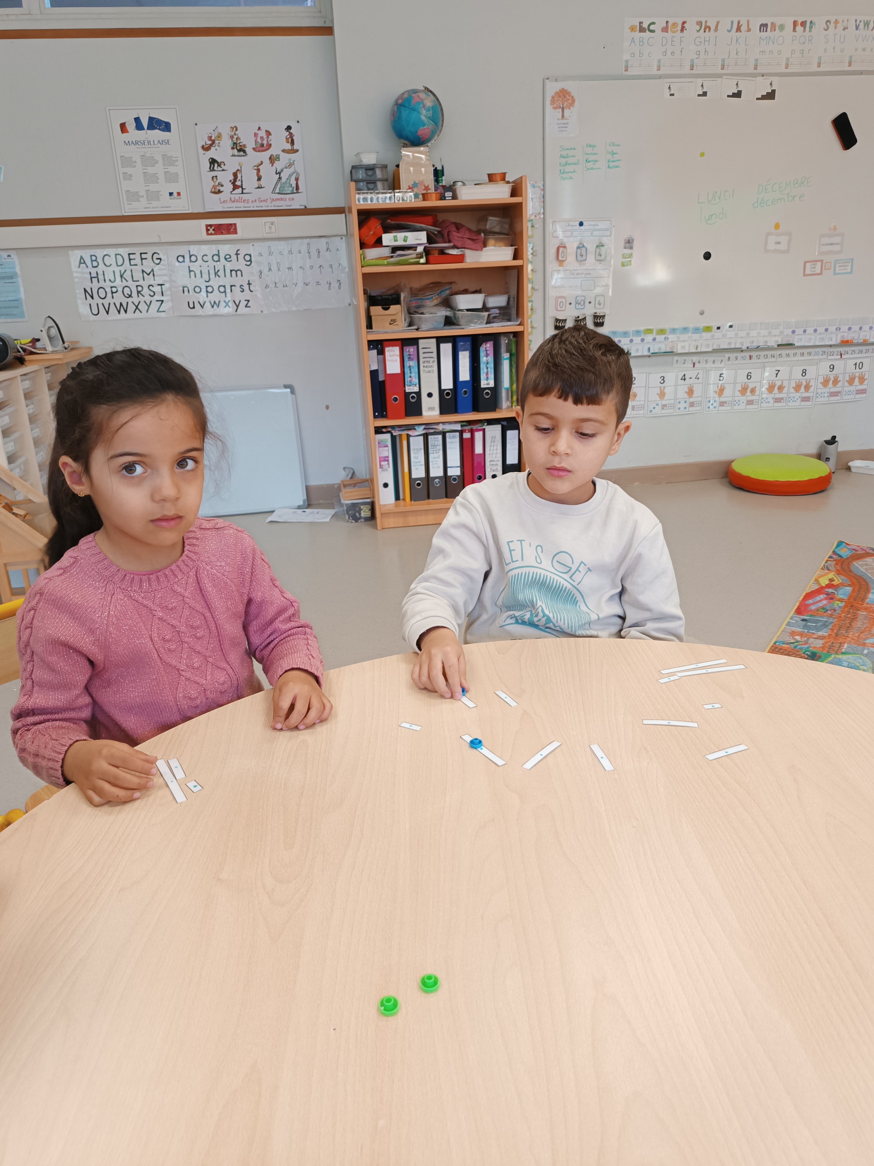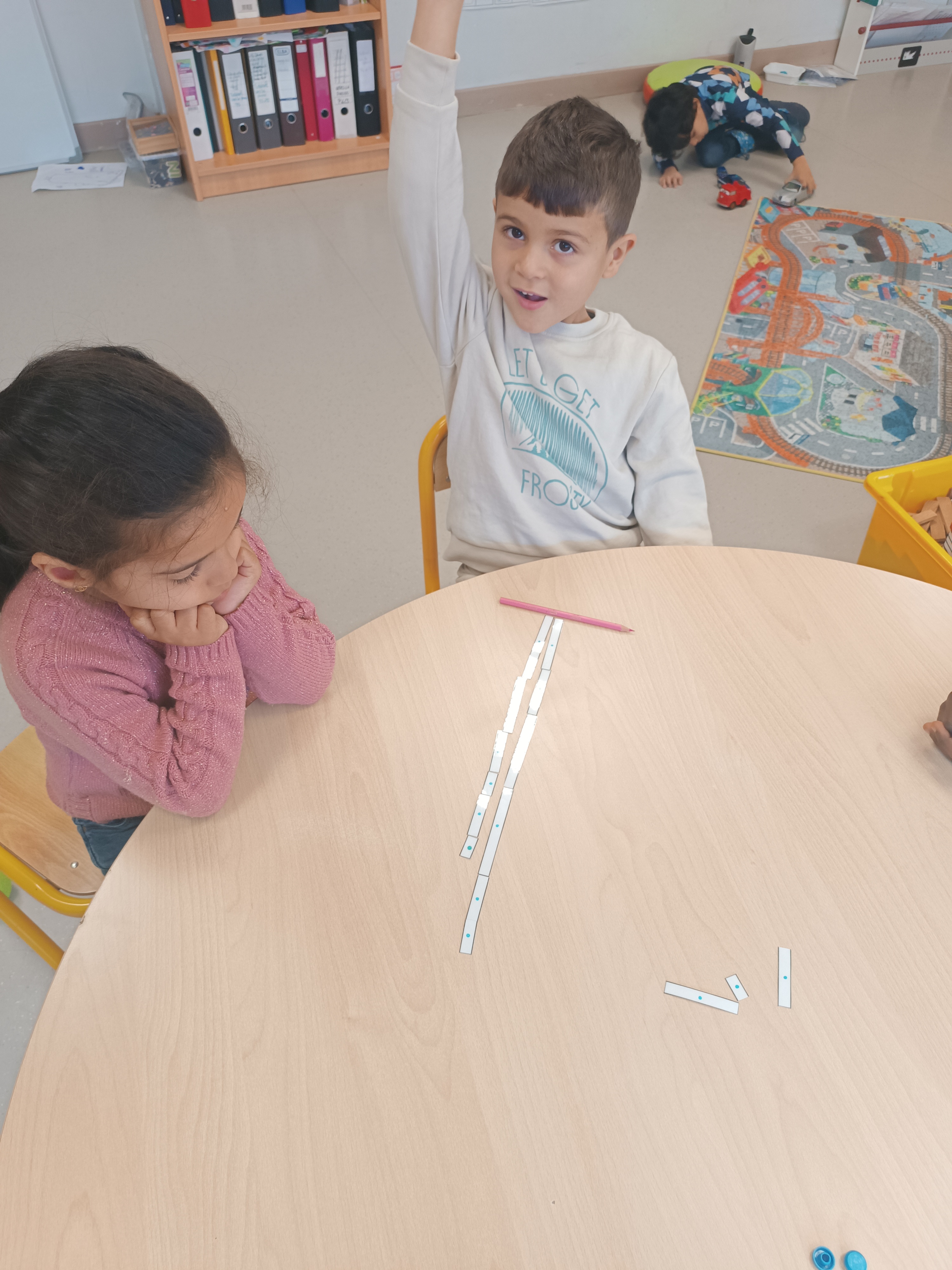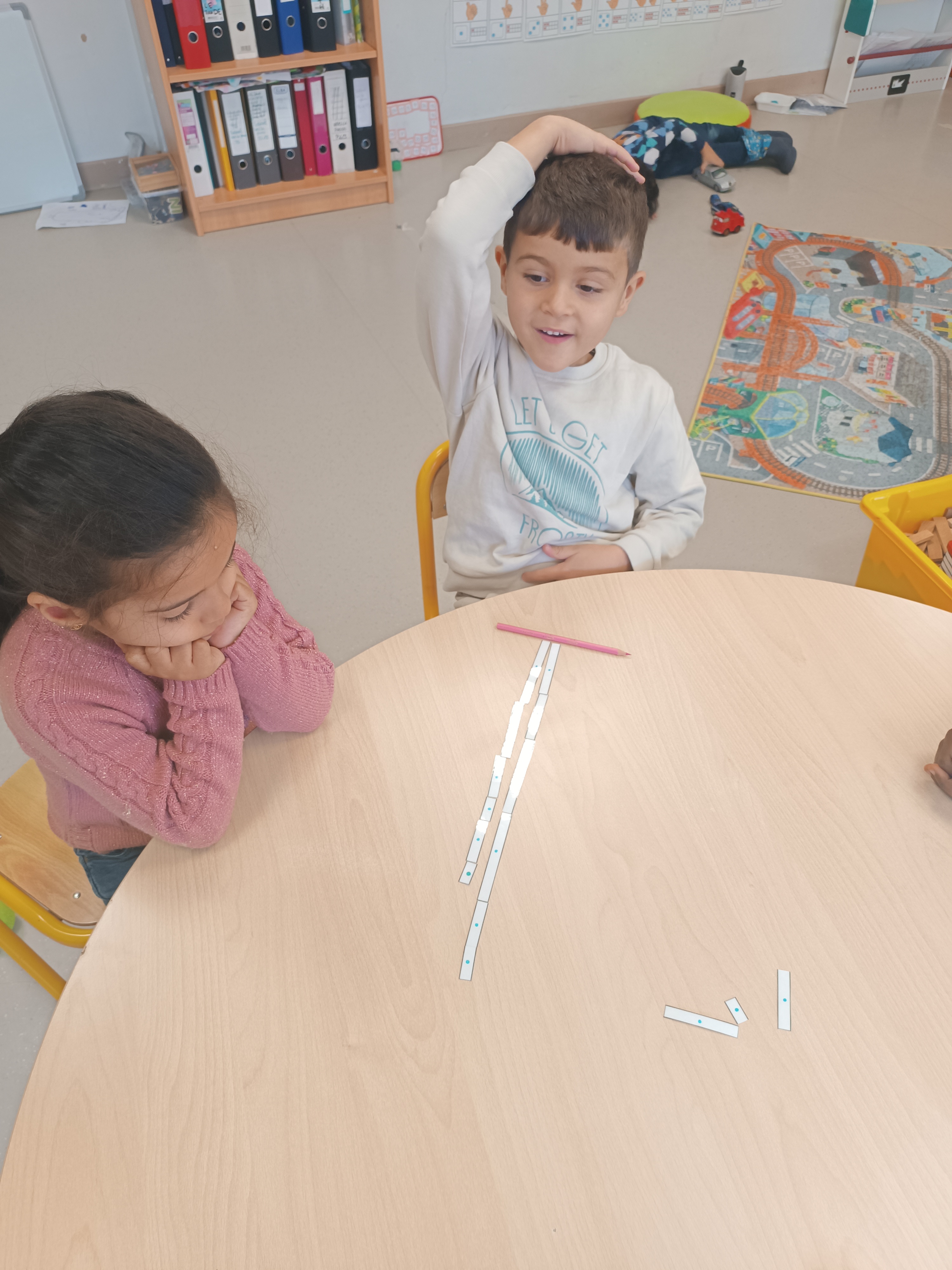 Les élèves sont en binôme. Ils disposent de 15 bâtons de longueurs différentes mais dont certaines longueurs sont très proches et difficilement differenciables à l'oeil nu. A tour de rôle, ils choisissent 2 bâtons en posant un jeton dessus. Celui qui n'a pas posé les jetons choisi le bâton qu'il veut garder pour compléter son train, l'idée étant de garder le plus long. A la fin, on compare les trains et celui qui a le plus long gagne la partie.