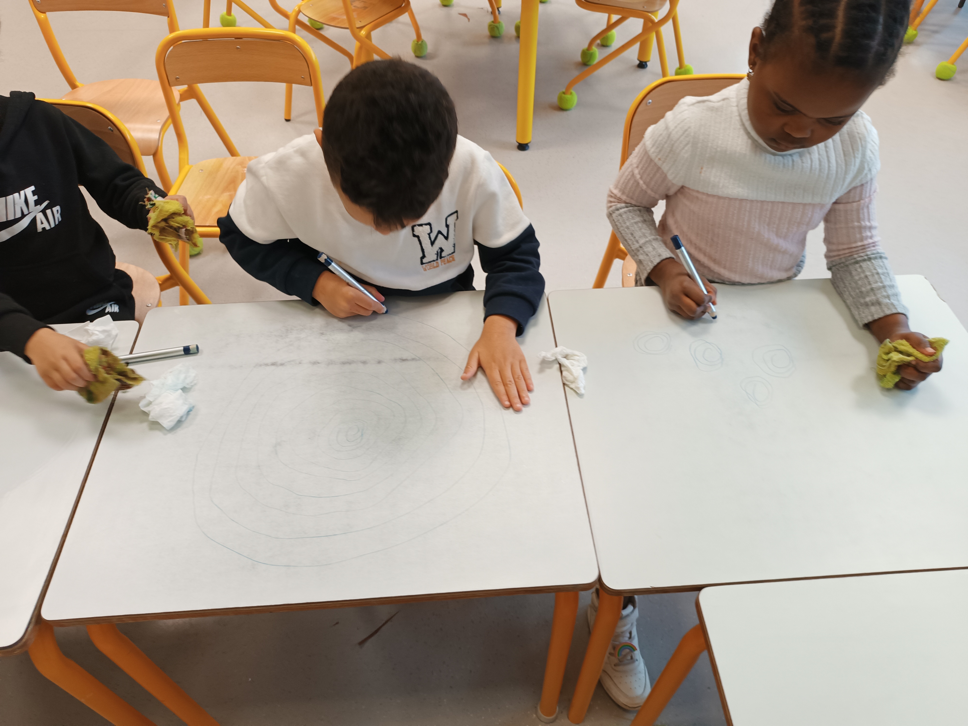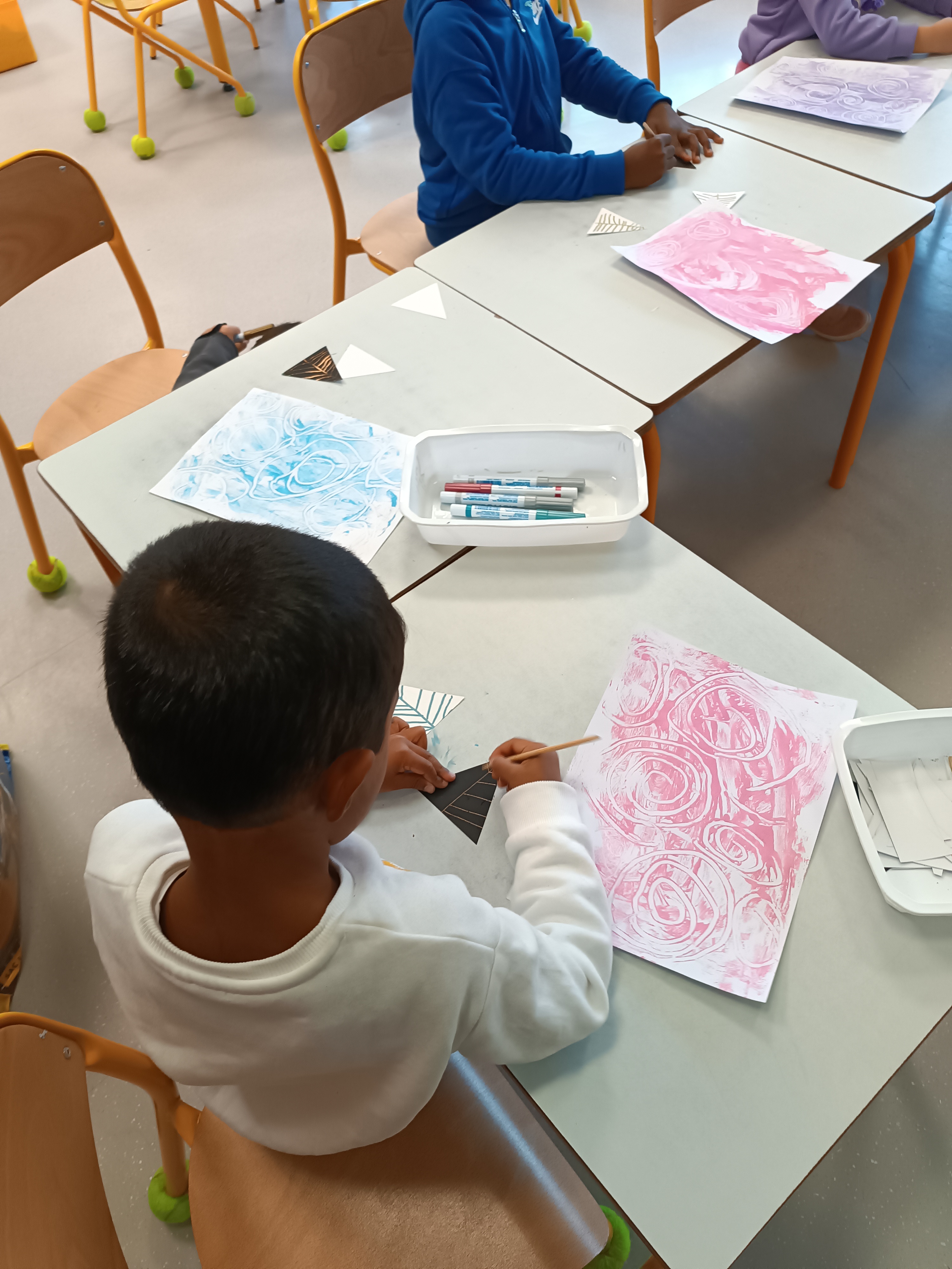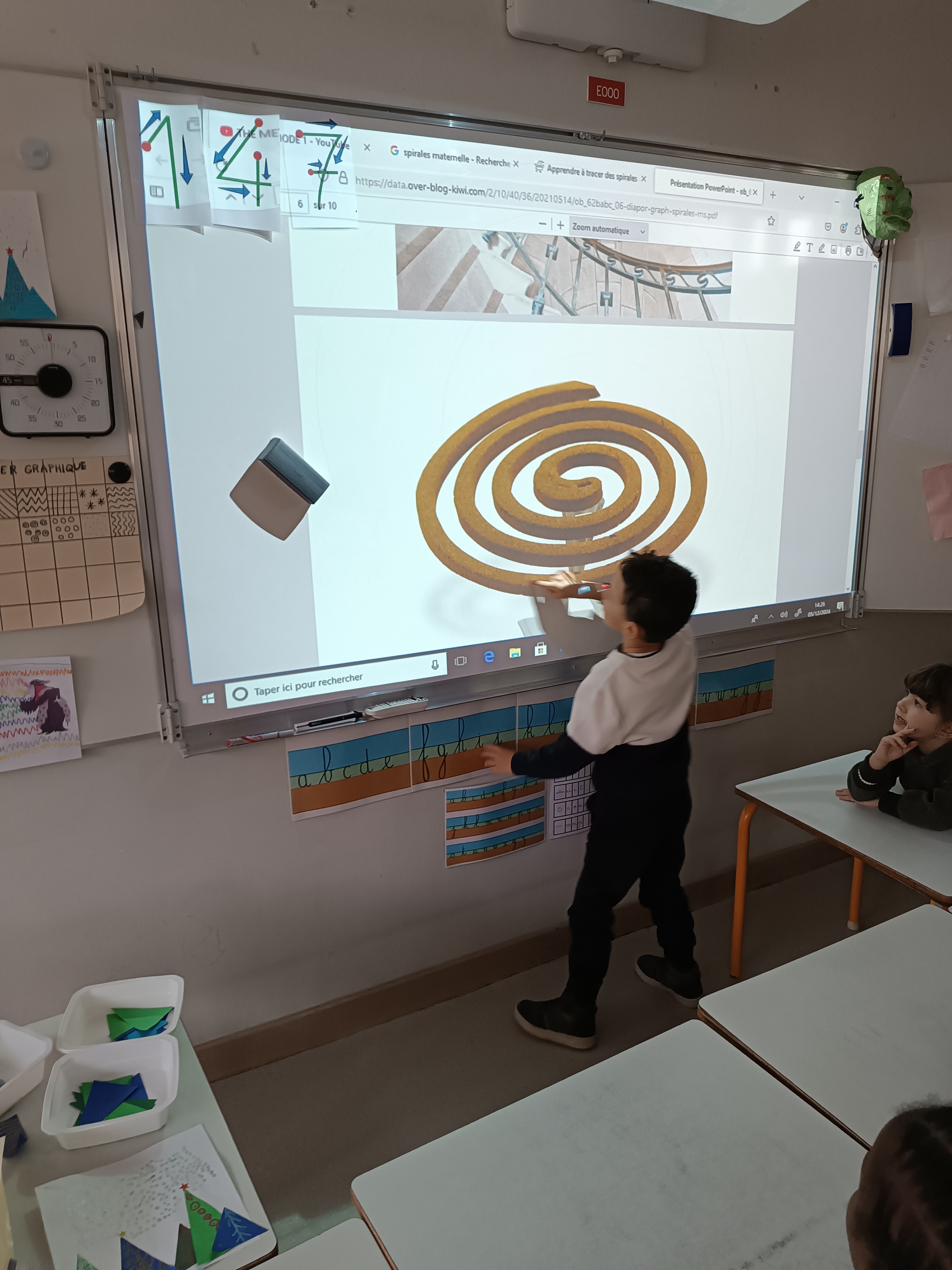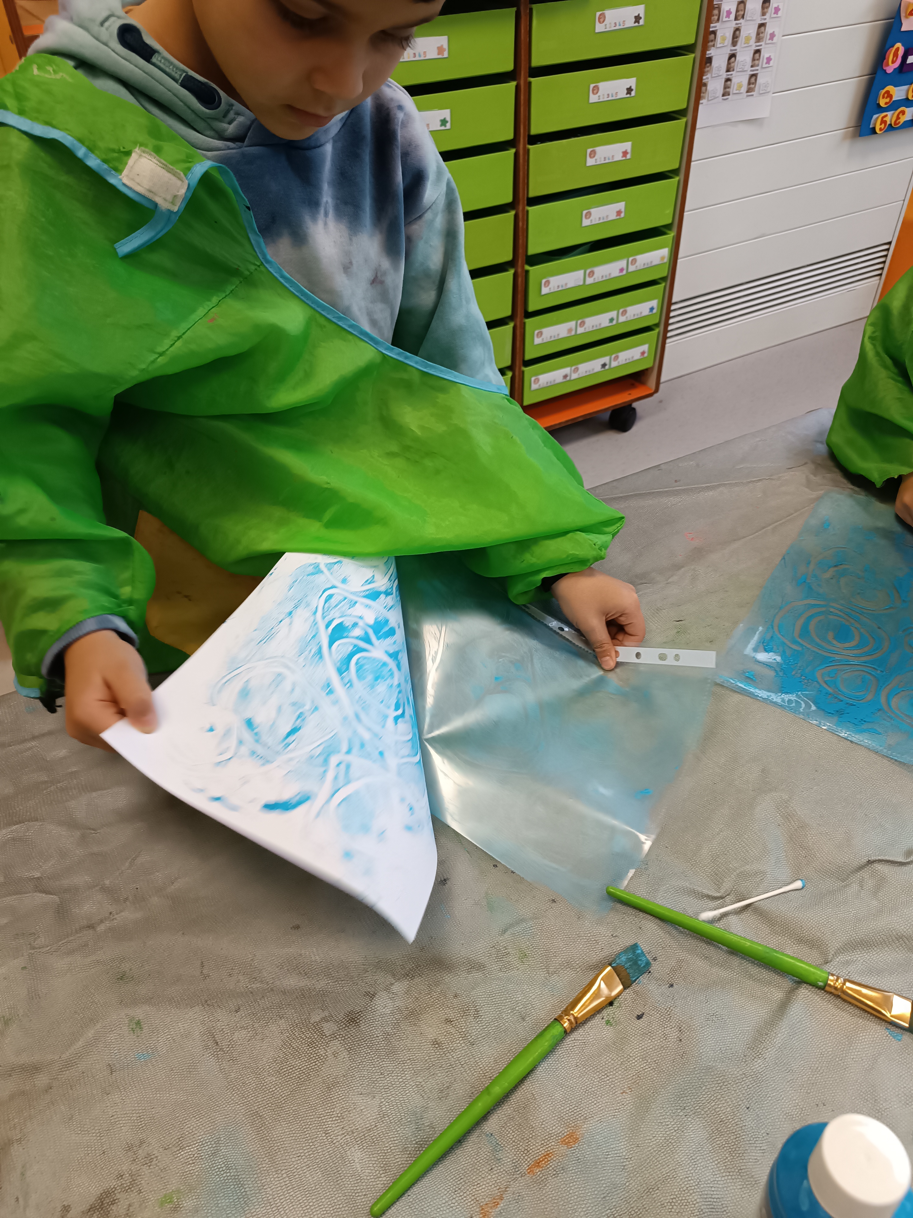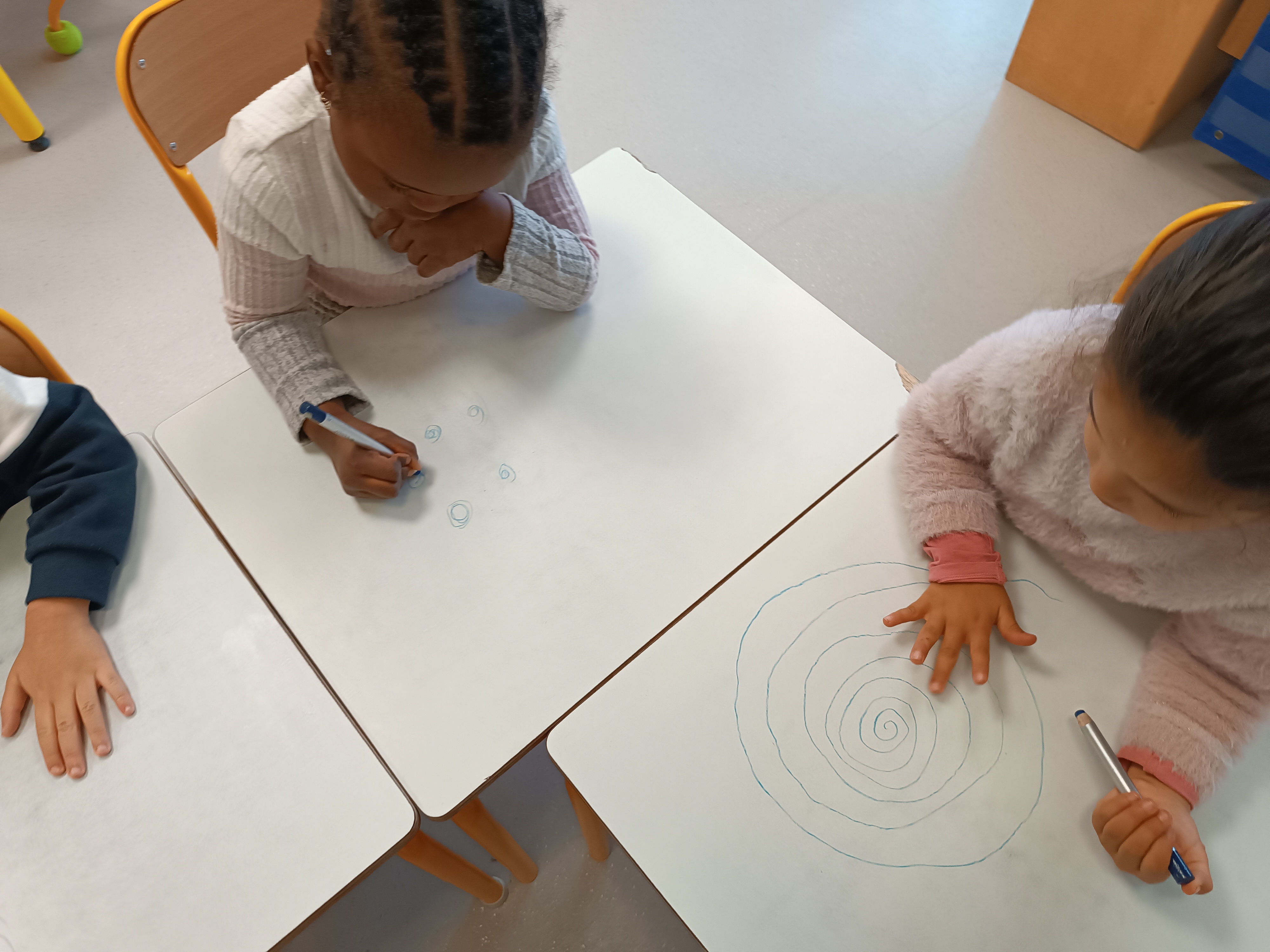 Découverte d'un nouveau graphisme, la spirale, mais aussi, d'une nouvelle technique : l'impression sur feuille.