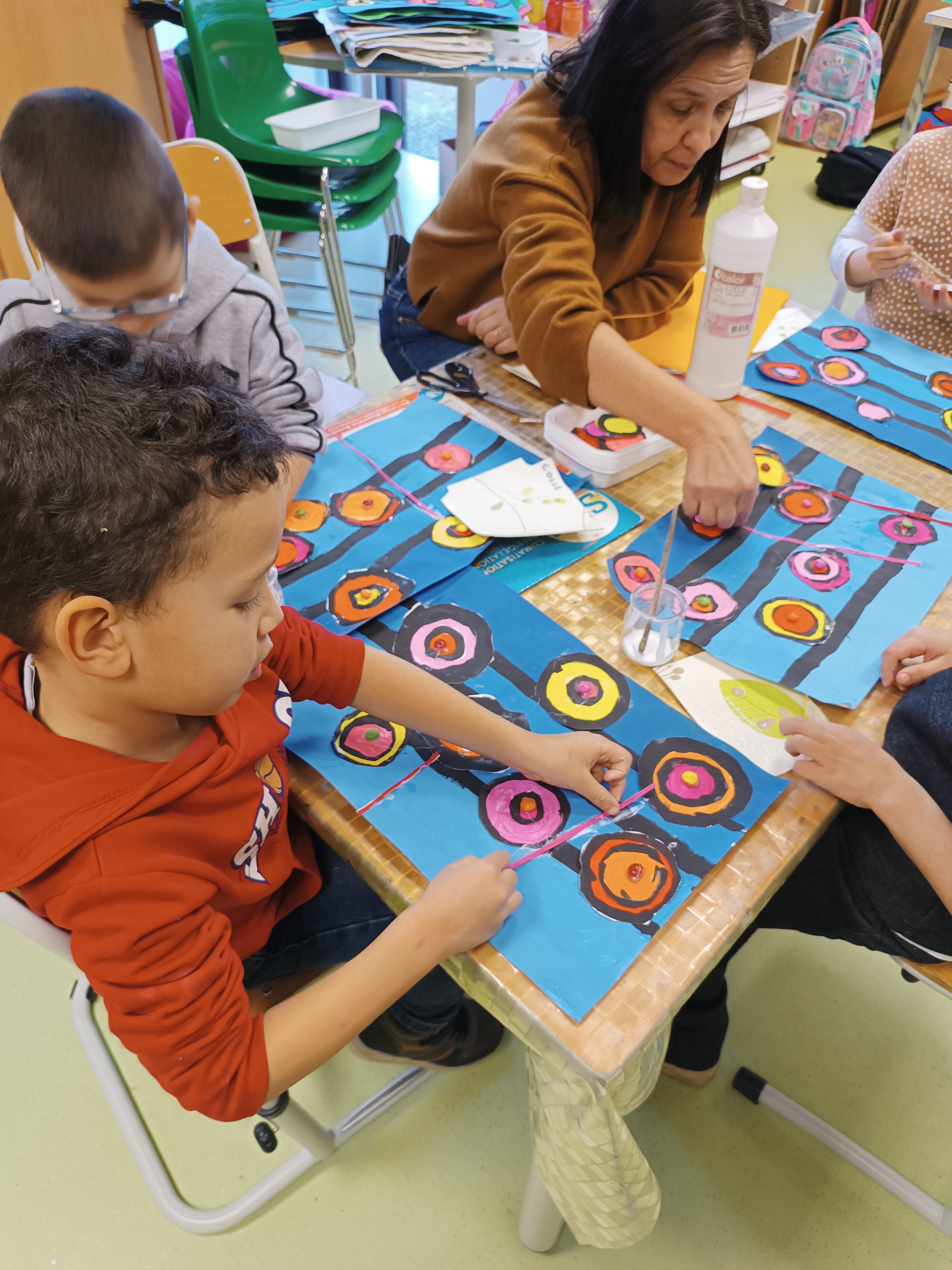 Nous avons terminé nos "arbres sucettes" à la manière d'hundertwasser.