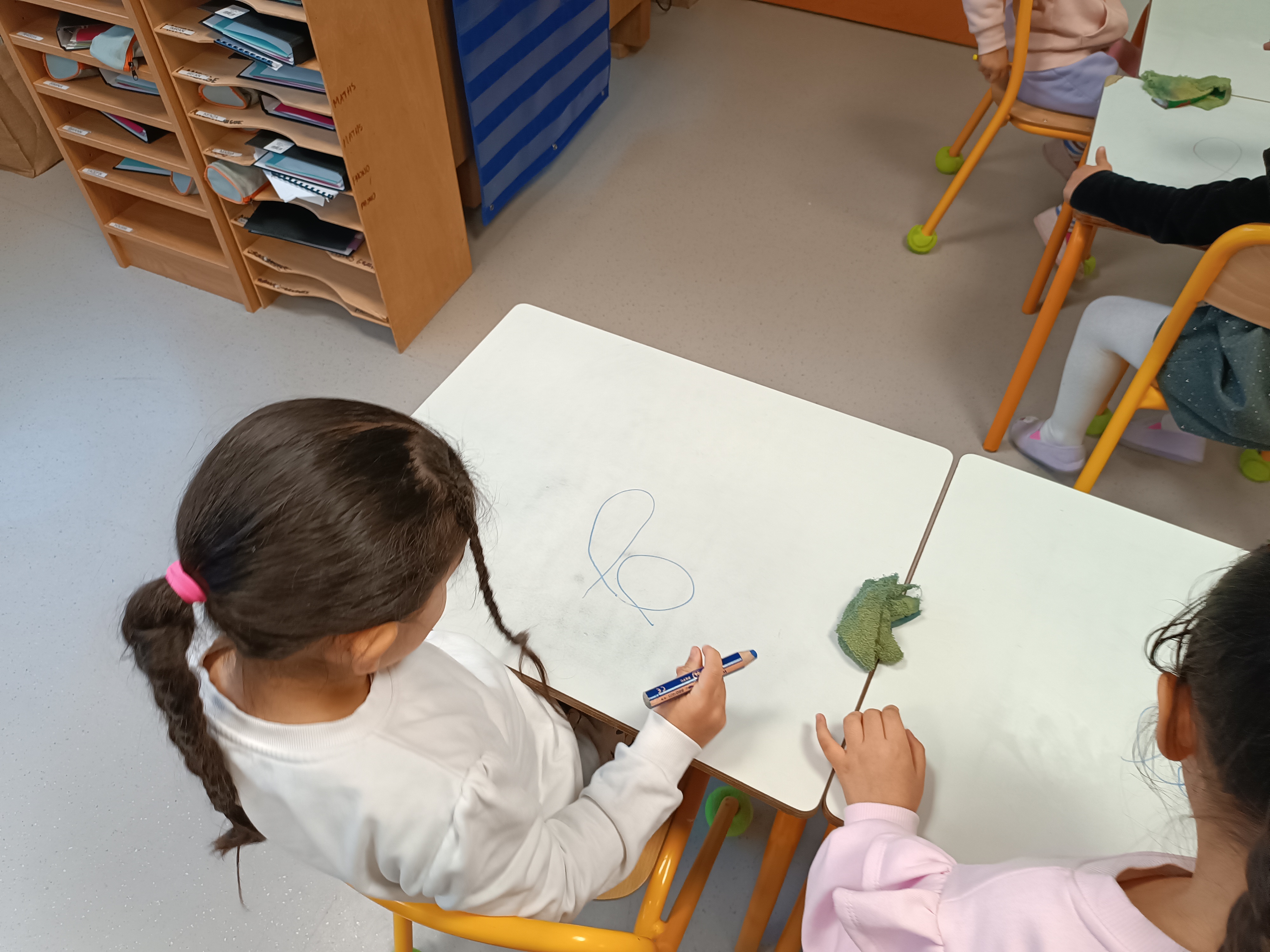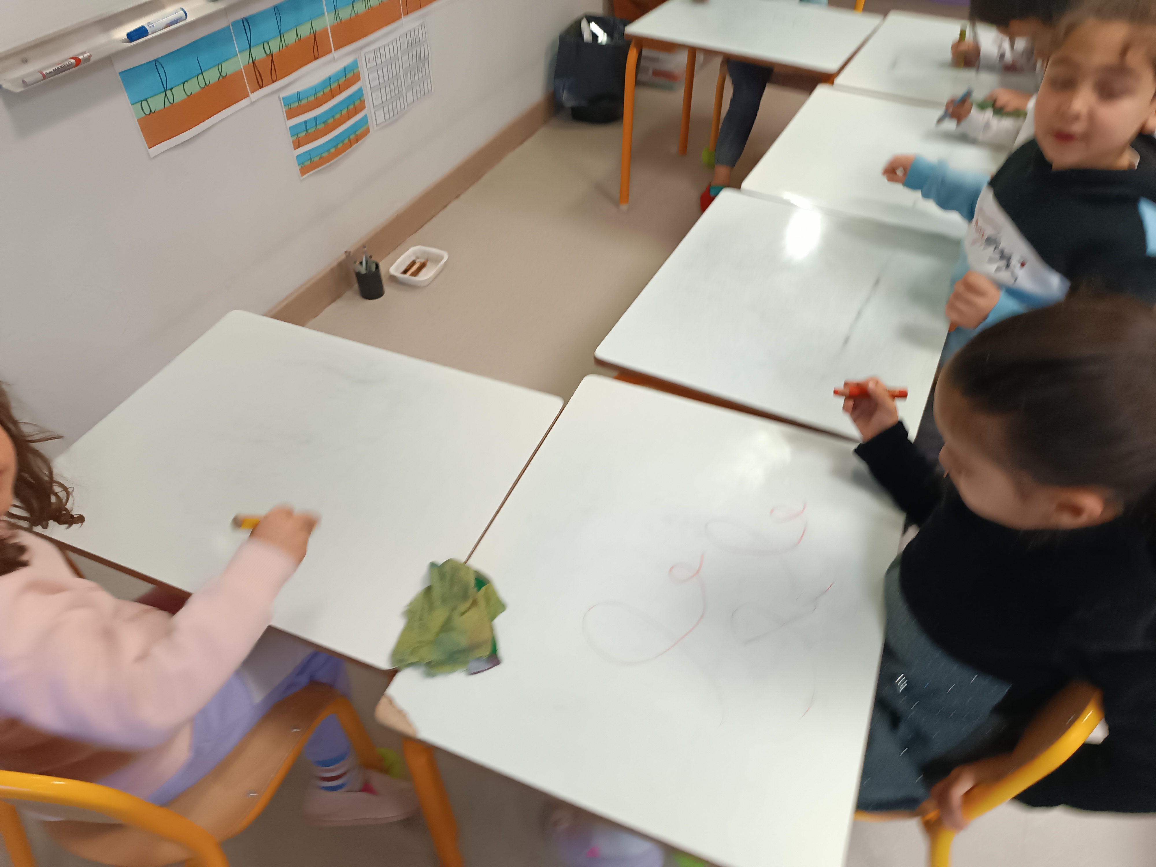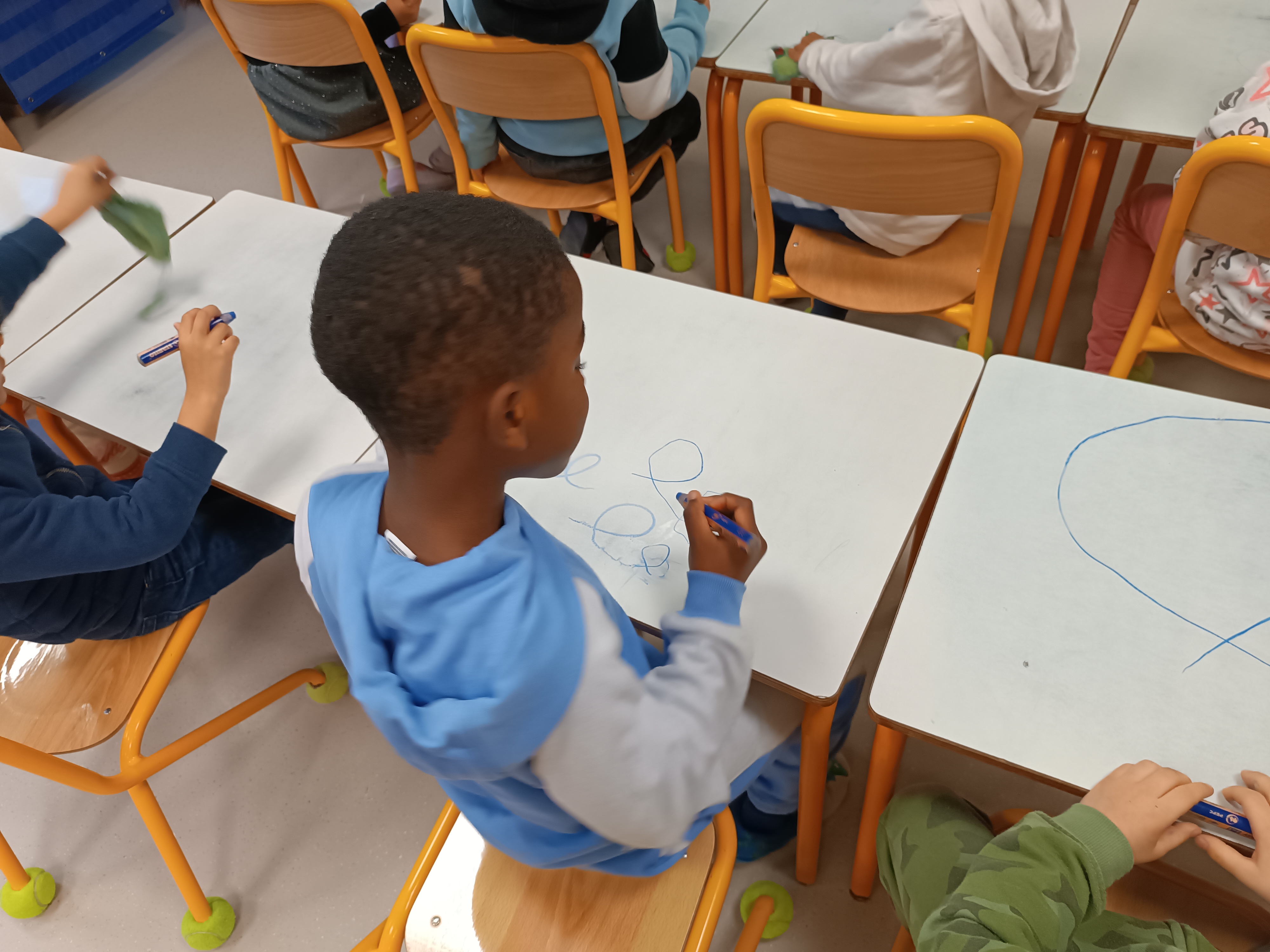 C'est parti pour l'écriture en attaché. Les enfants ont écrit leurs premières lettres en attaché et donc leur premier mot : l + e = le.