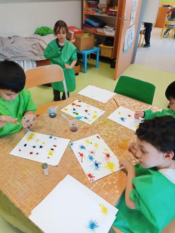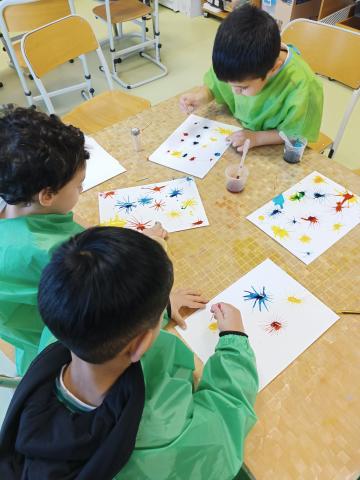 Préparation de la page de présentation de la période dans le classeur. Les "feux d'artifice" : déposer une goutte d'encre à la pipette puis étirer la goutte à l'aide d'un cure-dents.