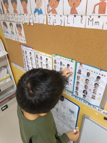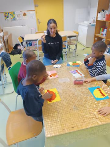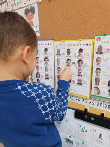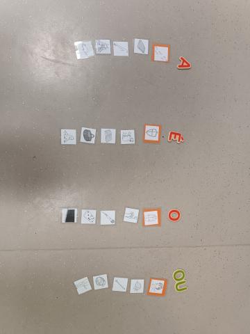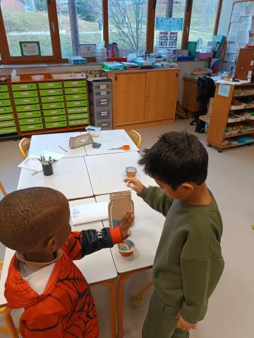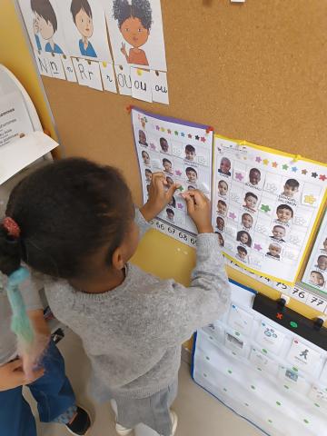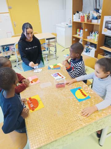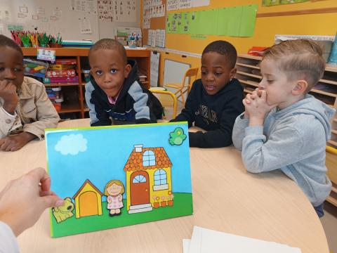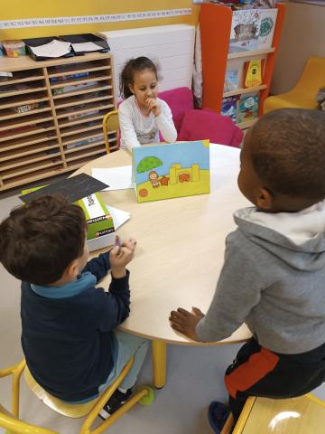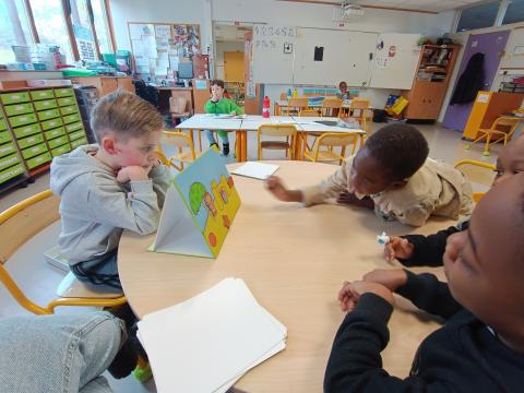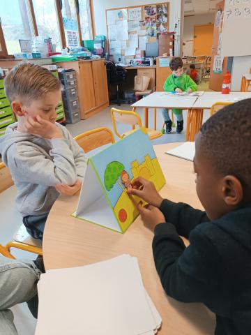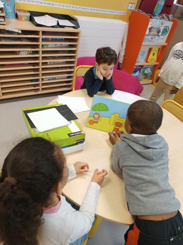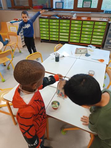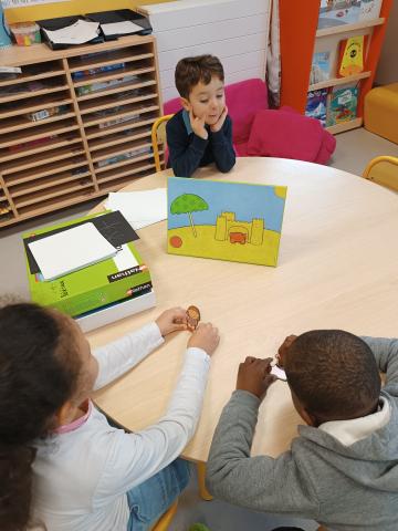 On travaille sur le vocabulaire de repérage dans l'espace : en premier, je donne les indications et les élèves placent leur personnage au bon endroit. Puis ce sont eux qui me donnent les indications pour que je place les personnages correctement. Enfin, un élève donne les indications aux autres élèves du groupe. Ce jeu a bien plu 😊