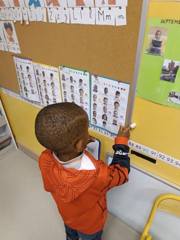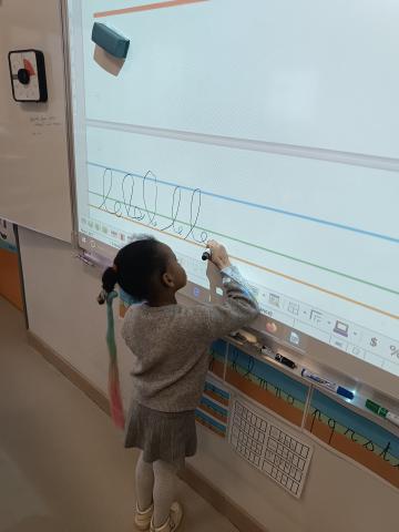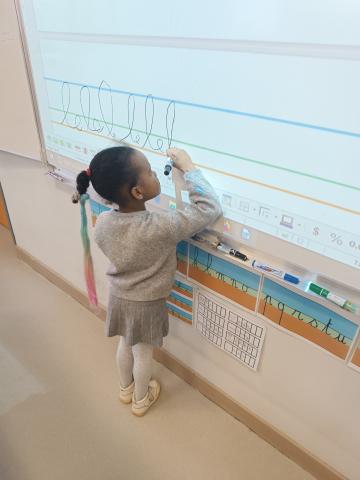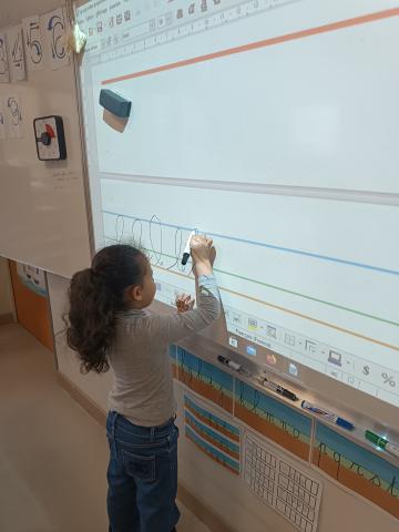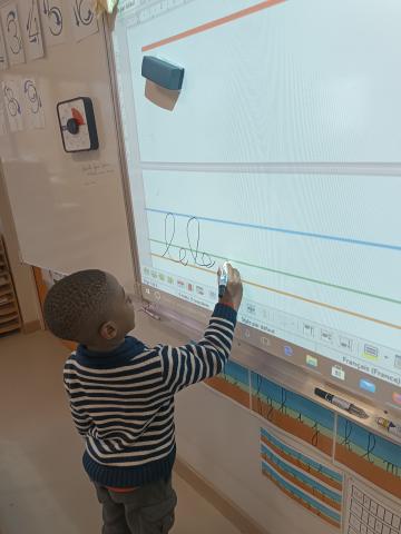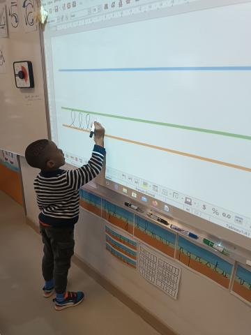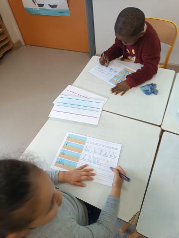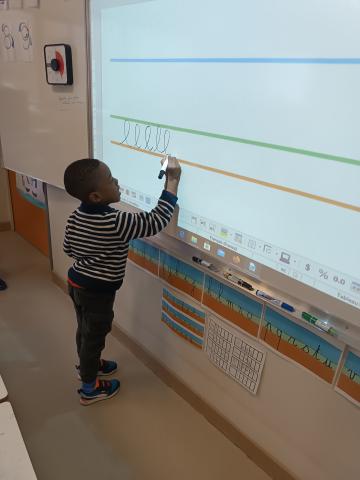 On poursuit notre apprentissage de l'écriture en attachée. Cette fois-ci, on s'entraîne à écrire en respectant les interlignes, au tableau puis sur feuille.