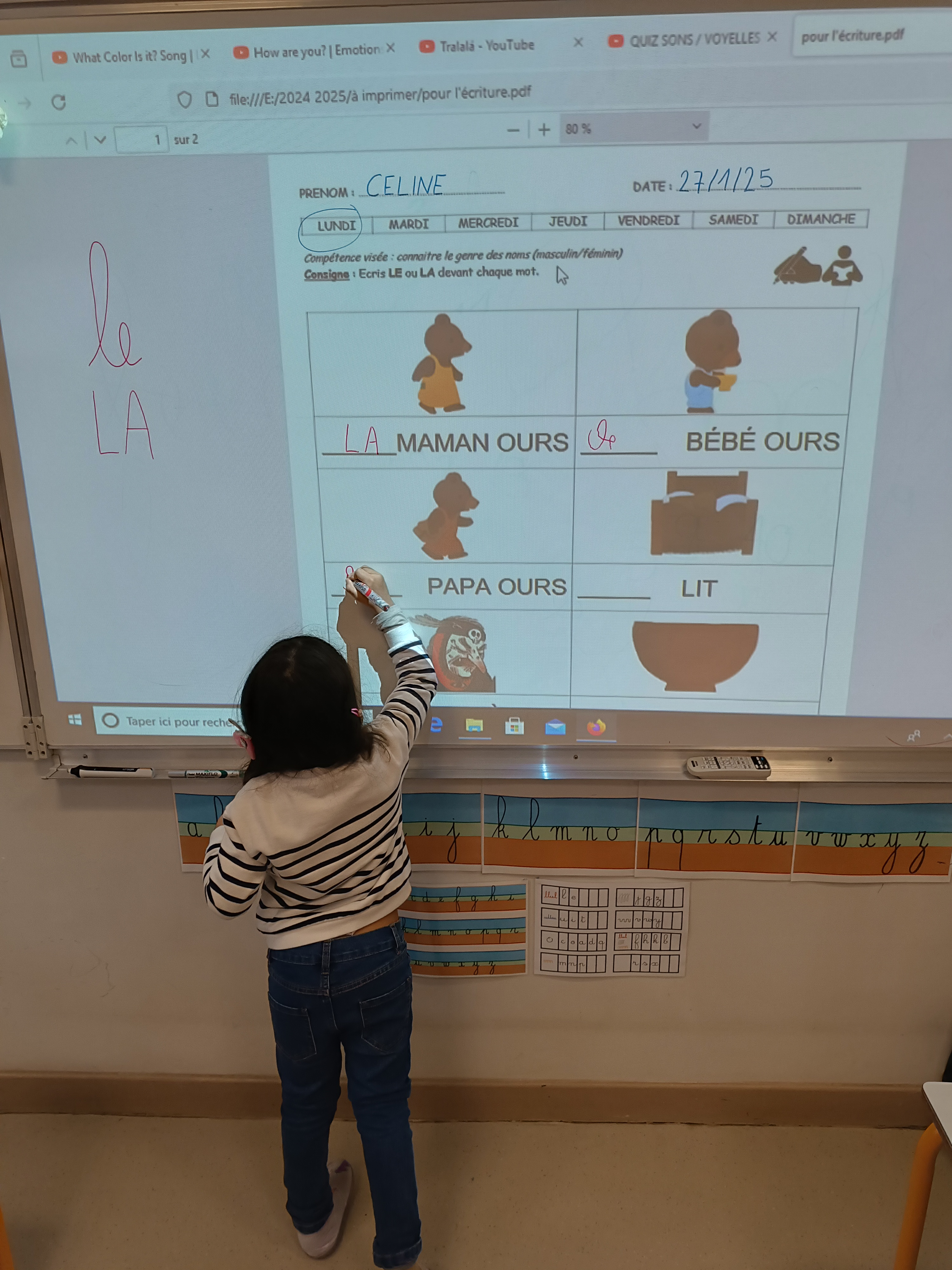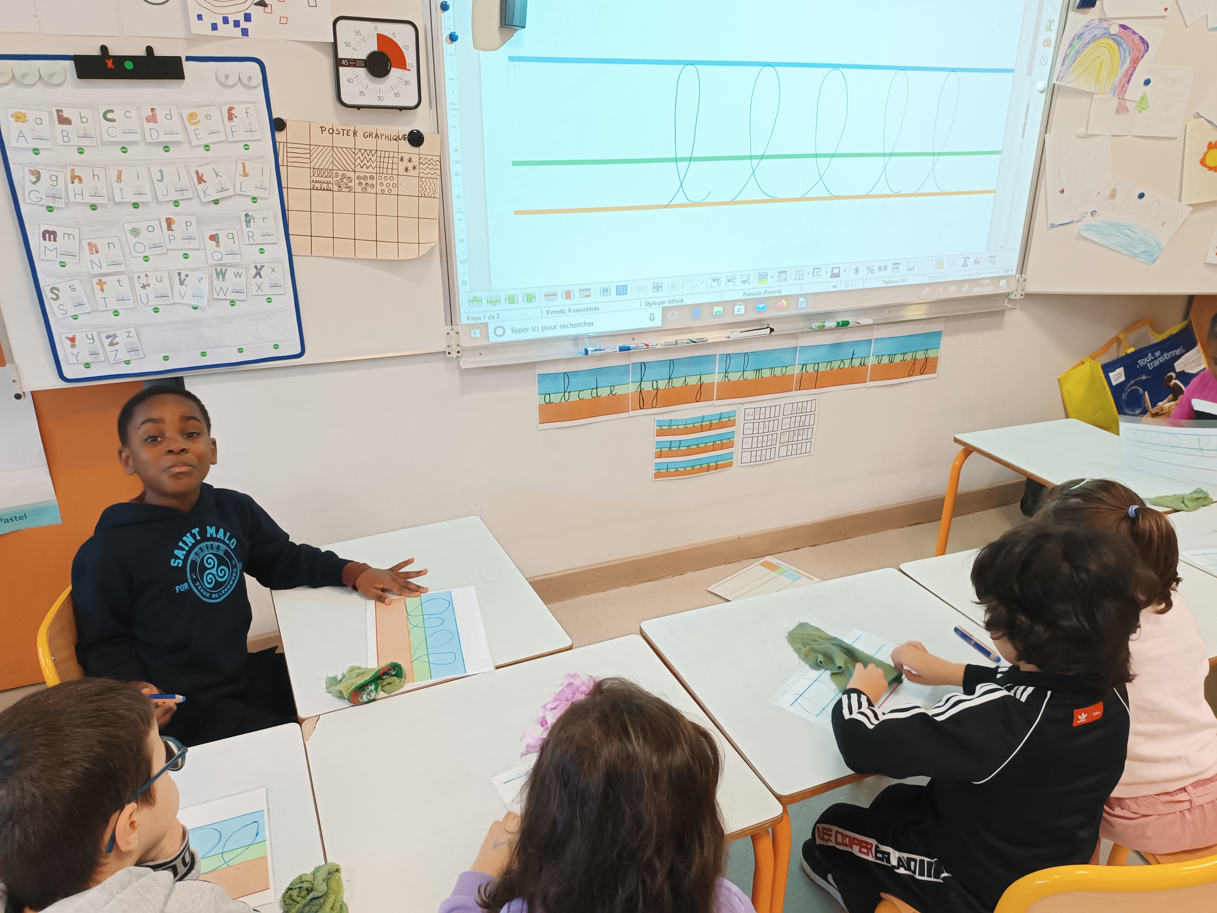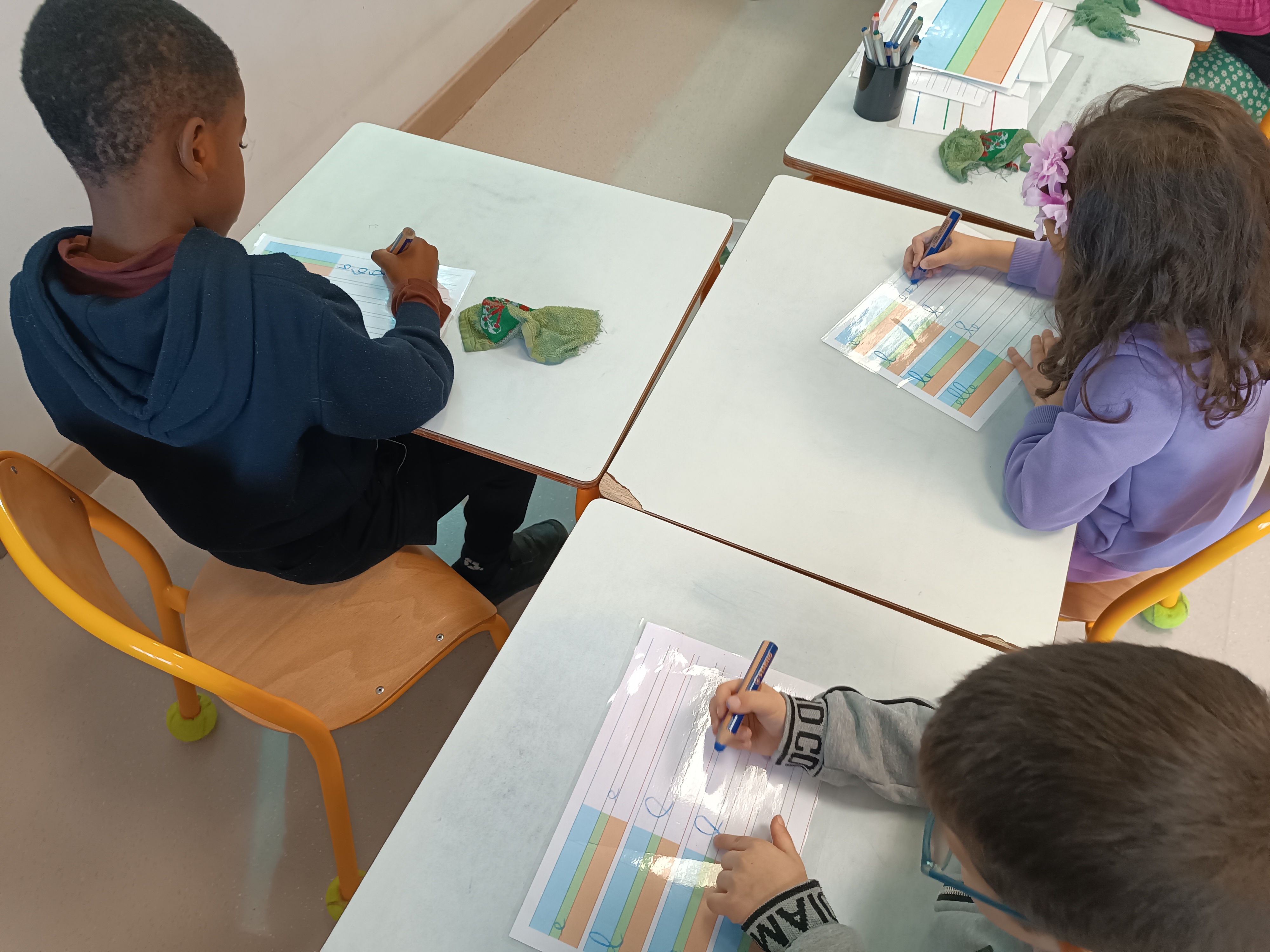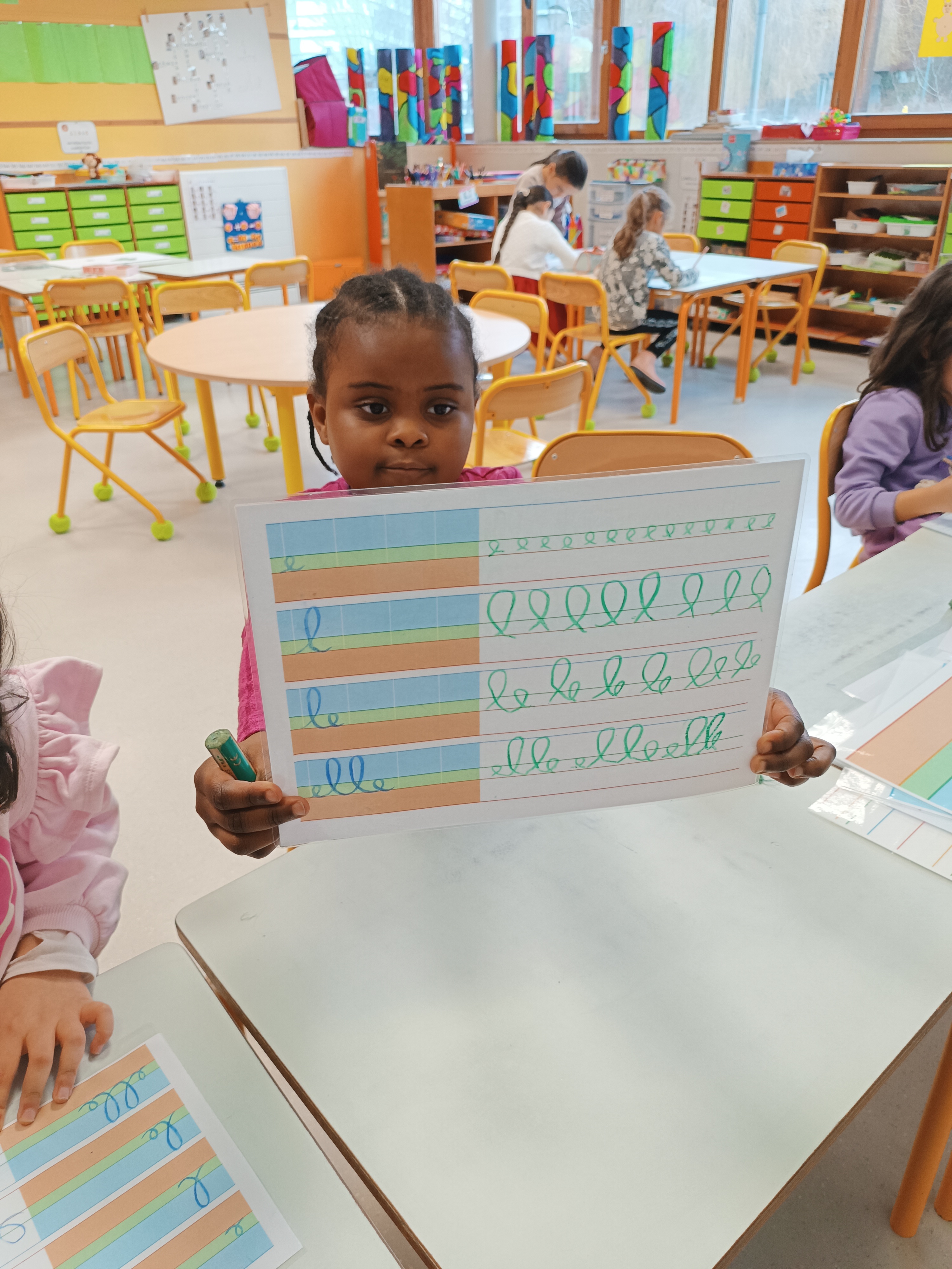 Nous avons poursuivi notre apprentissage de l'écriture en attaché. Après avoir revu comment écrire le mot "le", nous avons appris à écrire un 2ème mot : "elle". Après un entraînement sur la table, nous sommes passés sur feuille pour employer ce mot correctement.