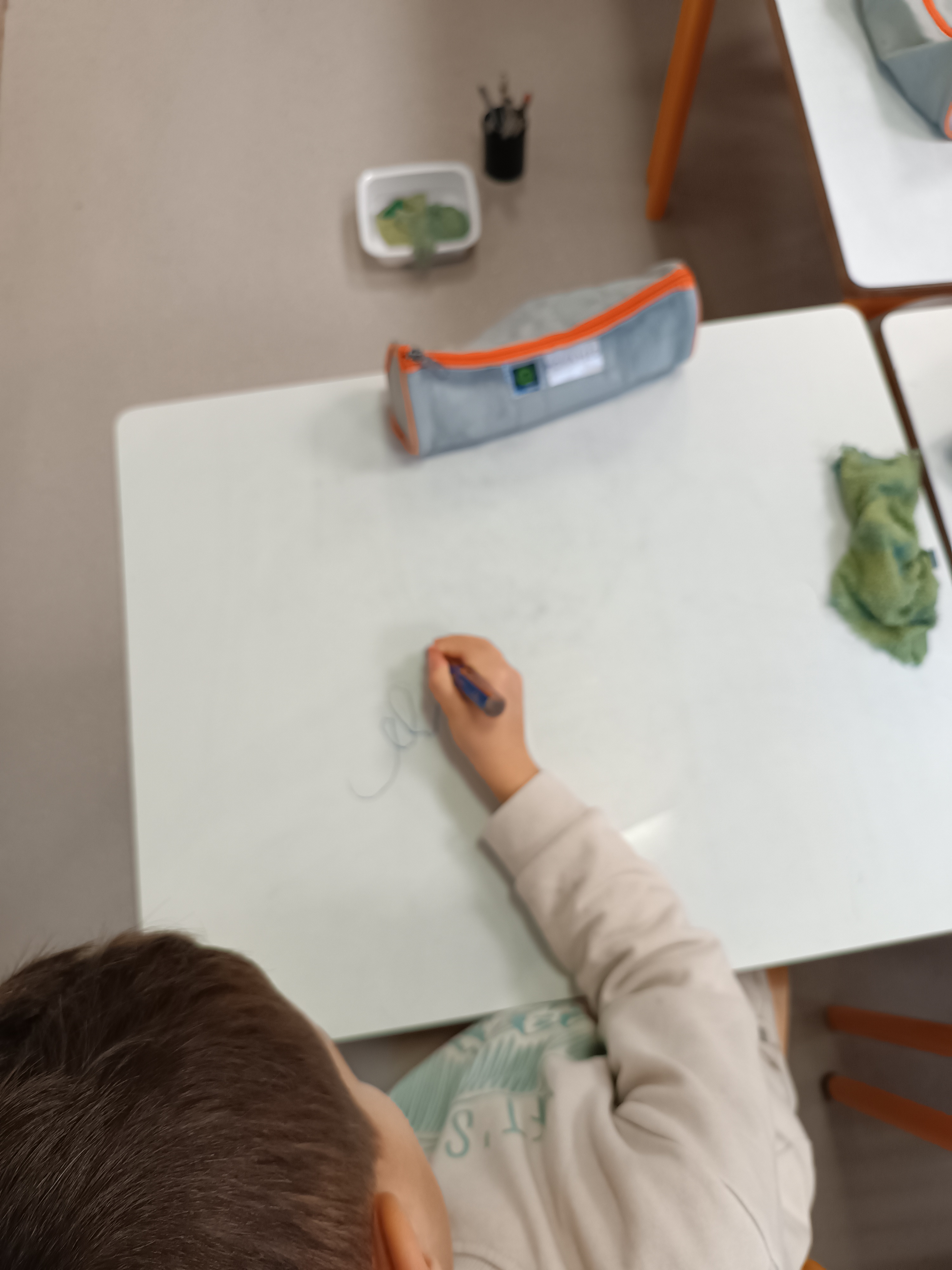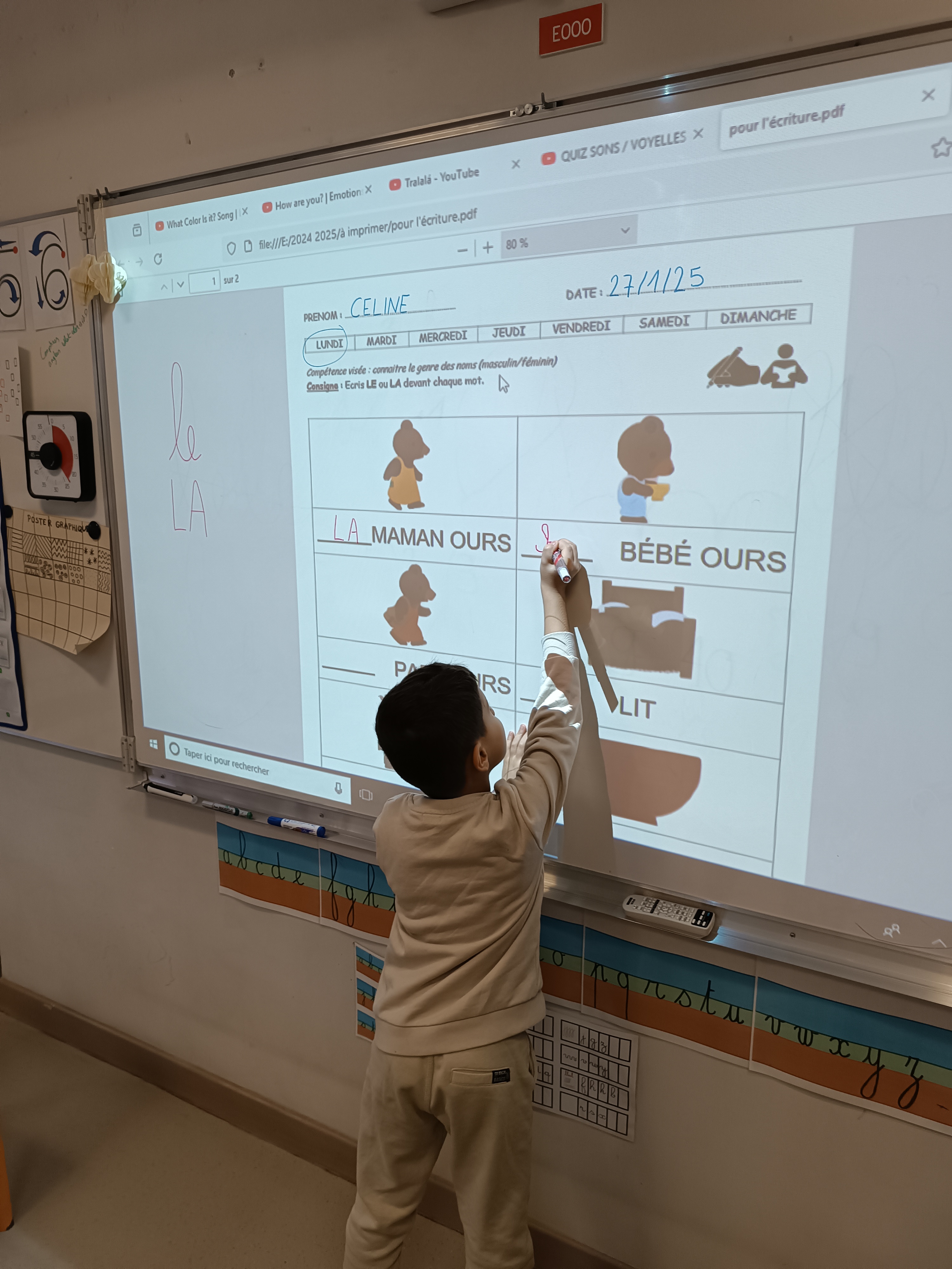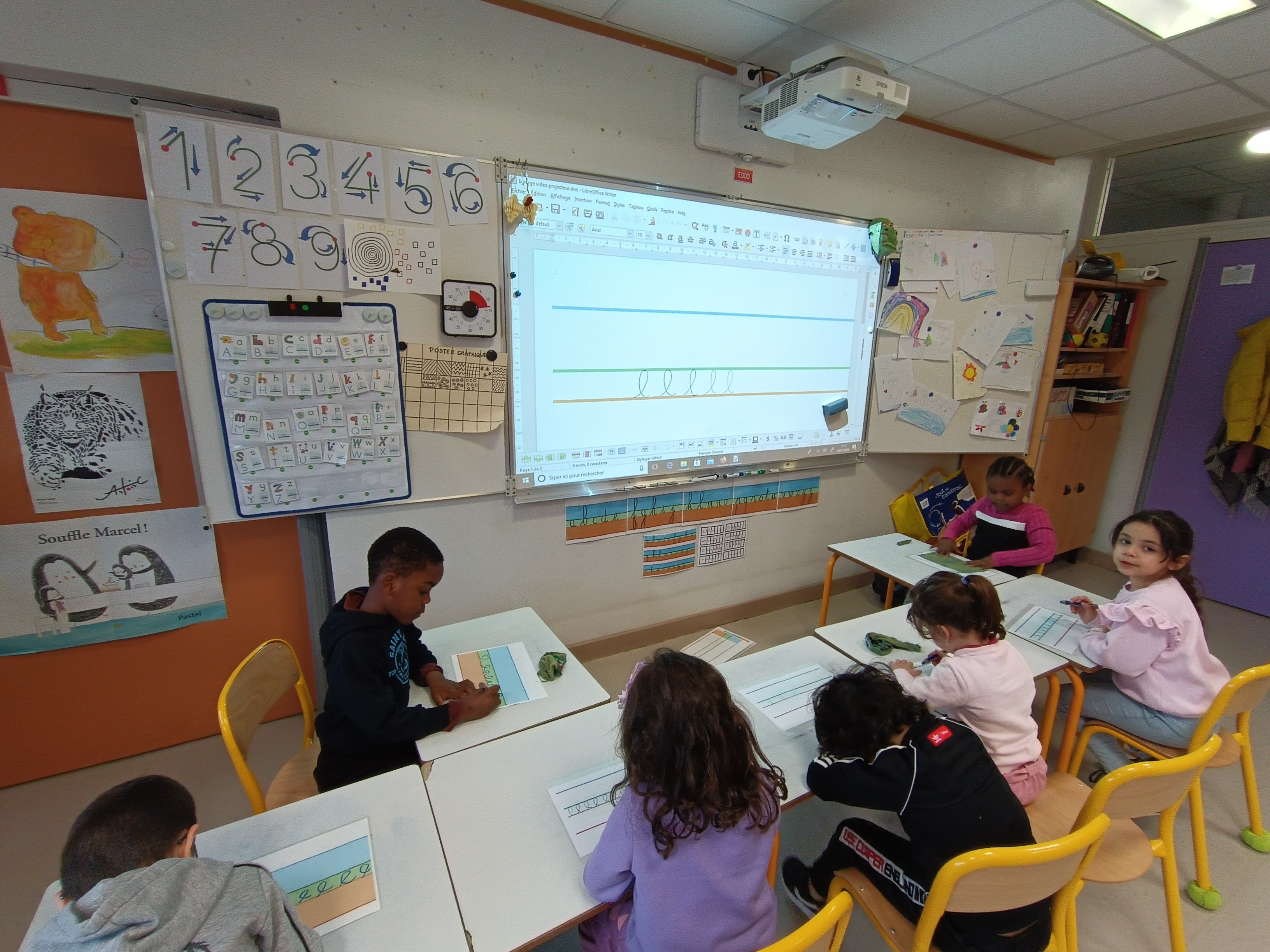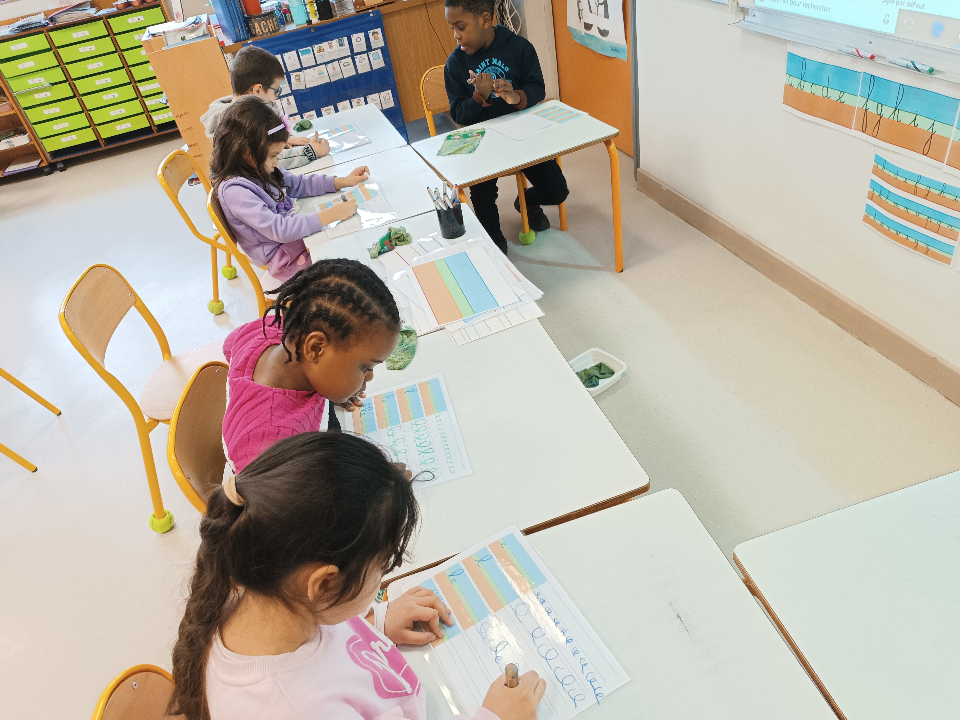 Nous avons poursuivi notre apprentissage de l'écriture en attaché. Après avoir revu comment écrire le mot "le", nous avons appris à écrire un 2ème mot : "elle". Après un entraînement sur la table, nous sommes passés sur feuille pour employer ce mot correctement.