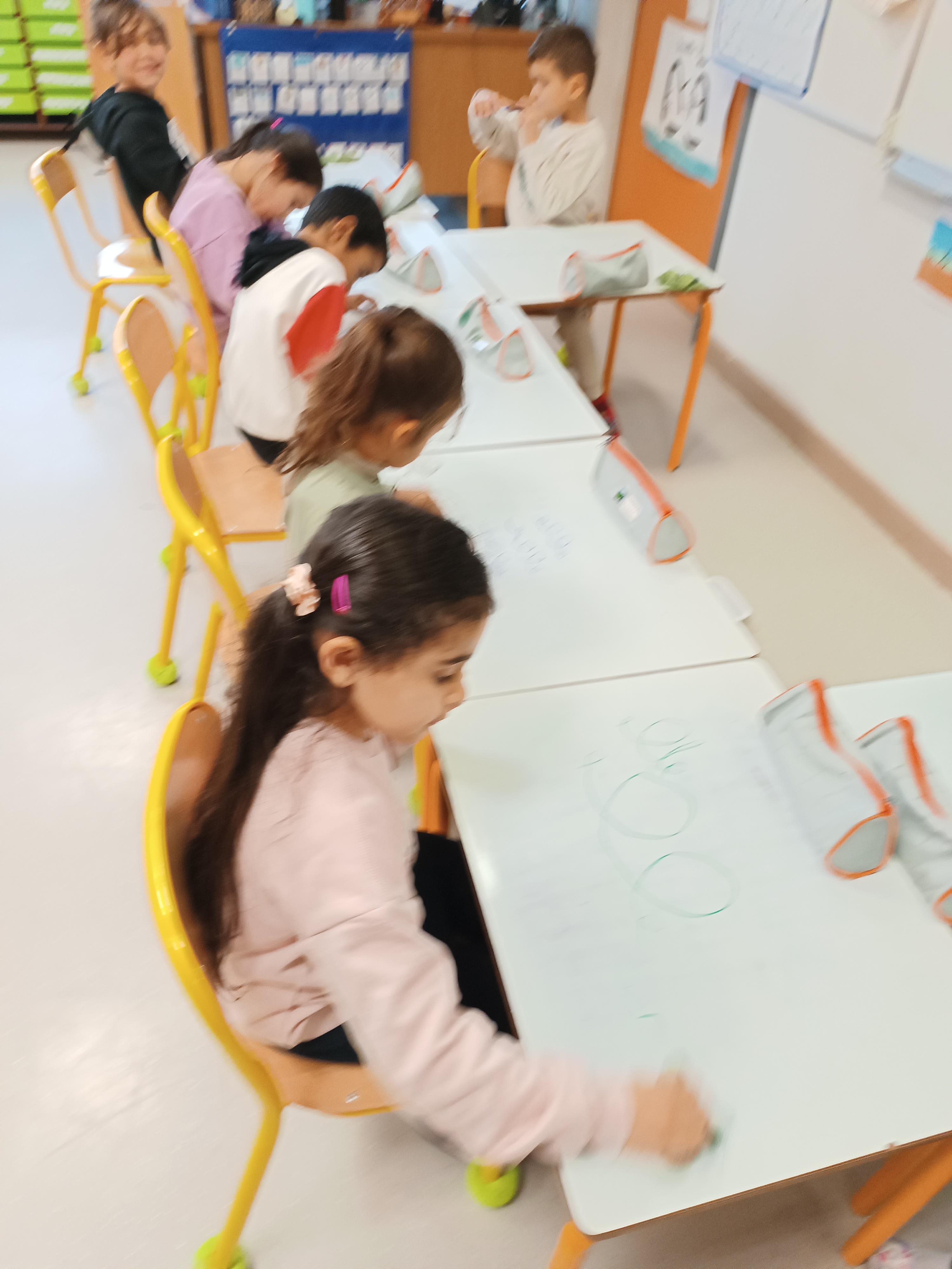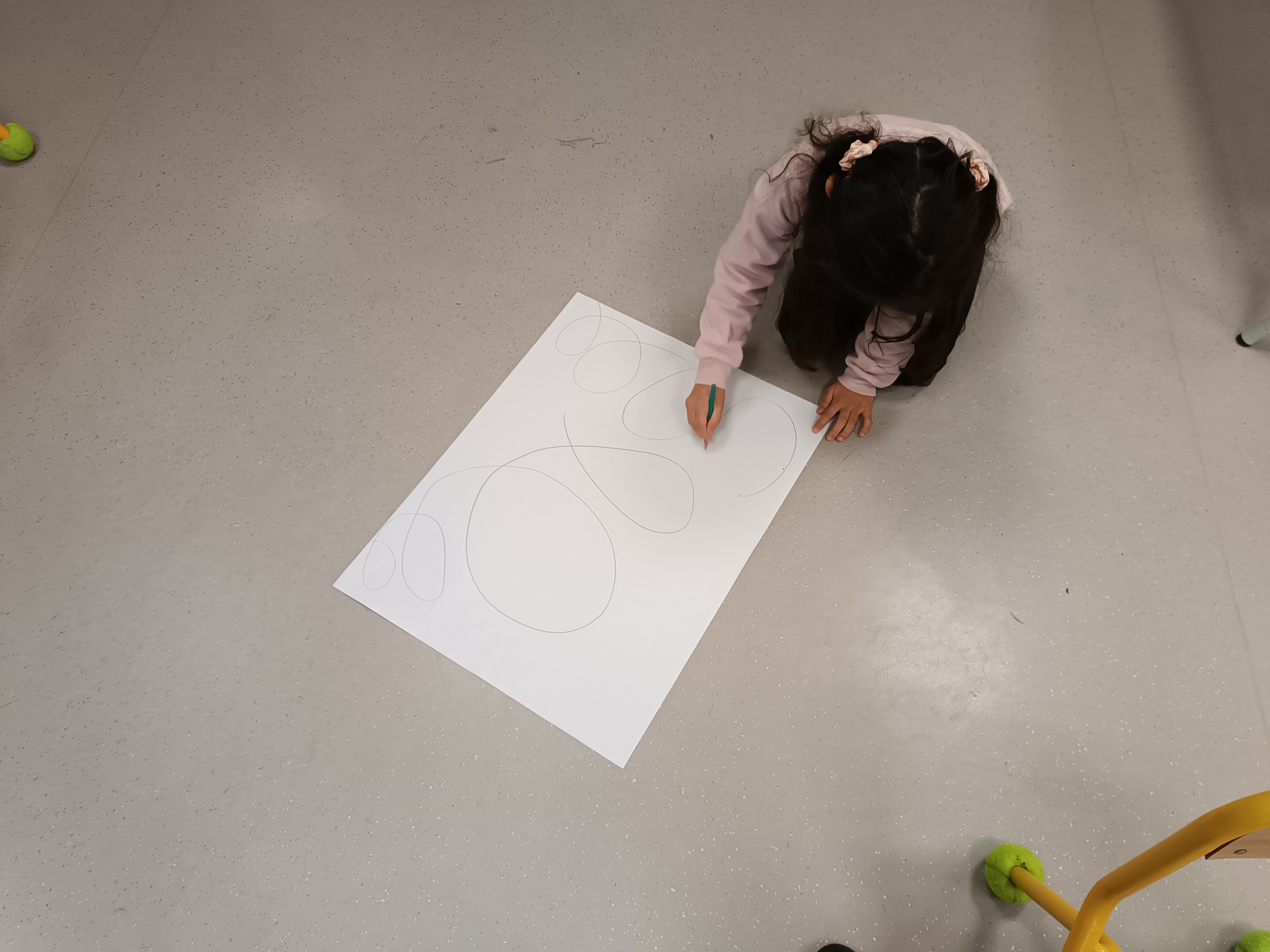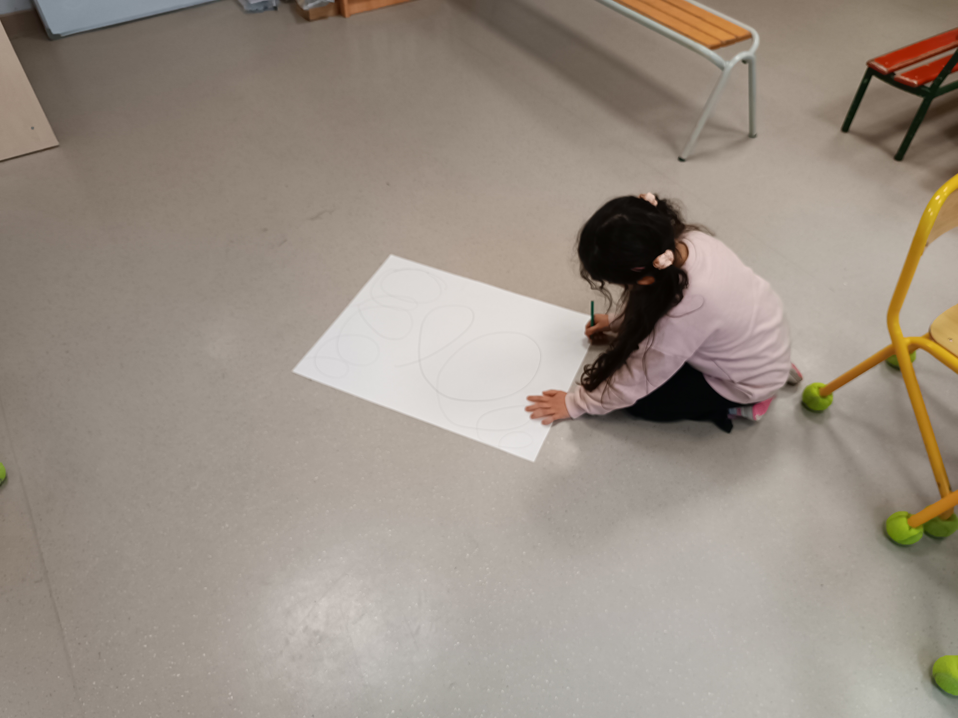1ère étape : tracer des lignes de boucles au crayon à papier. Le support étant grand, les élèves étaient au sol pour cette activité.