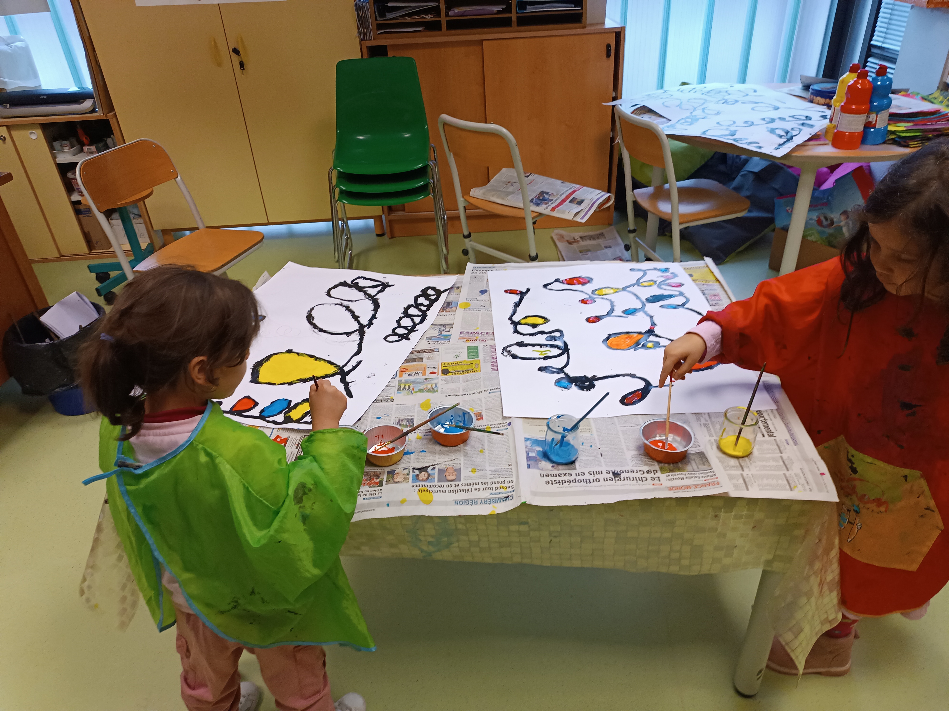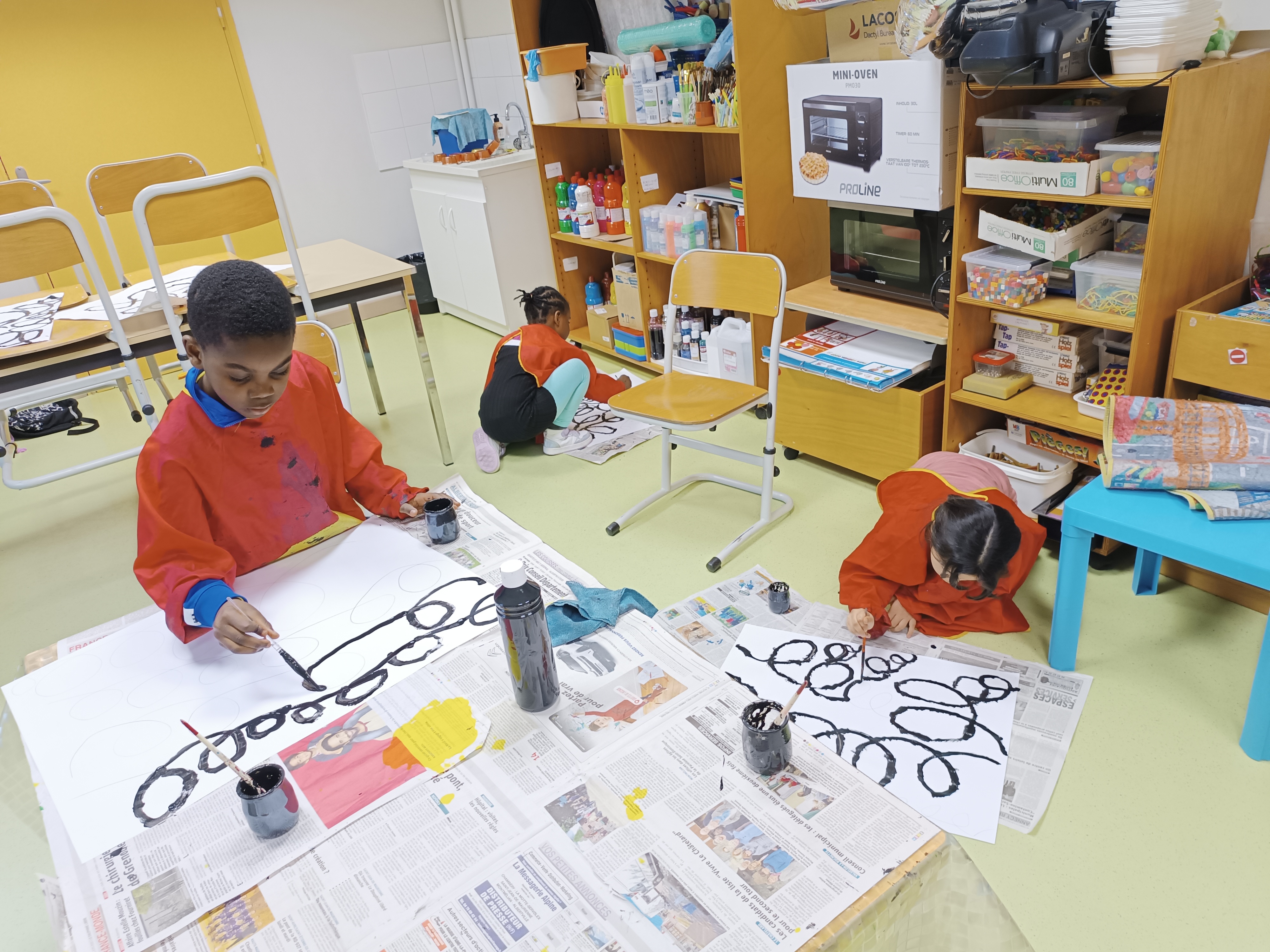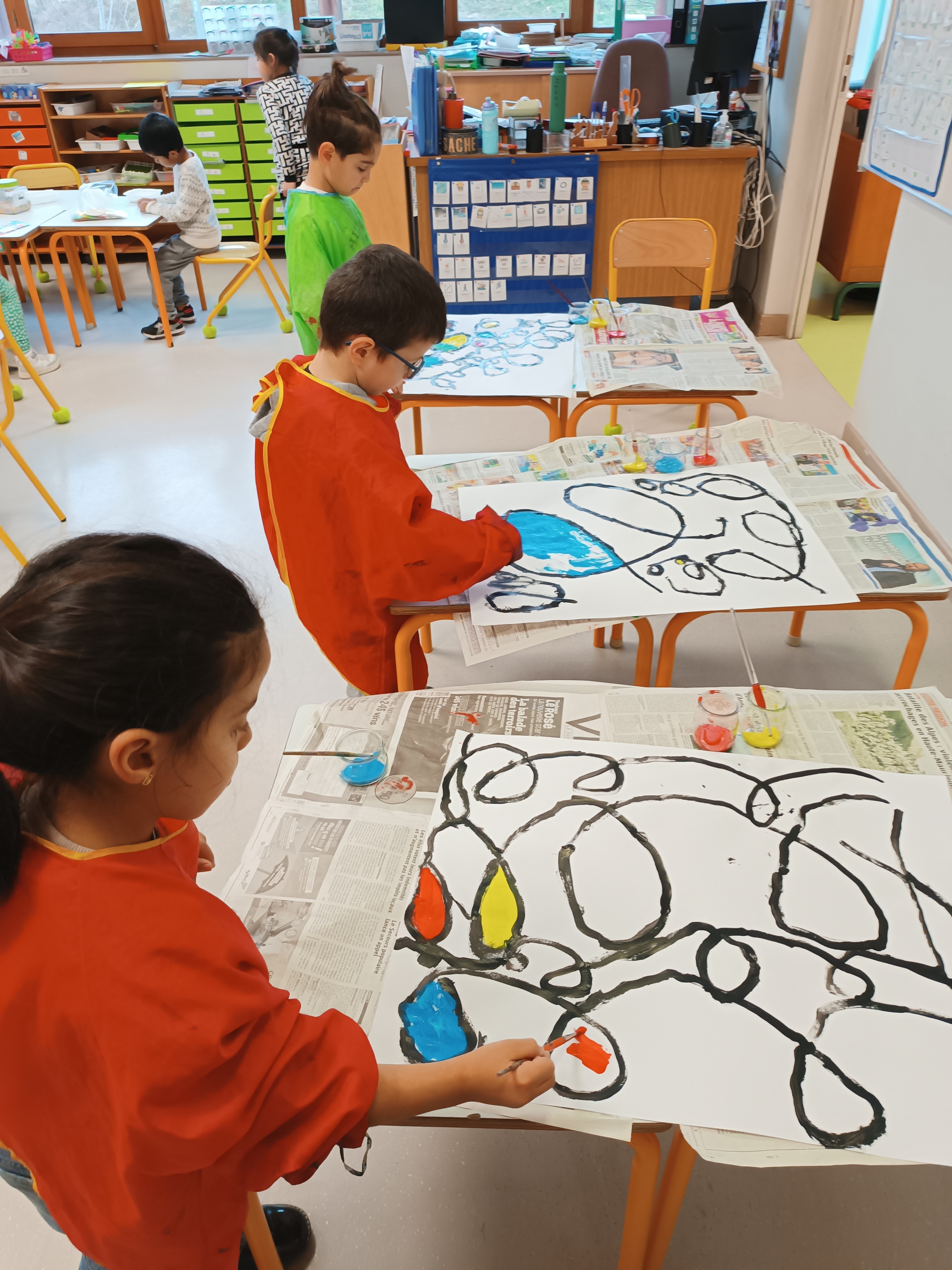 2ème étape : repasser à la peinture noire sur ces boucles. Là encore, certains élèves étaient au sol étant donné la taille de la feuille.