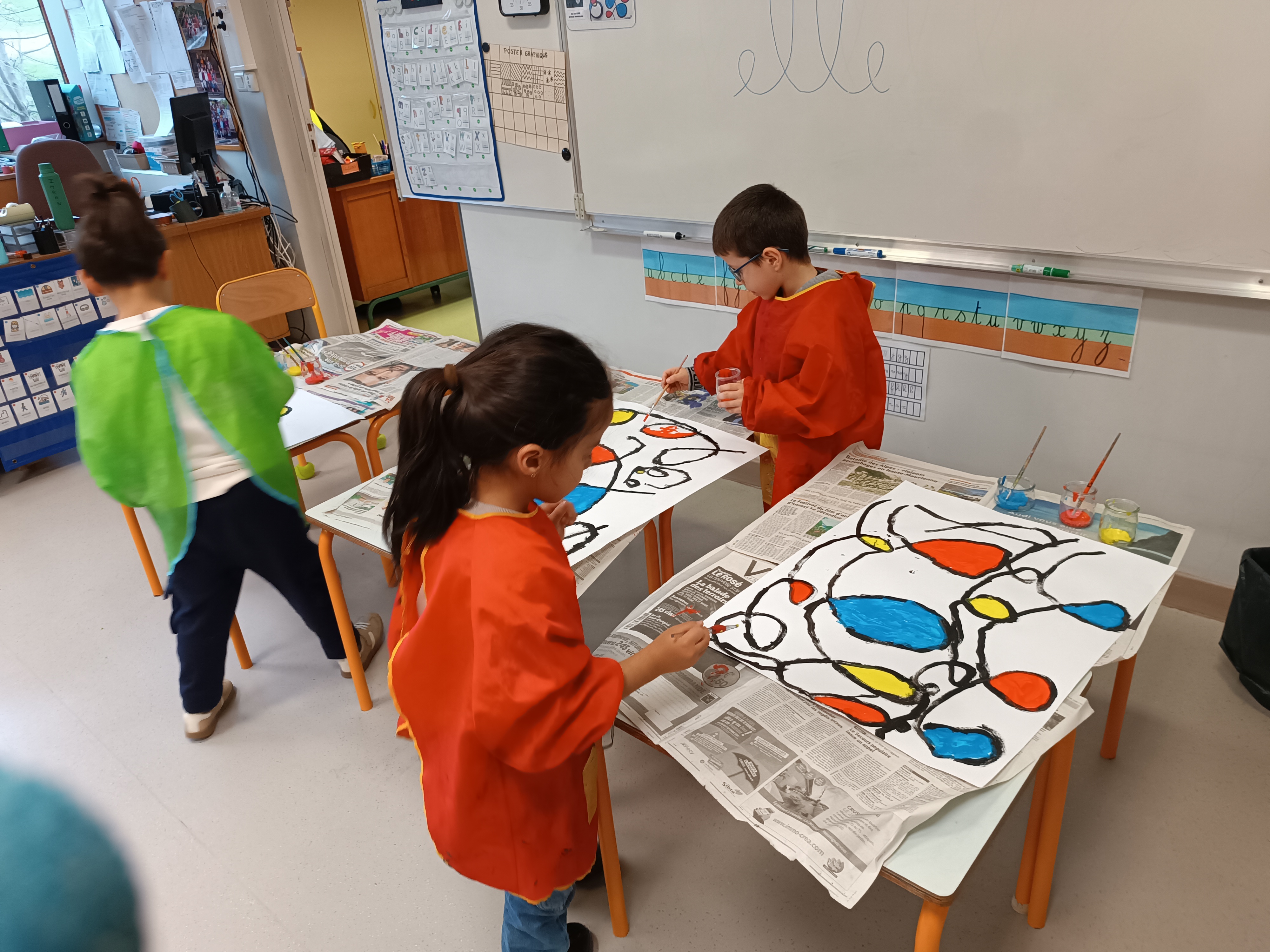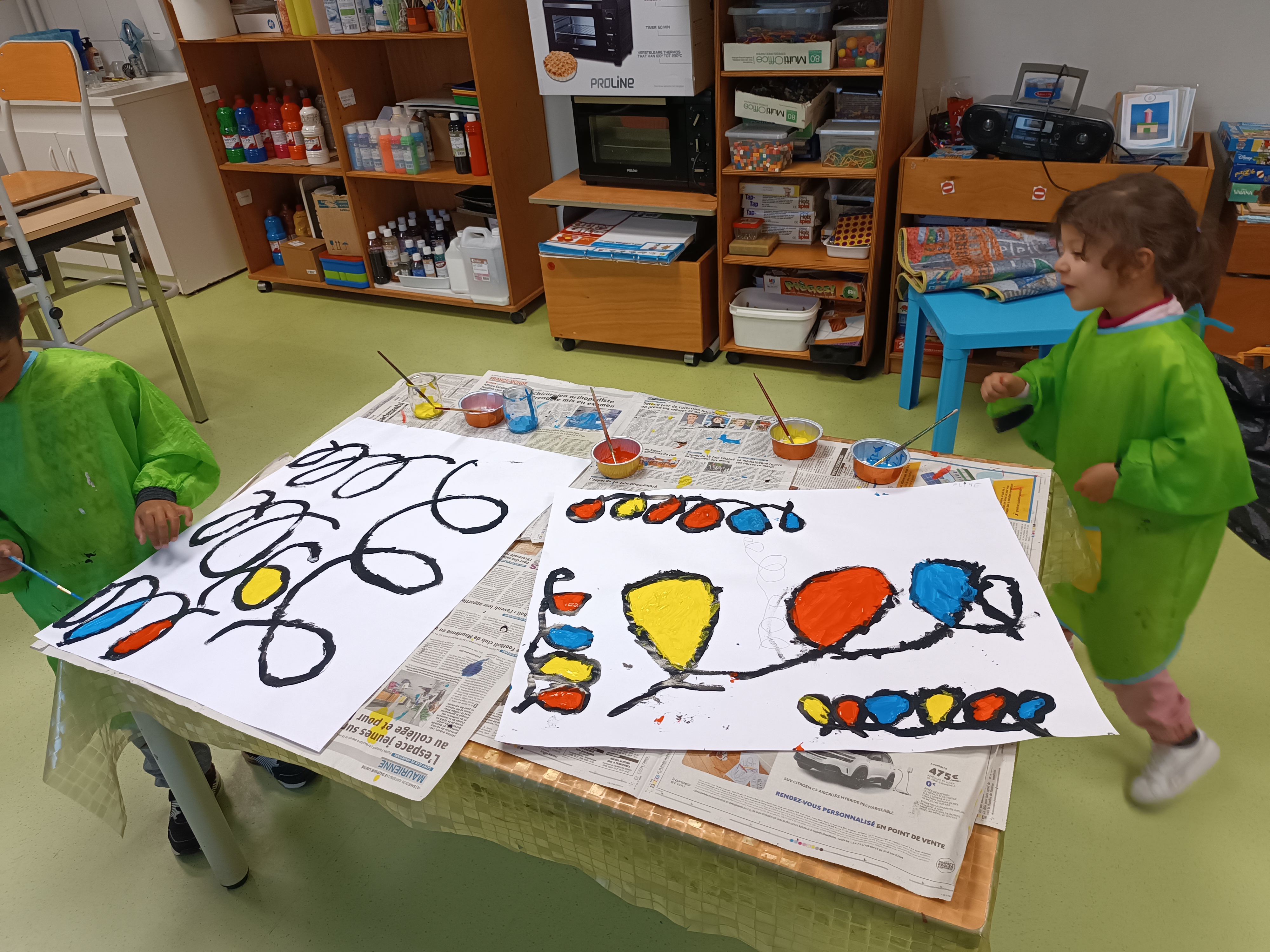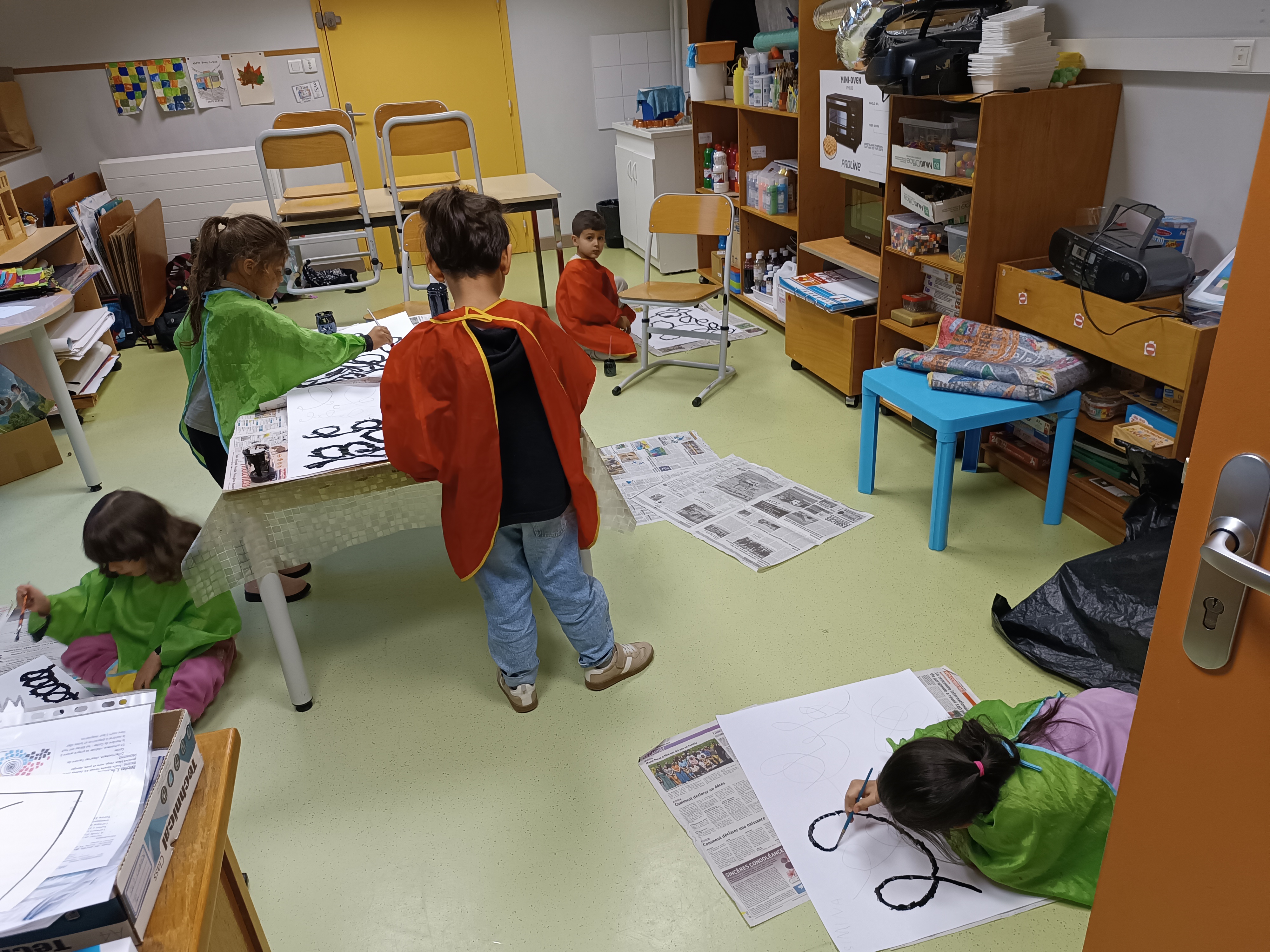 2ème étape : repasser à la peinture noire sur ces boucles. Là encore, certains élèves étaient au sol étant donné la taille de la feuille.