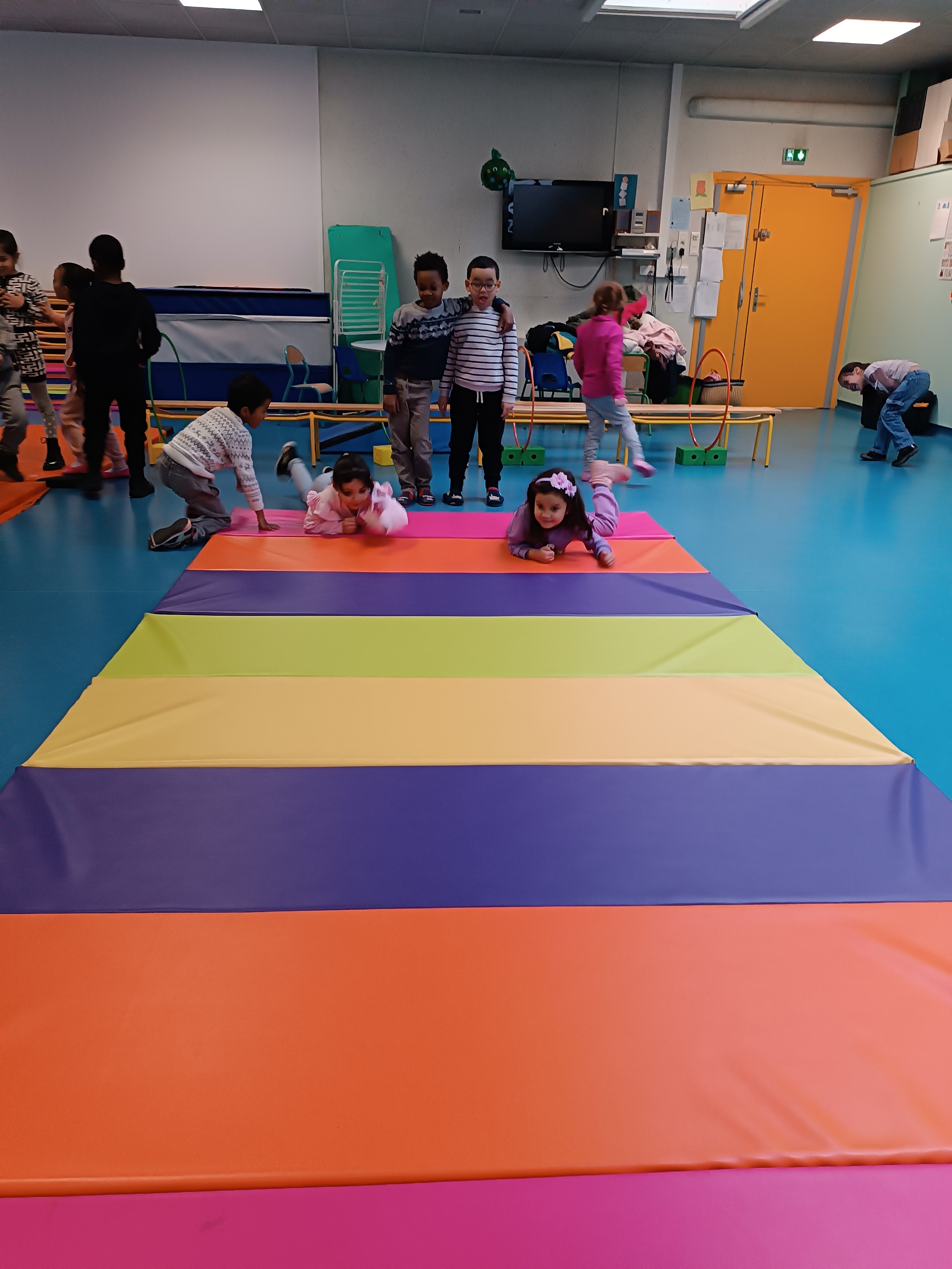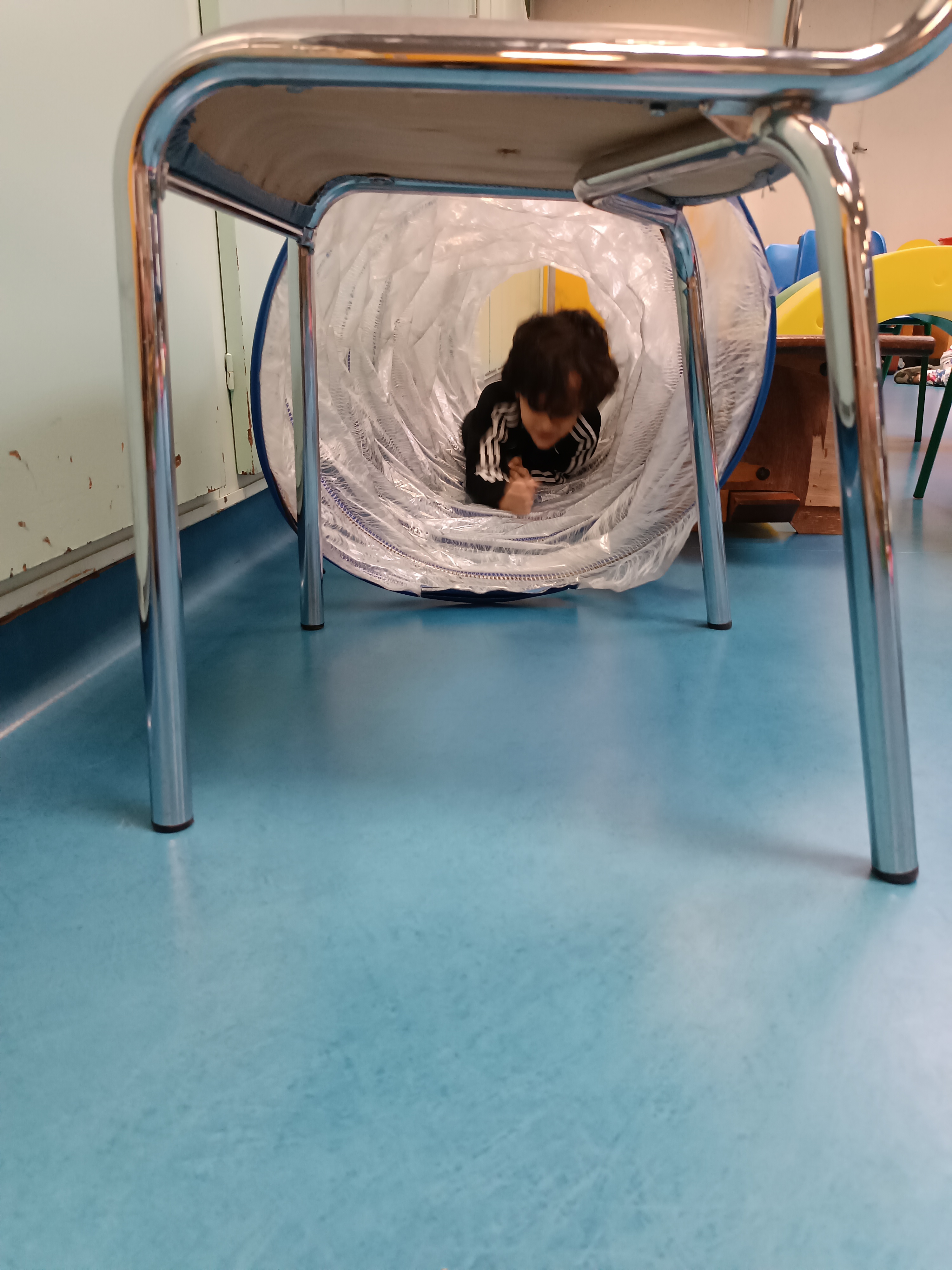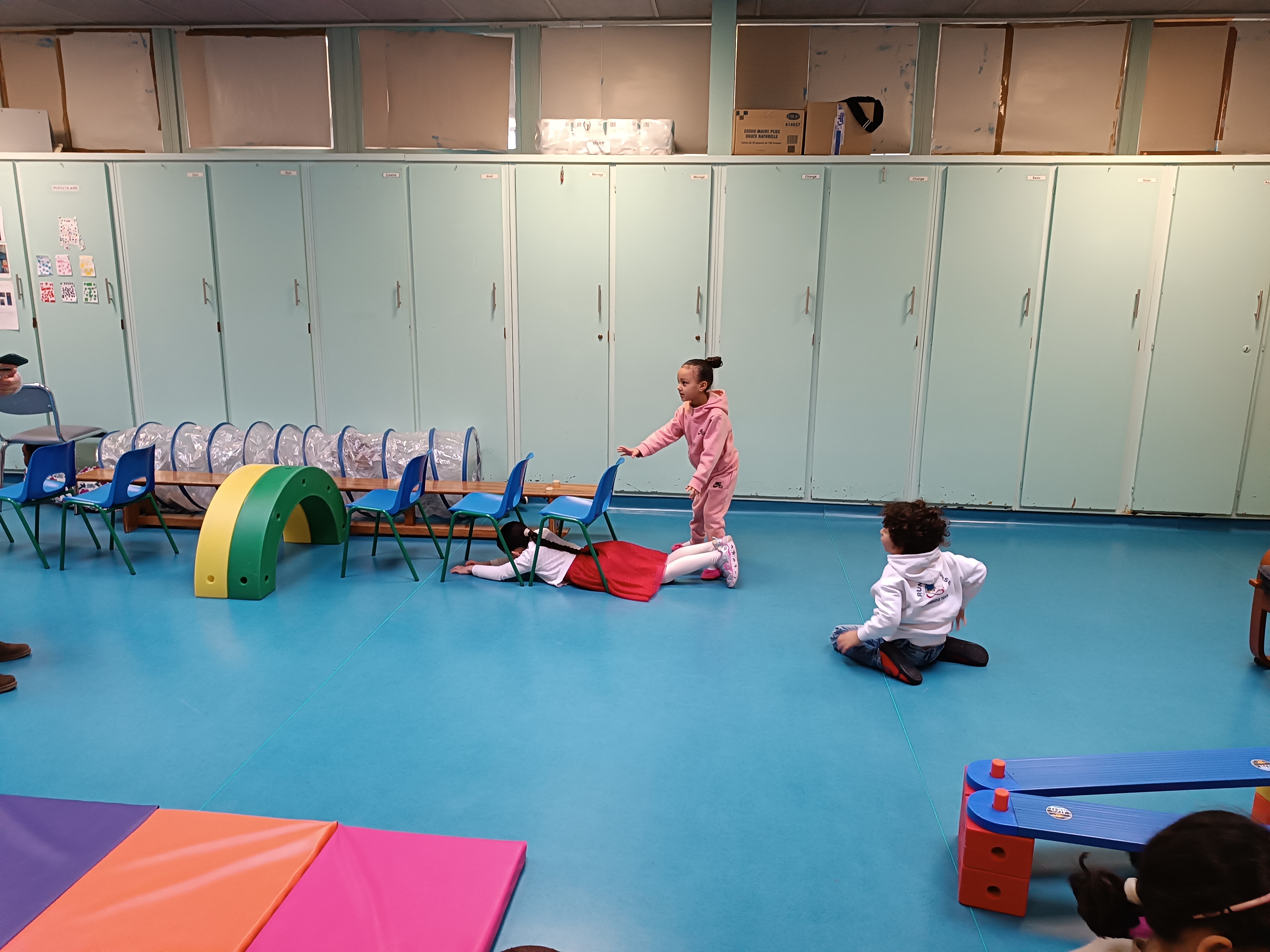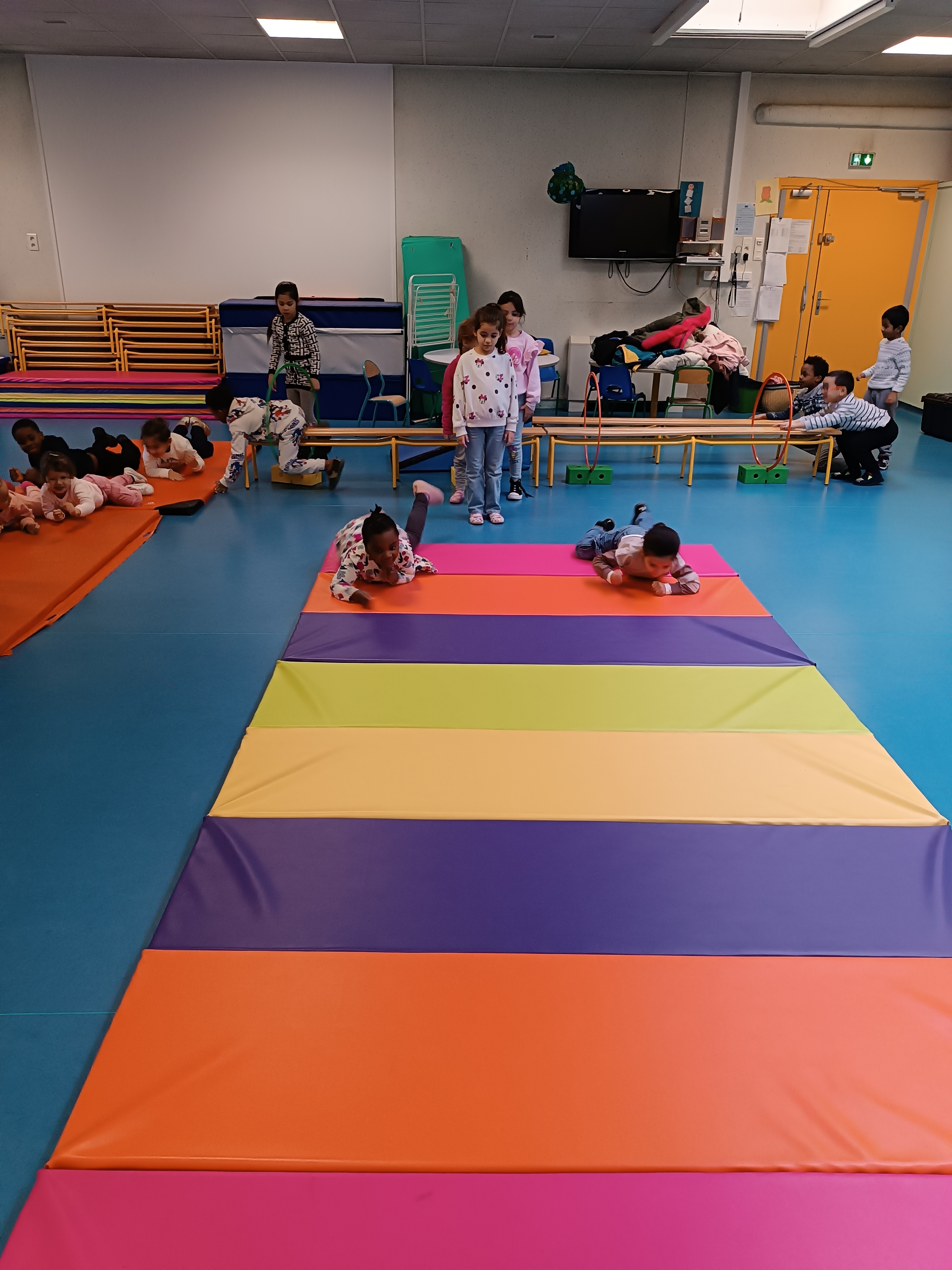 Thème : ramper. Les enfants ont même pu faire des courses sur le grand tapis.