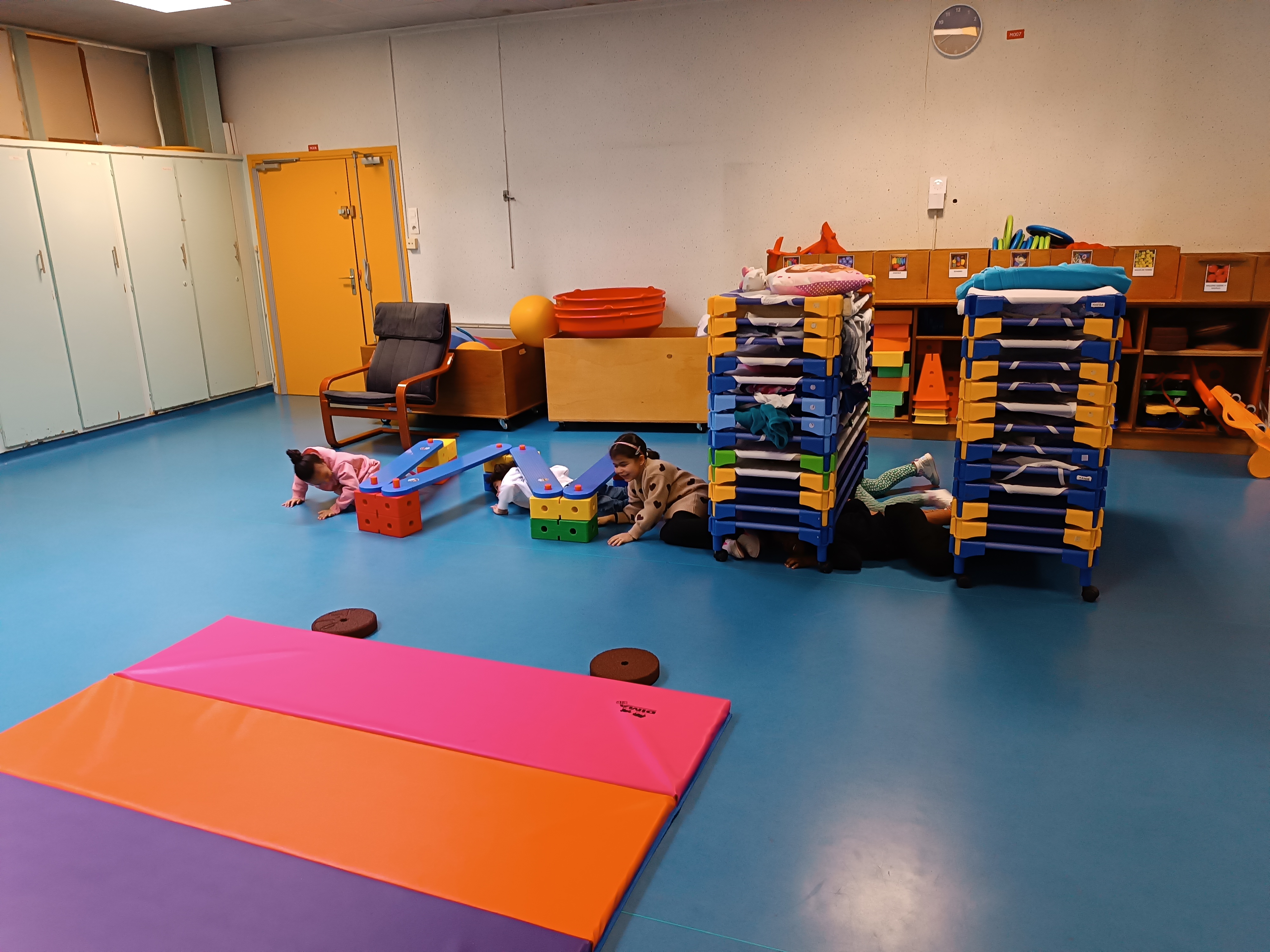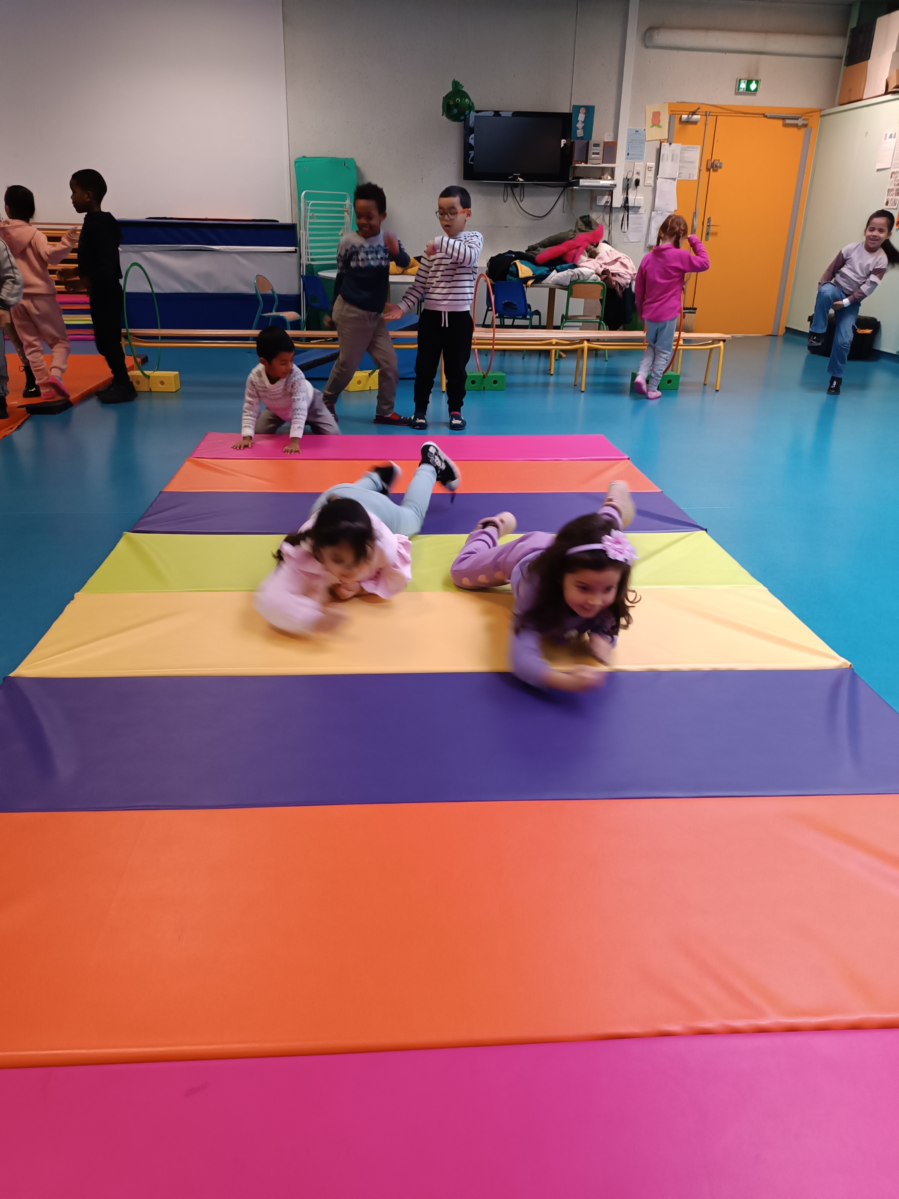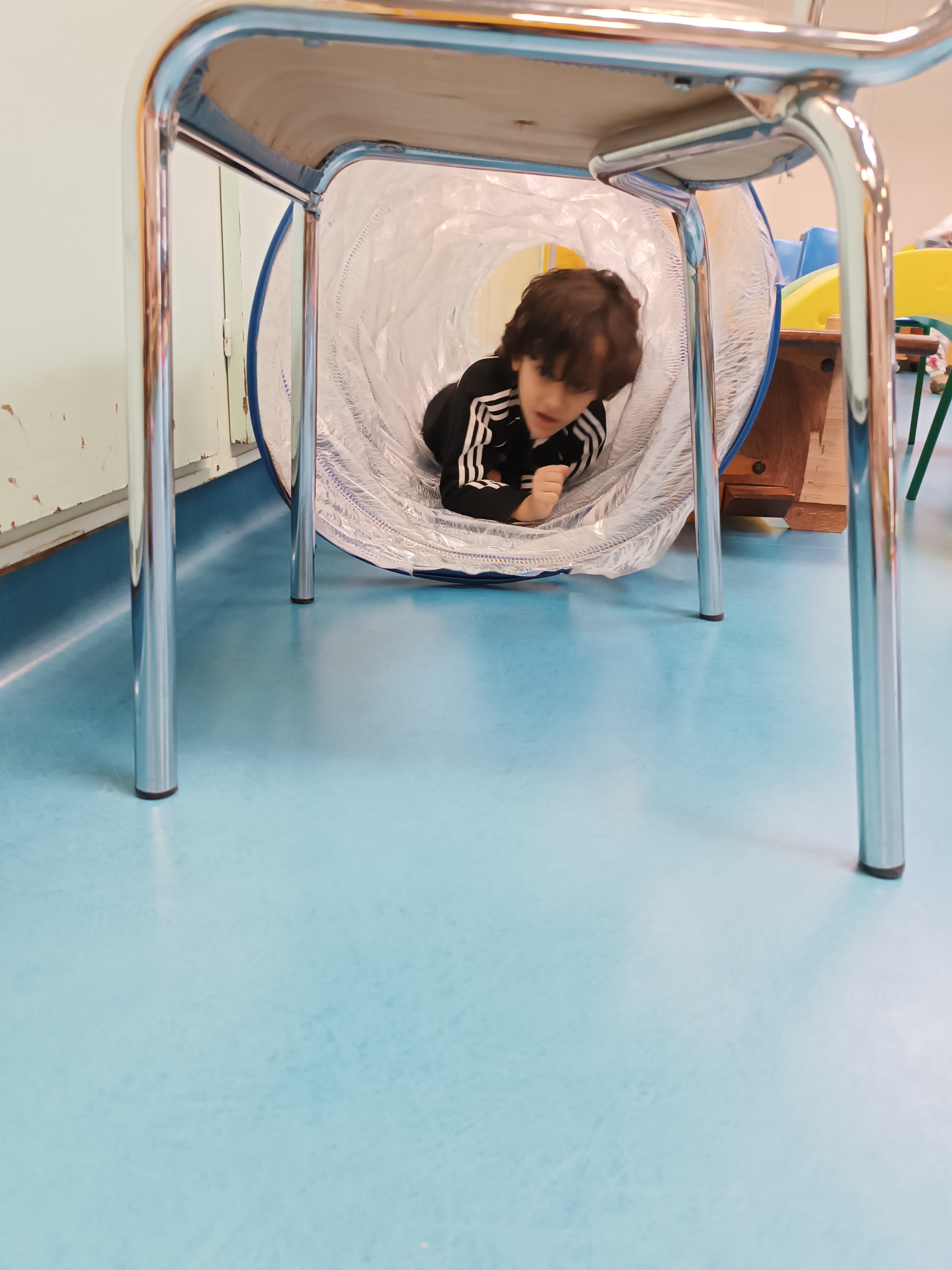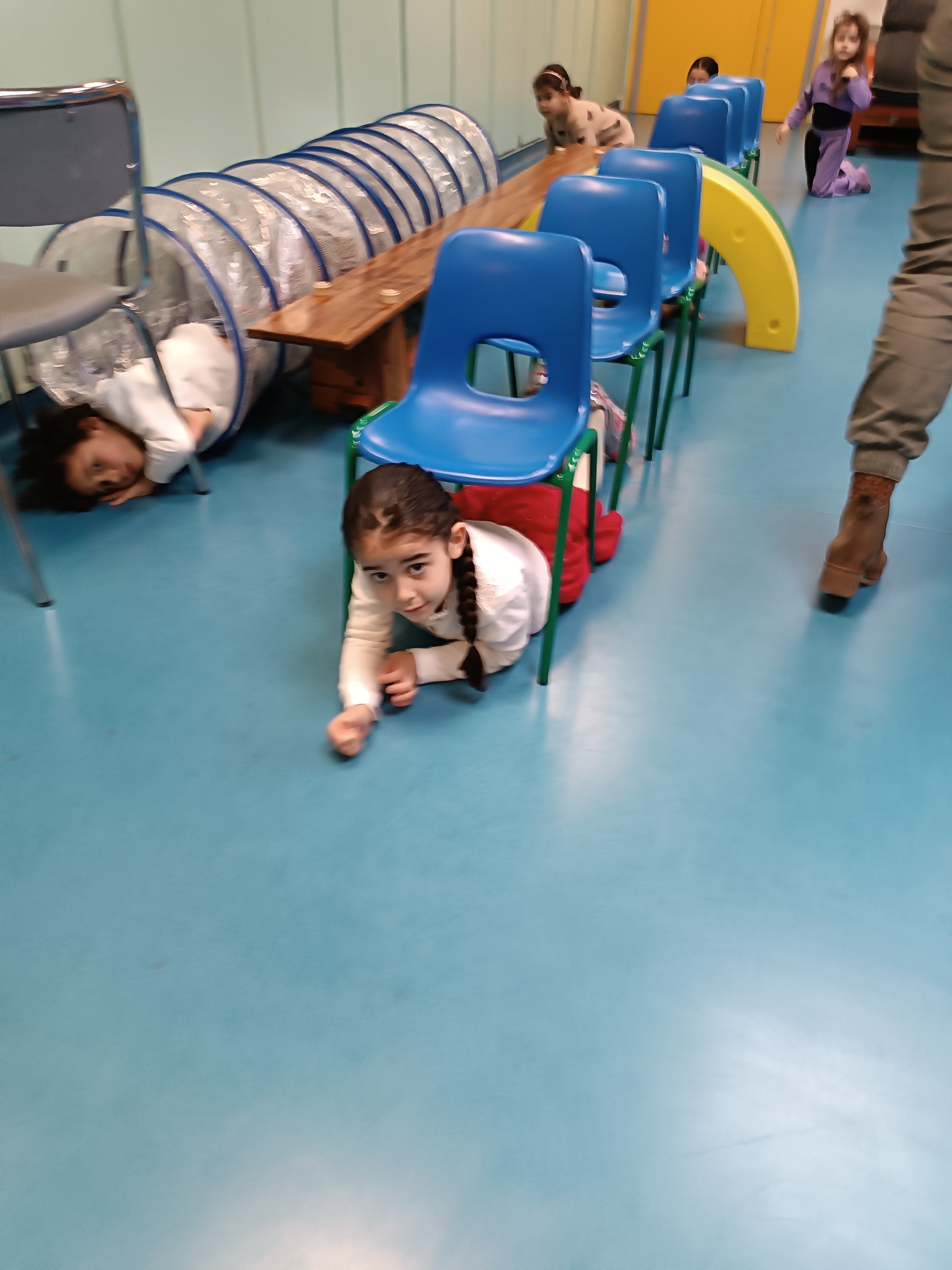 Thème : ramper. Les enfants ont même pu faire des courses sur le grand tapis.