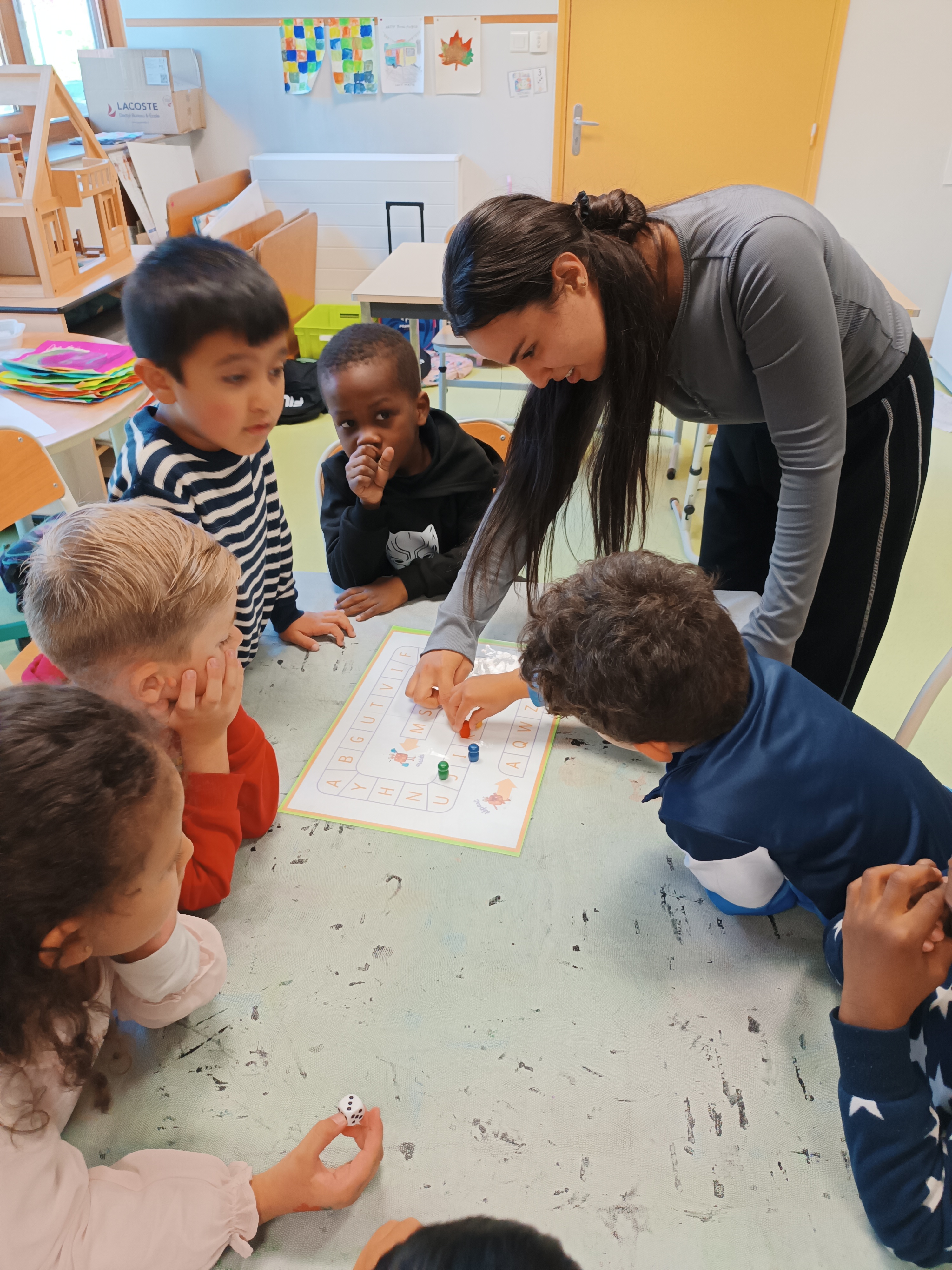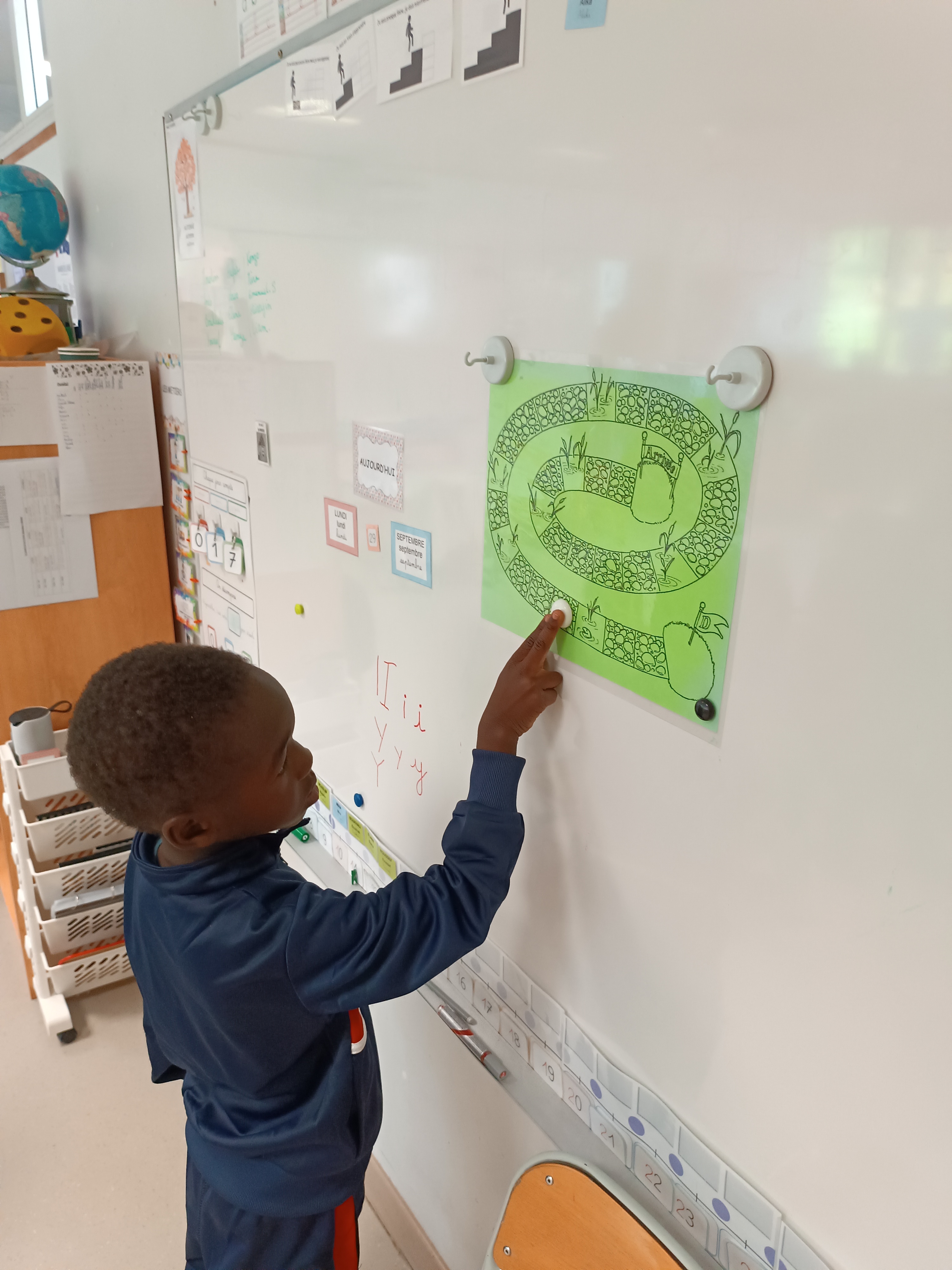 Le jeu de l'oie des lettres de l'alphabet en majuscules : je lance le dé, je déplace le pion du nombre de cases indiqué par le dé. Je nomme la lettre : si je me trompe, je recule d'une case.