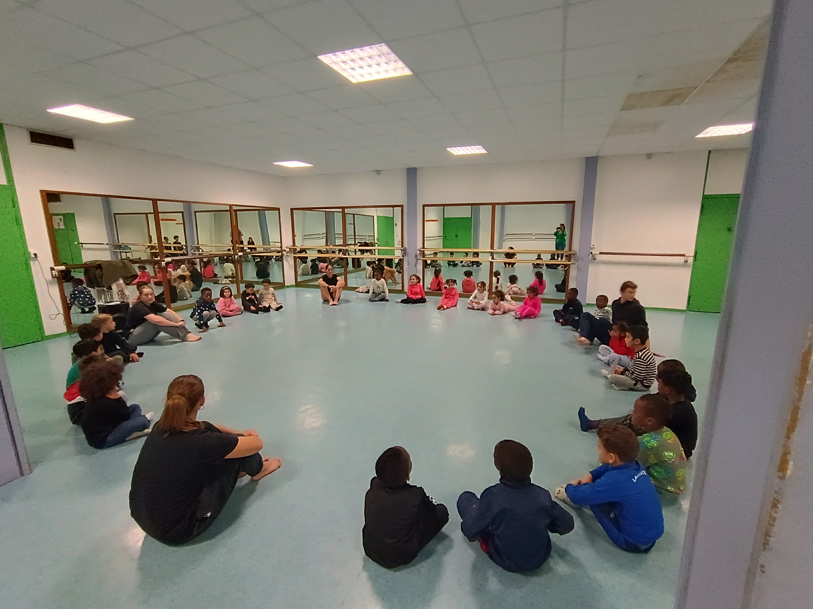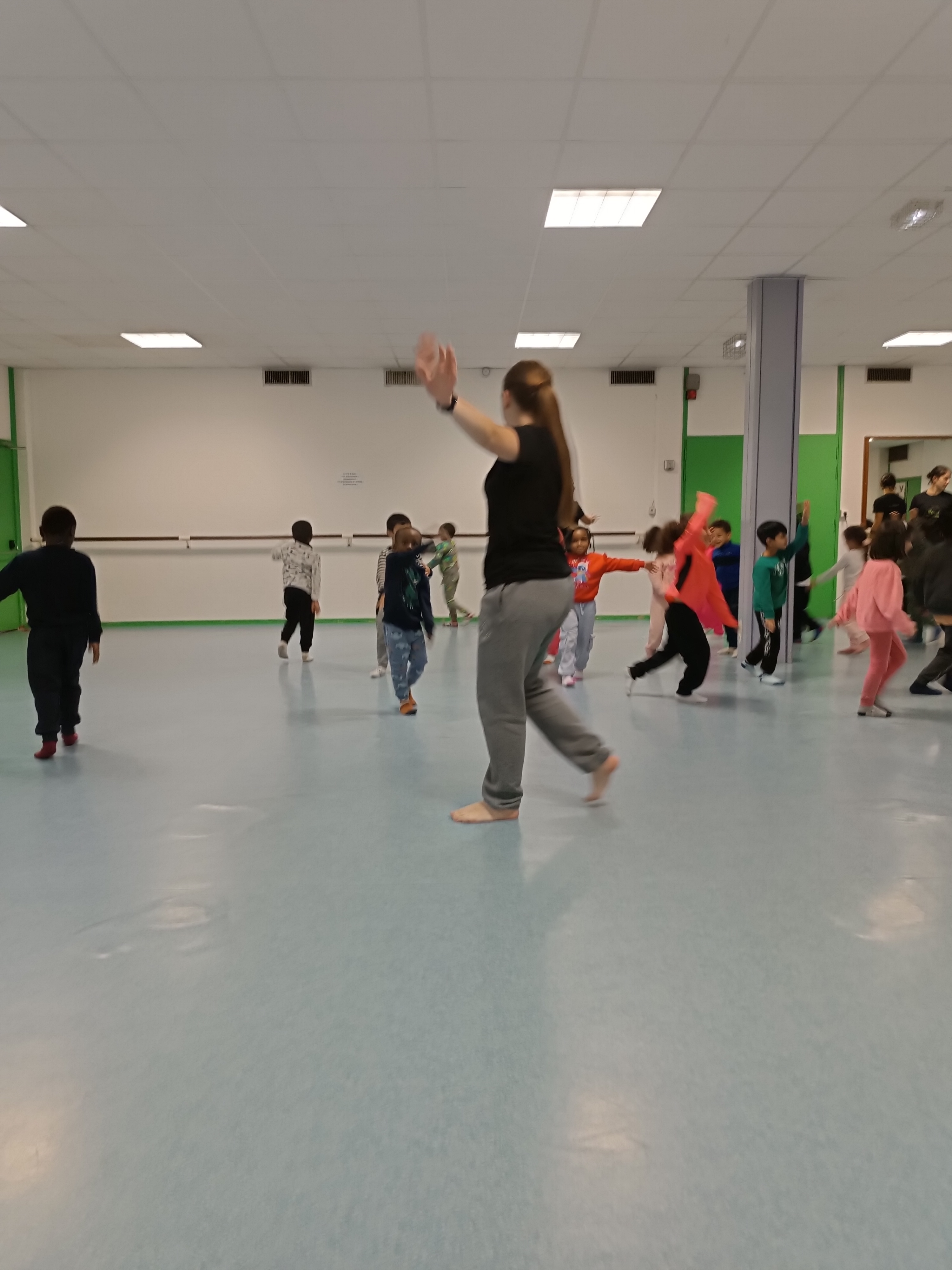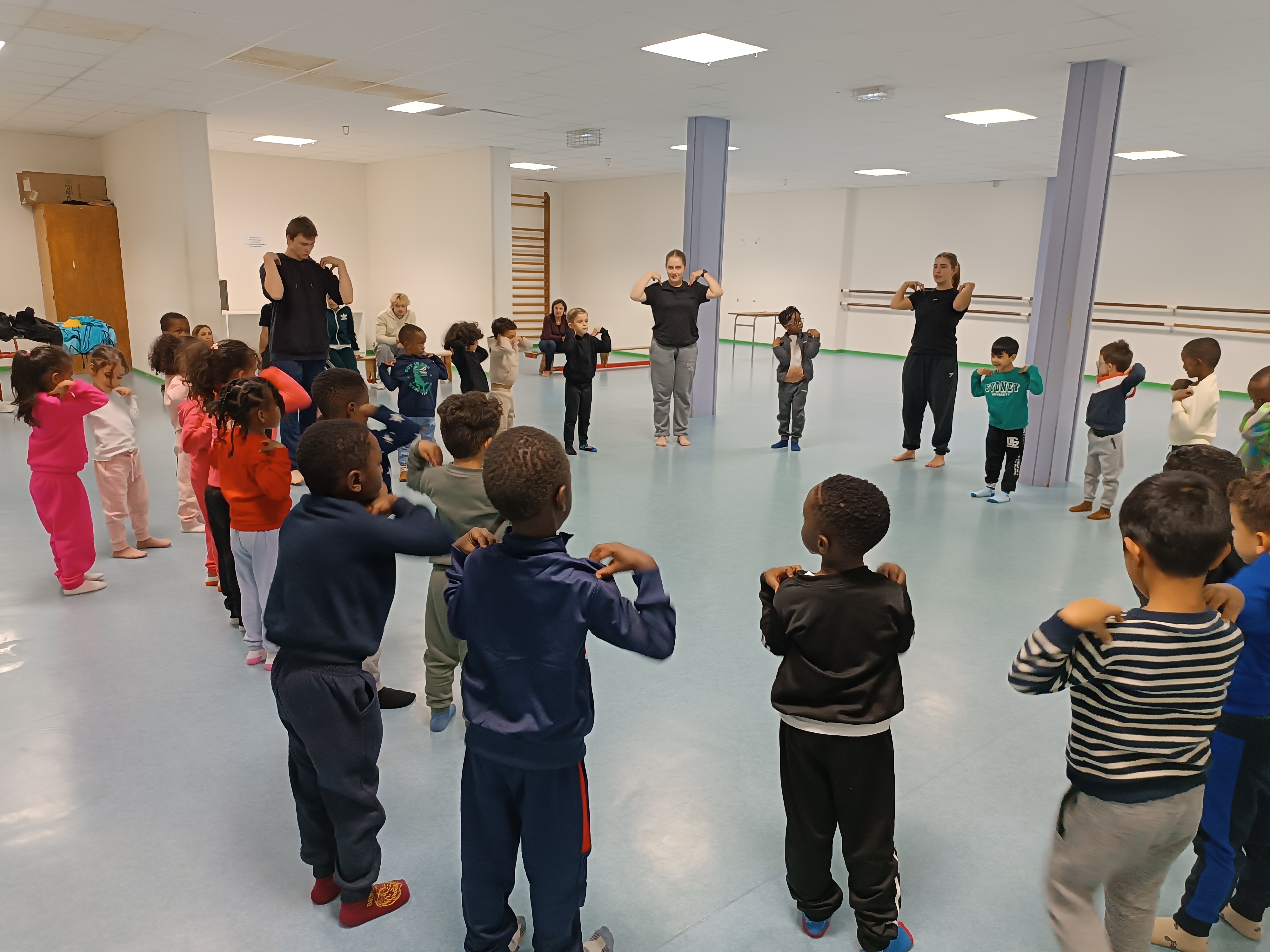 1ère séance de danse avec les étudiants STAPS au gymnase des Combes. Jules, Julie, Elsa et Candice ont appris aux enfants à s'arrêter à un signal.