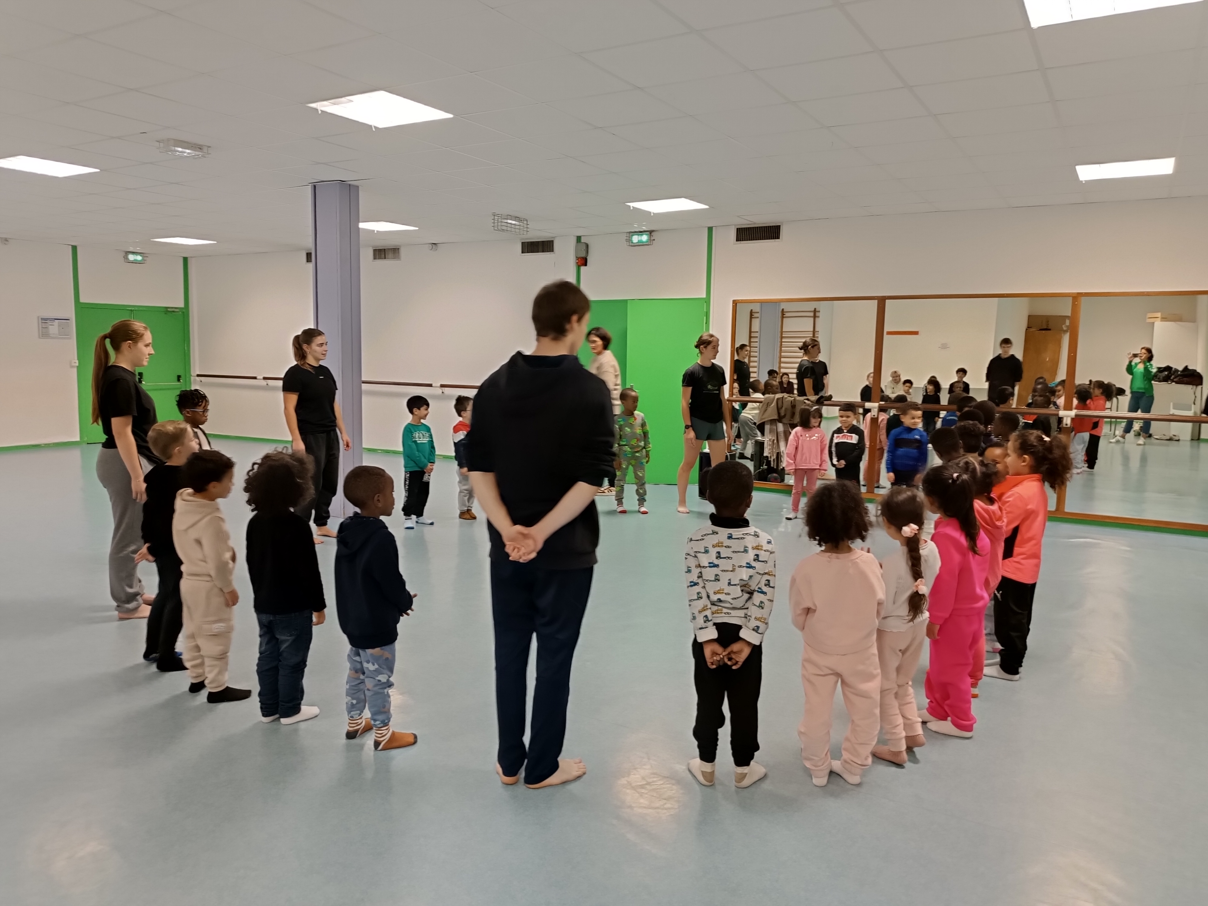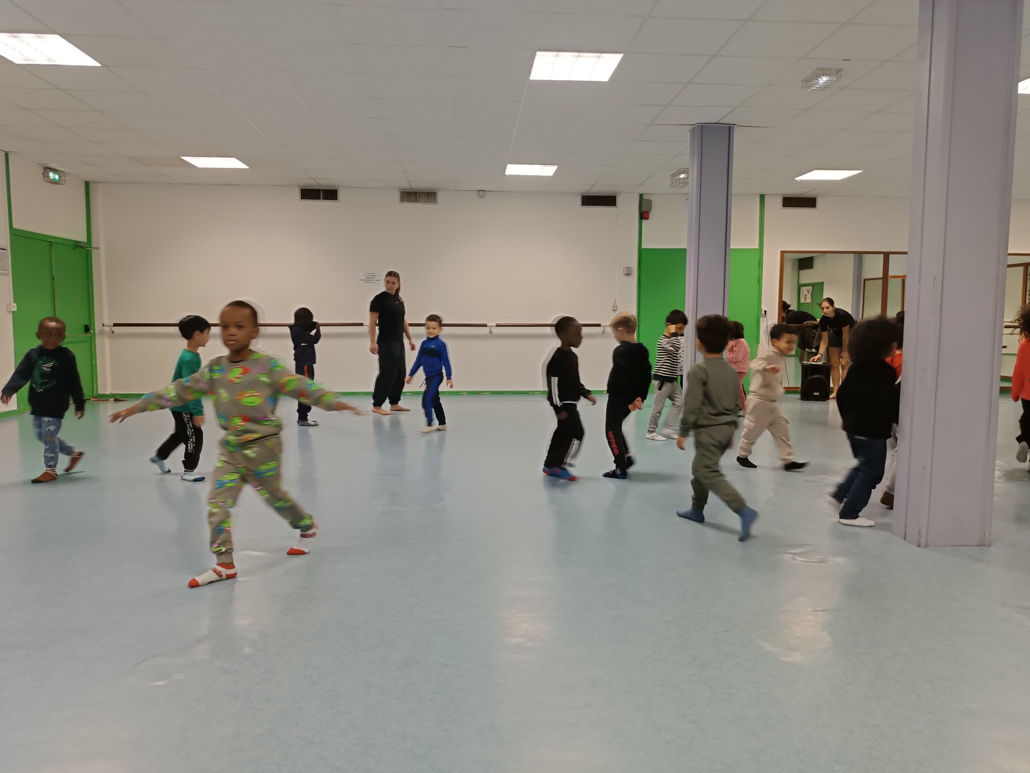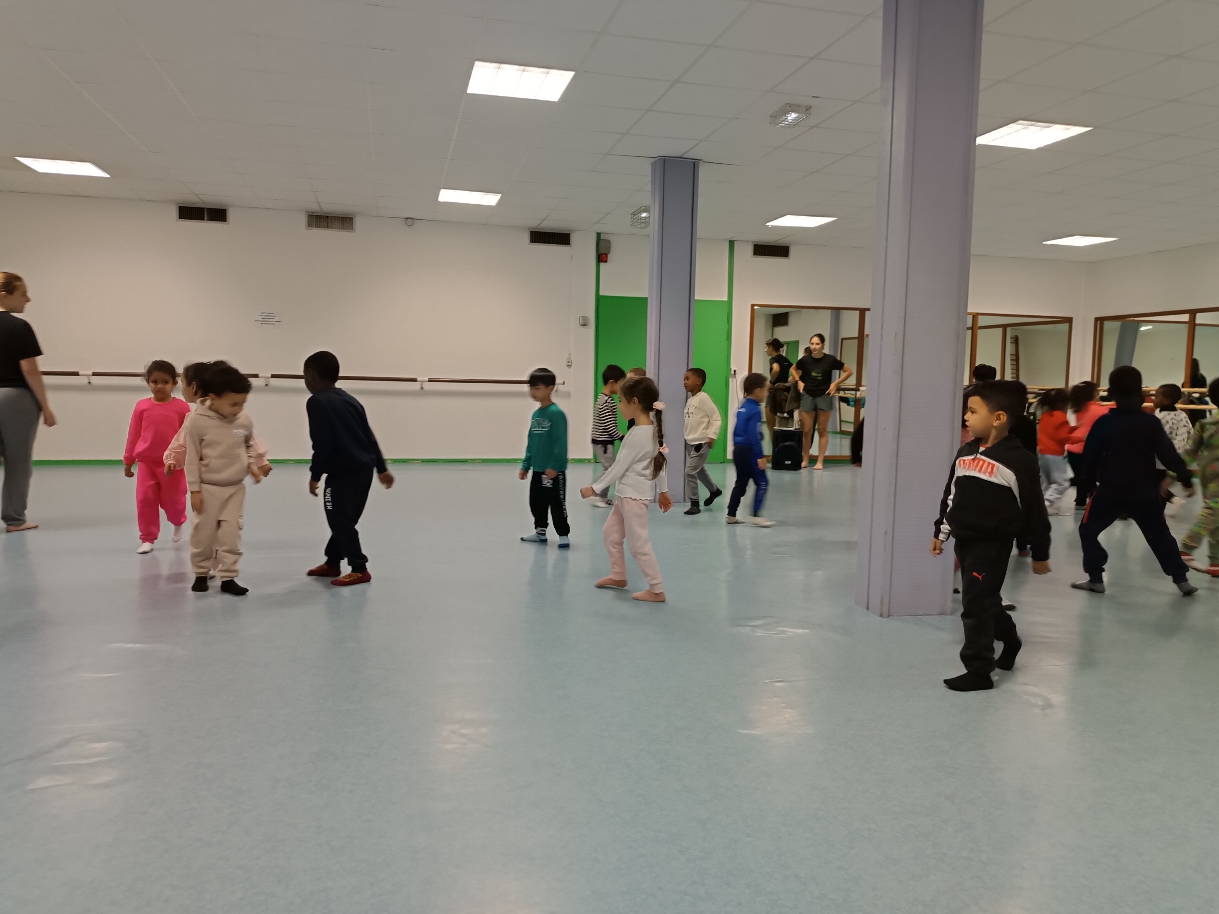 1ère séance de danse avec les étudiants STAPS au gymnase des Combes. Jules, Julie, Elsa et Candice ont appris aux enfants à s'arrêter à un signal.