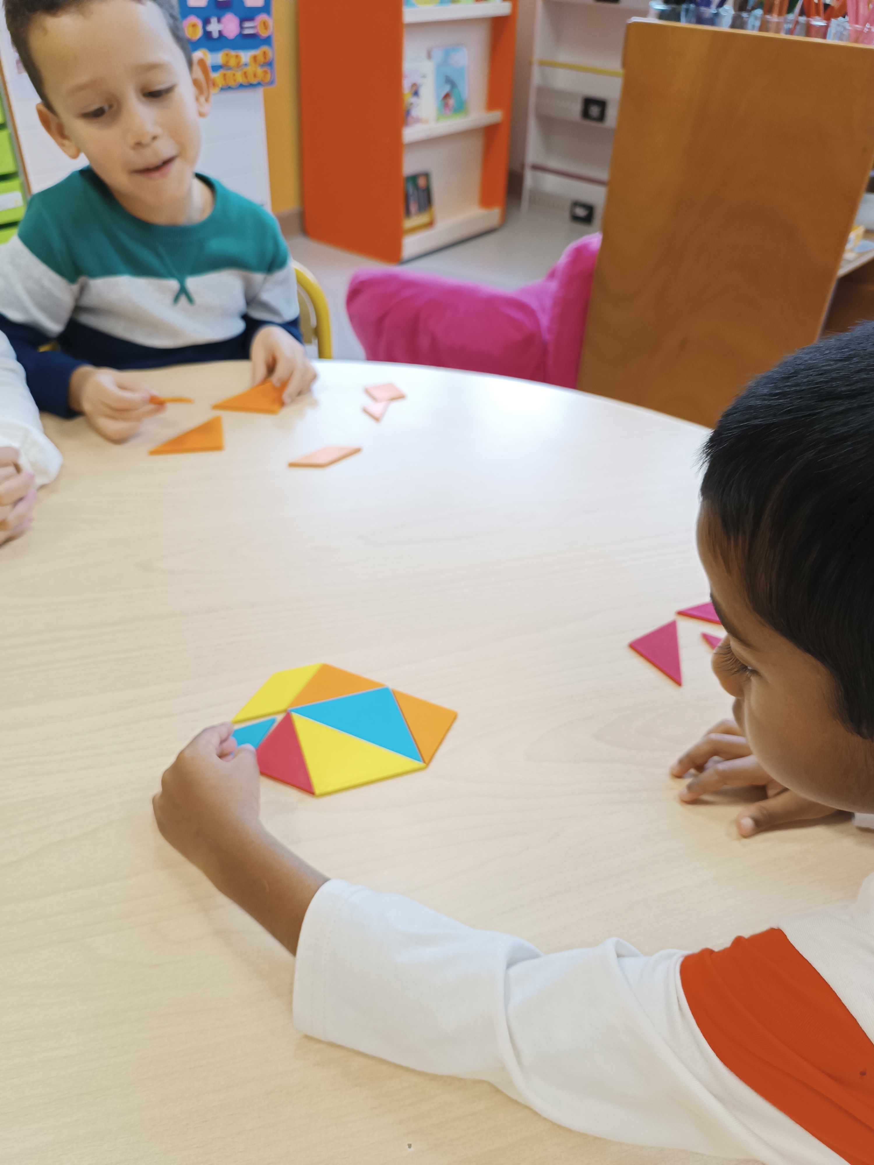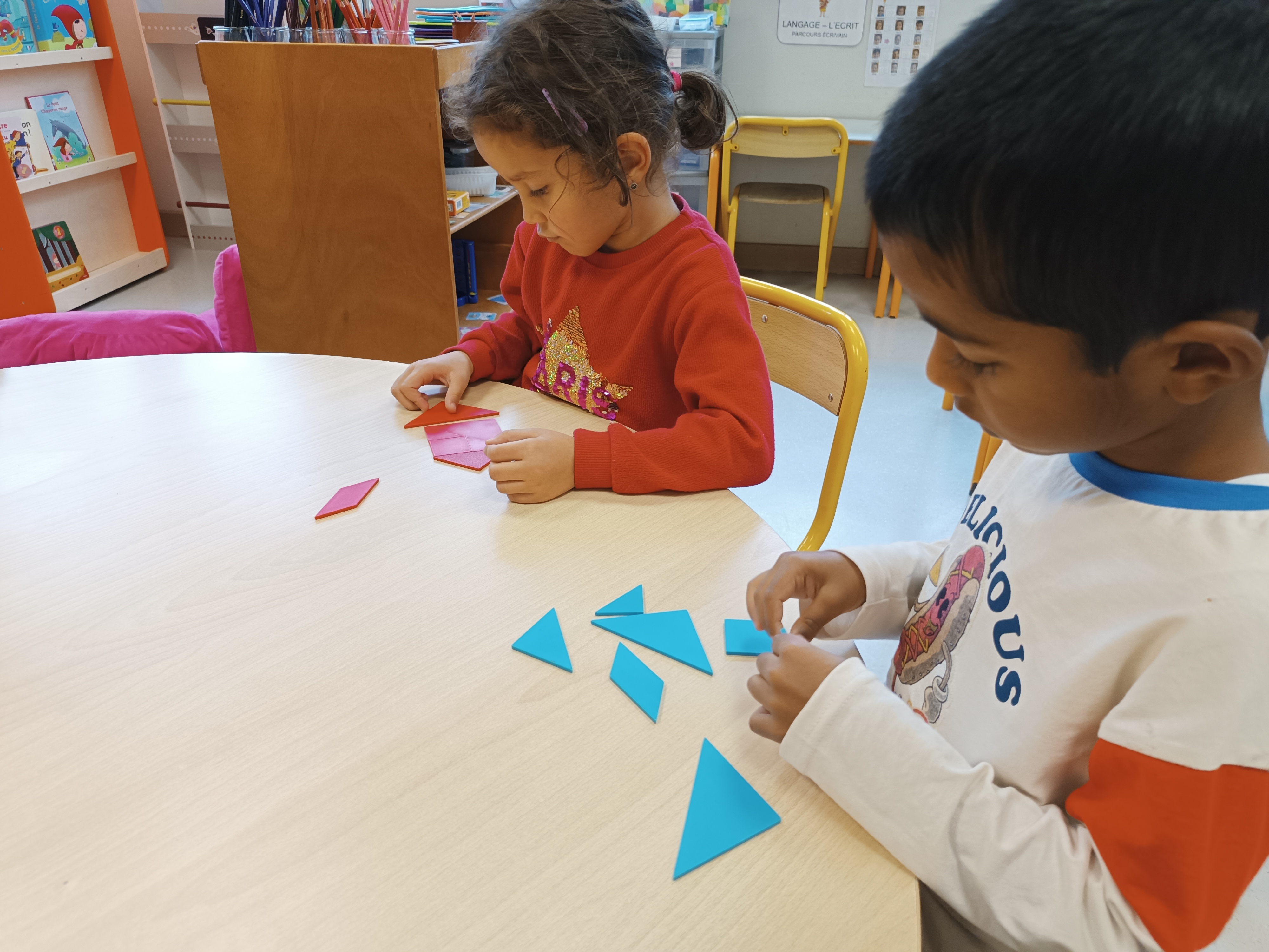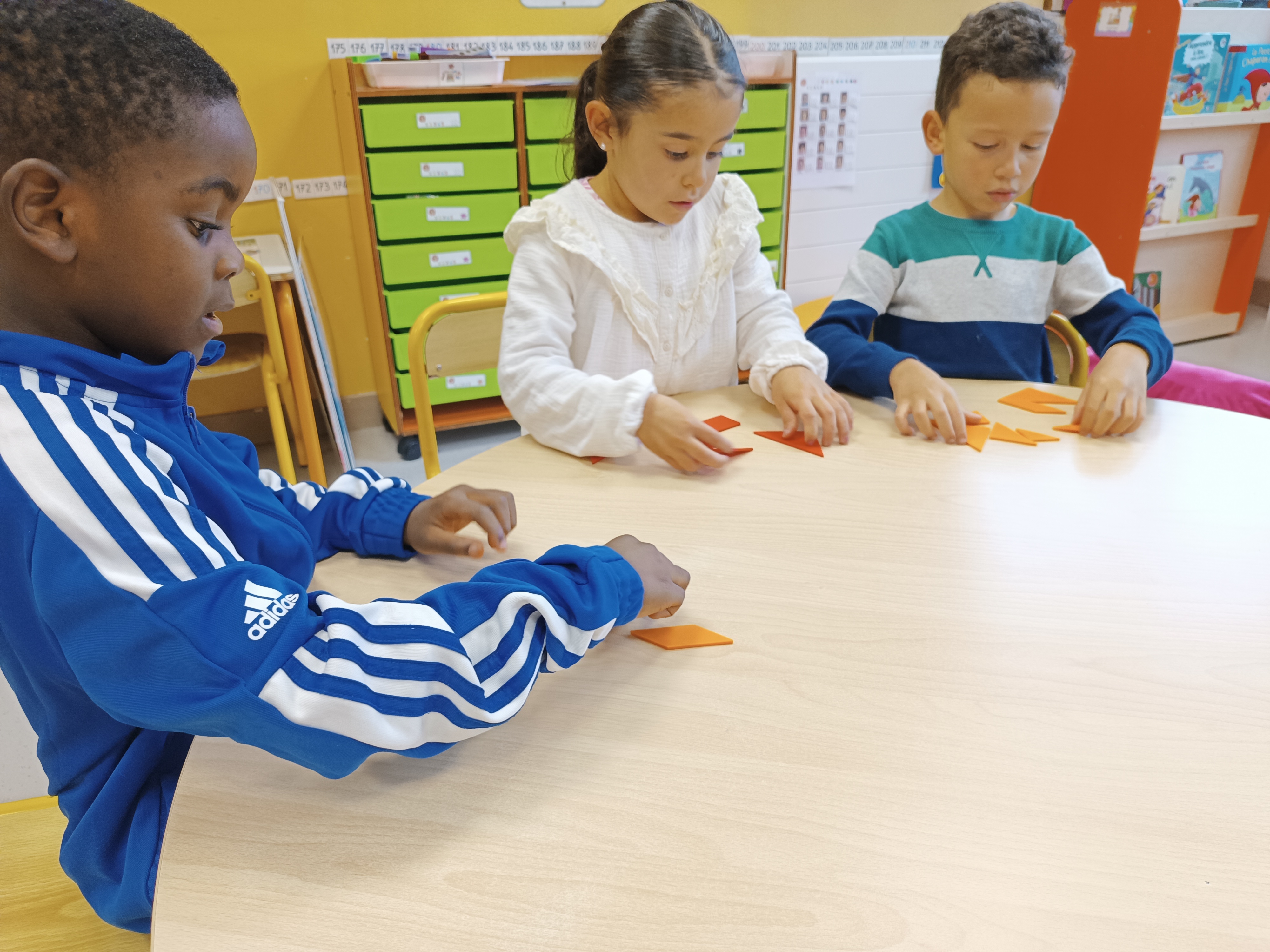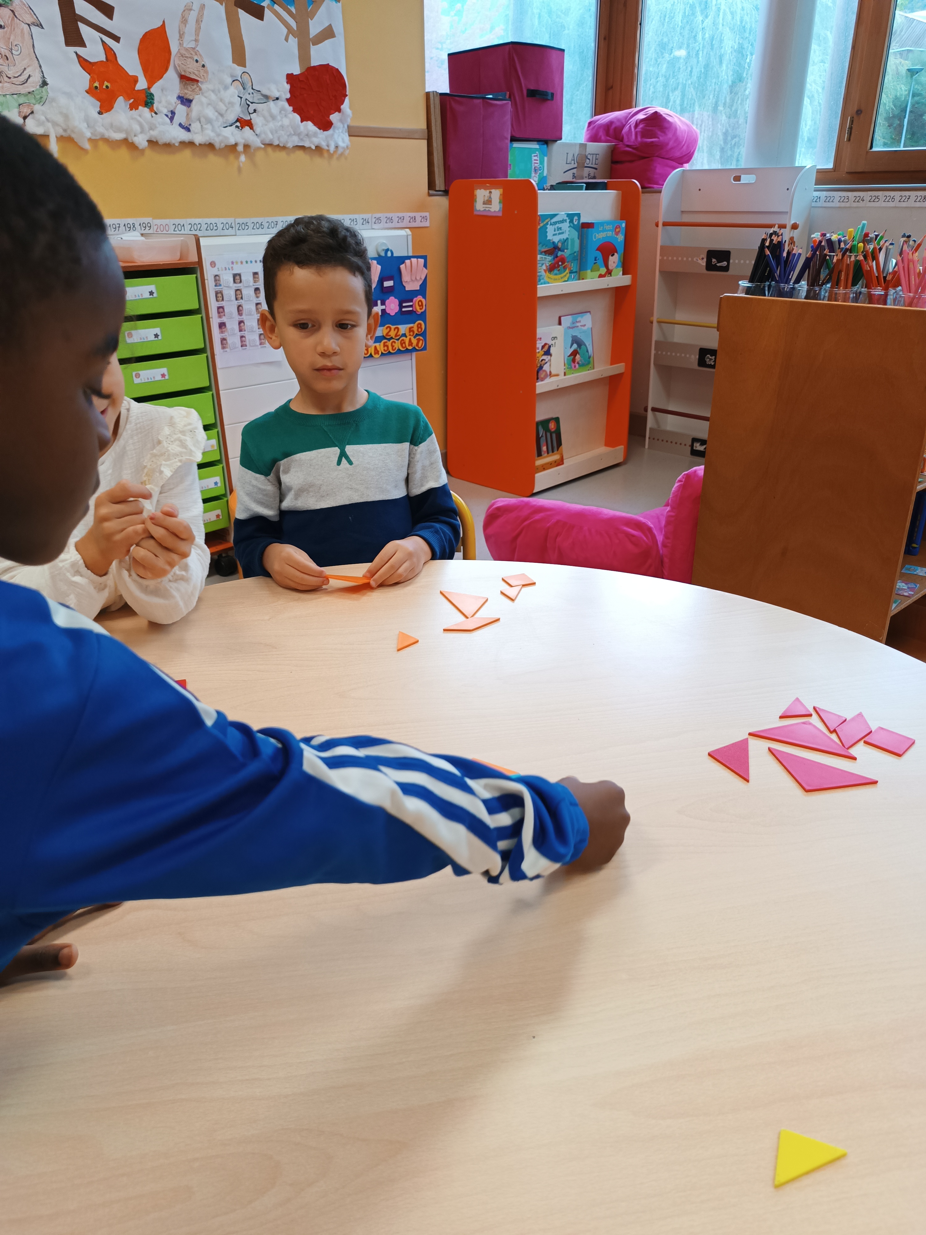 Découverte du tangram : les 7 pièces qui le constituent, les propriétés qu'elles ont (côtés de même longueur...).
