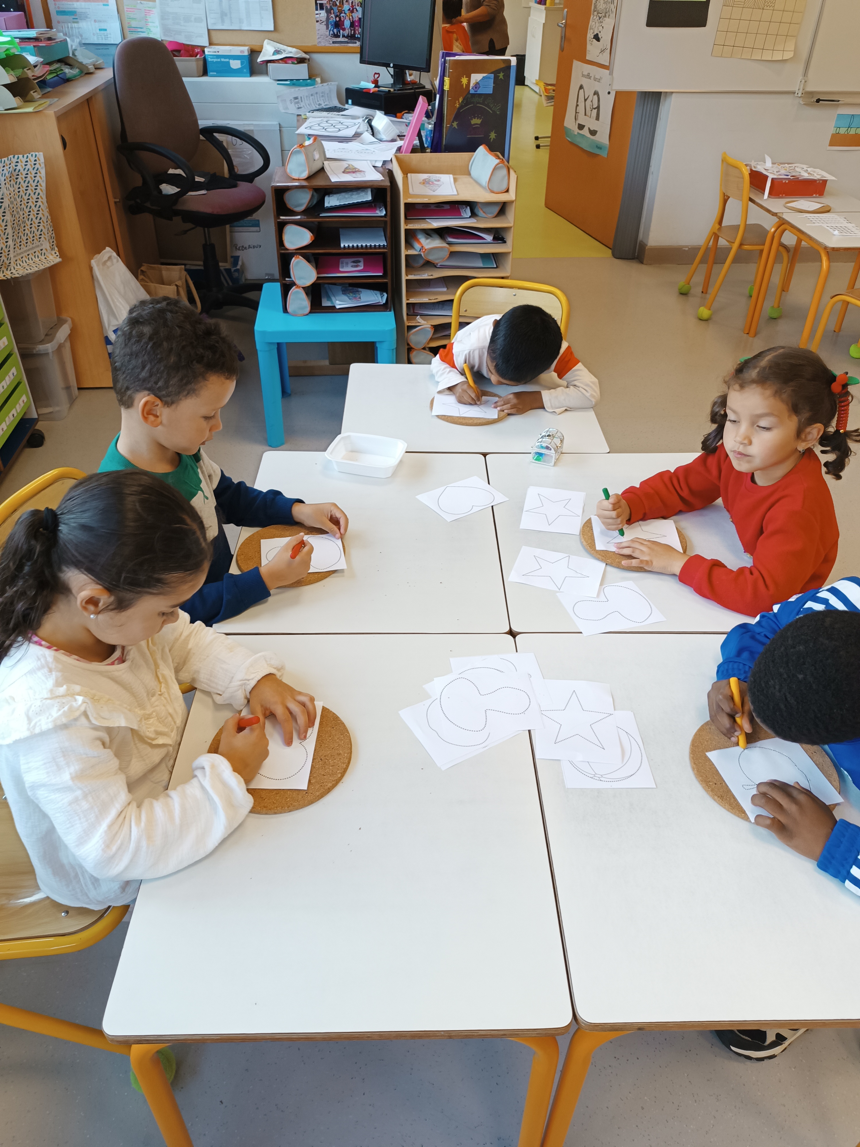 Collectivement, chaque groupe a réalisé une figure pour laquelle les formes ne se touchaient que par des côtés de même longueur.