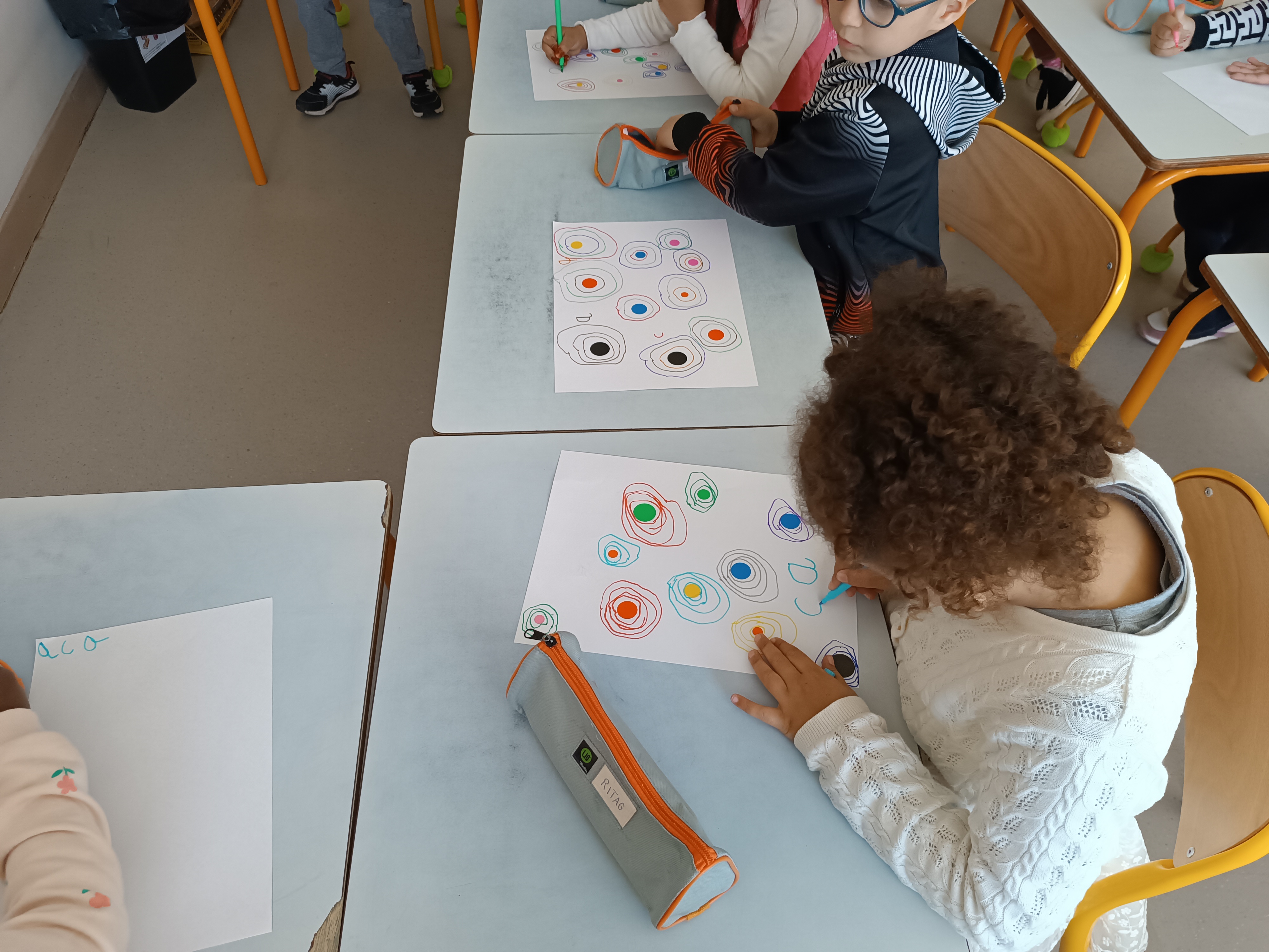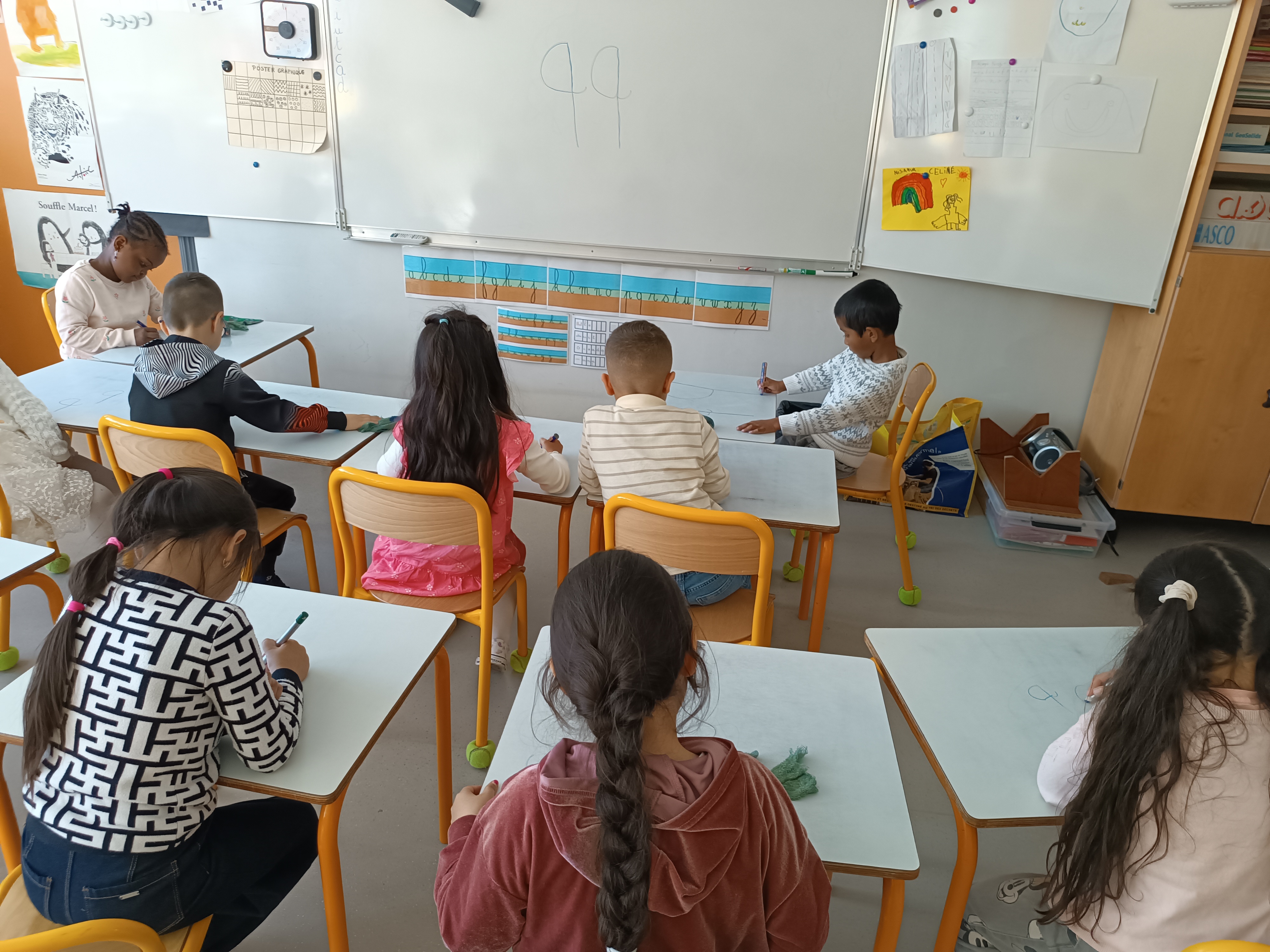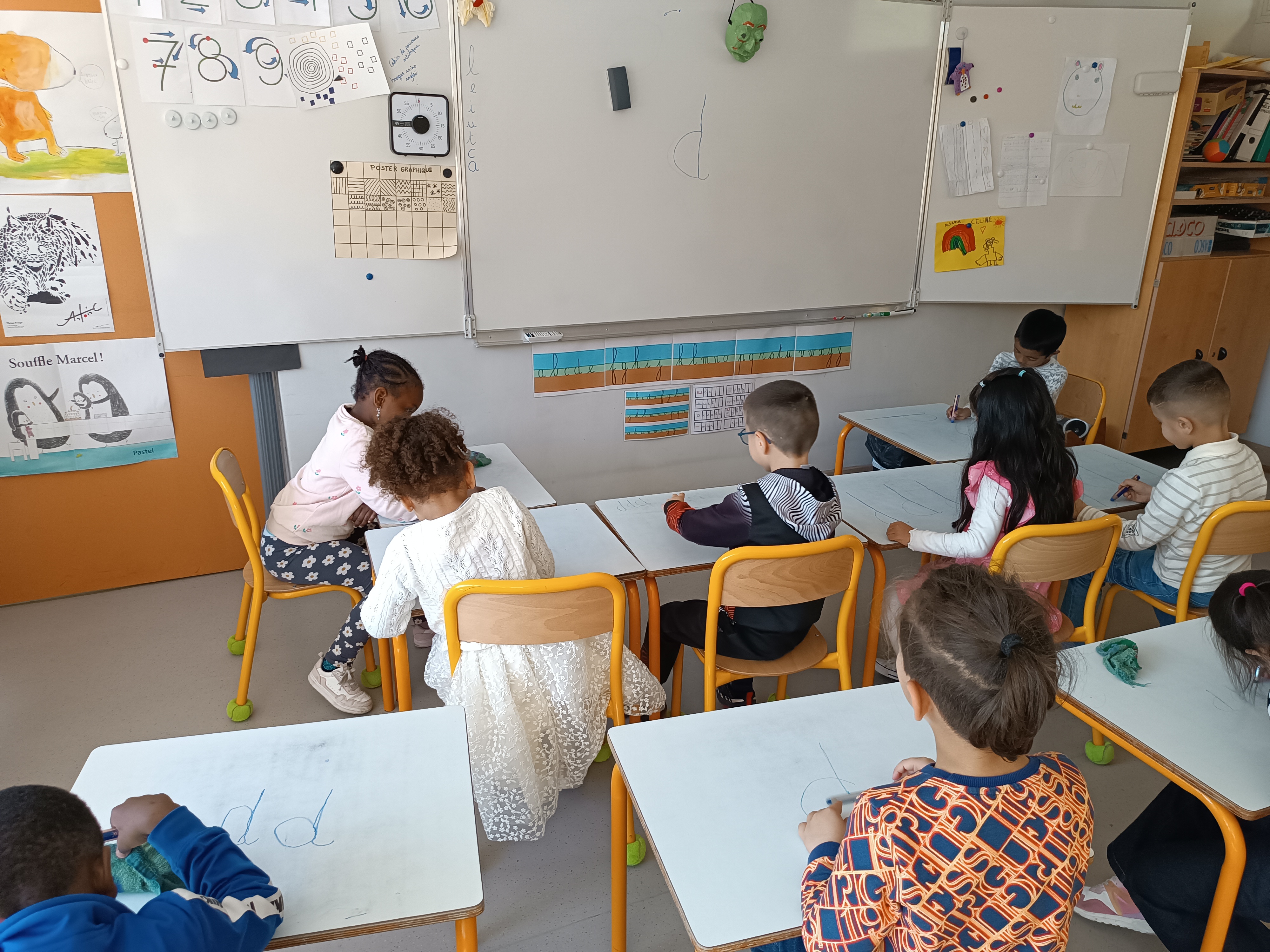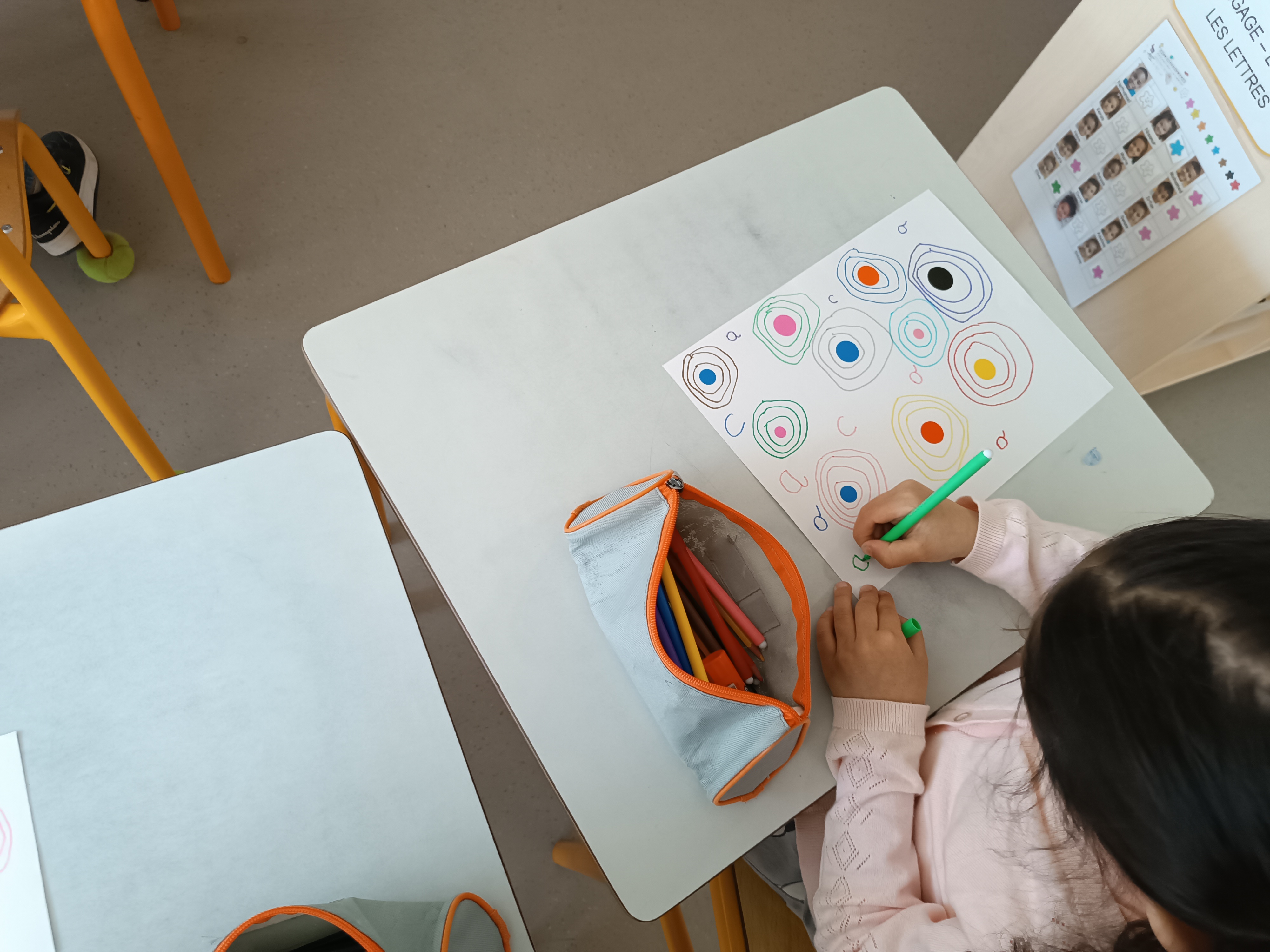 Après avoir révisé le geste du cercle la semaine dernière, nous voici parti dans l'apprentissage des lettres rondes en cursives : c, a, o, d et q. Après un entraînement sur la table, on s'exerce sur le support réalisé la semaine dernière.