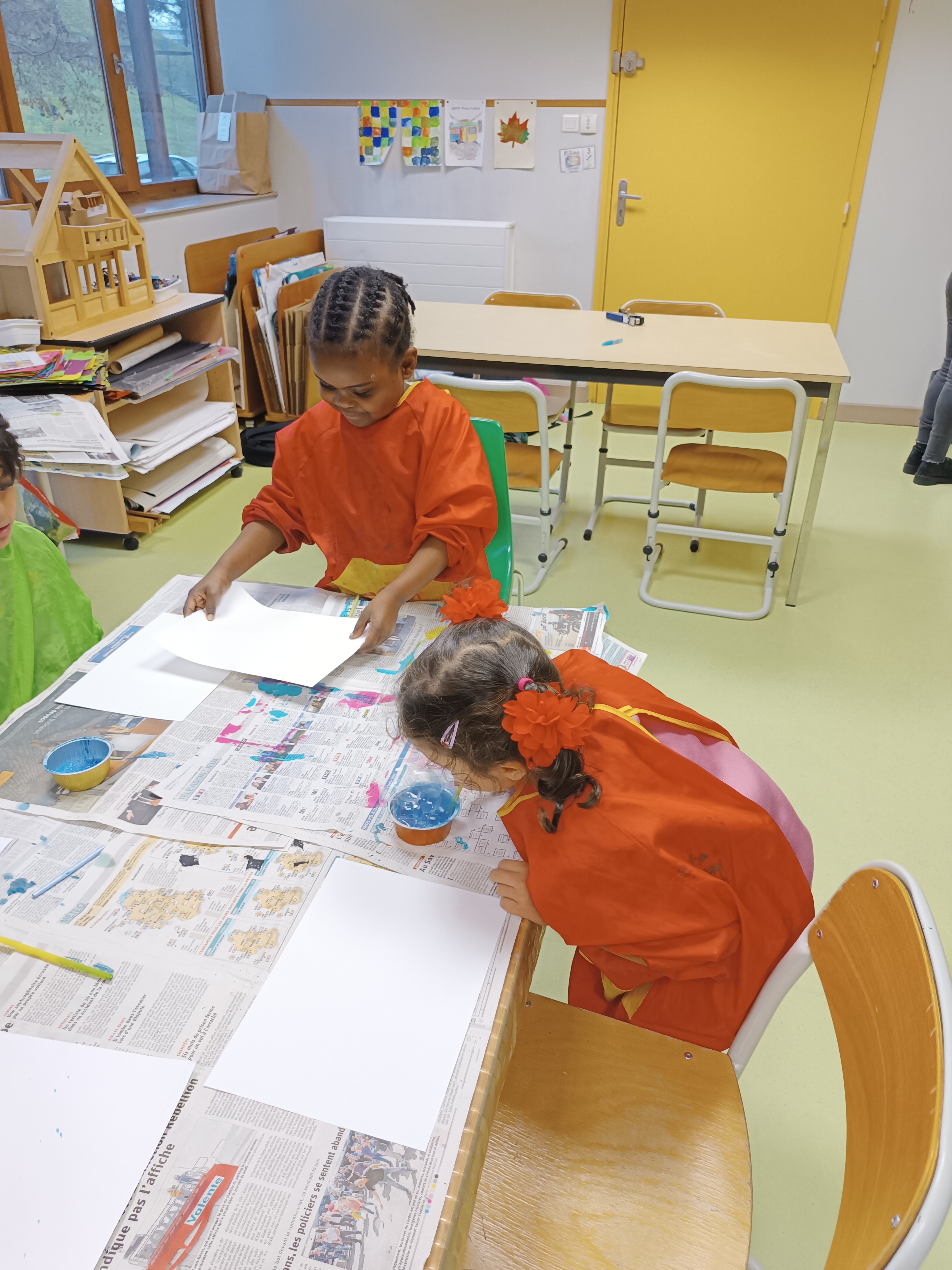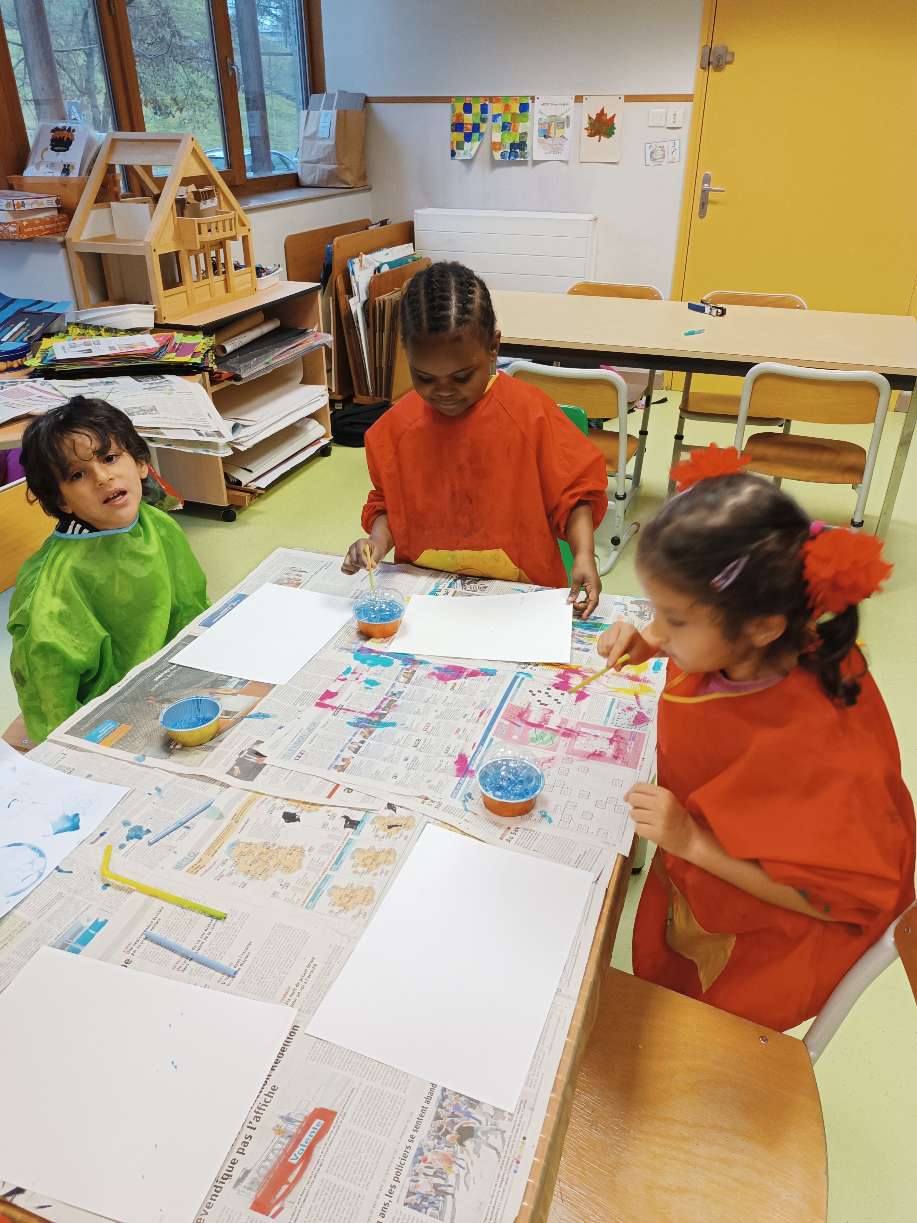 Souffler dans de la peinture avec des pailles pour faire des bulles et imprimer ces bulles sur une feuille : voilà ce que les enfants ont fait pour réaliser un fond. Une activité amusante mais pas aussi simple qu'il n'y paraît 😉
