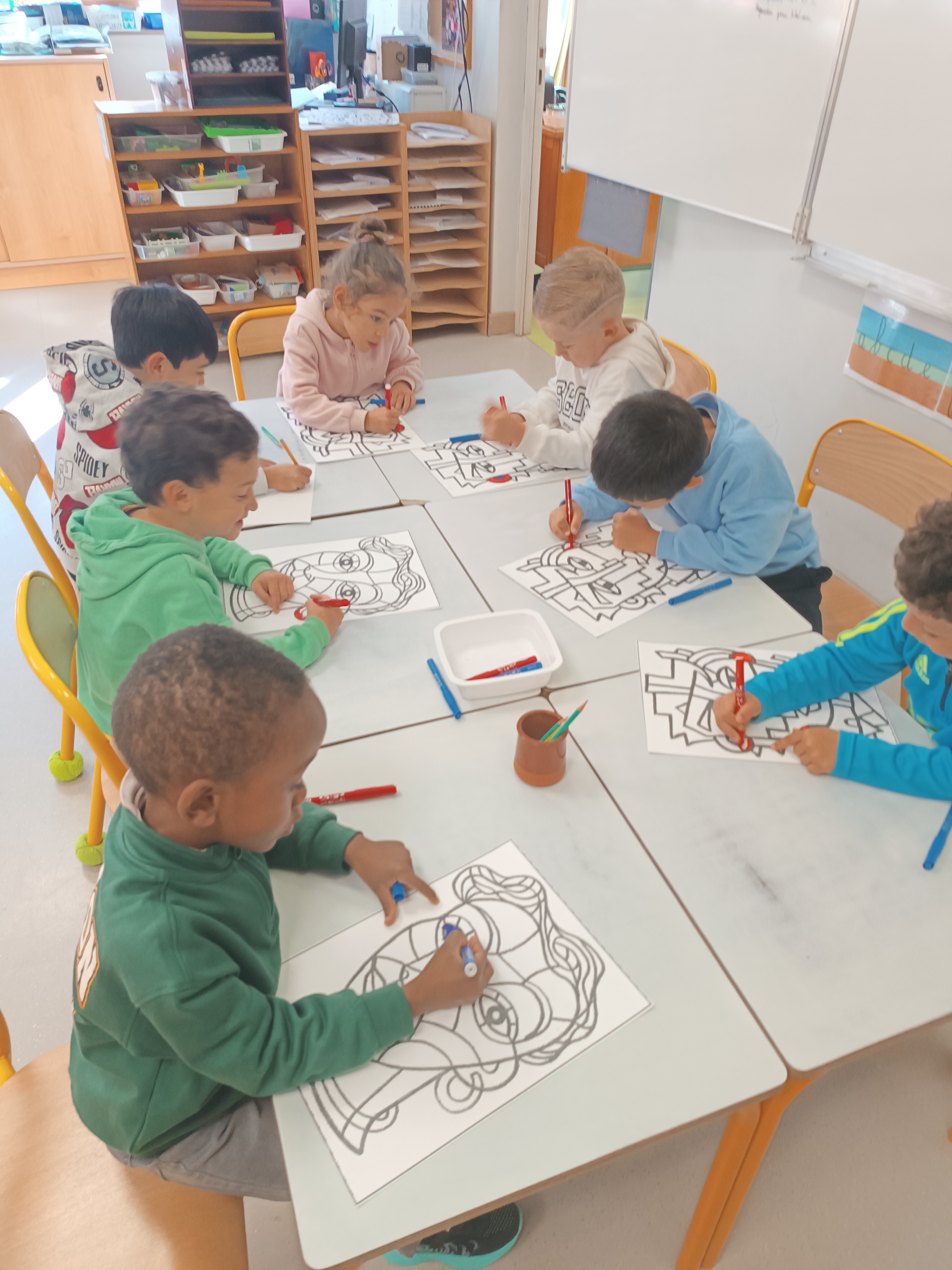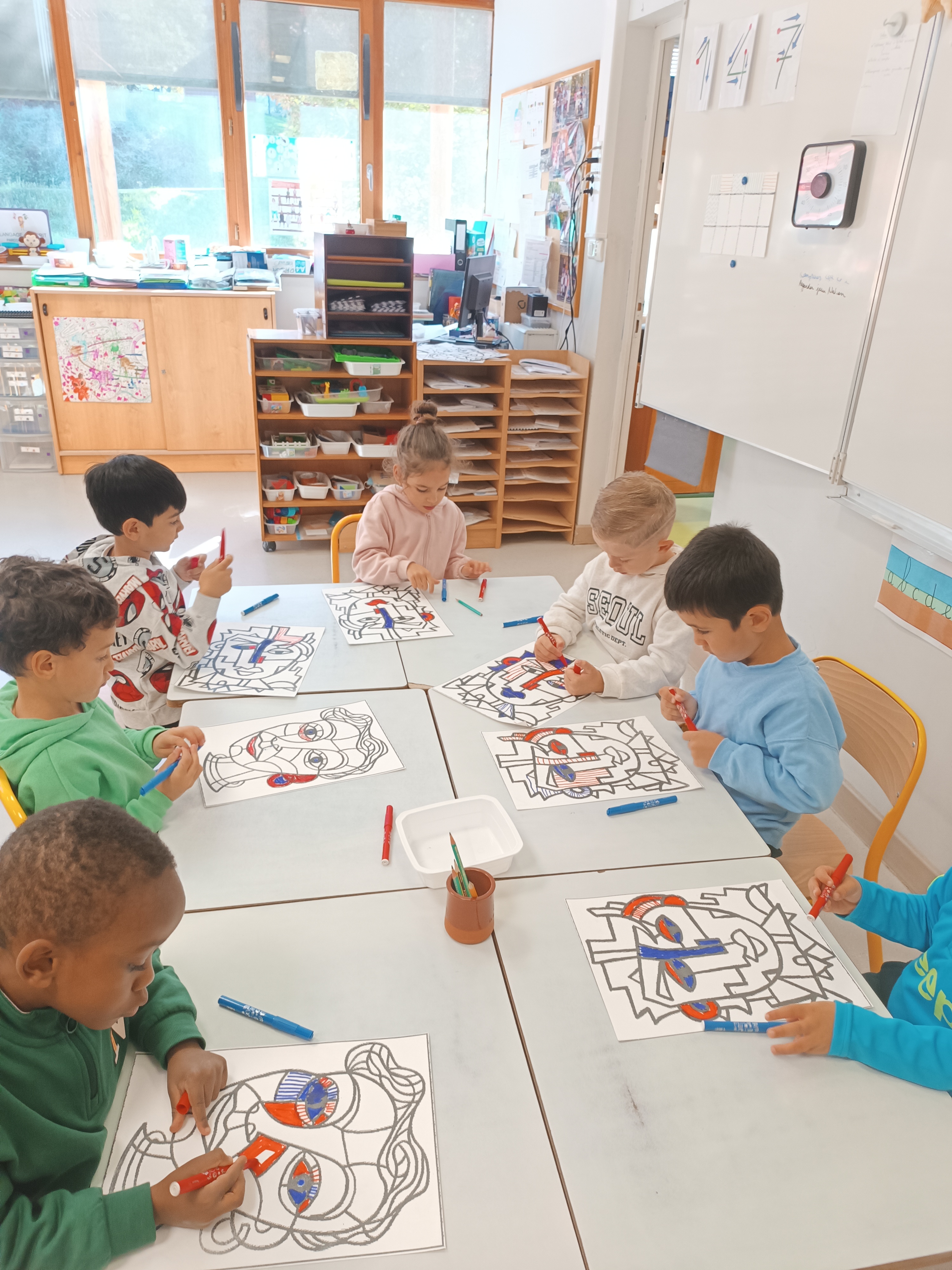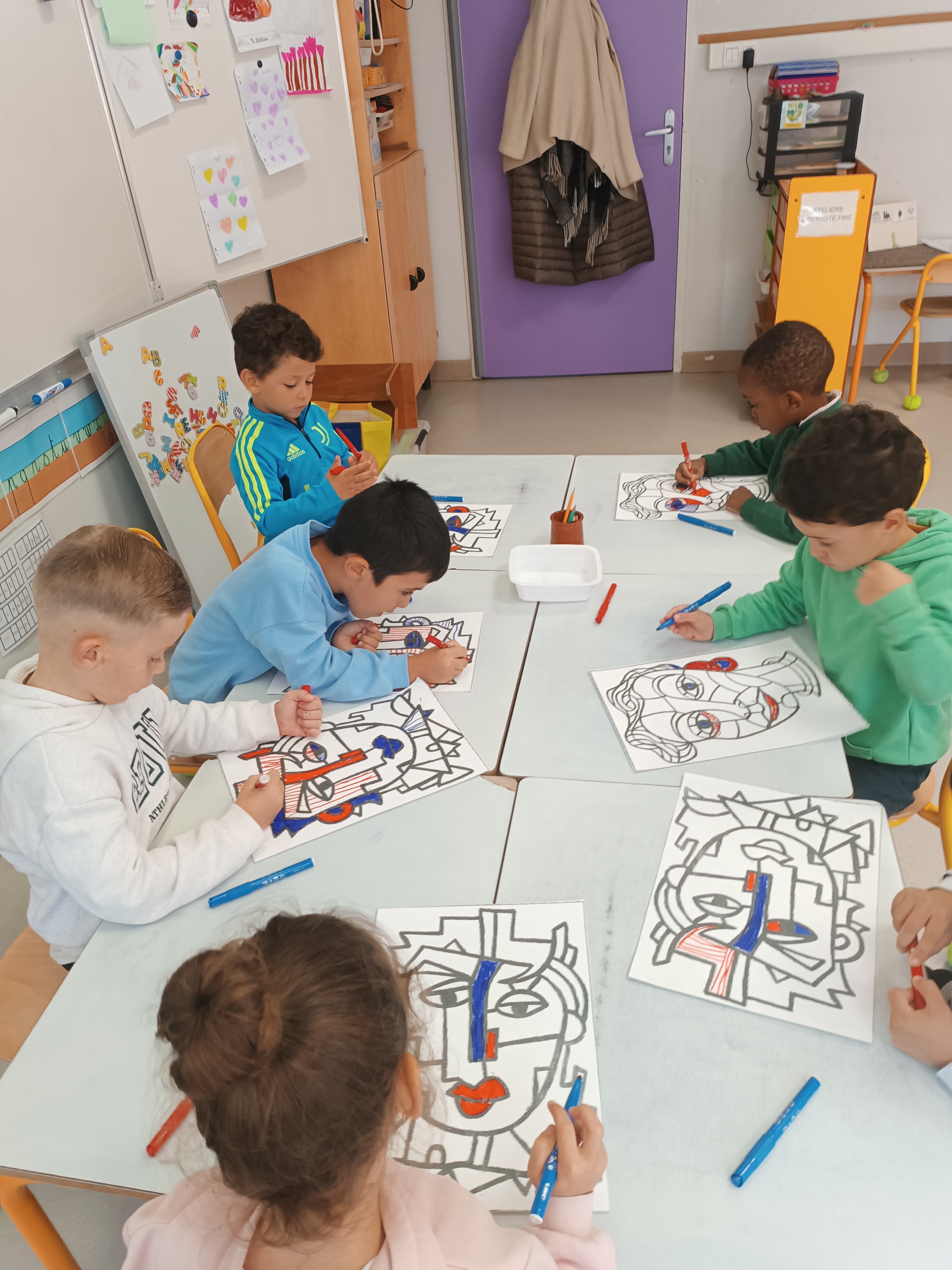 A la manière de Jean Dubuffet : exceptionnellement, les enfants ont pu utiliser le feutre pour colorier alors ils en profitent 😅