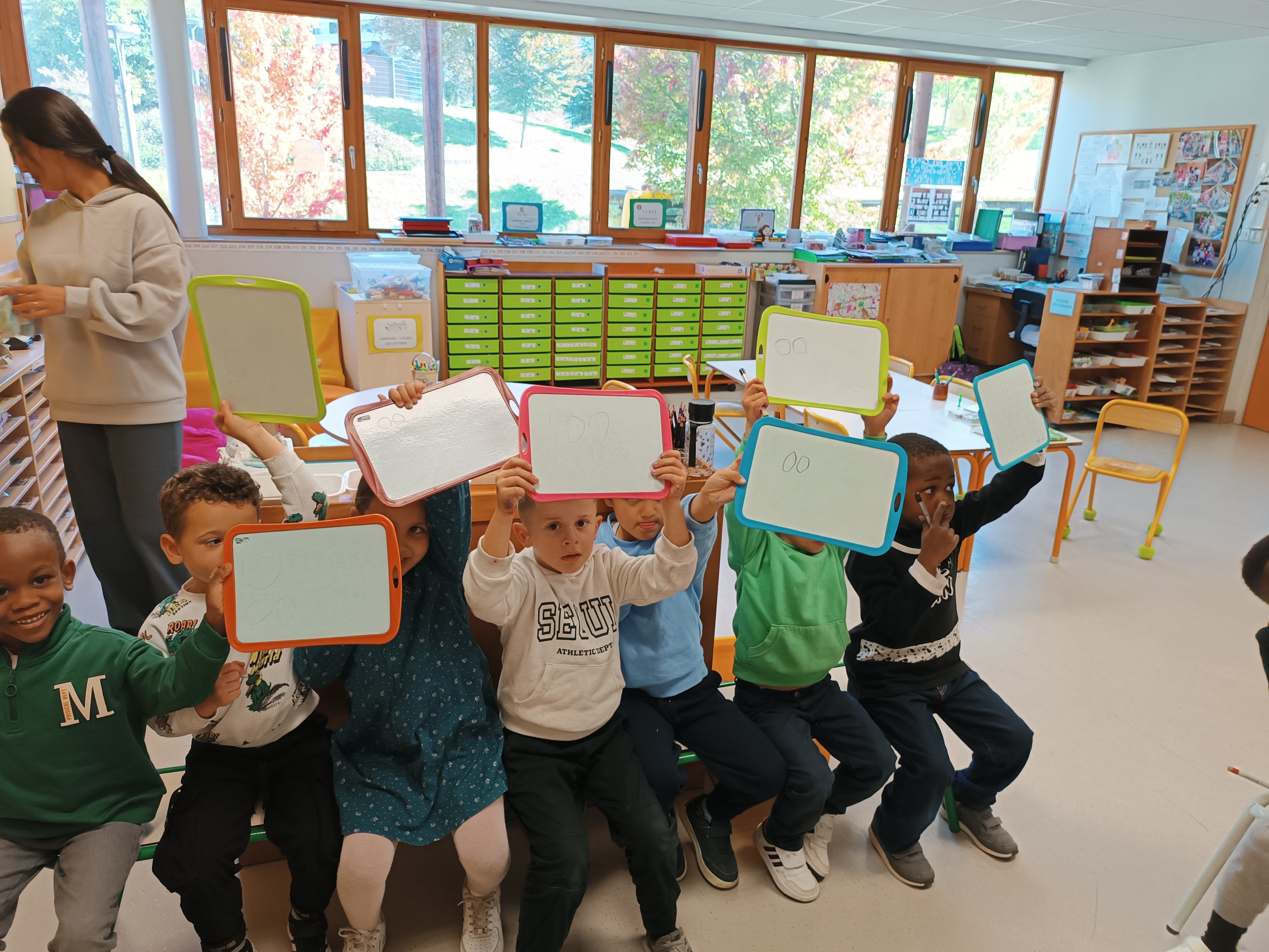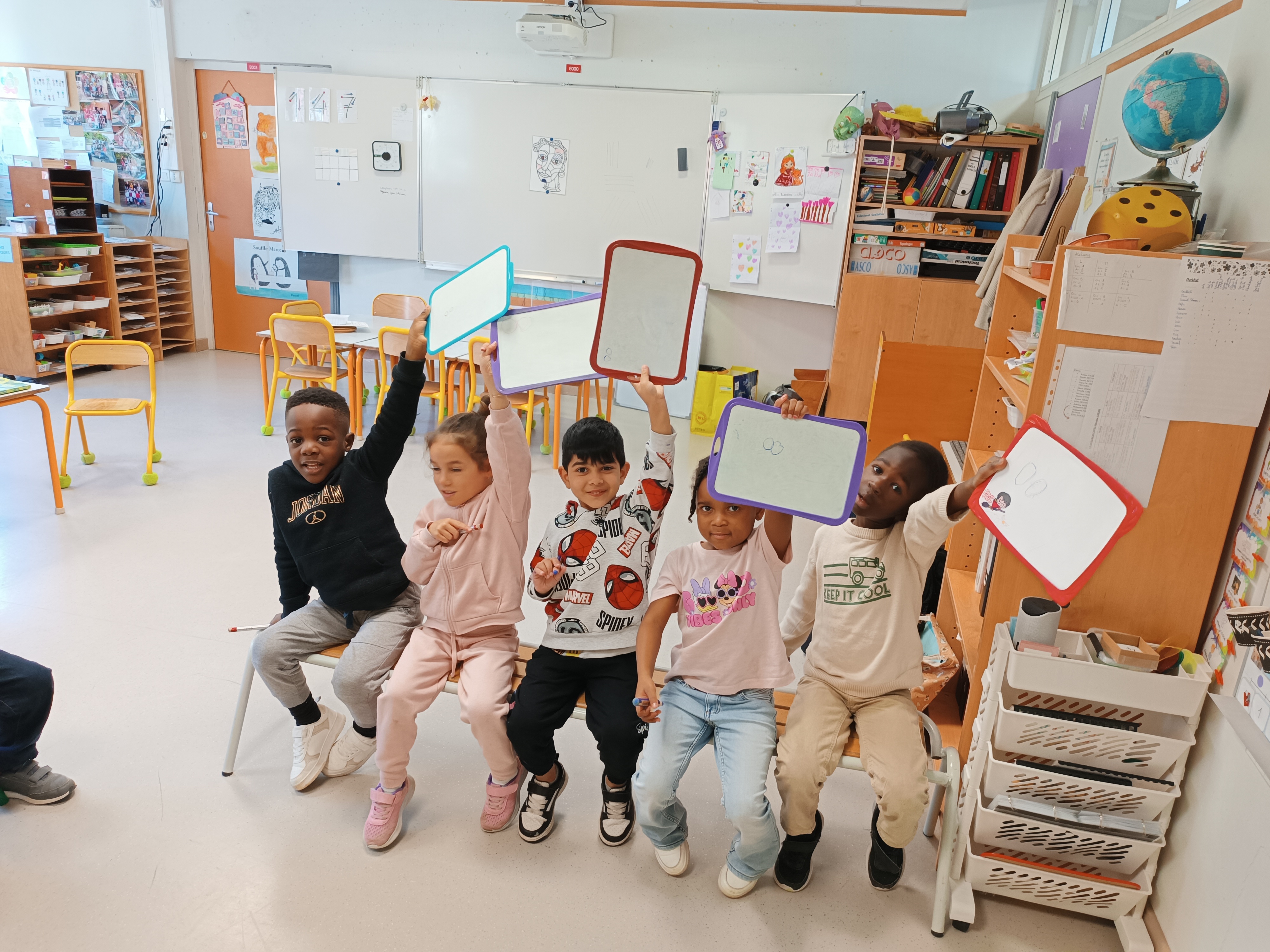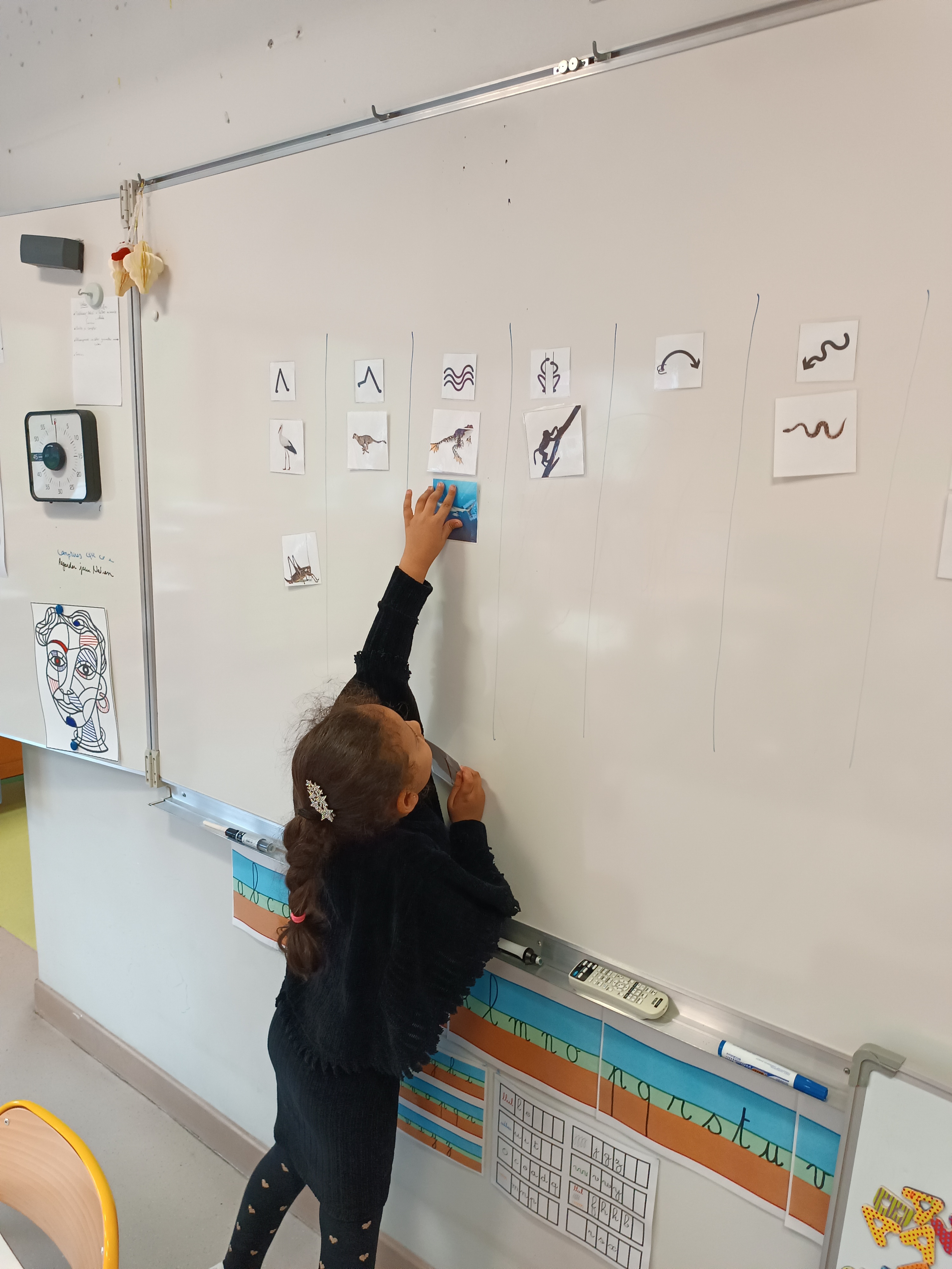 Phonologie : on compte les syllabes puis on dessine un rond par syllabe sur l'ardoise pour les représenter.