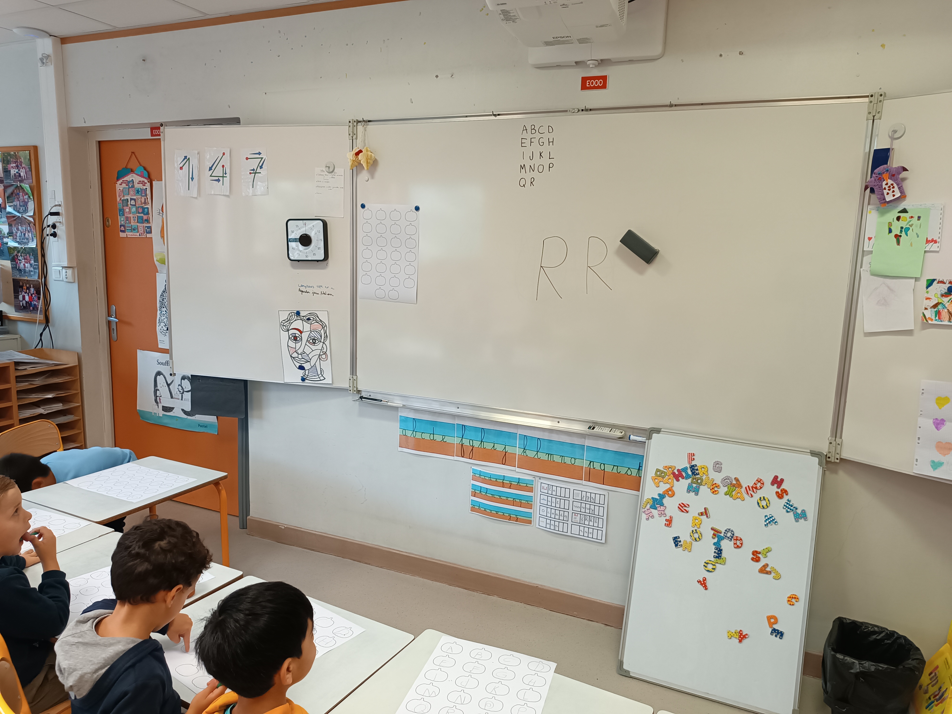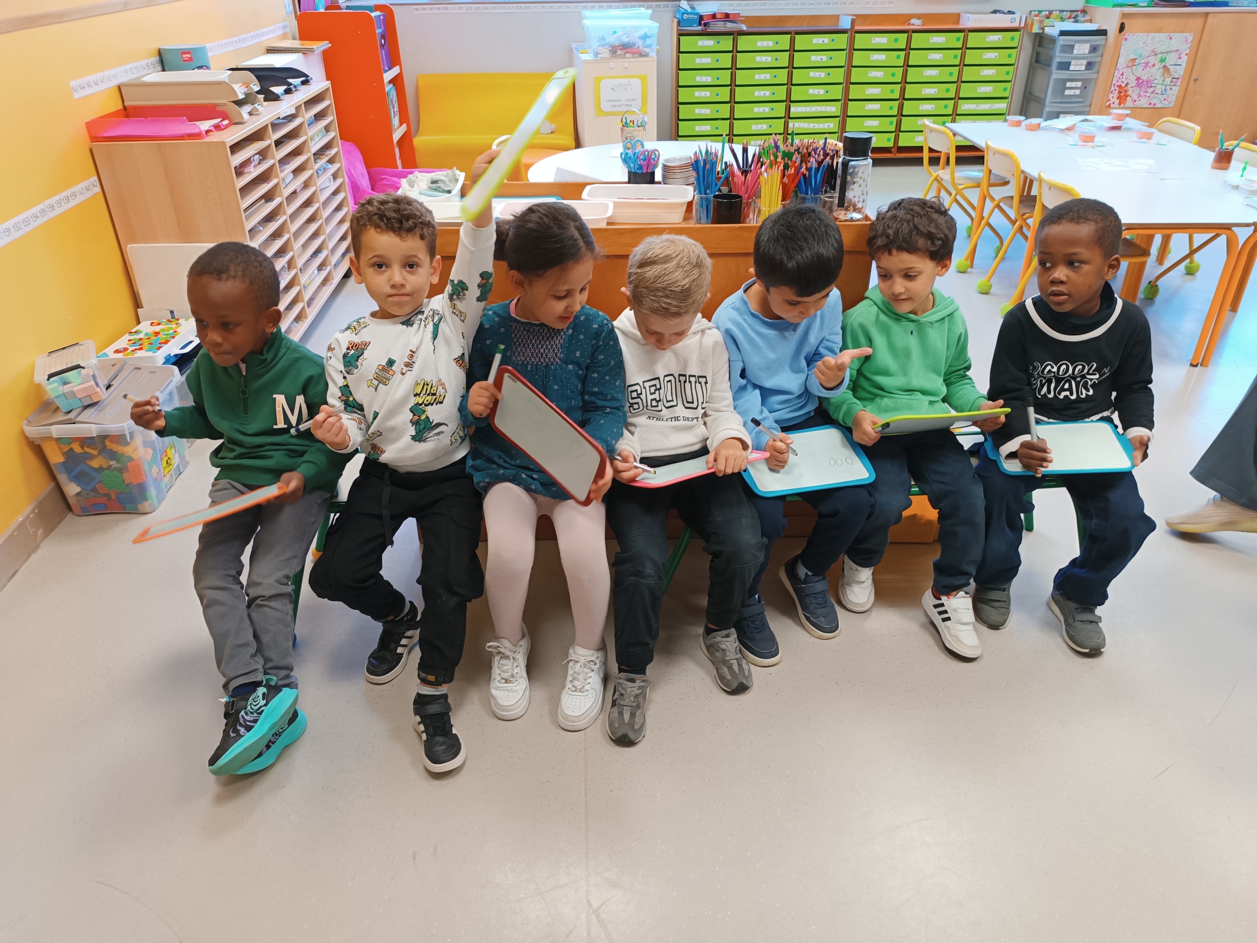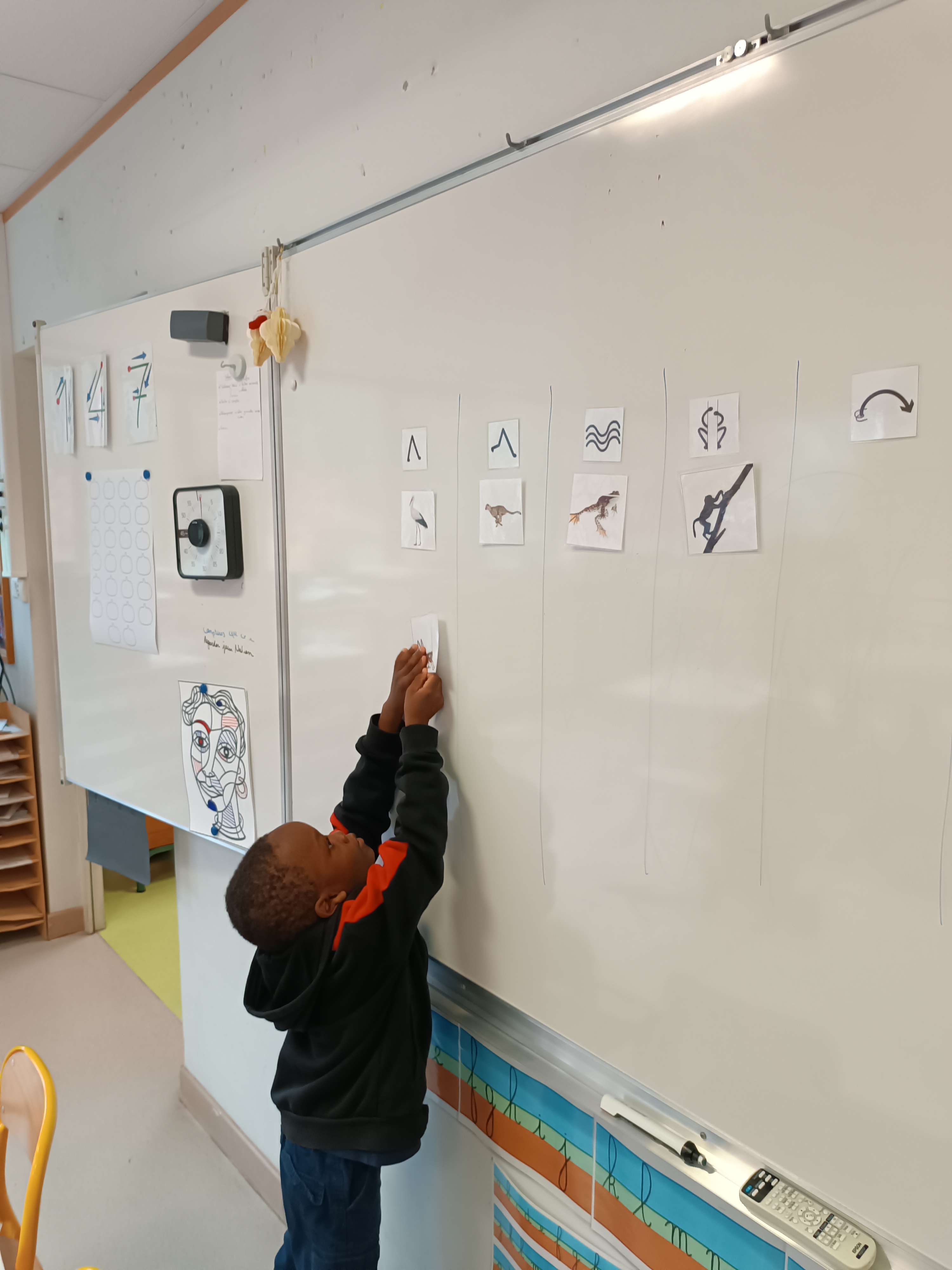 Phonologie : on compte les syllabes puis on dessine un rond par syllabe sur l'ardoise pour les représenter.