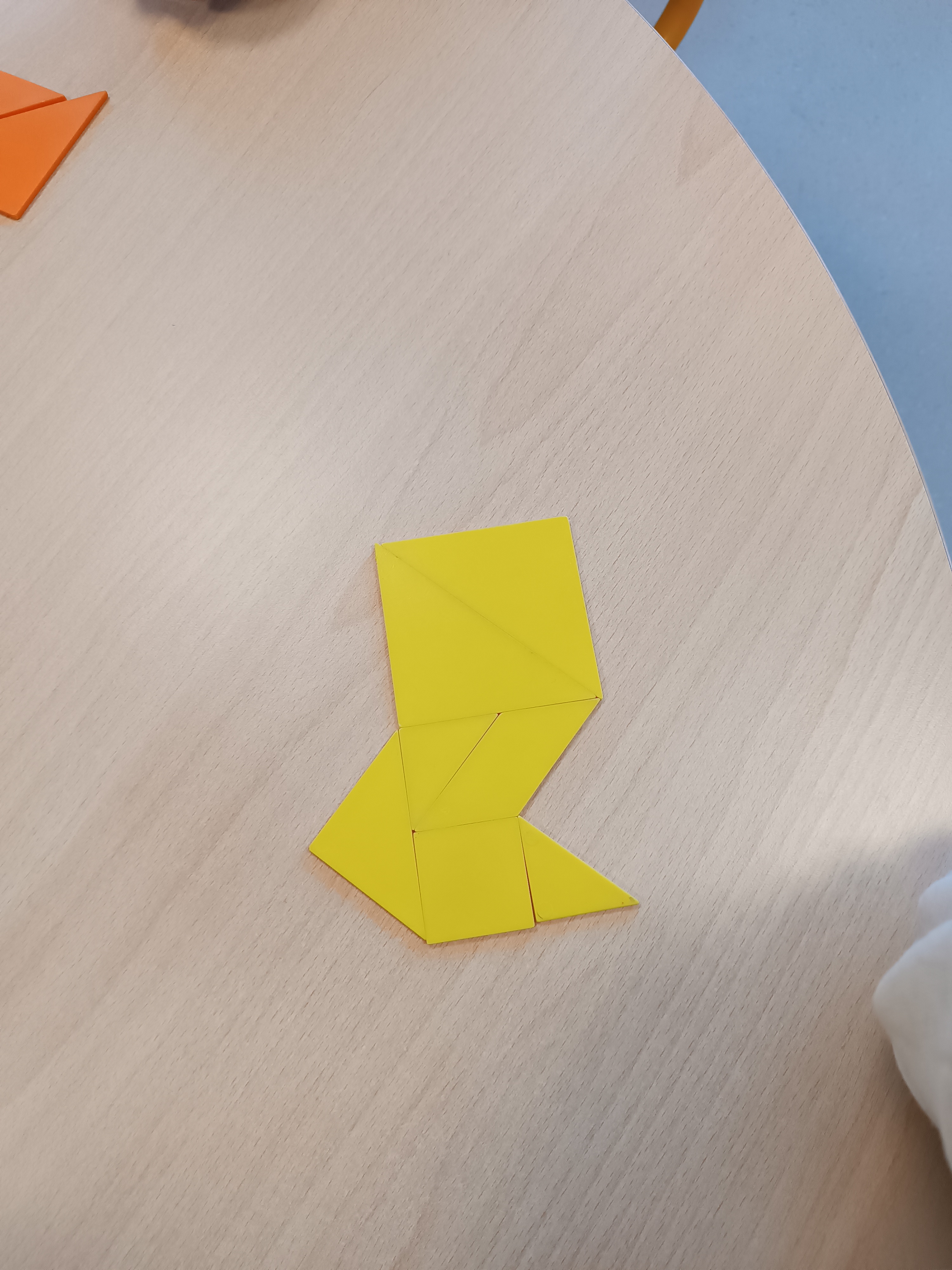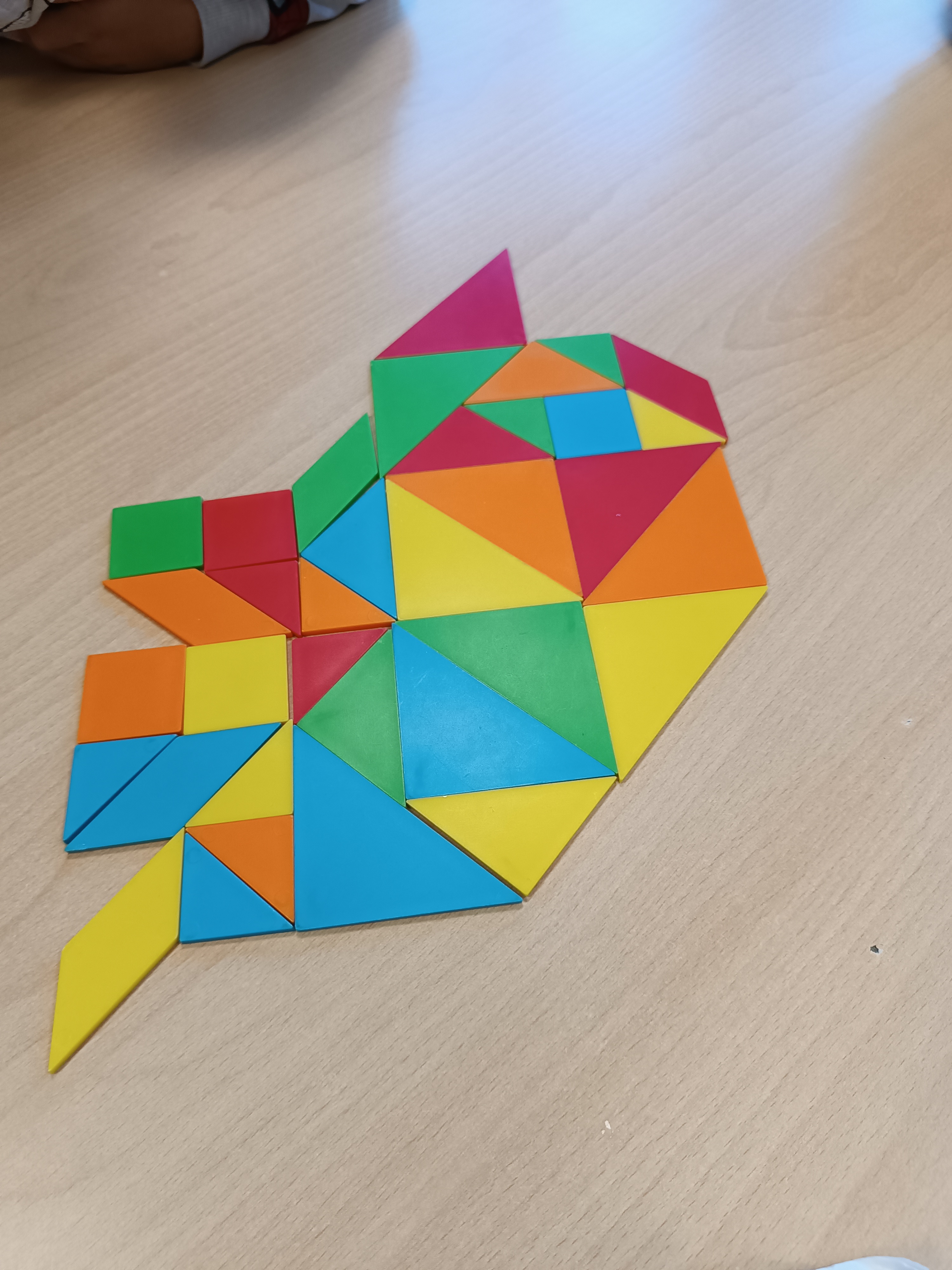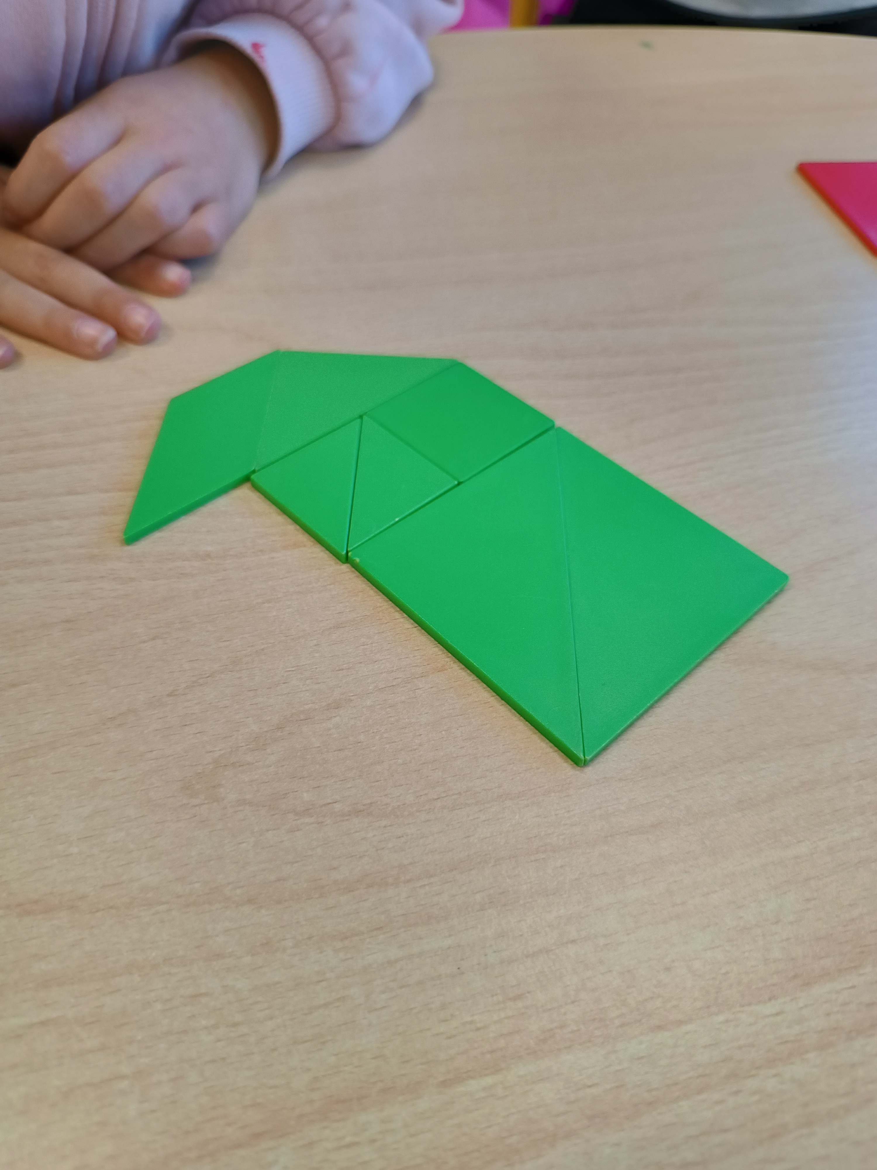 Nous avons manipulé les pièces du tangram pour constater qu'elles avaient des côtes de même longueur. Les enfants ont d'abord réalisé une figure avec toutes les pièces de leur tangram en respectant la consigne "toutes les pièces doivent se toucher par un côté qui a la même taille".
