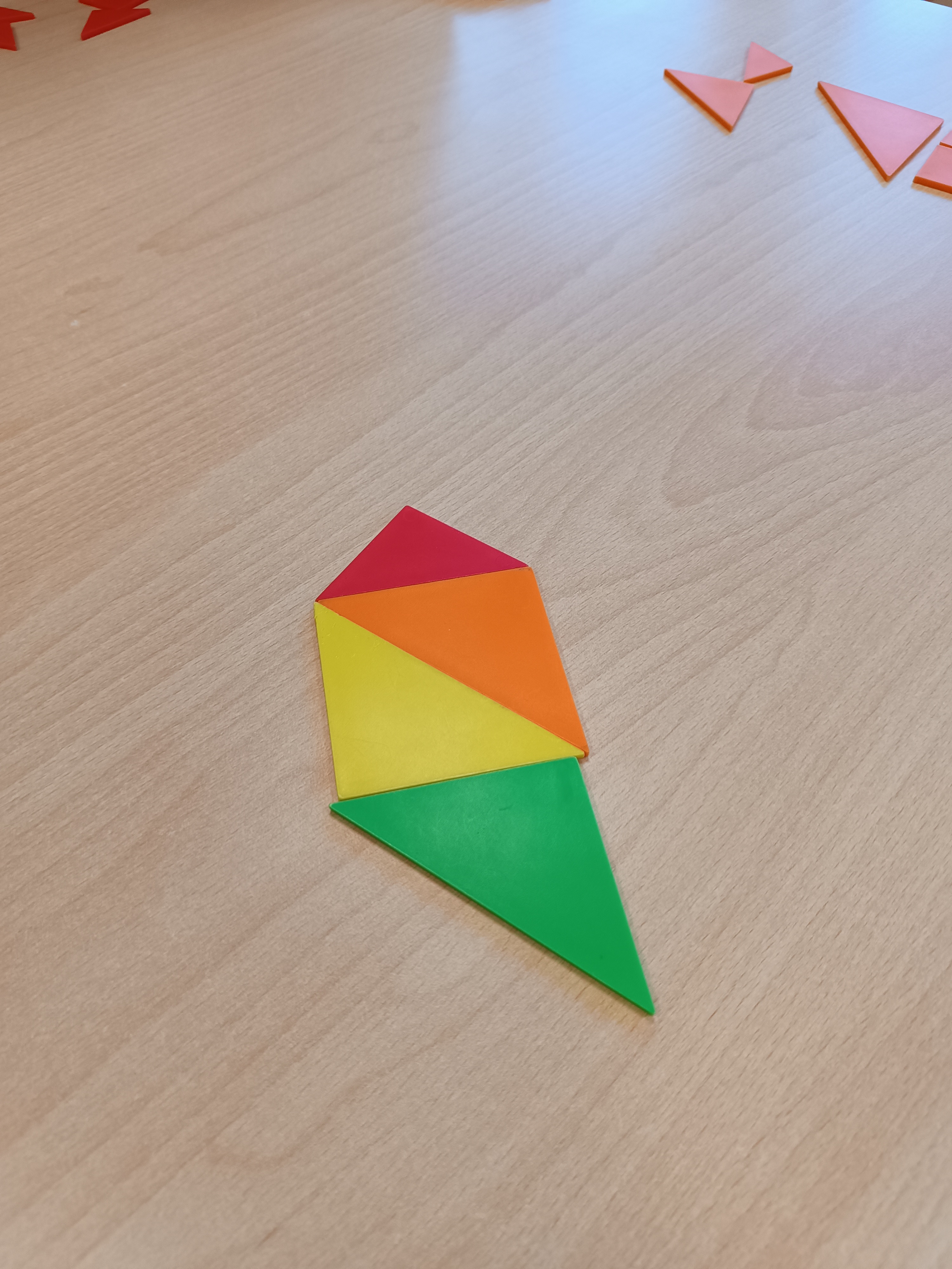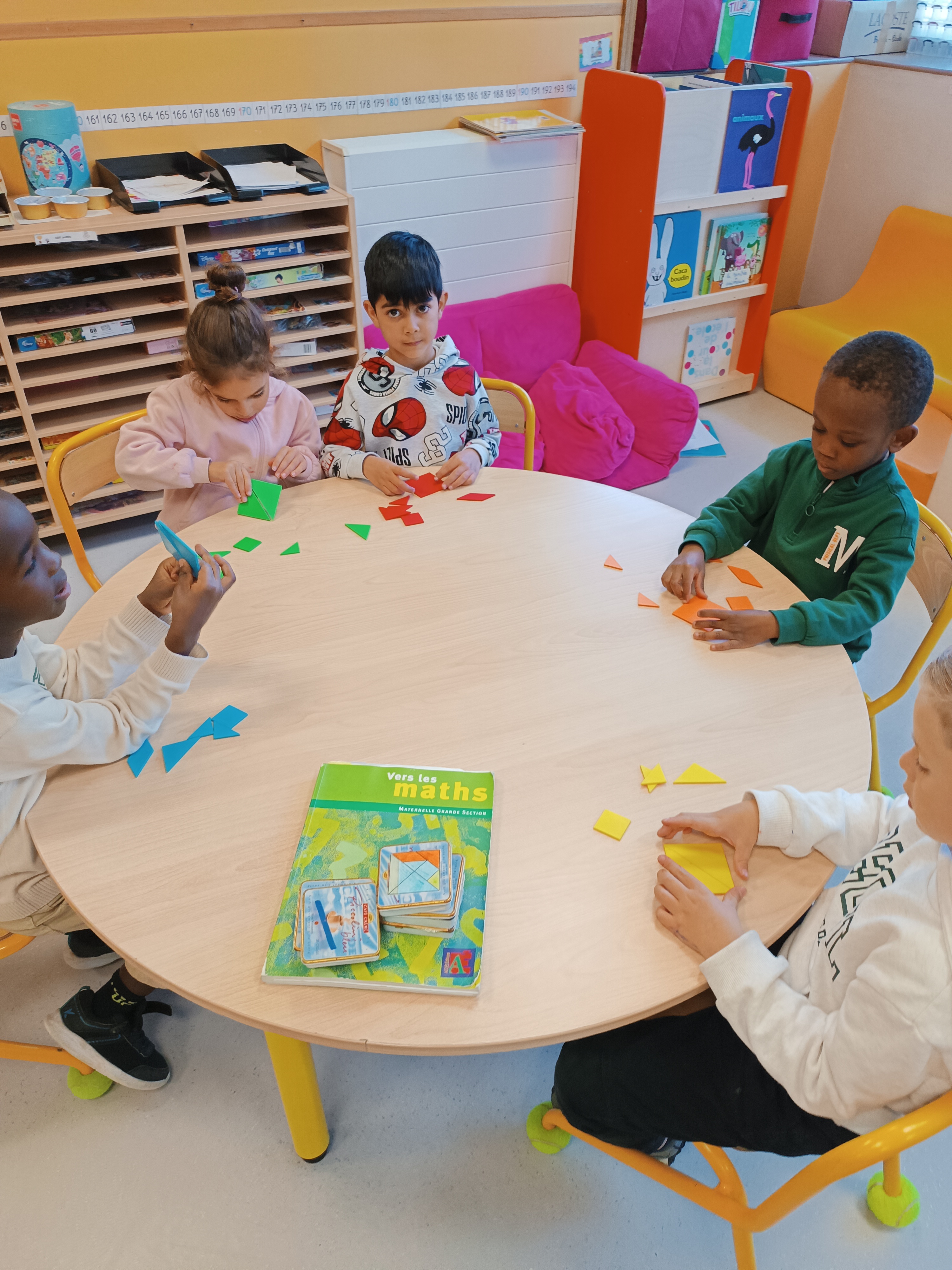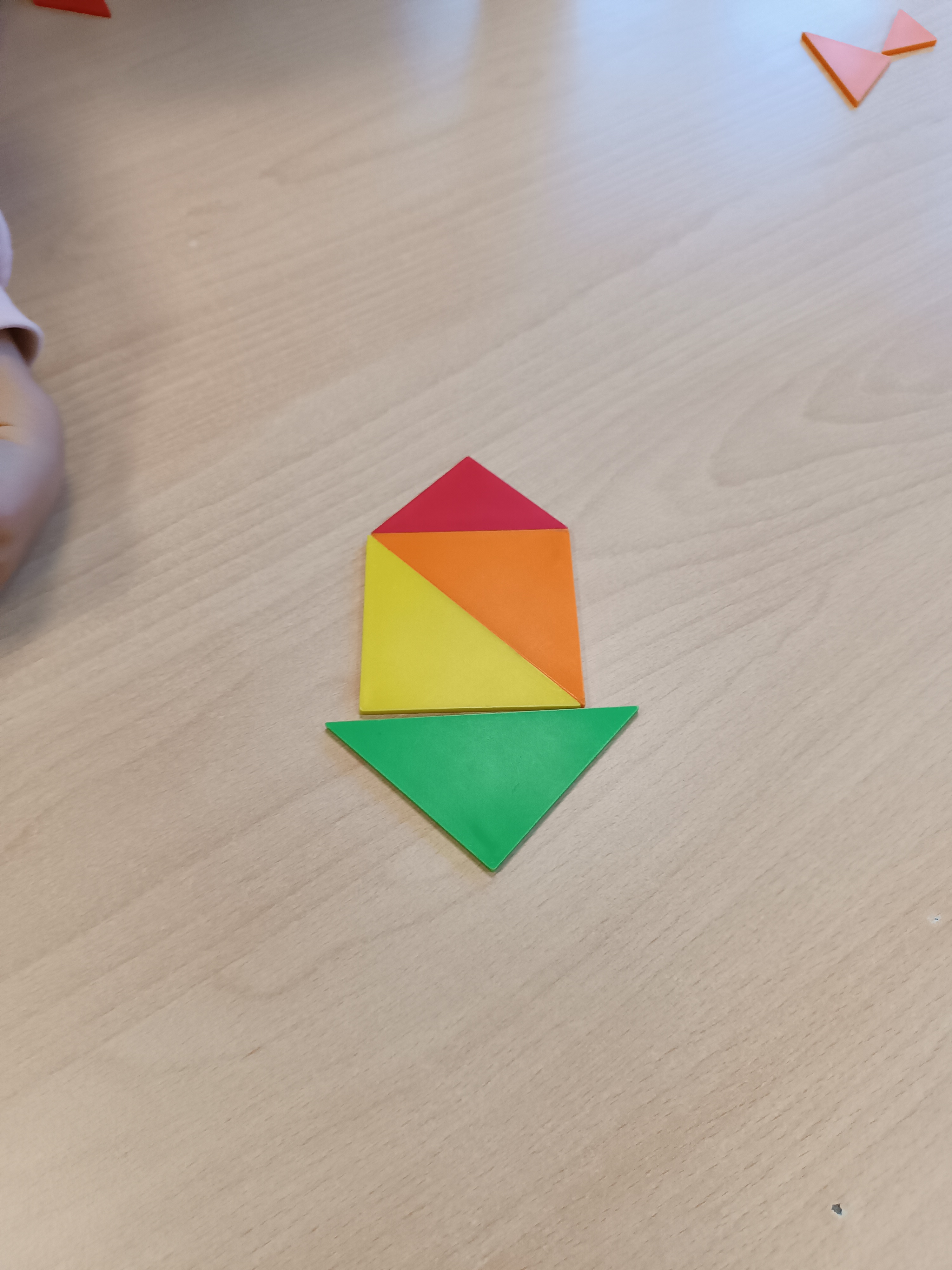 Nous avons manipulé les pièces du tangram pour constater qu'elles avaient des côtes de même longueur. Les enfants ont d'abord réalisé une figure avec toutes les pièces de leur tangram en respectant la consigne "toutes les pièces doivent se toucher par un côté qui a la même taille".