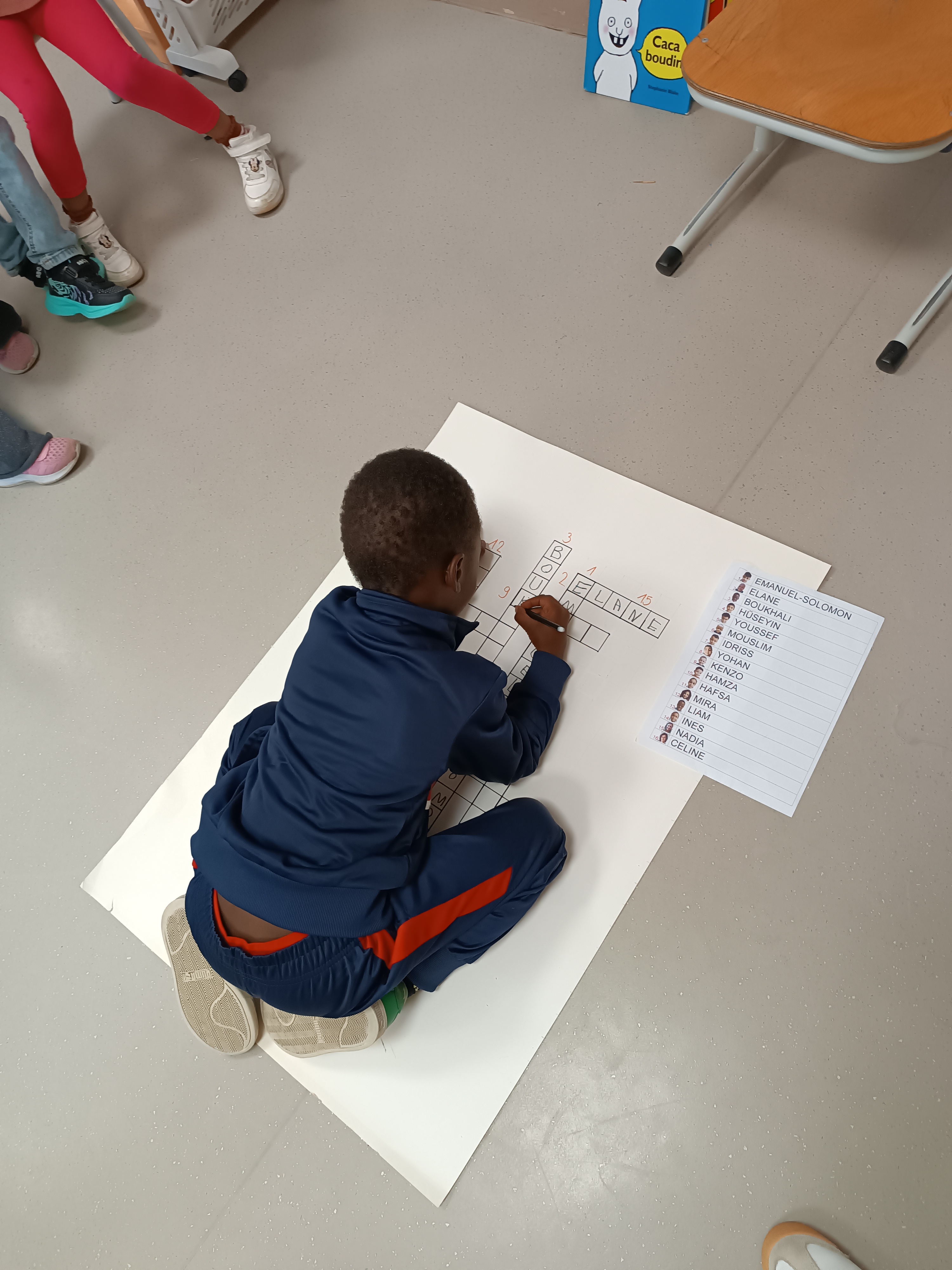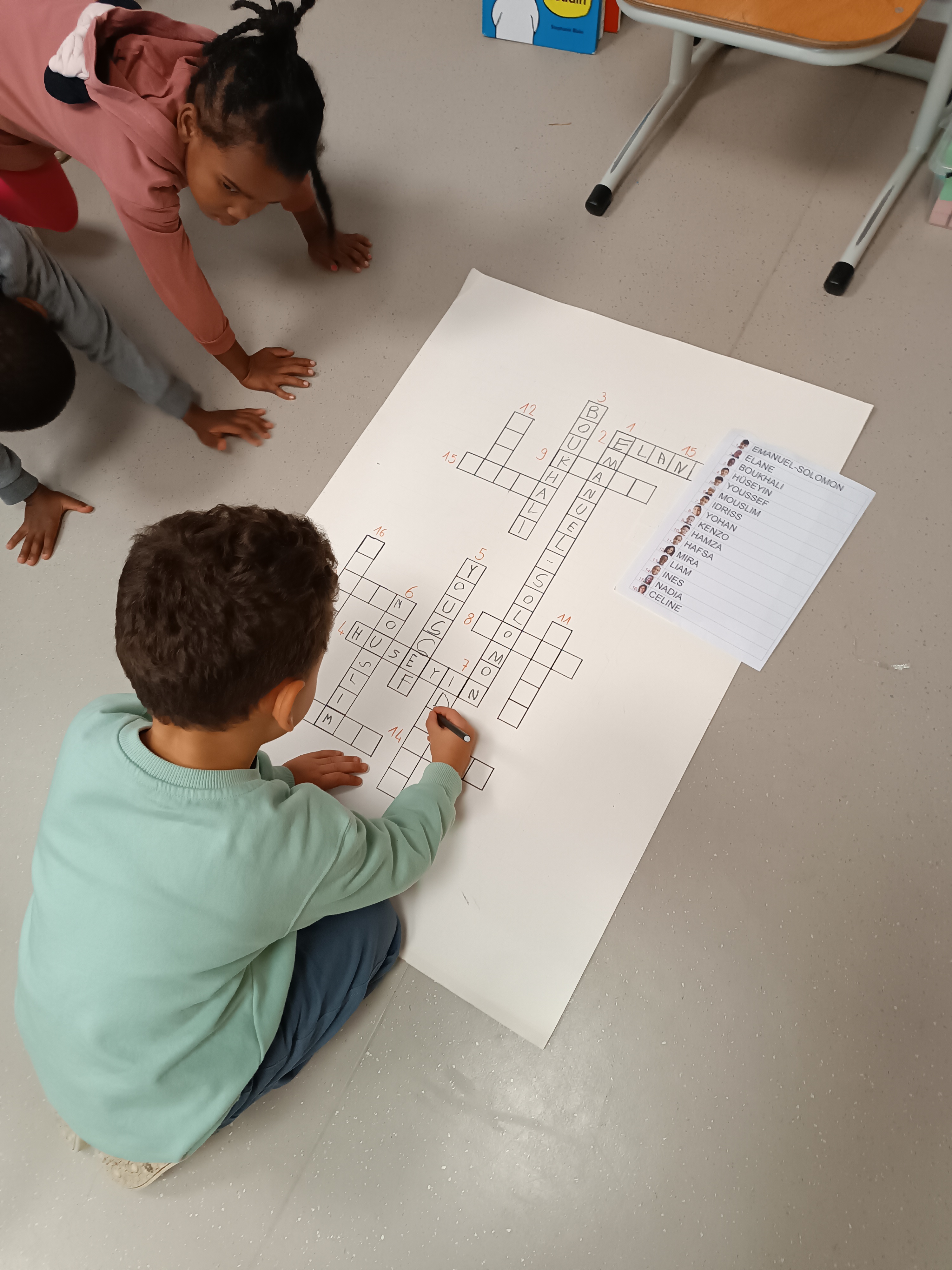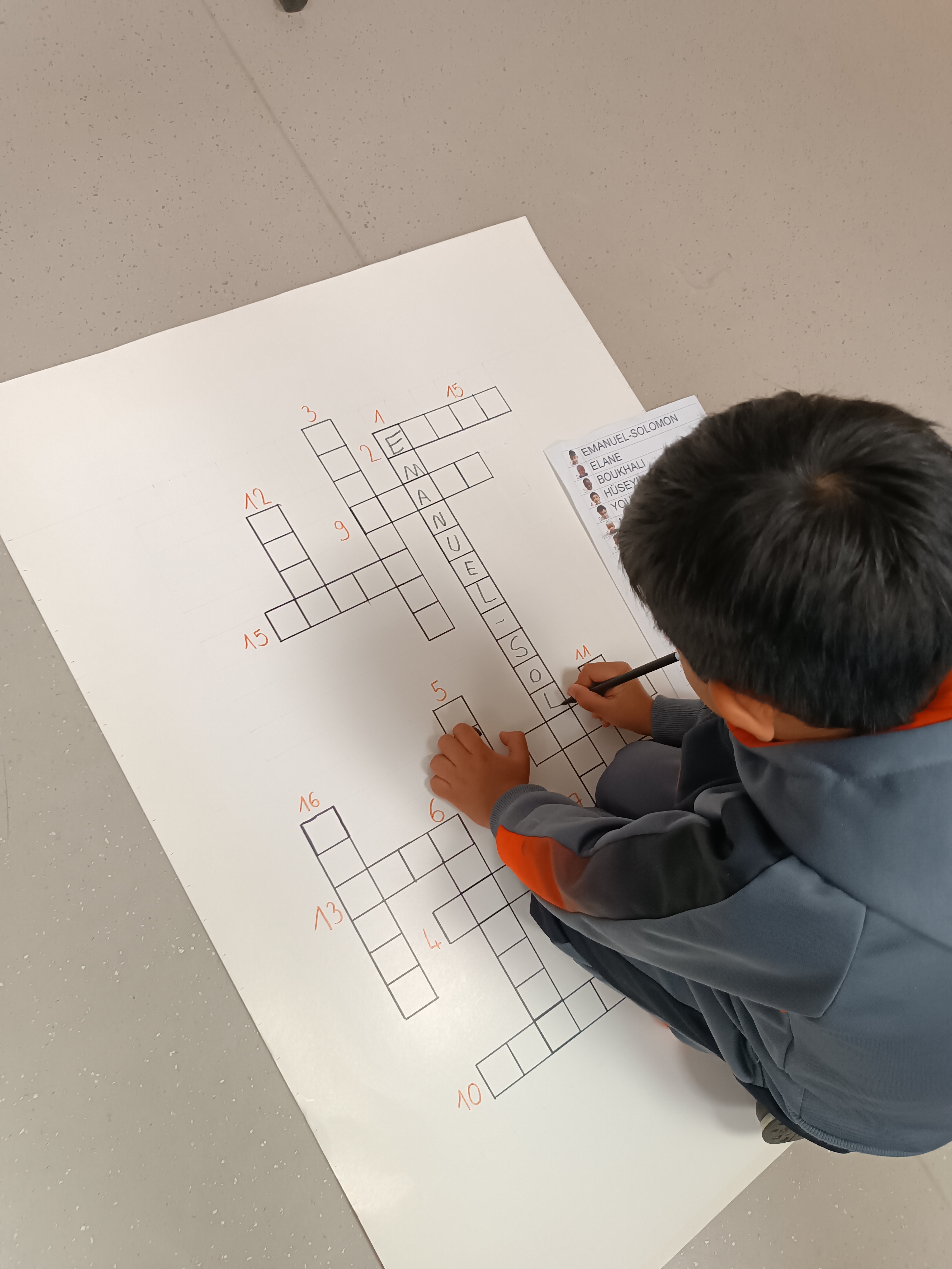 On a rempli la grille de mots-croisés des enfants de la classe. On cherche le numéro associé à son prénom puis on l'écrit au bon endroit.