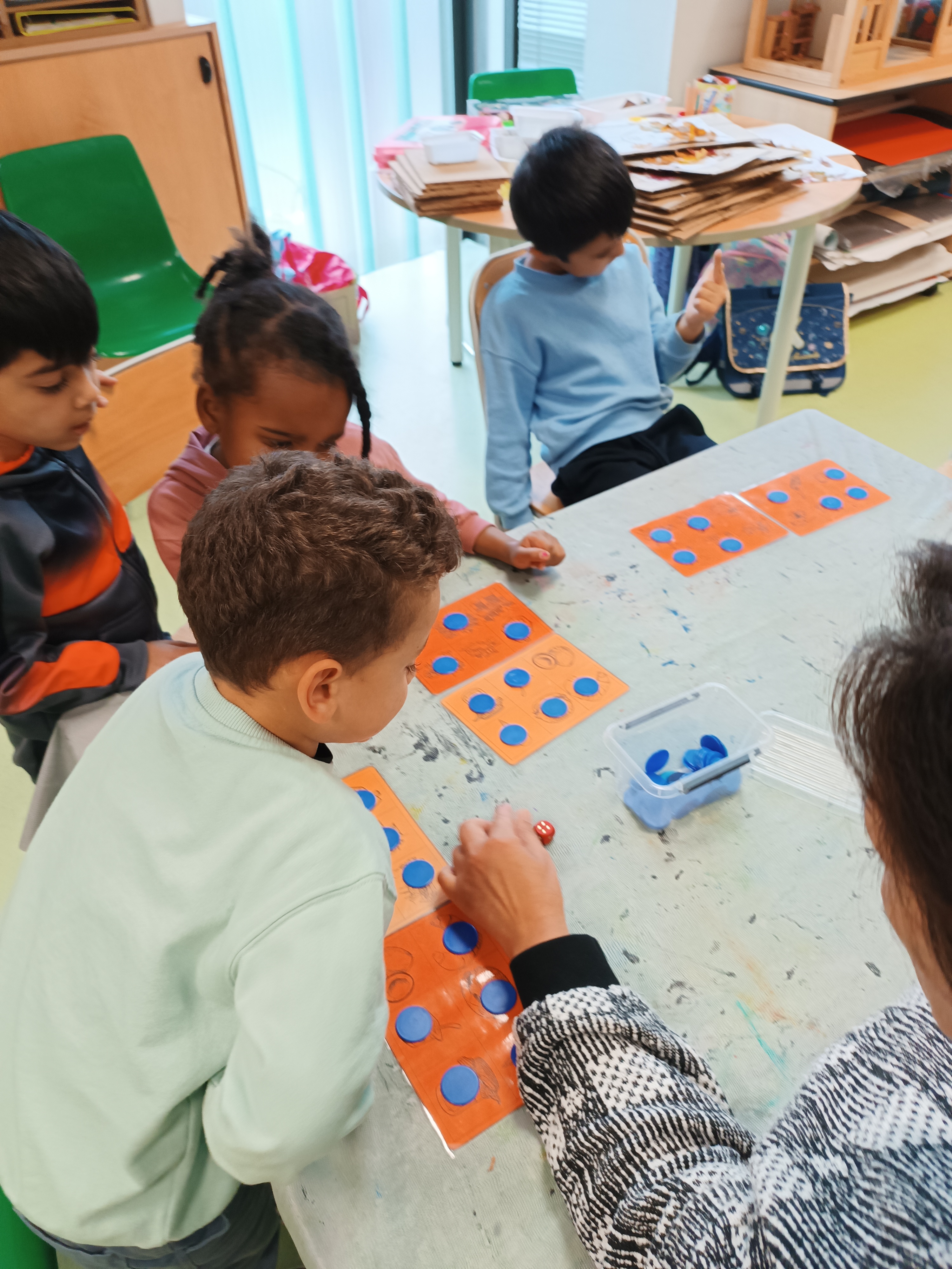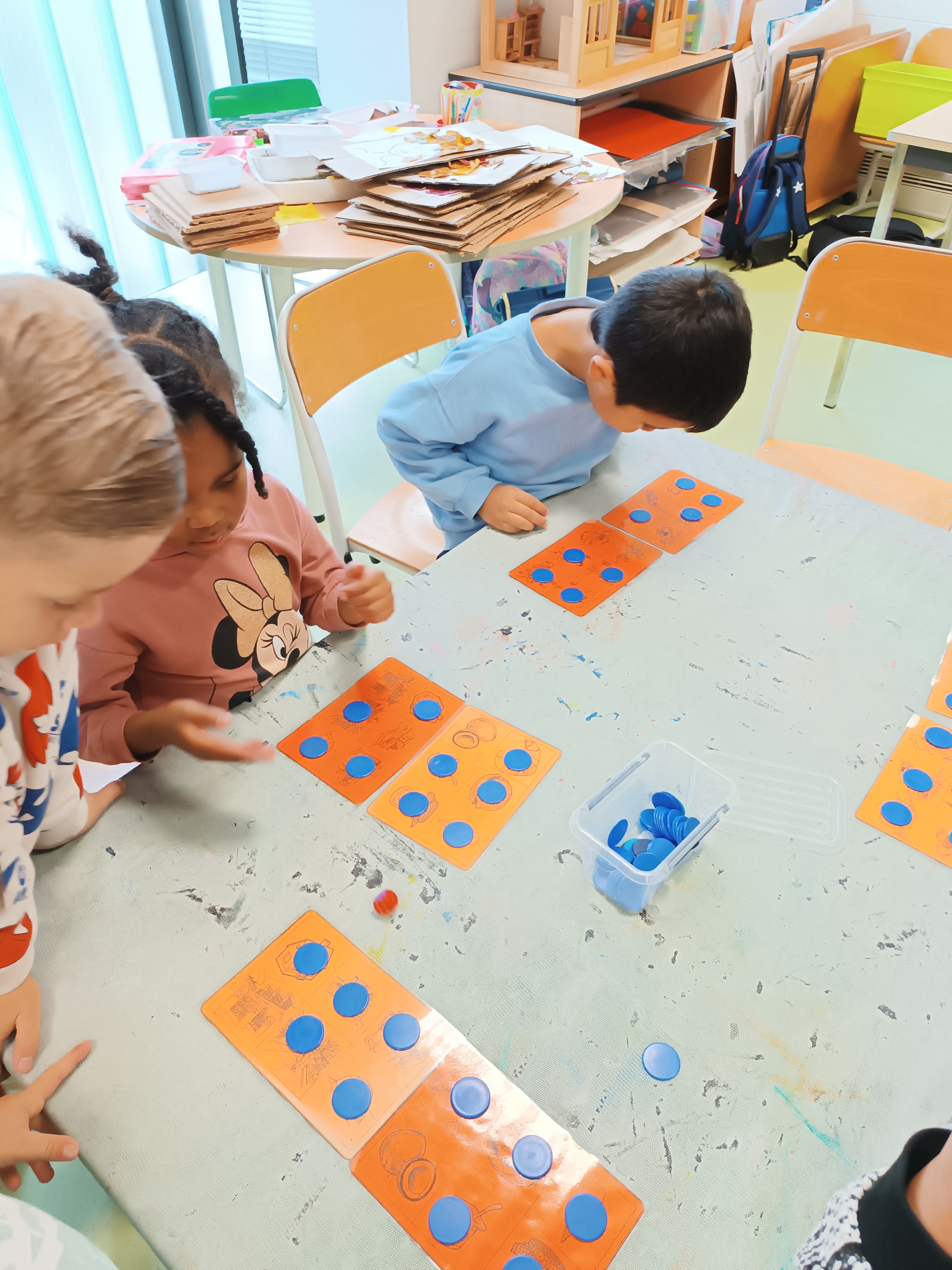 Enfin, les enfants ont joué à un jeu de loto en utilisant un dé : chacun a une ou deux planches de loto sur lesquelles se trouvent des mots-images. A son tour, l'élève lance le dé. Il doit retrouver sur sa planche, un mot qui contient le même nombre de syllabes que de points sur le dé (2 points = 2 syllabes). Le premier qui complète sa planche gagne la partie.