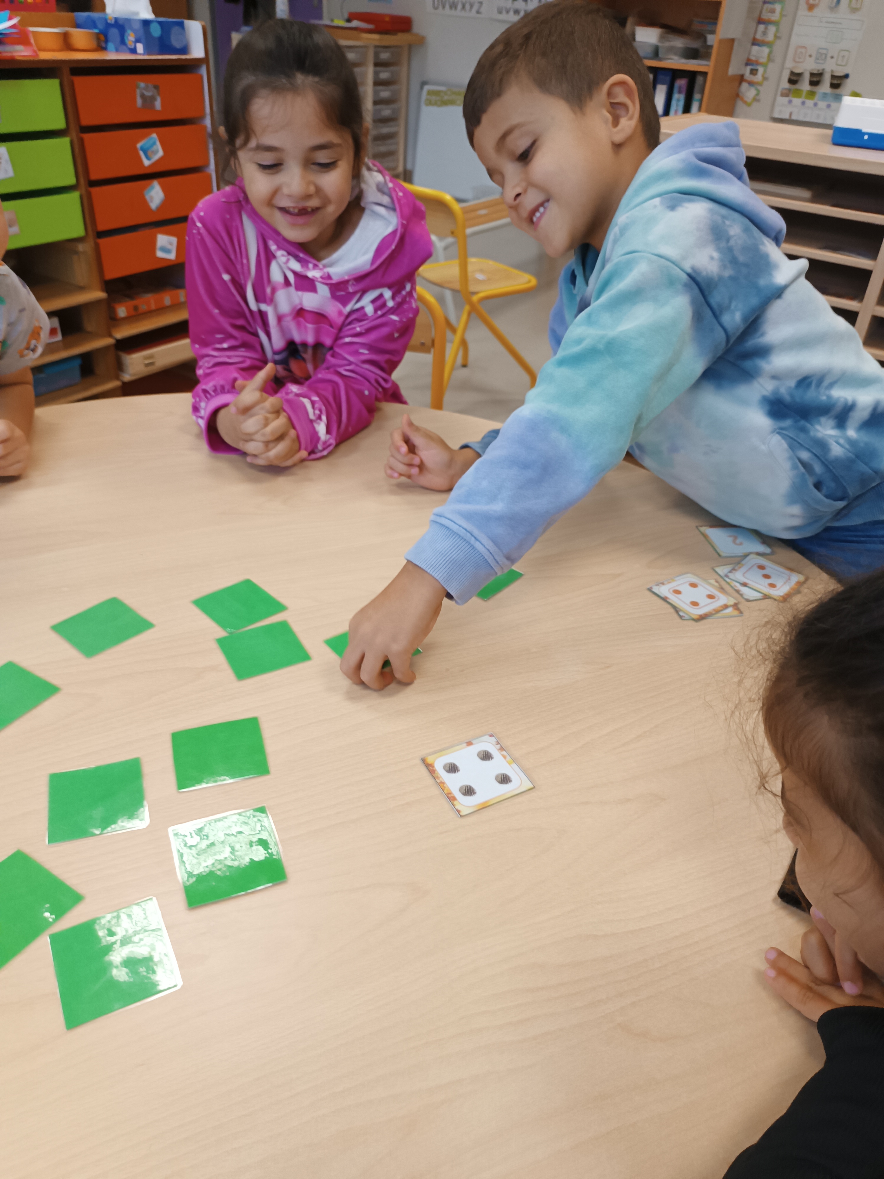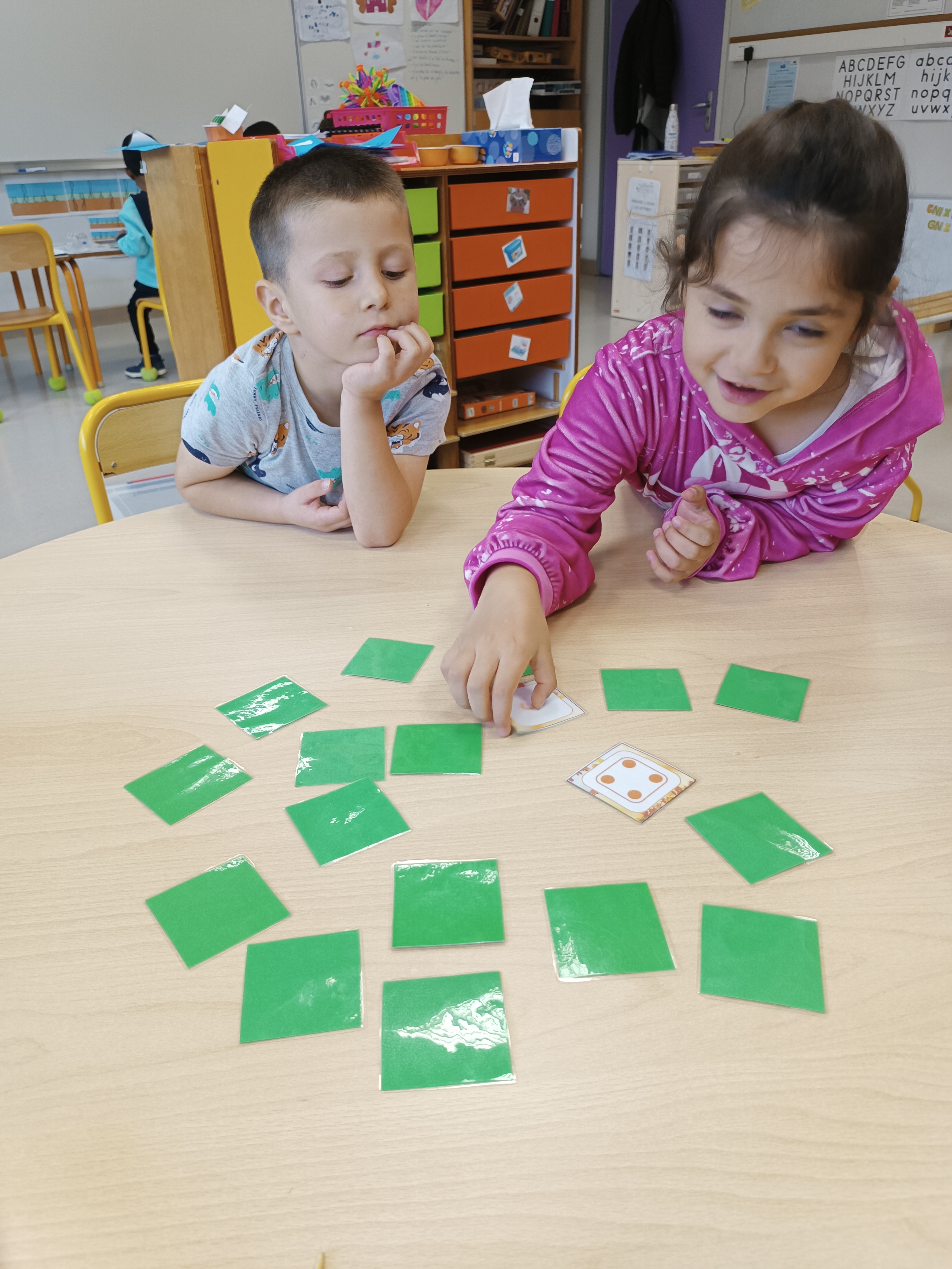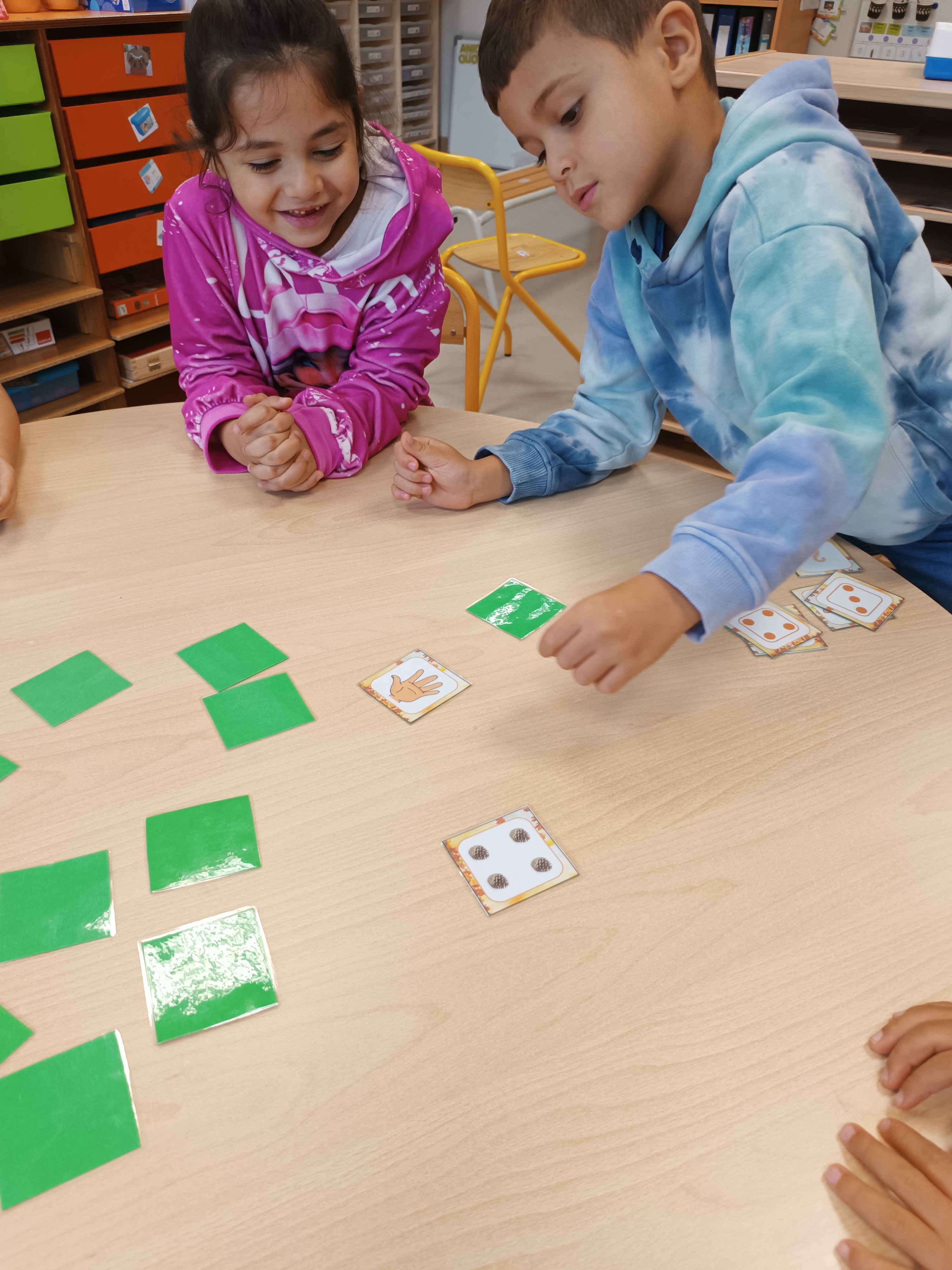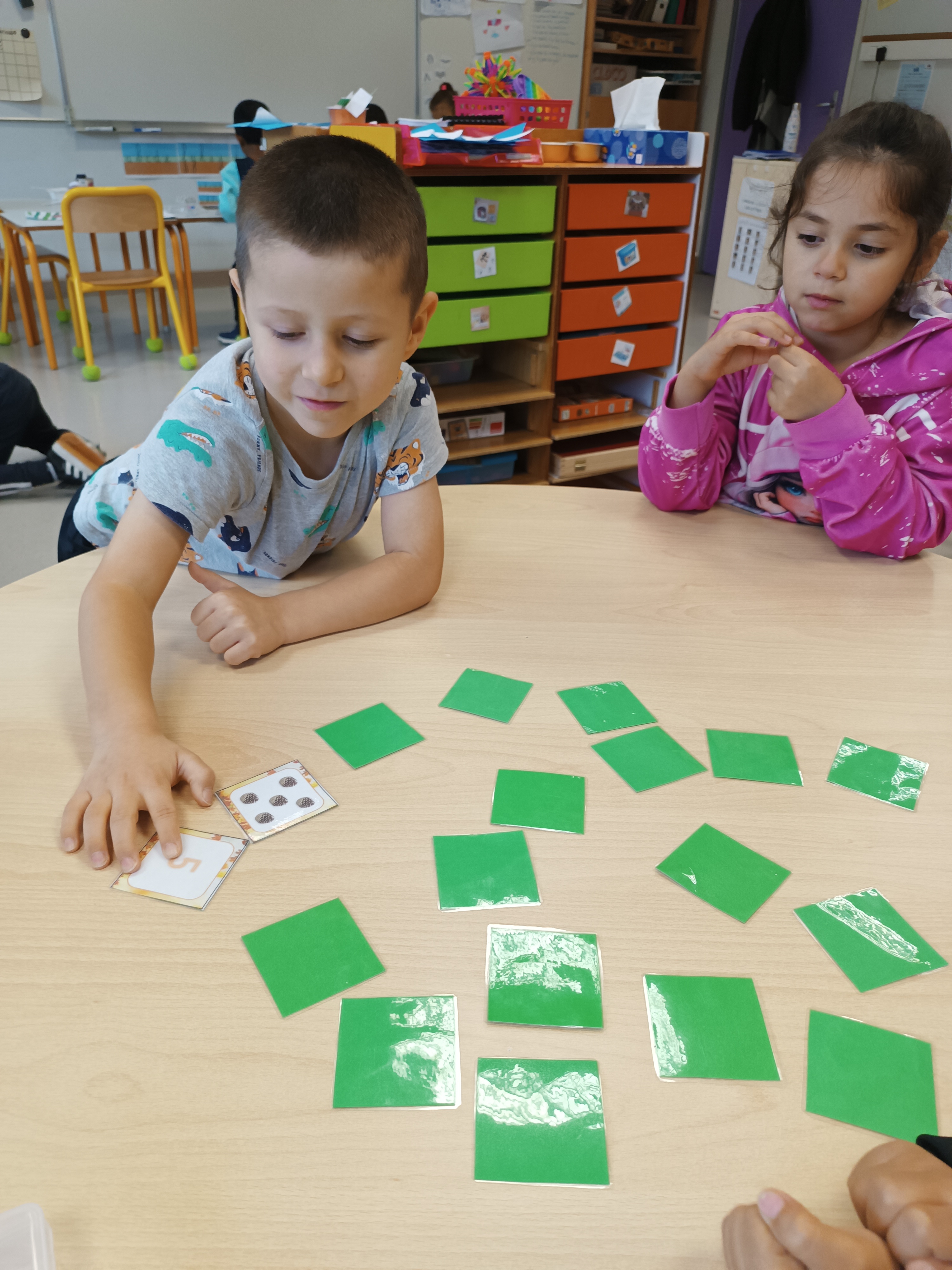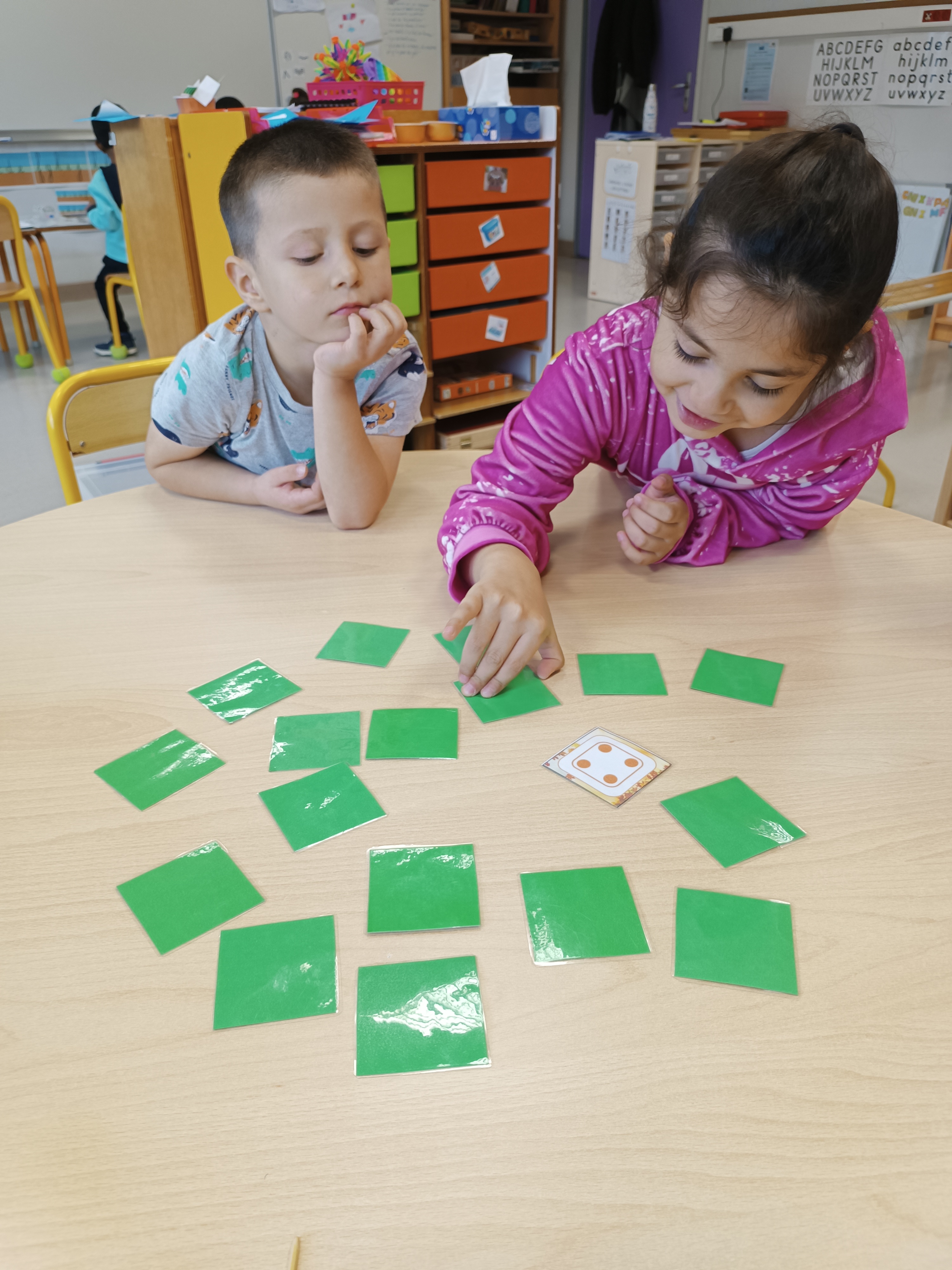 Jeu de la carte retournée : chaque élève dispose d'une boîte avec des jetons et d'une carte sur laquelle sont dessinés des points. Après observation et/ou comptage, ils doivent retourner la carte et prendre autant de jetons que de points dessinés sur la carte. La vérification se fait en déposant les jetons sur les points.