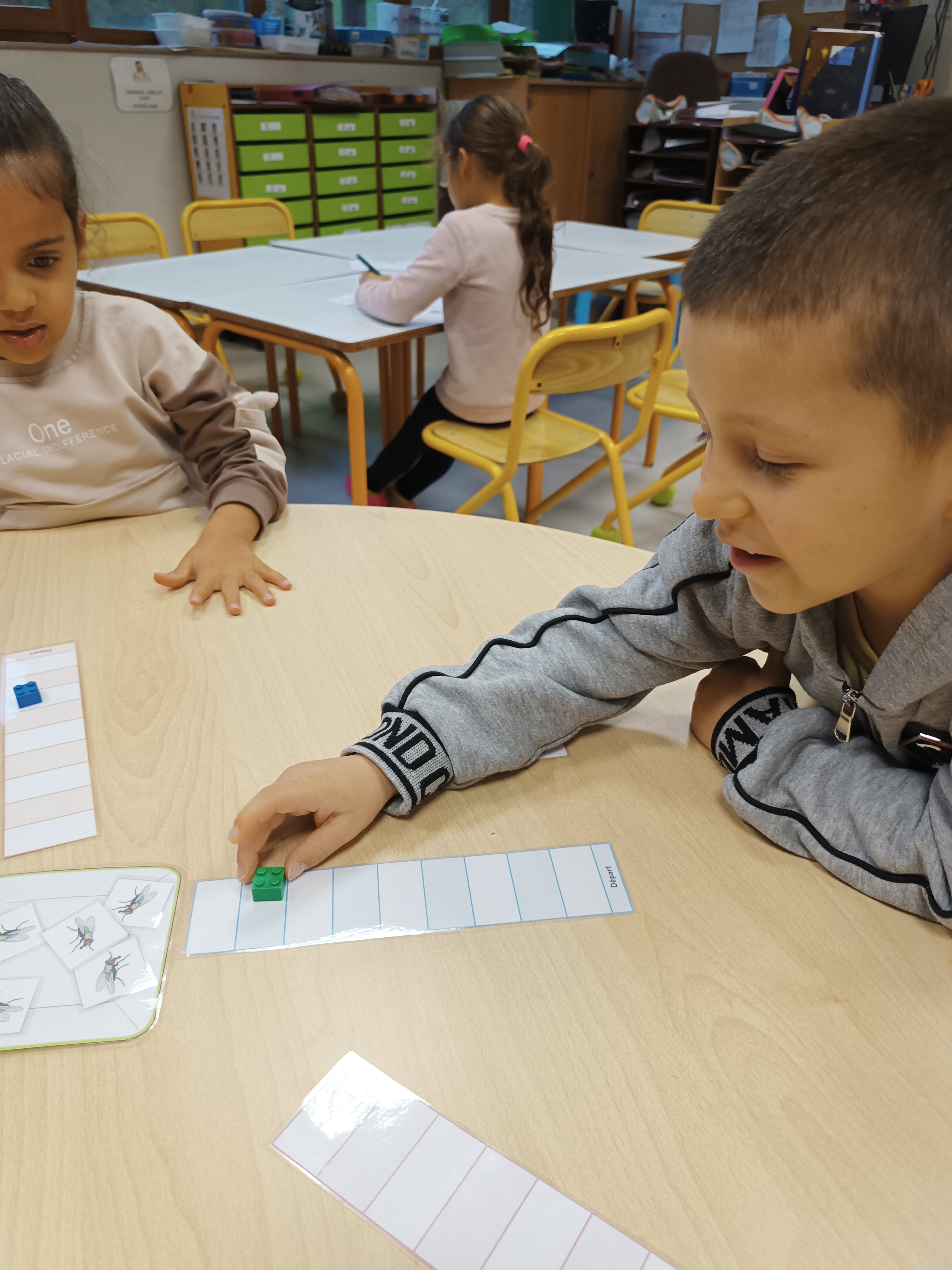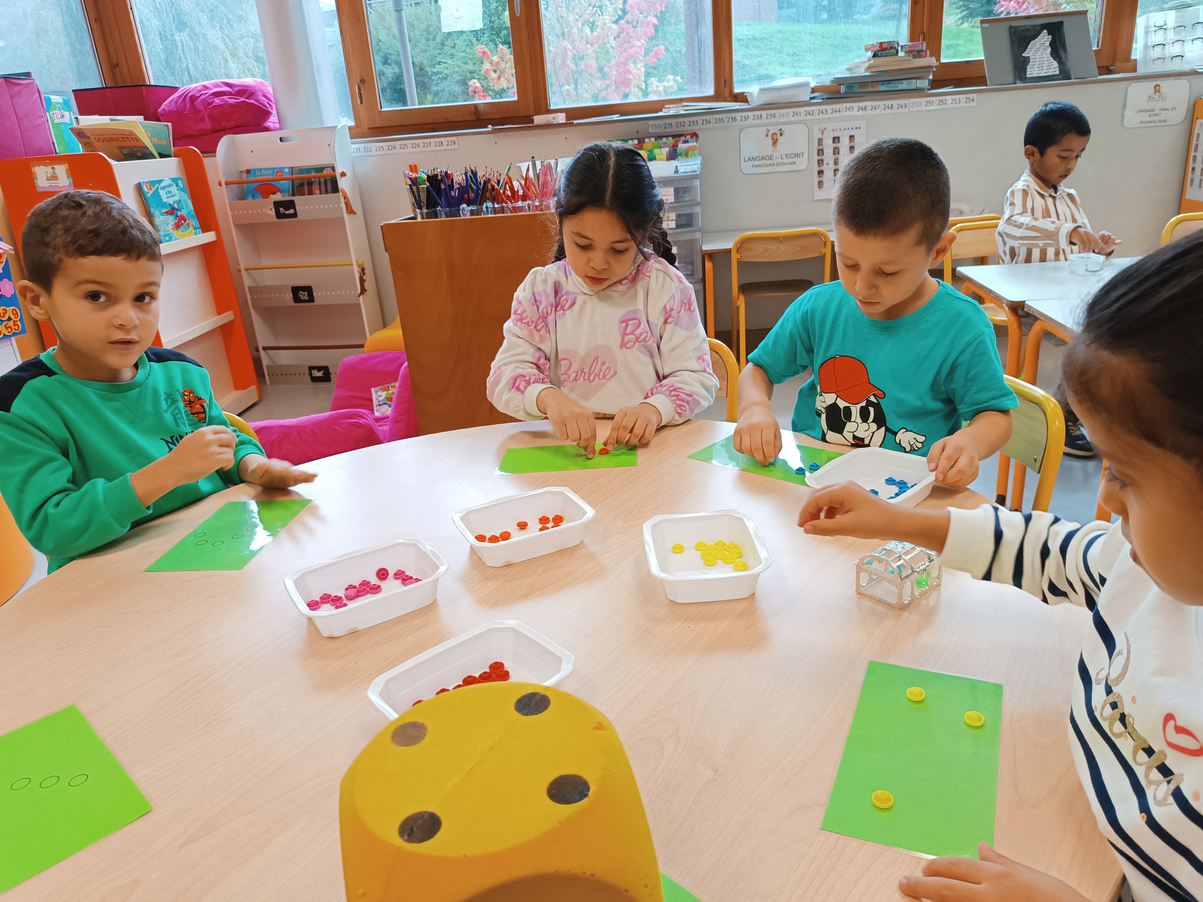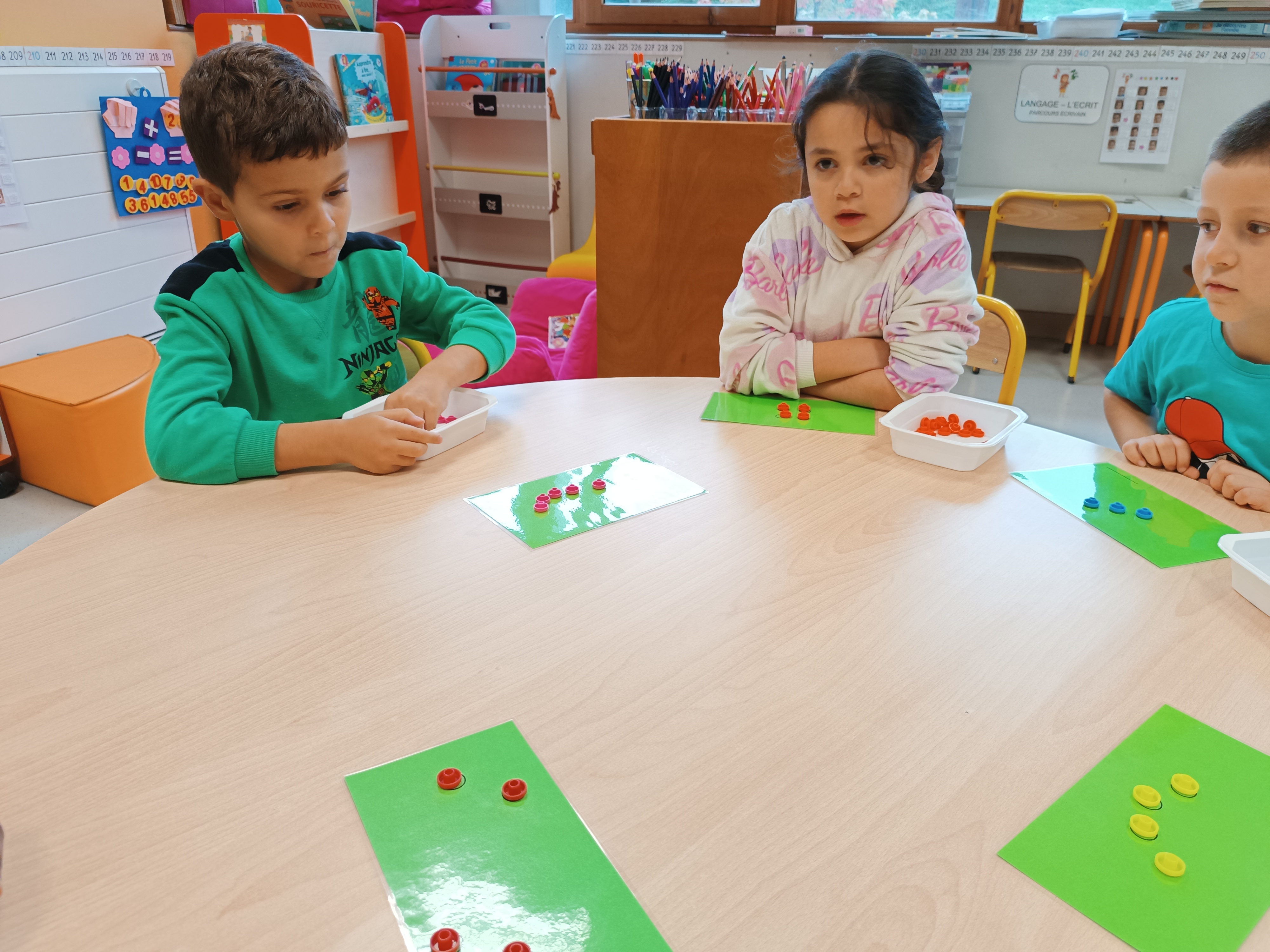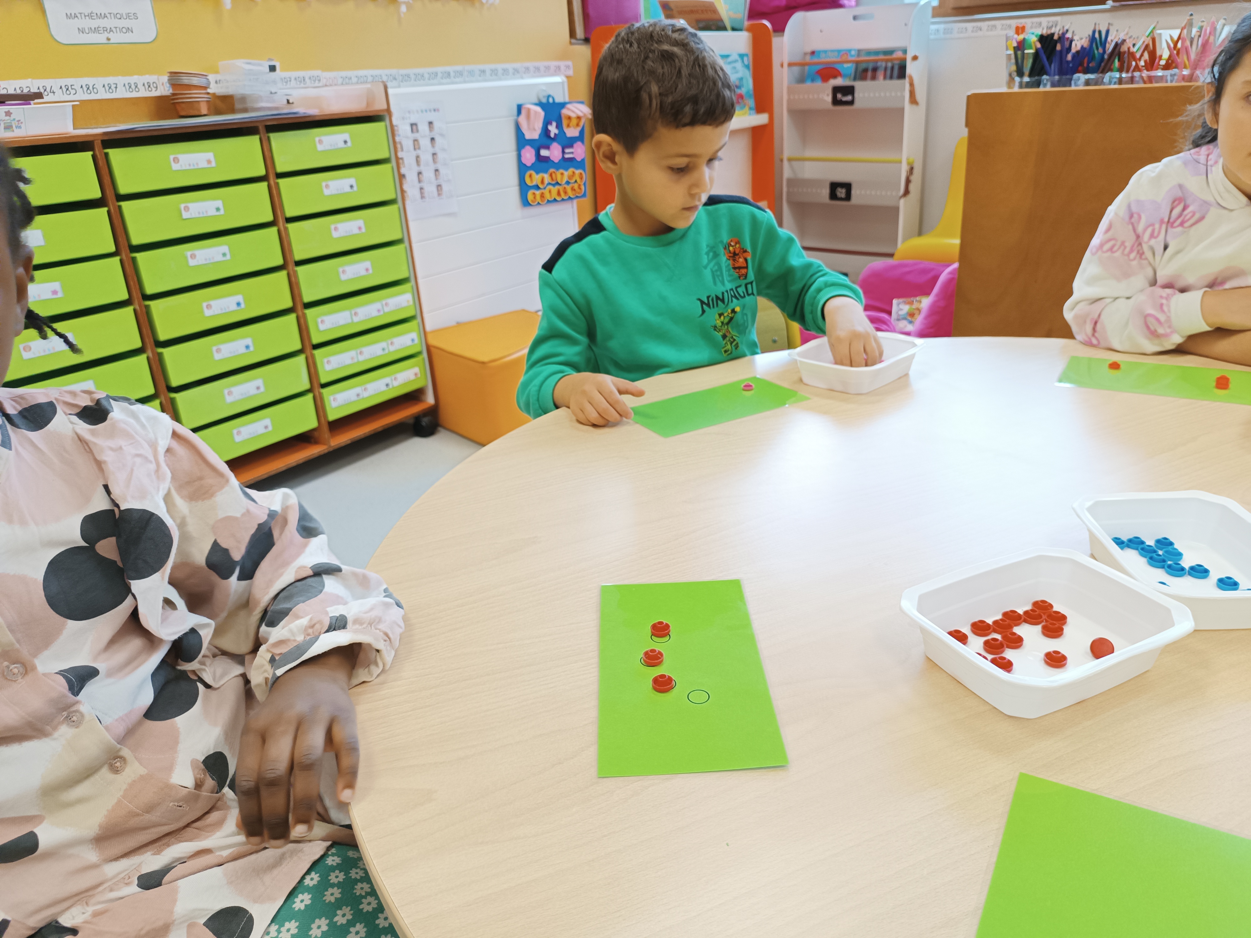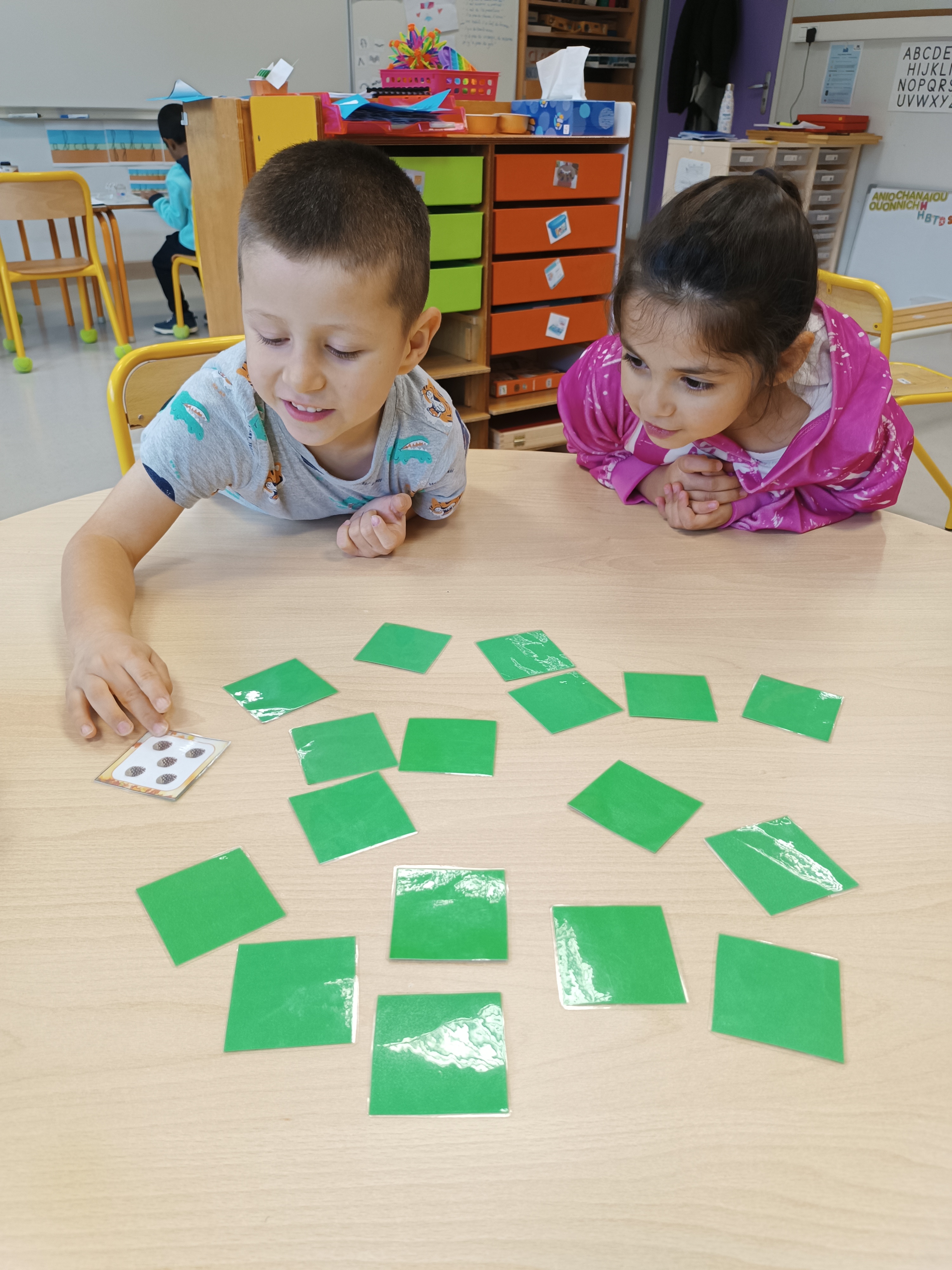 Jeu de la carte retournée : chaque élève dispose d'une boîte avec des jetons et d'une carte sur laquelle sont dessinés des points. Après observation et/ou comptage, ils doivent retourner la carte et prendre autant de jetons que de points dessinés sur la carte. La vérification se fait en déposant les jetons sur les points.