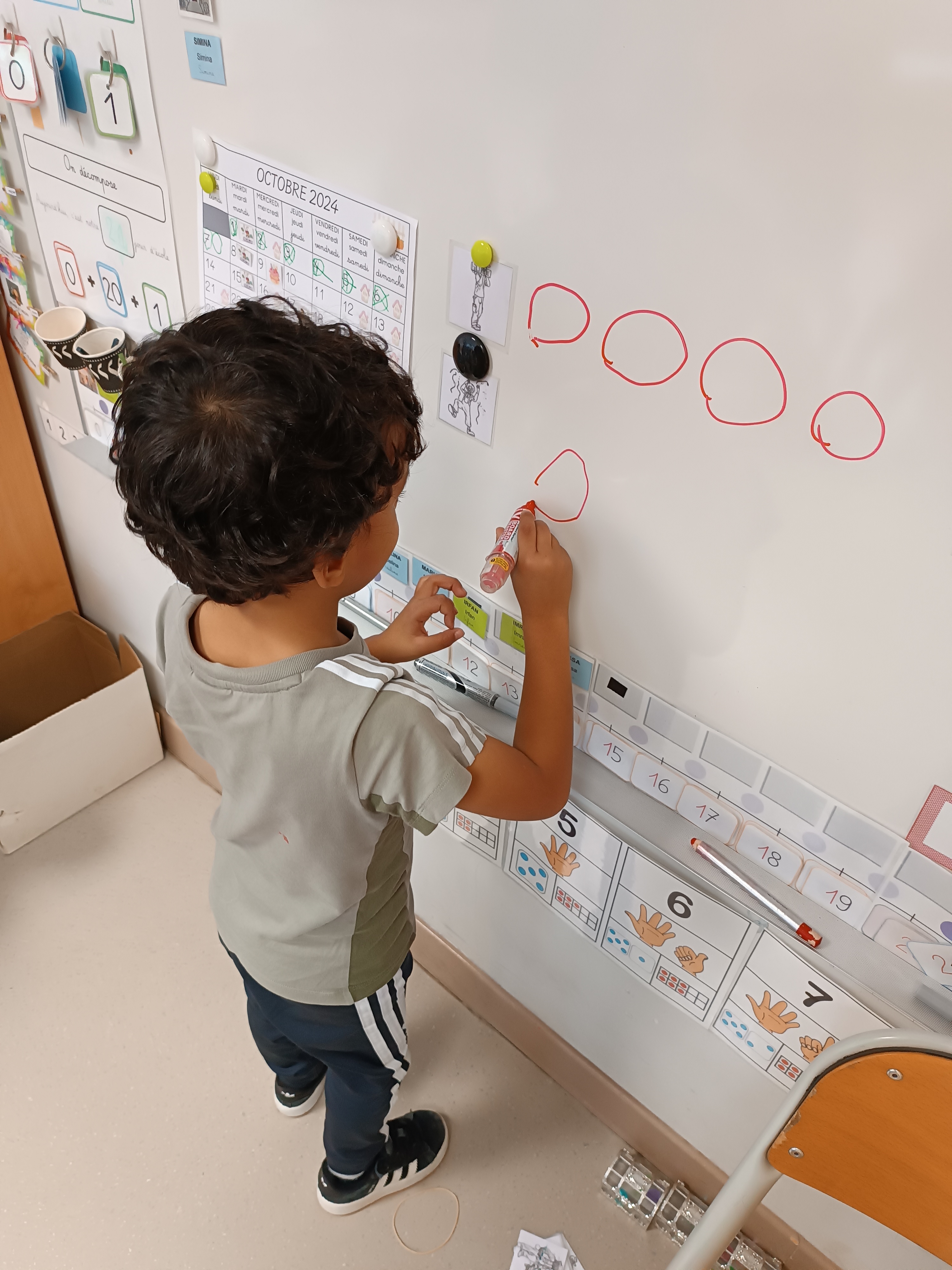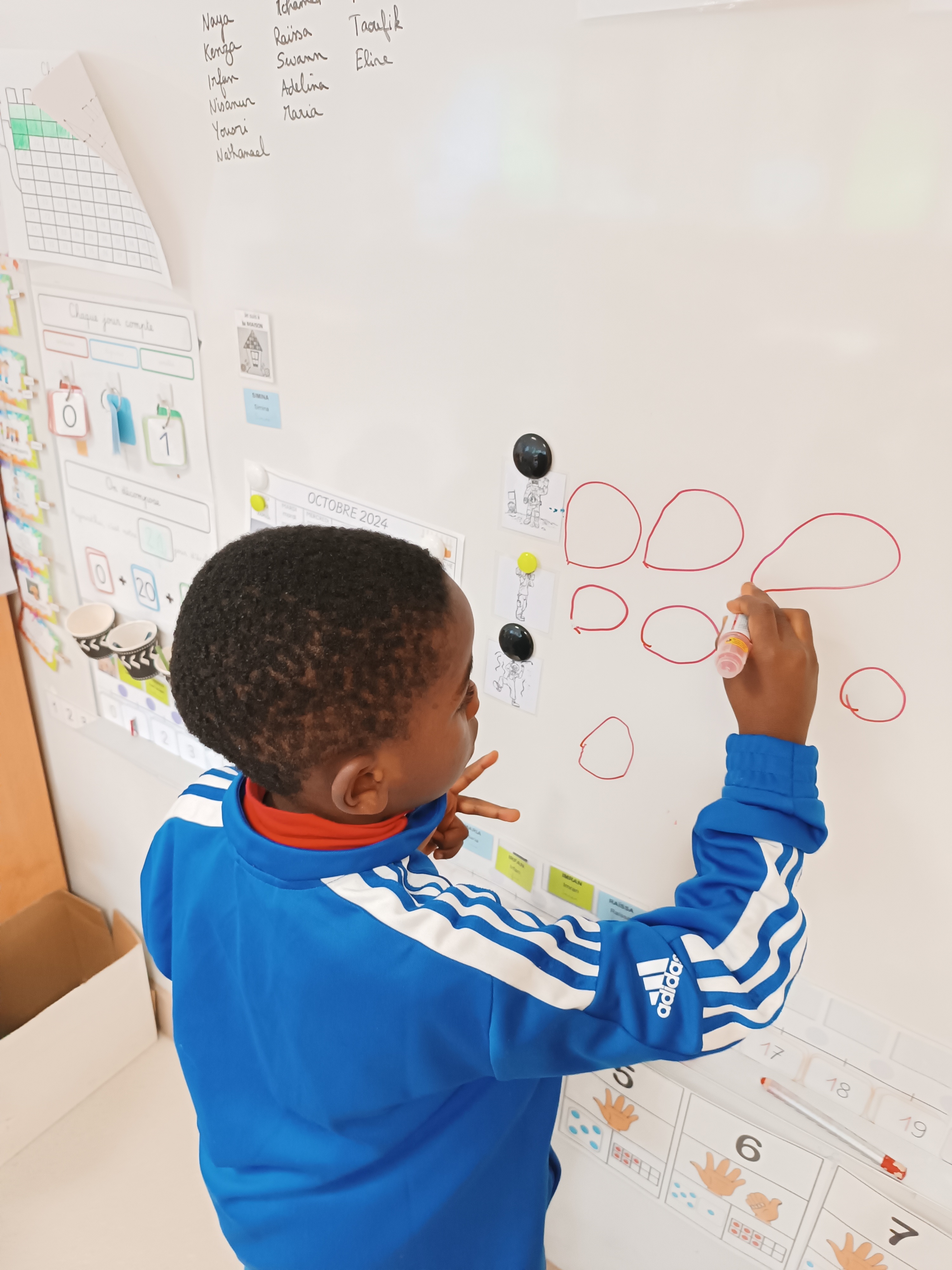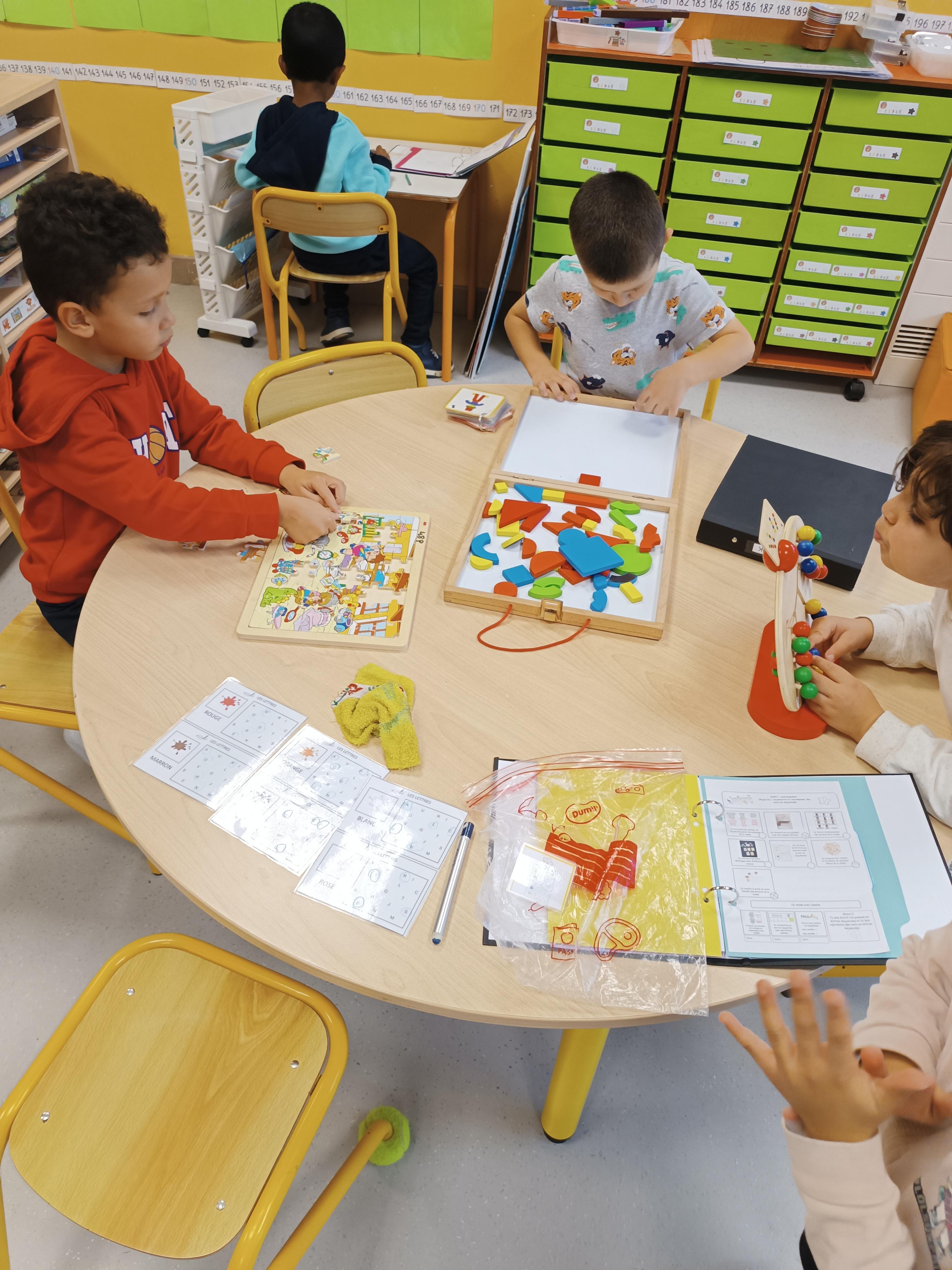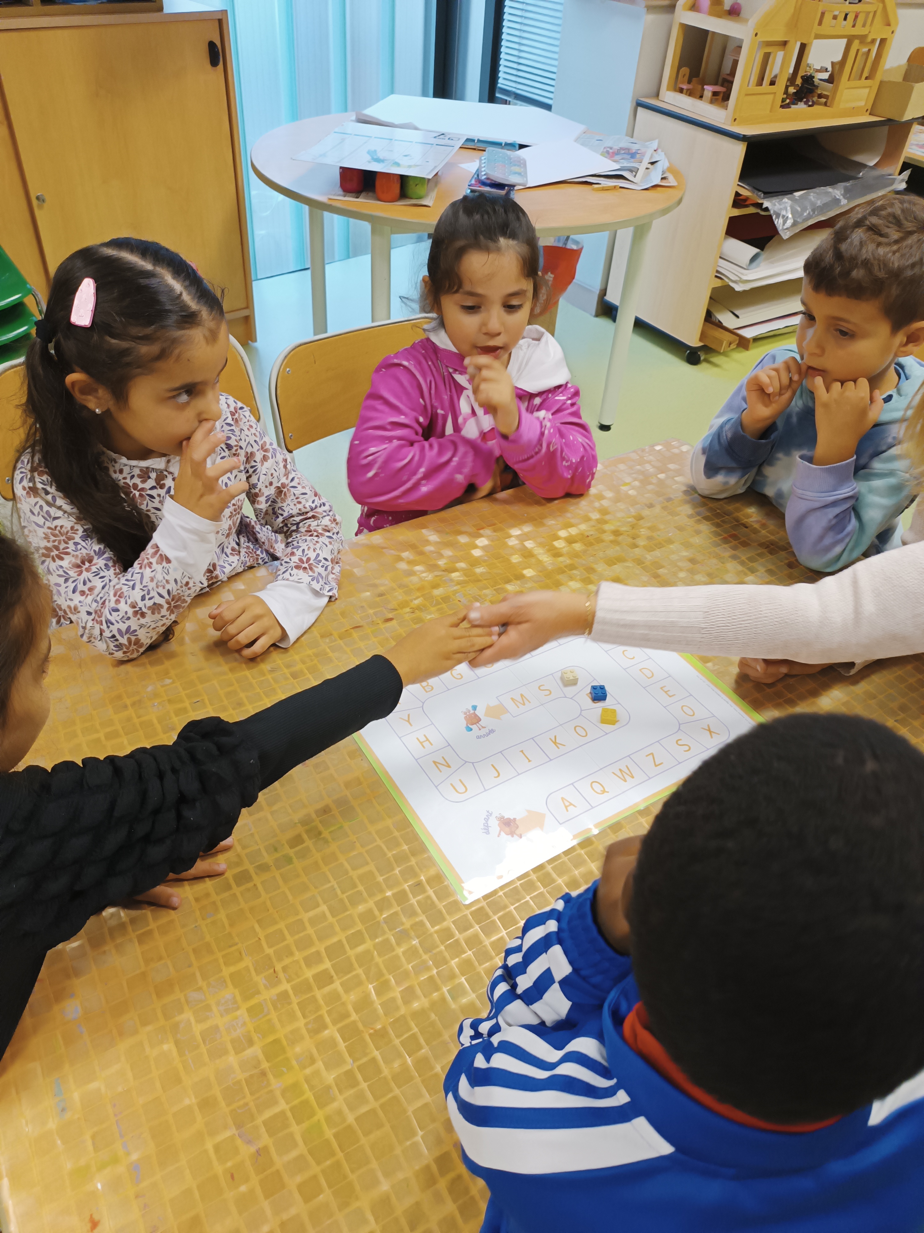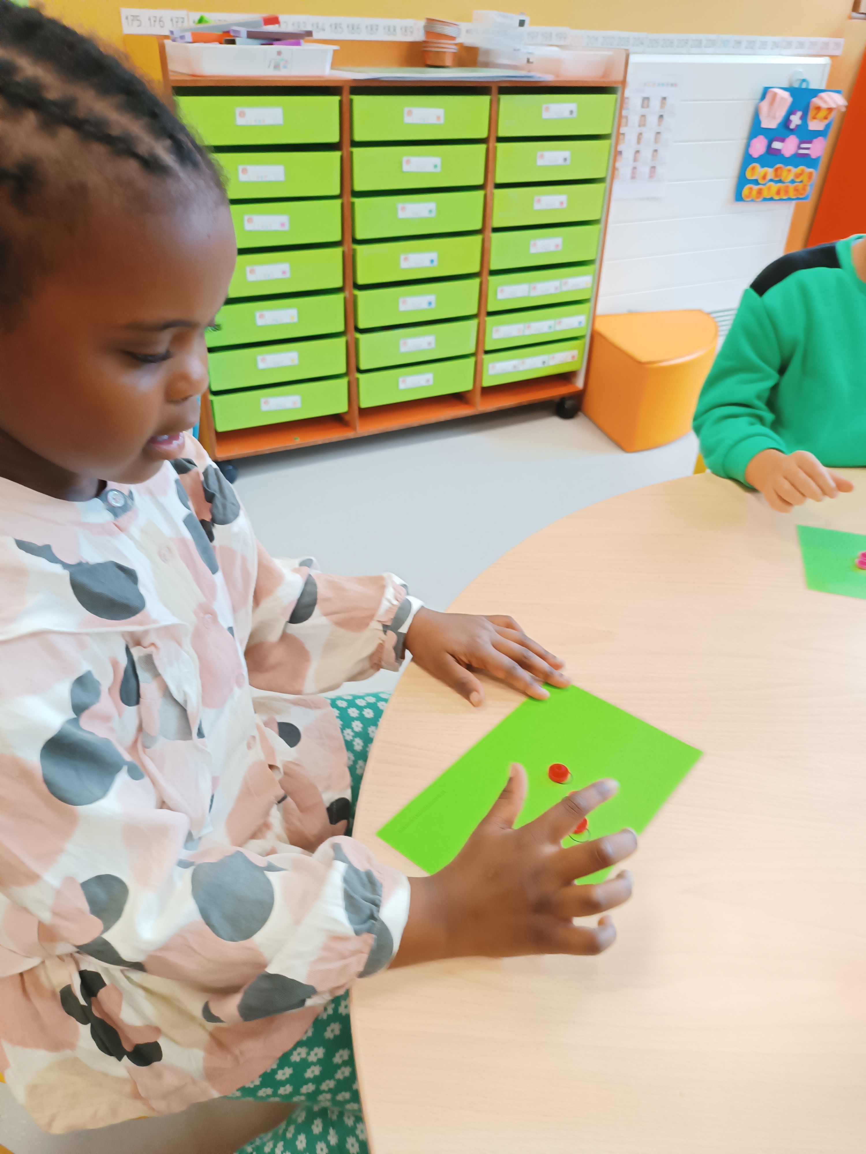 Jeu de la carte retournée : chaque élève dispose d'une boîte avec des jetons et d'une carte sur laquelle sont dessinés des points. Après observation et/ou comptage, ils doivent retourner la carte et prendre autant de jetons que de points dessinés sur la carte. La vérification se fait en déposant les jetons sur les points.