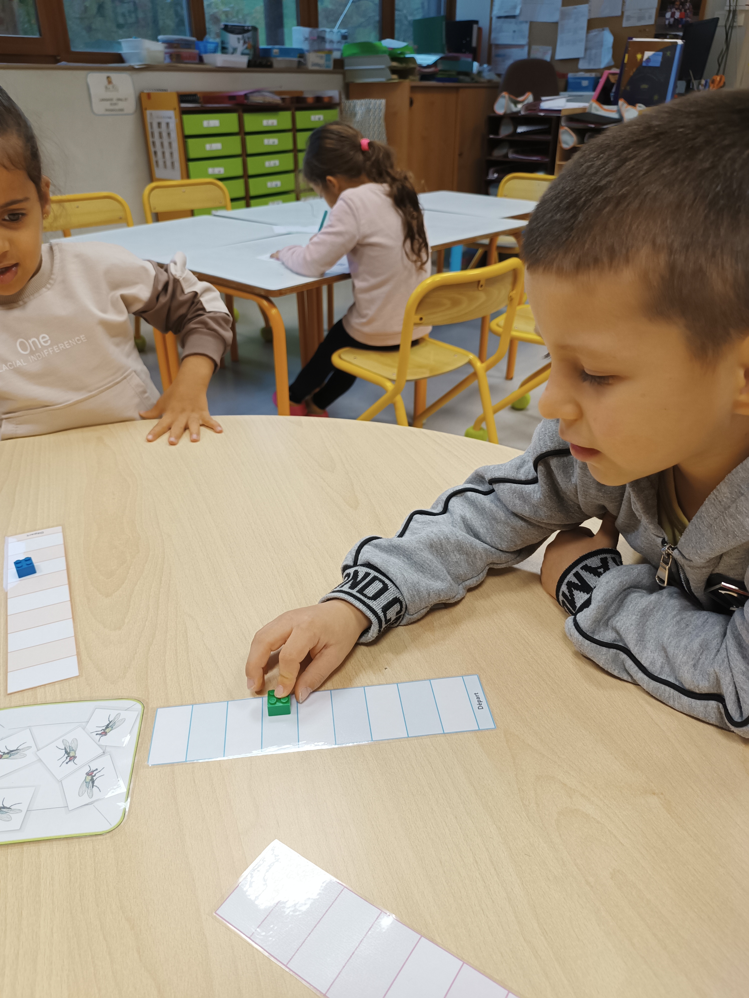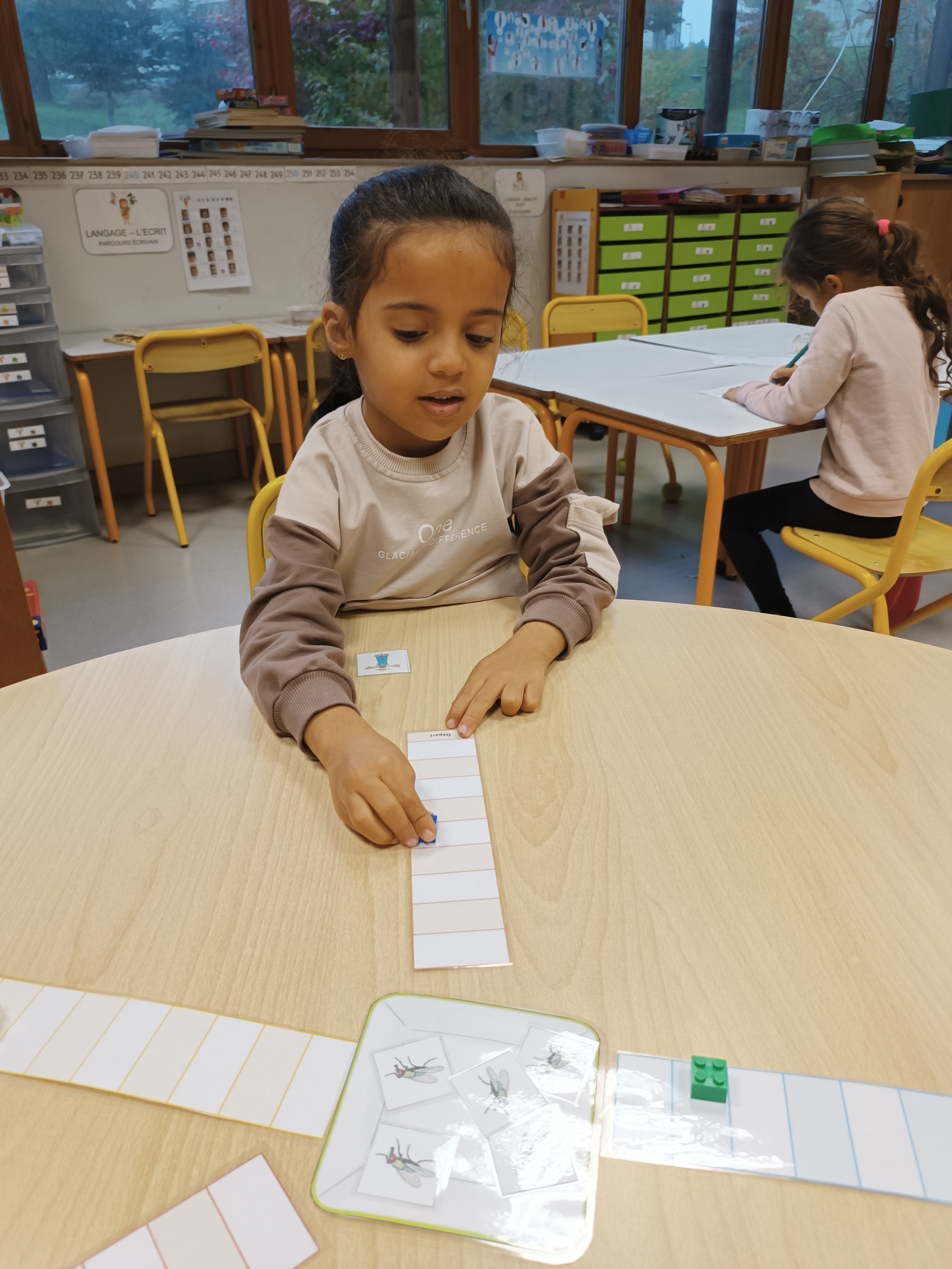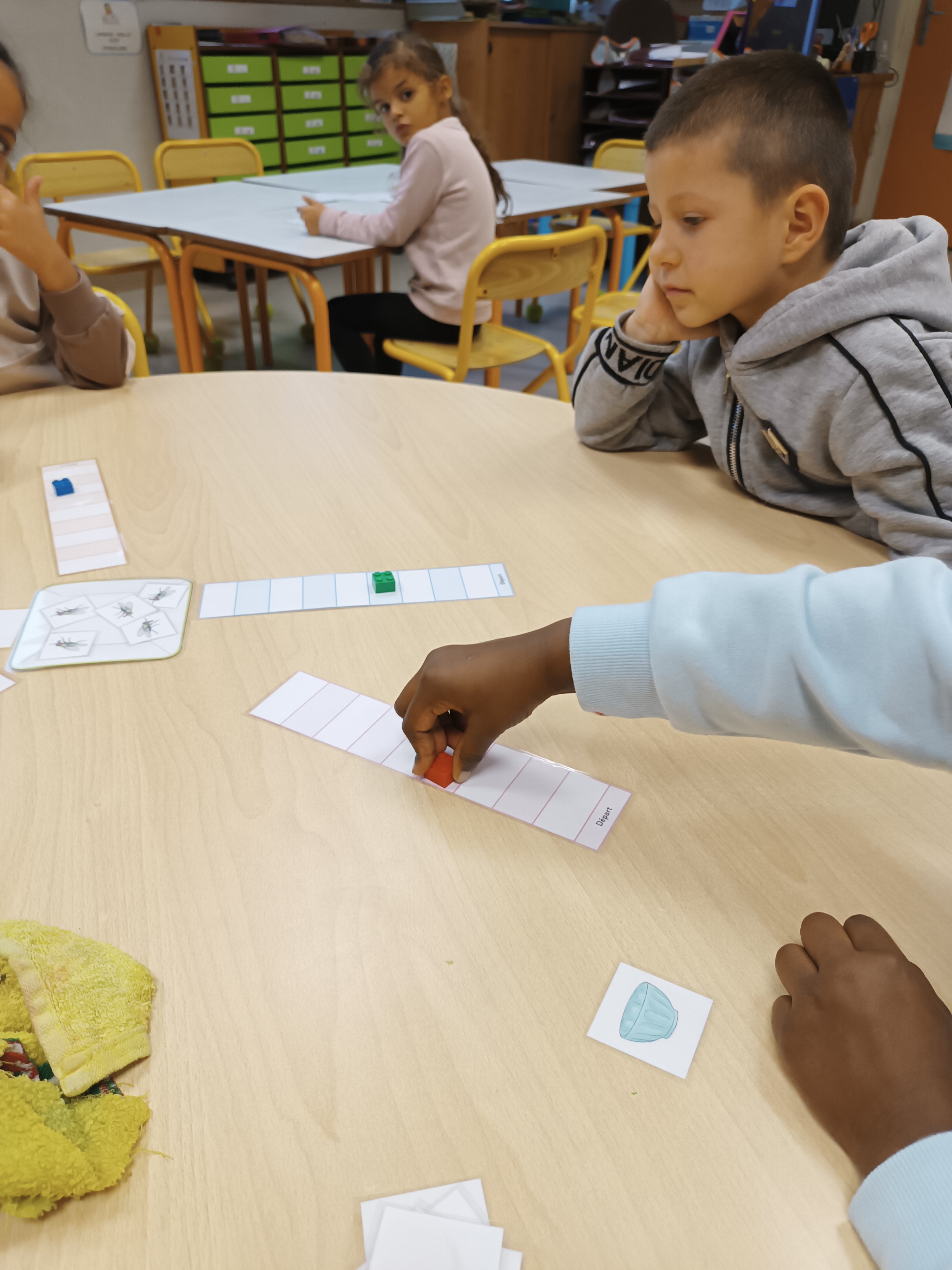 Compter les syllabes d'un mot : le jeu des échelles. Il faut être le 1er à atteindre l'assiette pour manger les mouches (nous sommes des caméléons) : pour cela, il faut piocher un mot-image et monter à l'échelle du nombre de syllabes (2 syllabes, je monte de 2 cases)