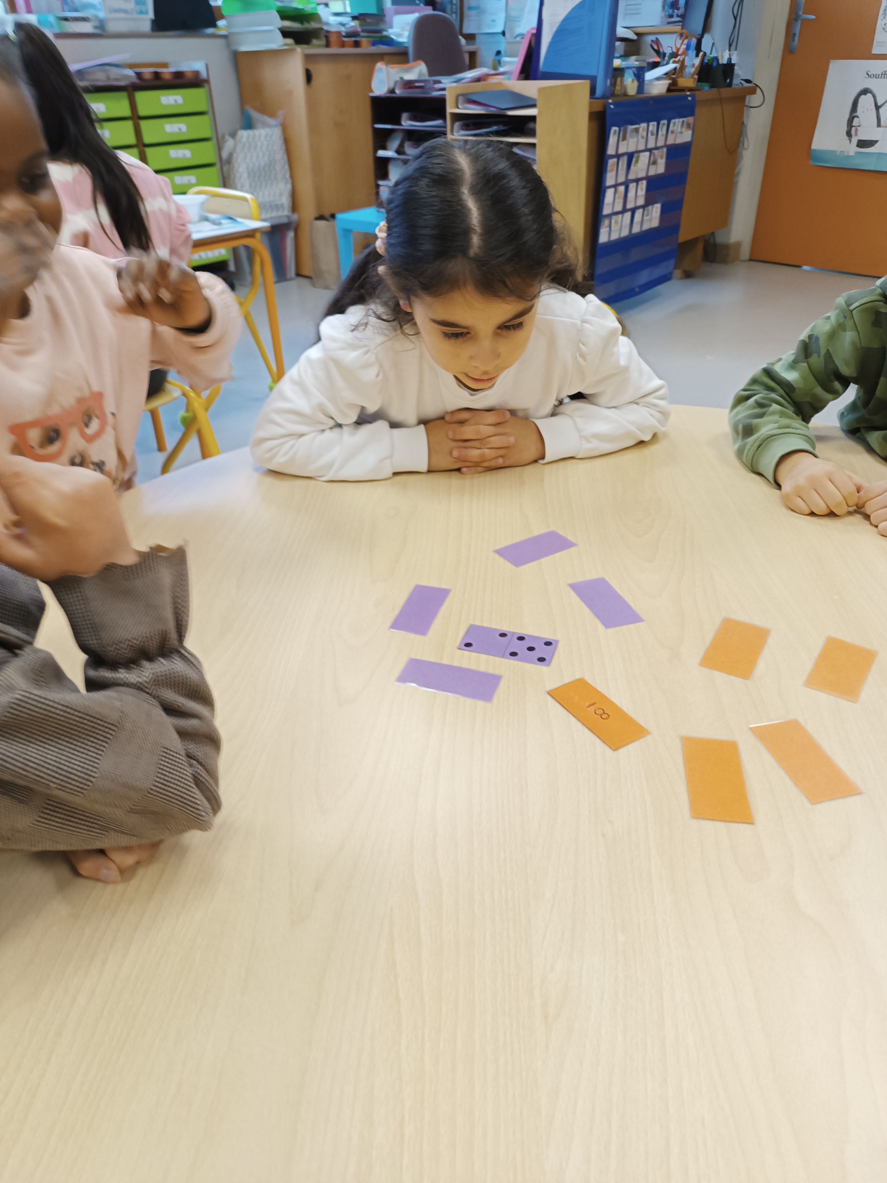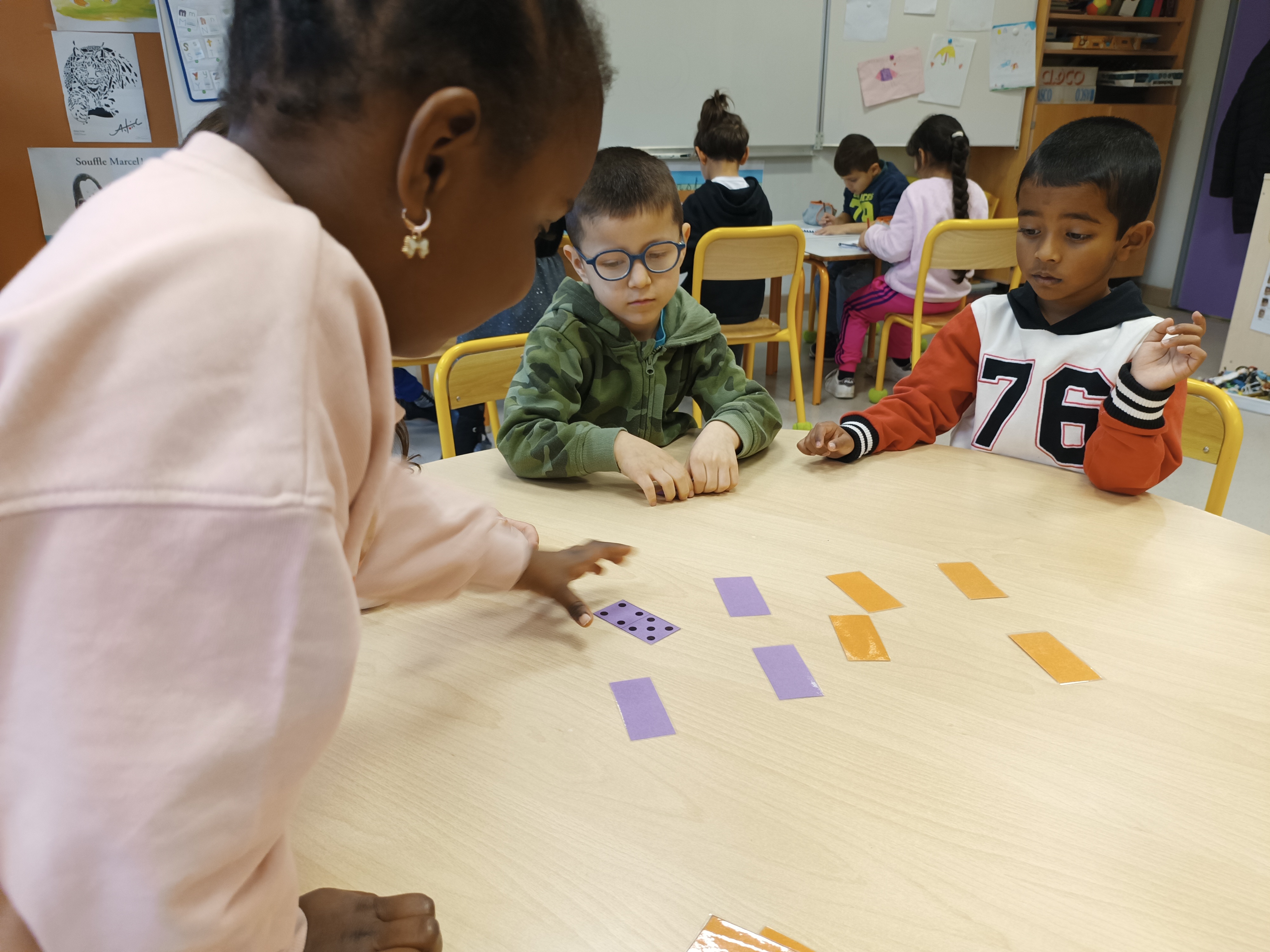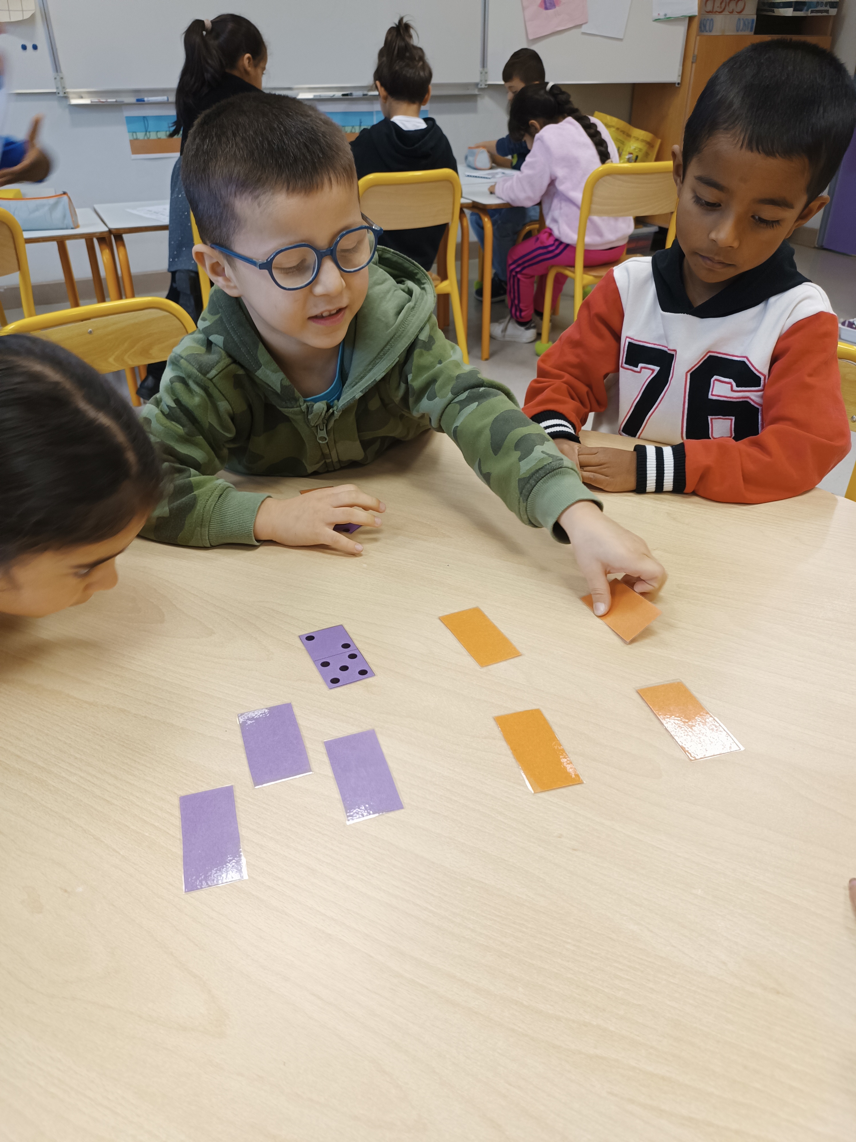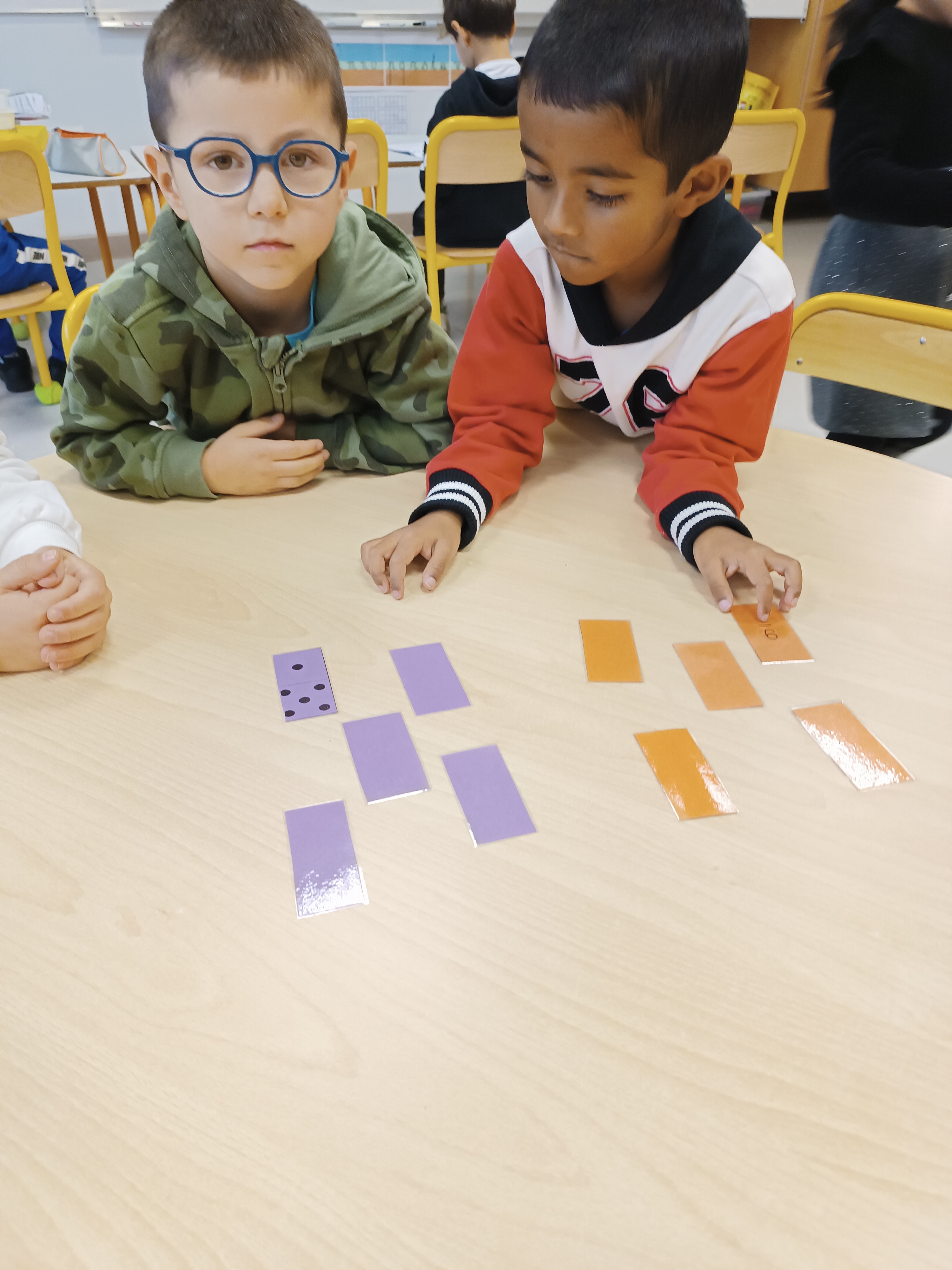 Après avoir appris que les nombres de 6 à 10 se construisaient à partir du 5, nous avons fait un jeu de memory où il fallait associer l'écriture chiffrée à sa représentation avec les constellations du dé, construites à partir du 5.