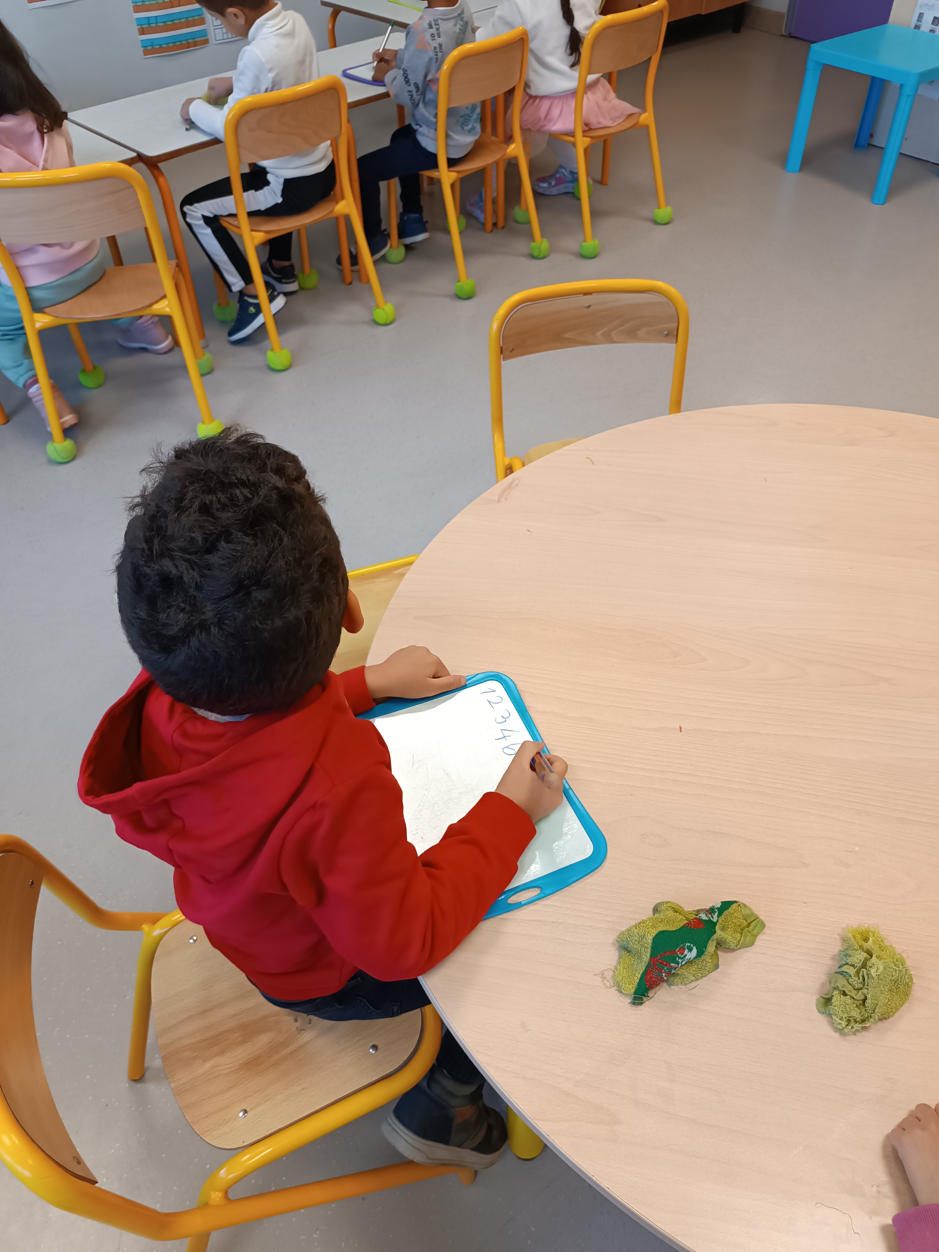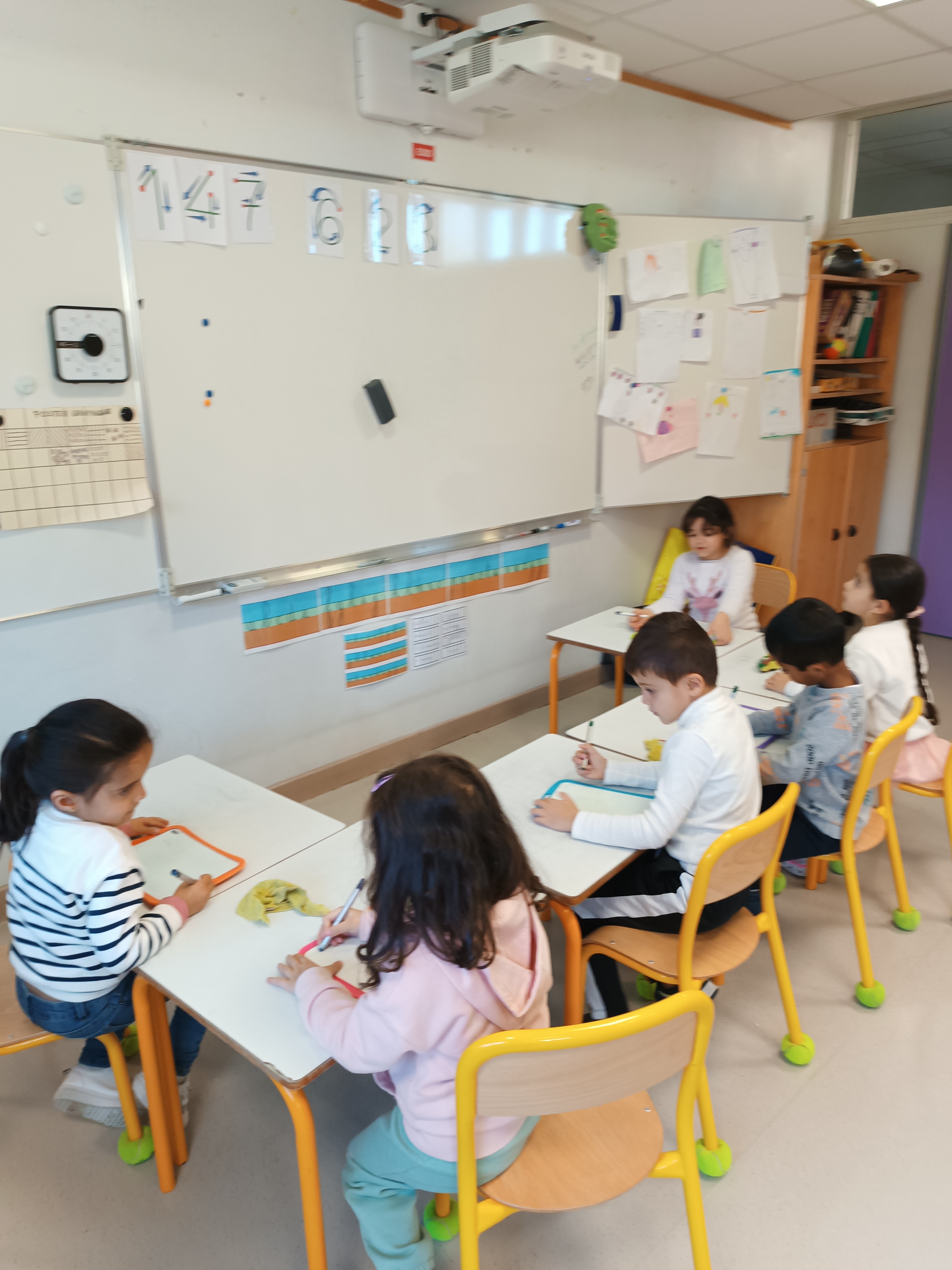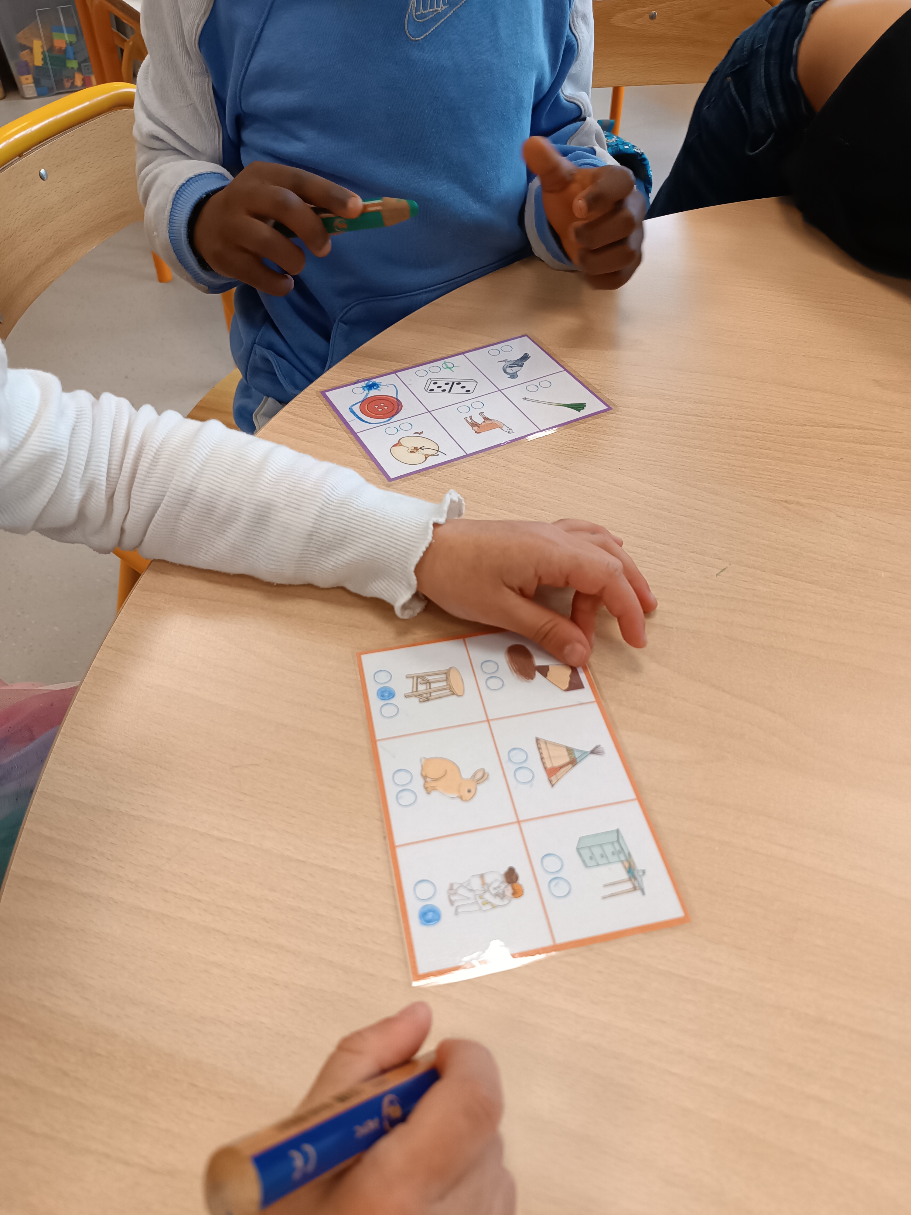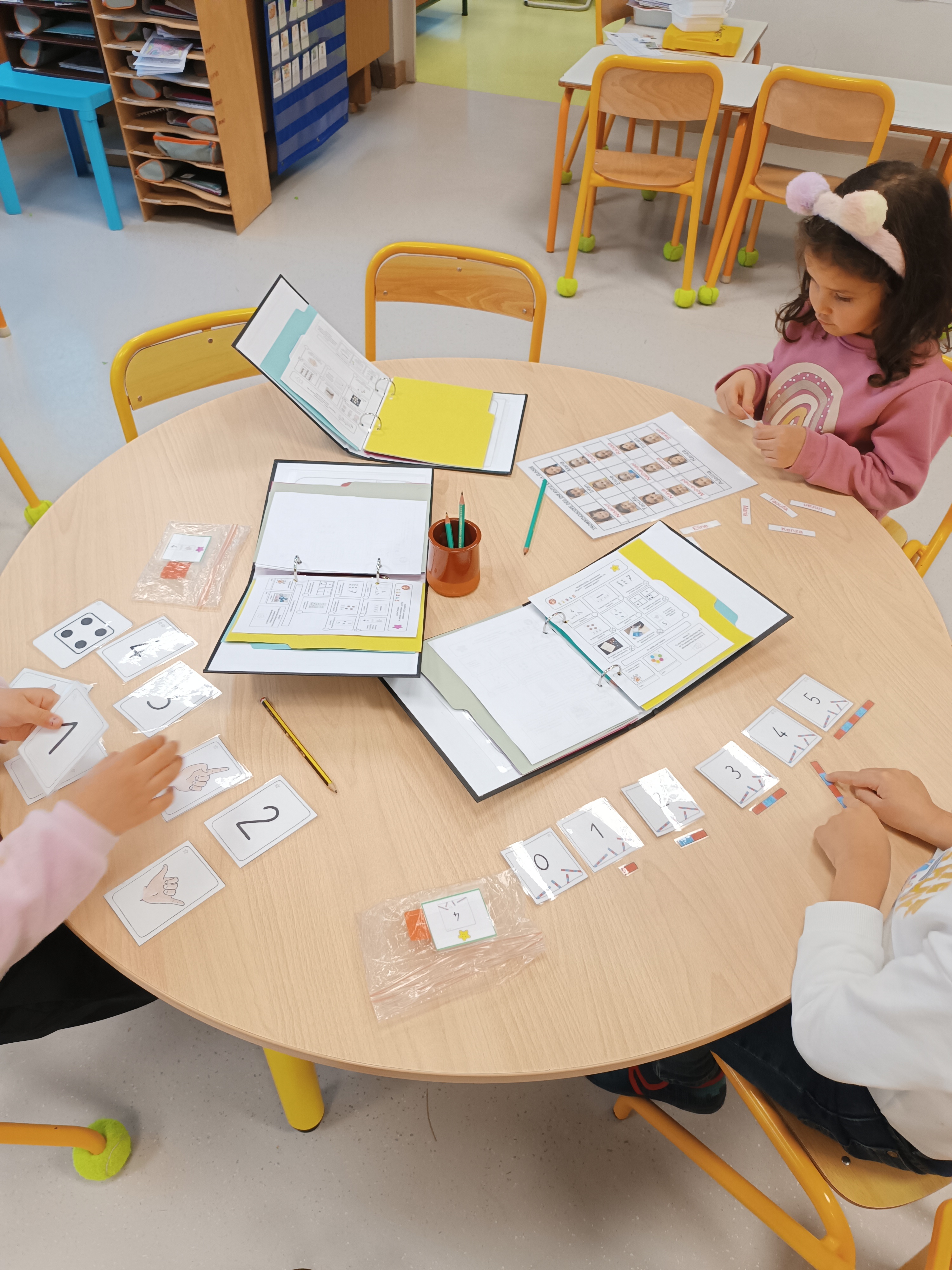 Après avoir appris que les nombres de 6 à 10 se construisaient à partir du 5, nous avons fait un jeu de memory où il fallait associer l'écriture chiffrée à sa représentation avec les constellations du dé, construites à partir du 5.
