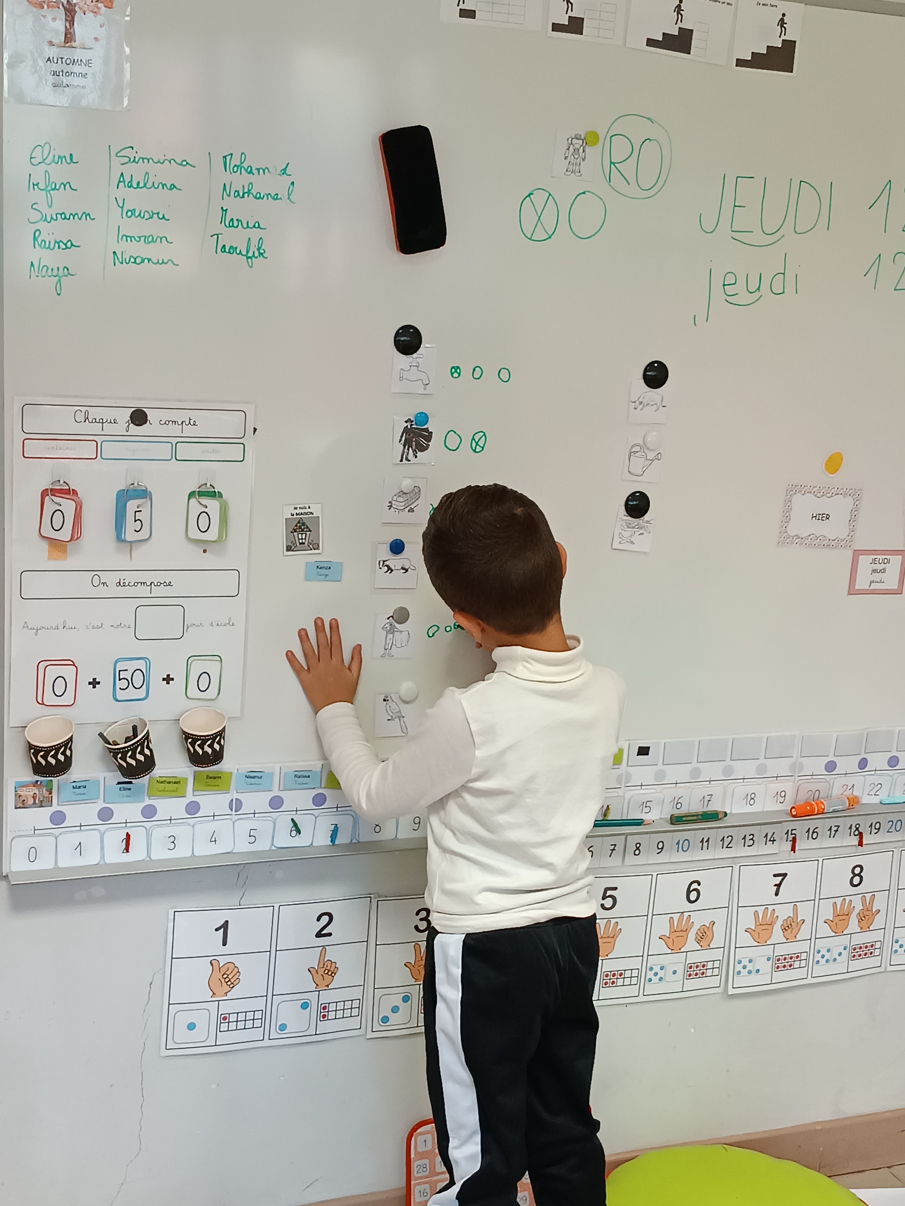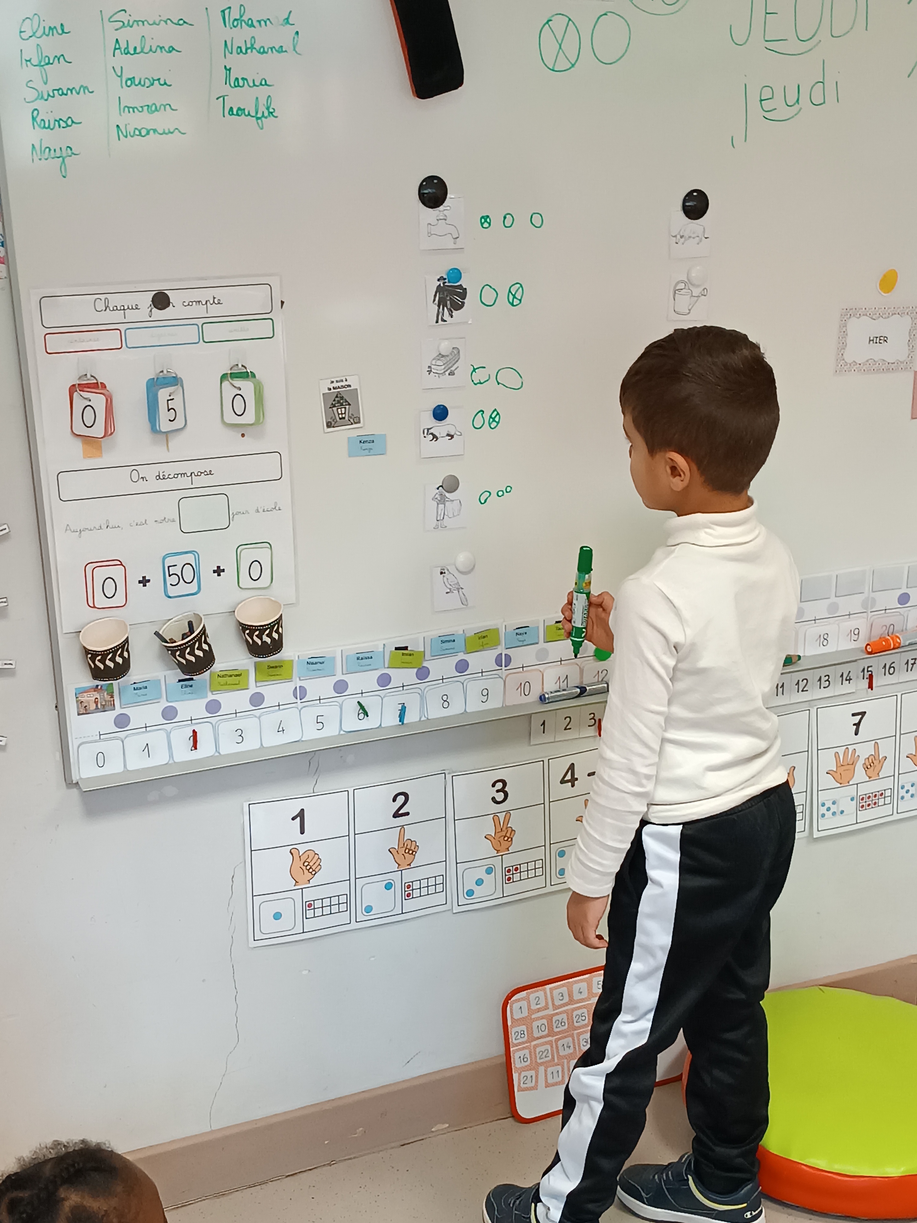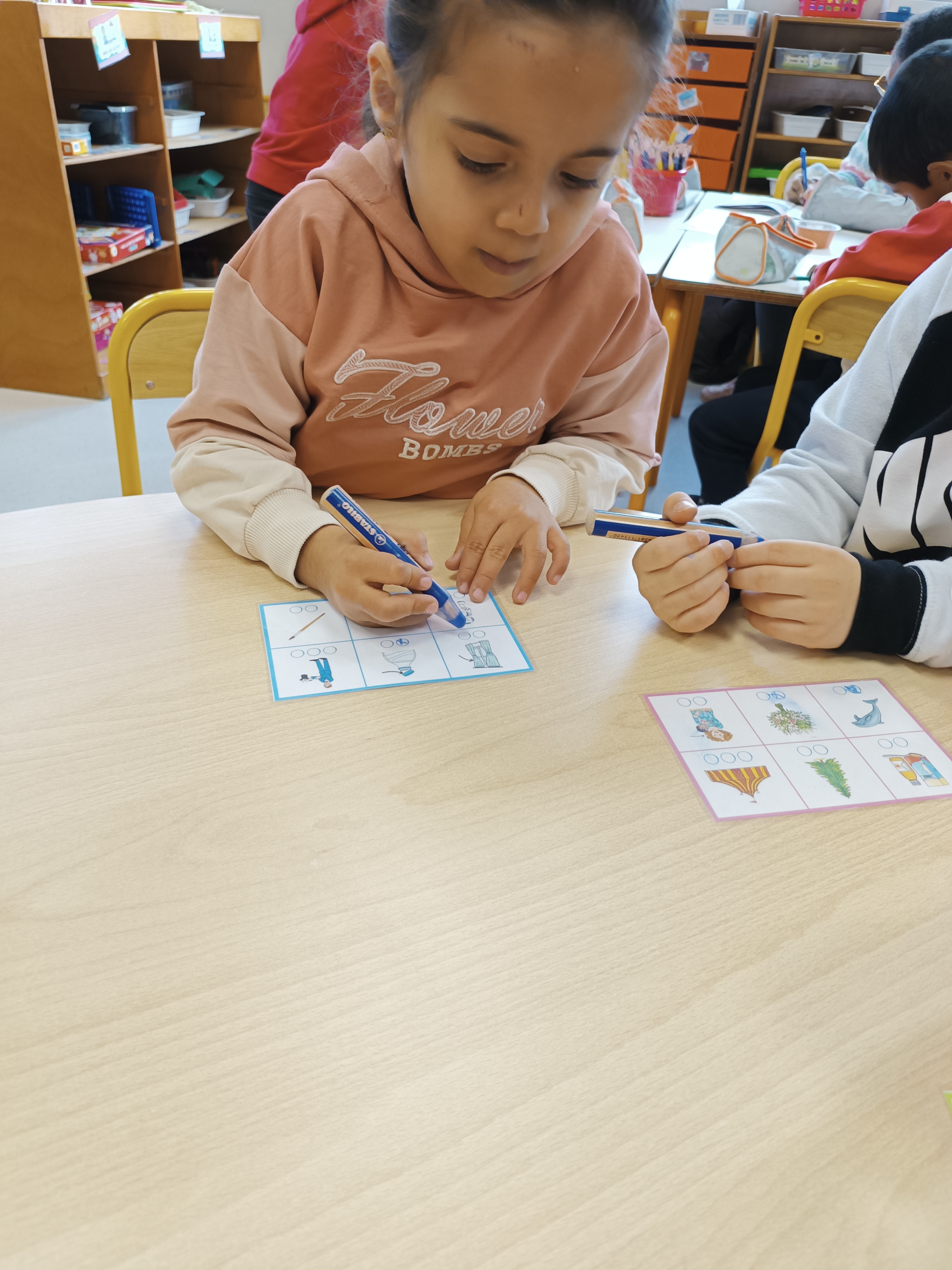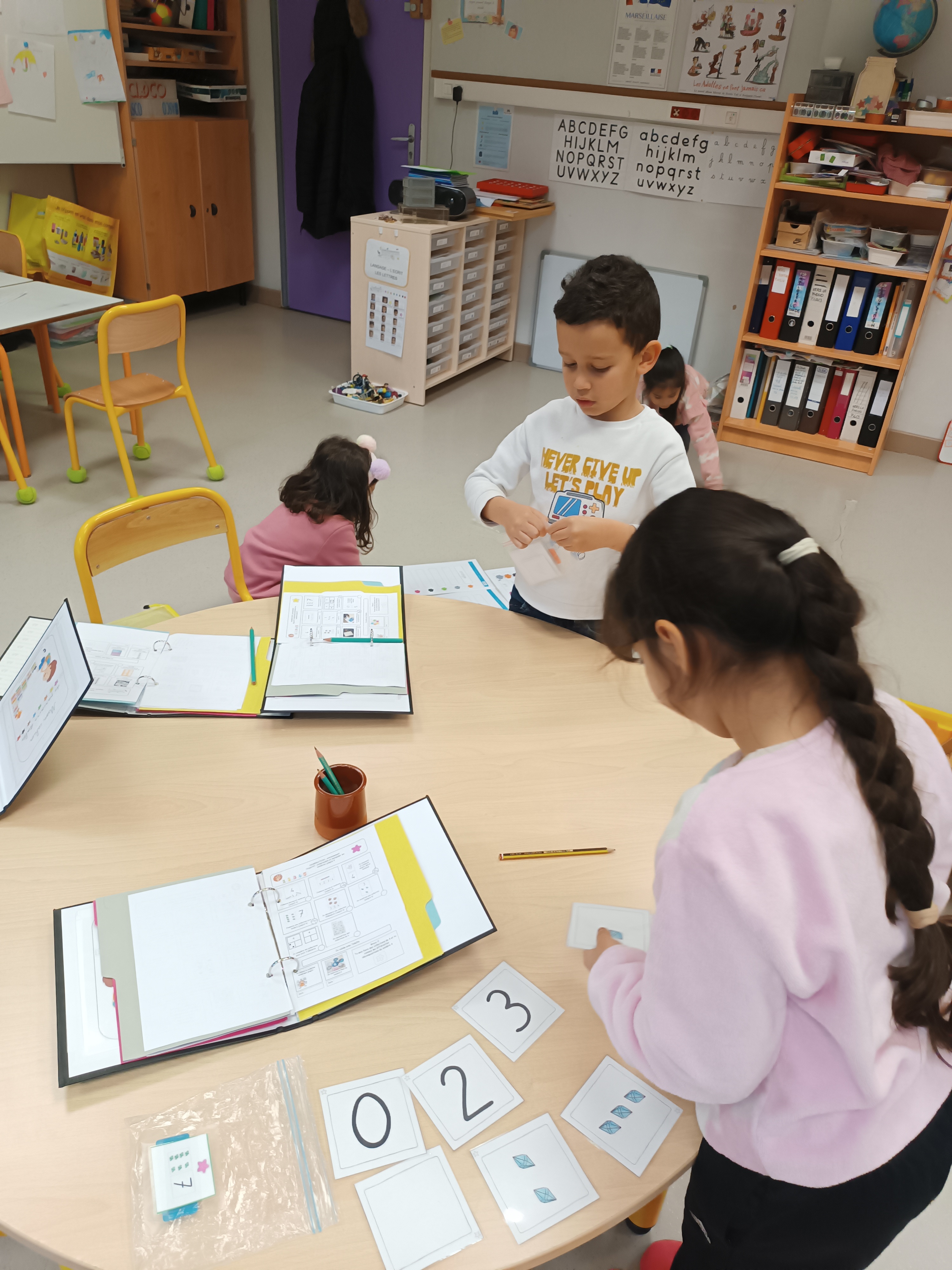 Après avoir appris que les nombres de 6 à 10 se construisaient à partir du 5, nous avons fait un jeu de memory où il fallait associer l'écriture chiffrée à sa représentation avec les constellations du dé, construites à partir du 5.