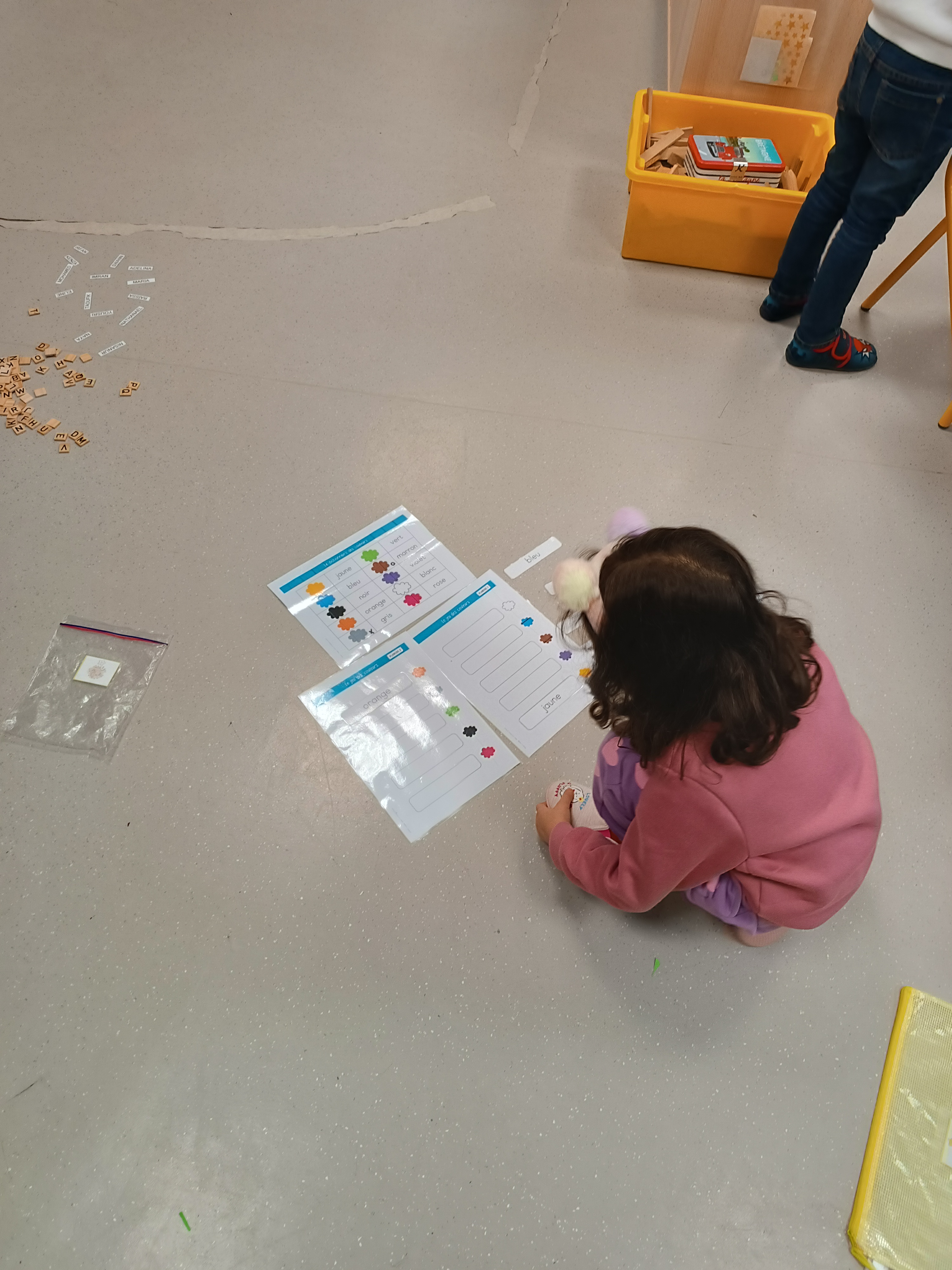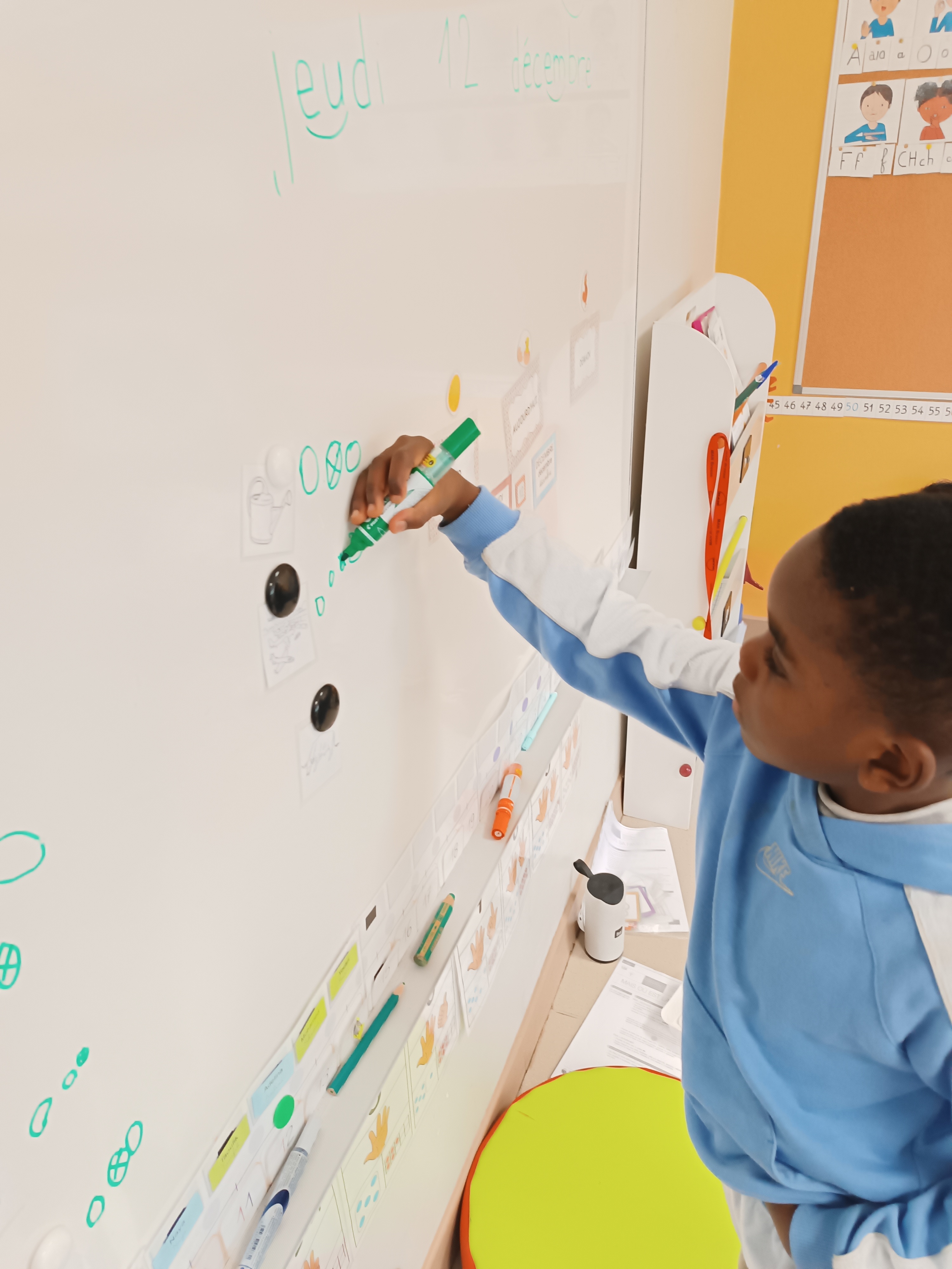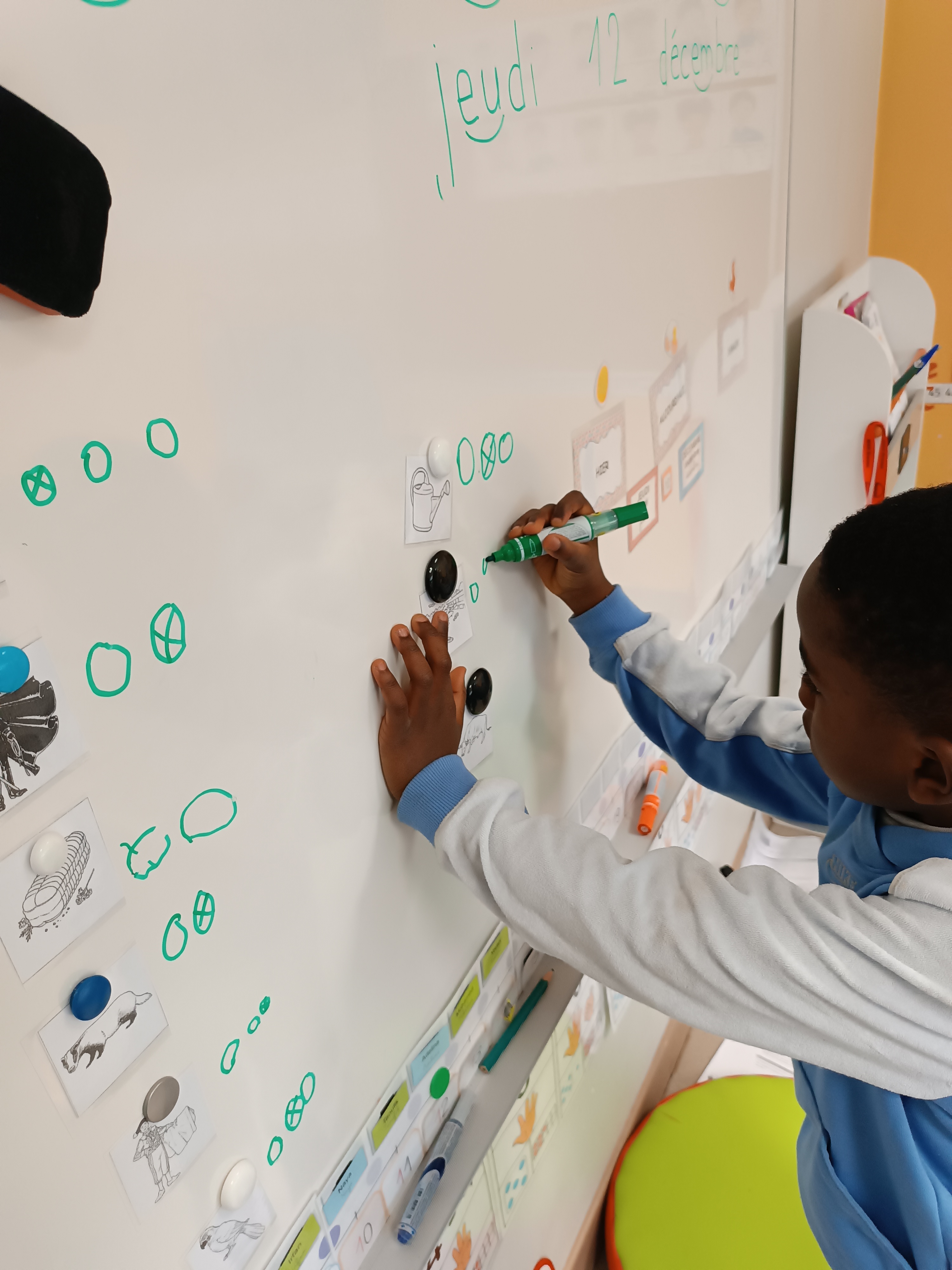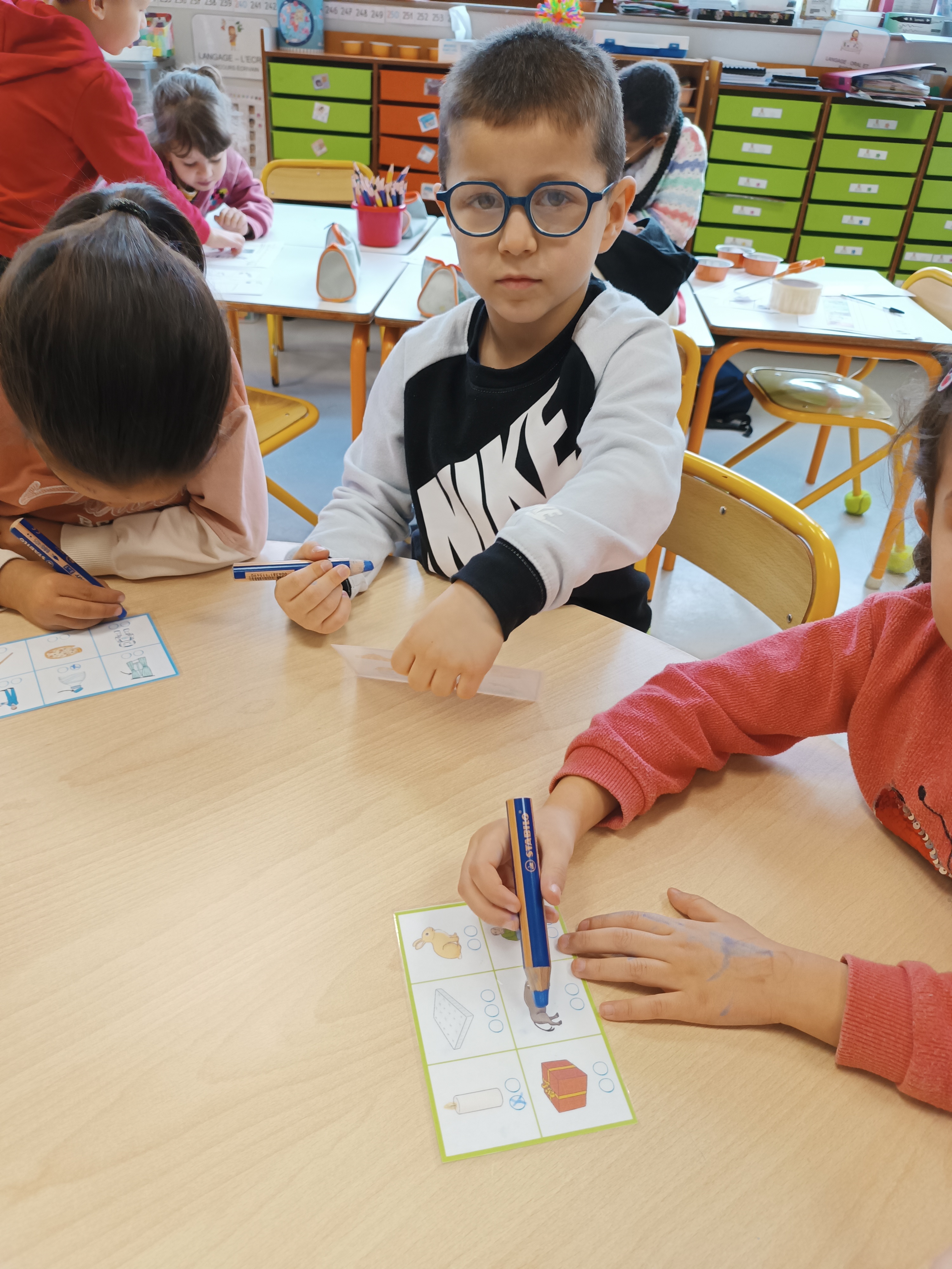Après avoir appris que les nombres de 6 à 10 se construisaient à partir du 5, nous avons fait un jeu de memory où il fallait associer l'écriture chiffrée à sa représentation avec les constellations du dé, construites à partir du 5.